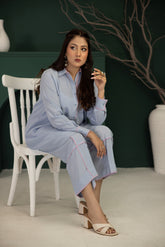 The ensemble features an ice-blue knee-length button-down tunic with cuff sleeves. Embellished with crystal finishings. Paired with ice blue culottes with lavender finishing to create a sophisticated and classic look.Colour: Ice blue2 pieces Shirt & trousersShirt & Trouser fabric: Pure crepe georgette The model...- PKR 9,400