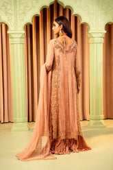 A peach net straight shirt features heavy hand embroidery with side slit cotton silk crushed dress is a modern silhouette with zardozi work composed on shirt front, back and sleeves. The piece is paired with a same net dupatta adorned with gota and sequins...- PKR 90,000