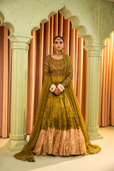 A olive green Korean raw silk choli features detailed copper handwork embroidery with zardoze, beads, gota, crystals and sequins. The olive green cotton silk lengha finished with gold lama tissue. Paired with olive green net dupatta adorned with copper zari cutwork border and heavy...- PKR 195,000
