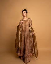 Heer’22: Rena(MHW1): This rose gold zari net heavily worked kalidar is the epitomy of old-age charm with its gold zardozi work composed neckline, all over and sleeves. The piece is paired with a lama gold dupatta with over all sequins and scalloped borders. Wear...- PKR 198,650