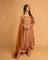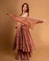 Heer’22: Meher(MHW4): This tea pink katan silk heavily worked kalidar angarkha is a modern take on a traditional silhouette with its same coloured mirrorwork embroidery all over. The piece is paired with a same colour cotton net banarsi dupatta with over all sequins and...- PKR 157,950