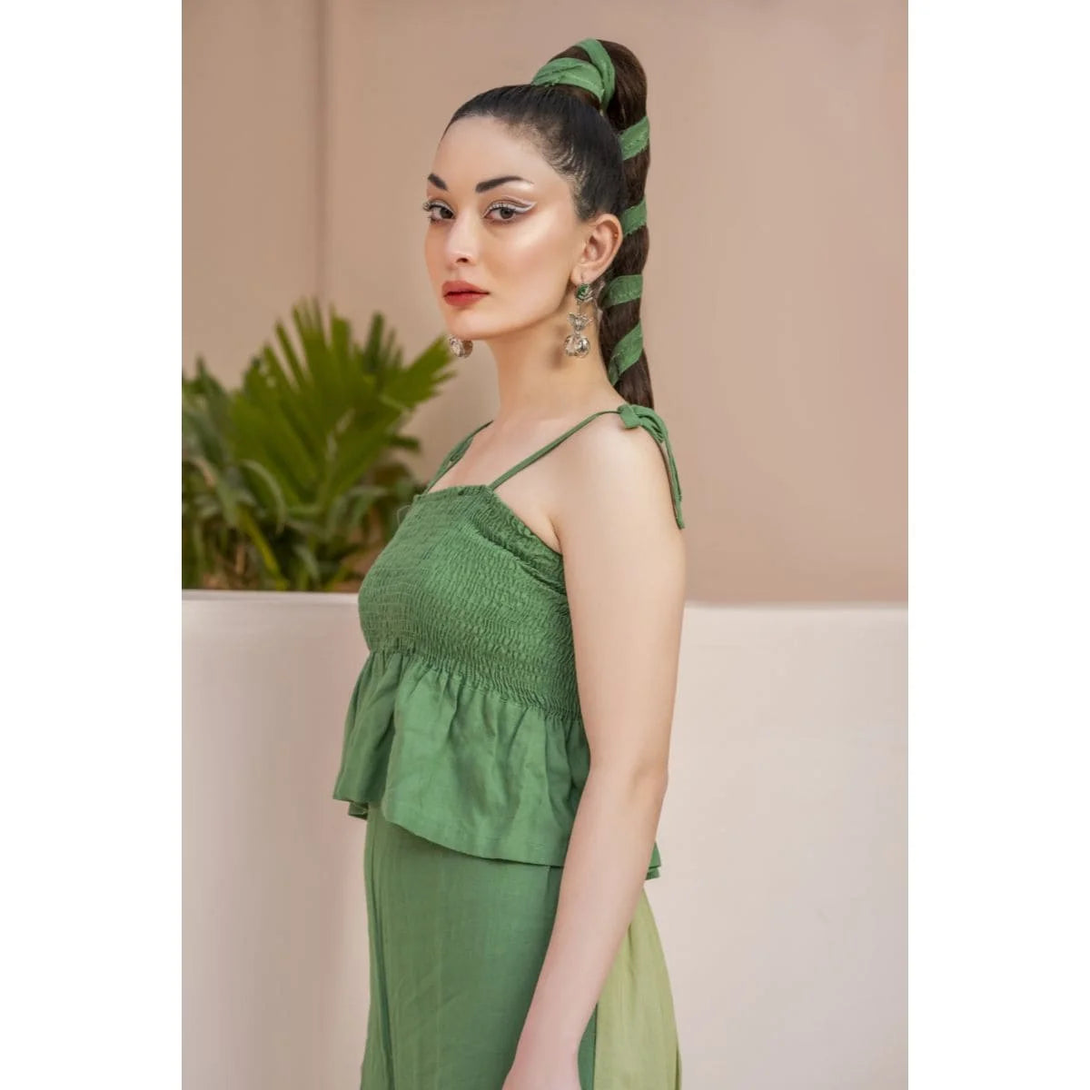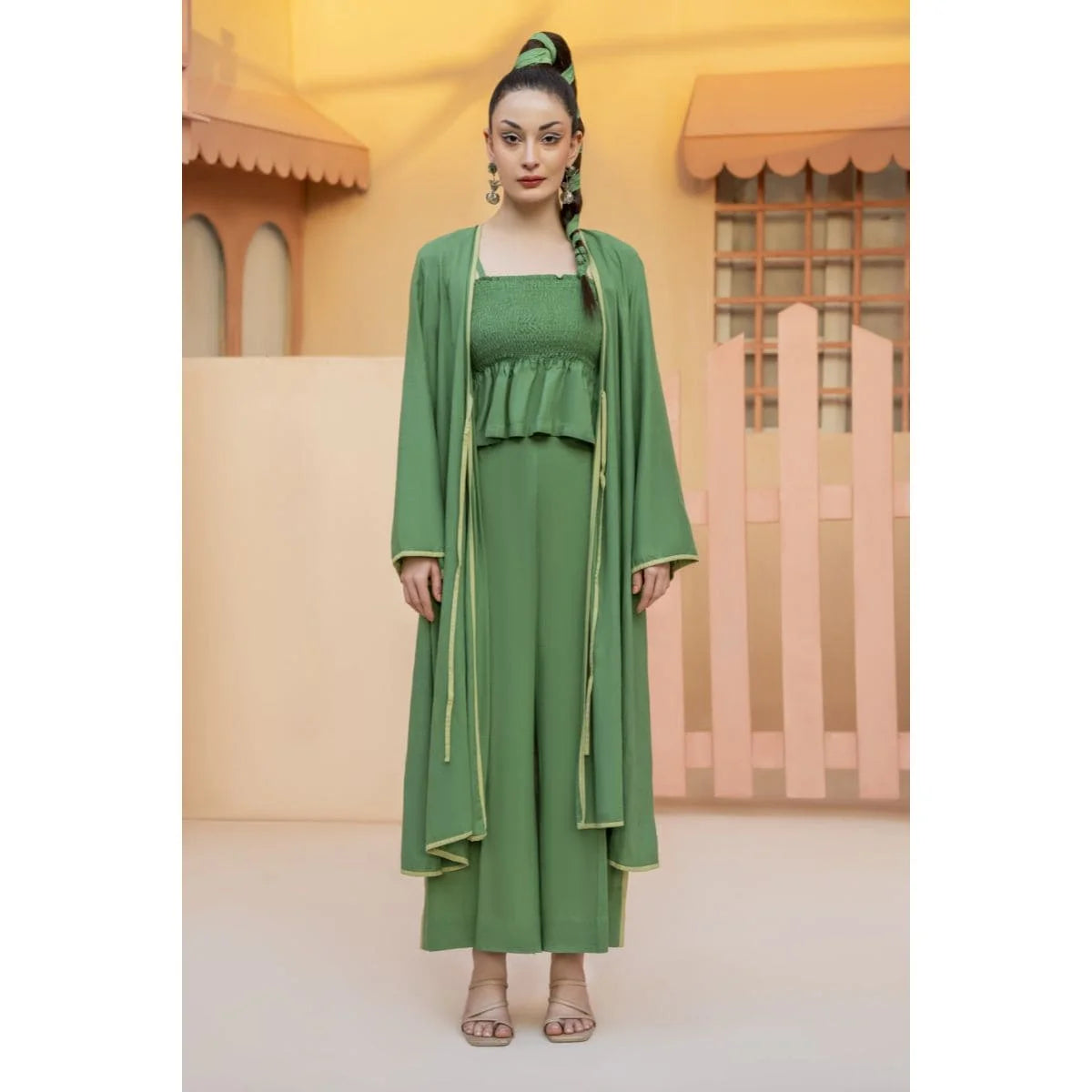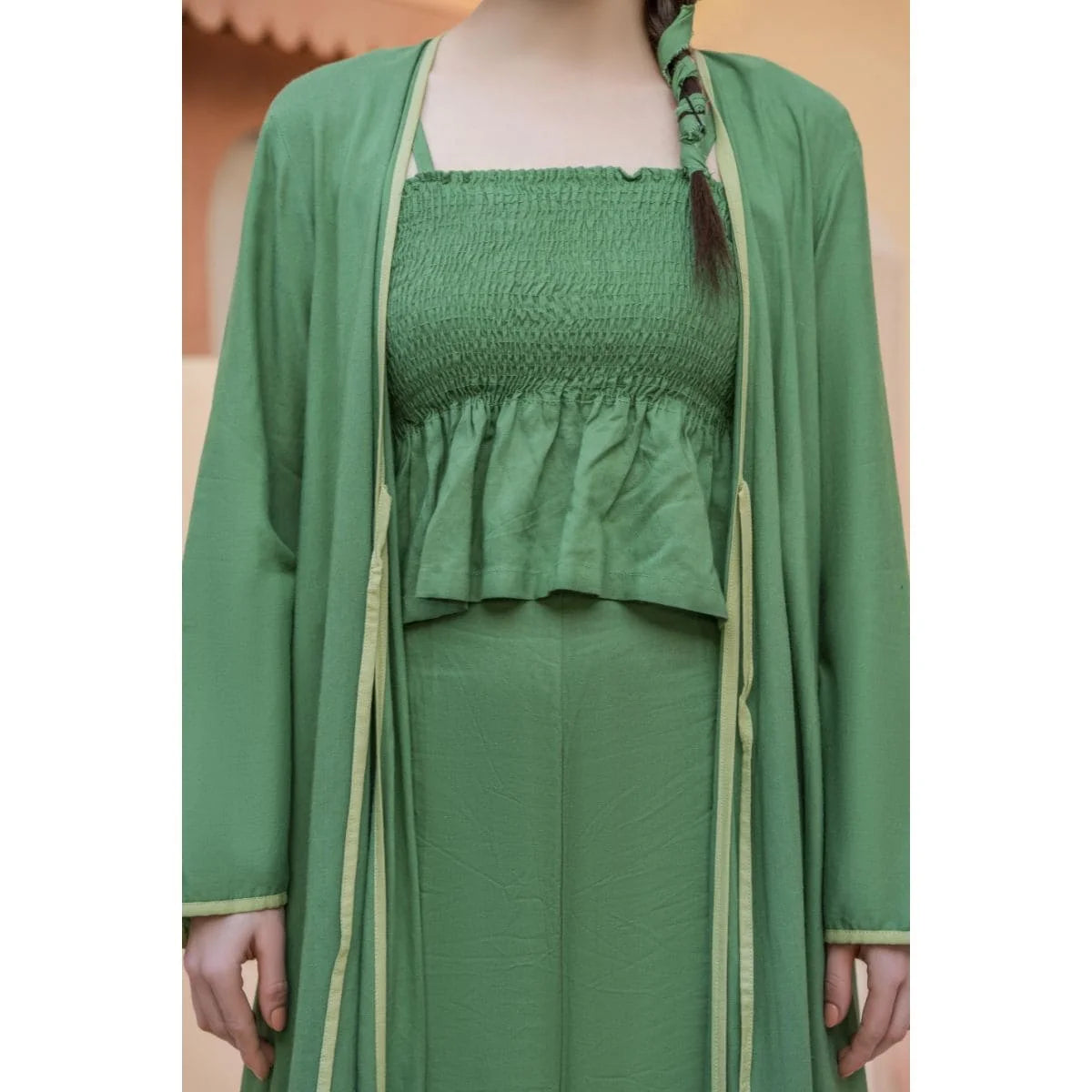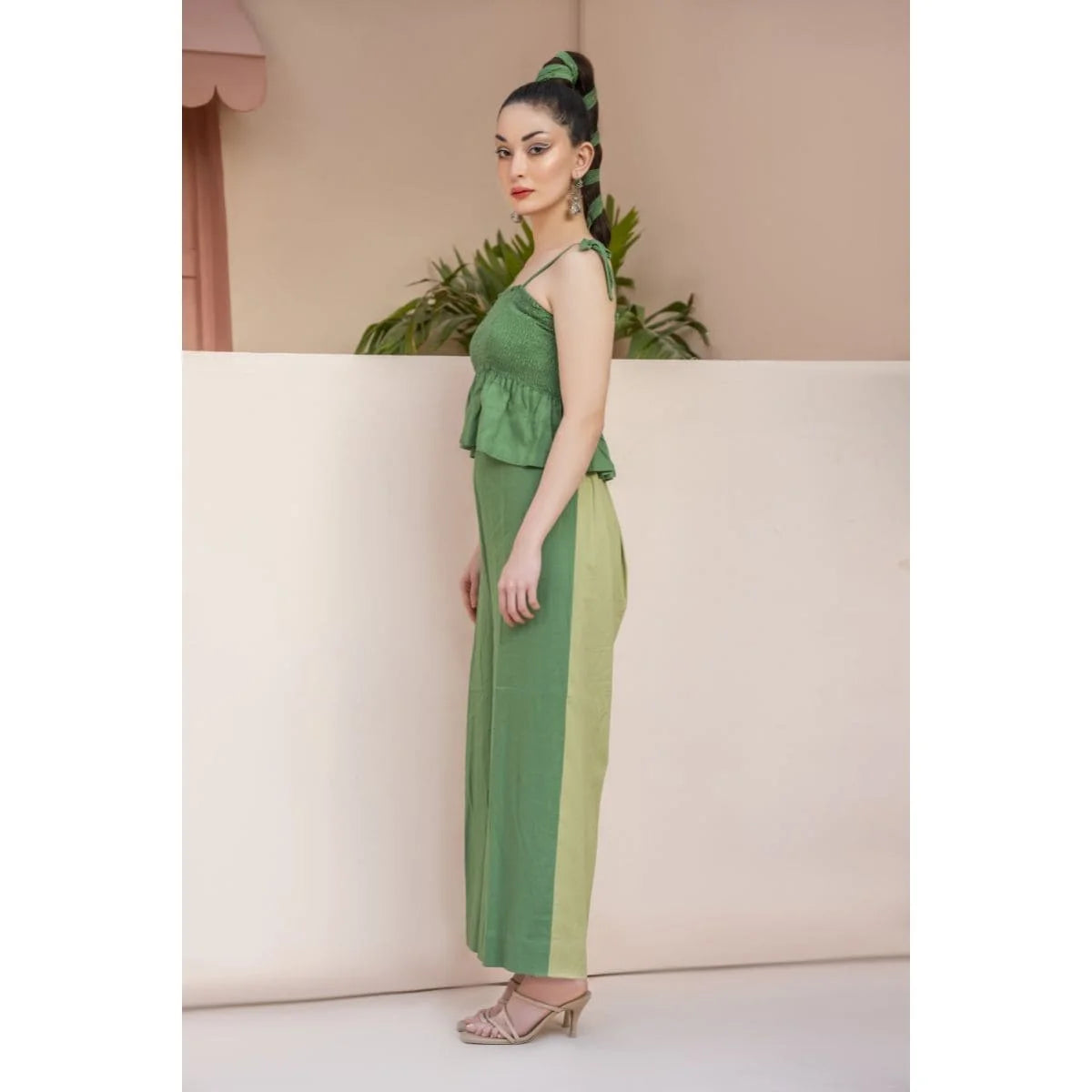 Green cord set with a long jacket and inverted pleat at the back. Paired up with a smocking peplum top with adjustable straps. Its statement high-waisted color-blocked pants make it a must-have summer essential for your wardrobe.