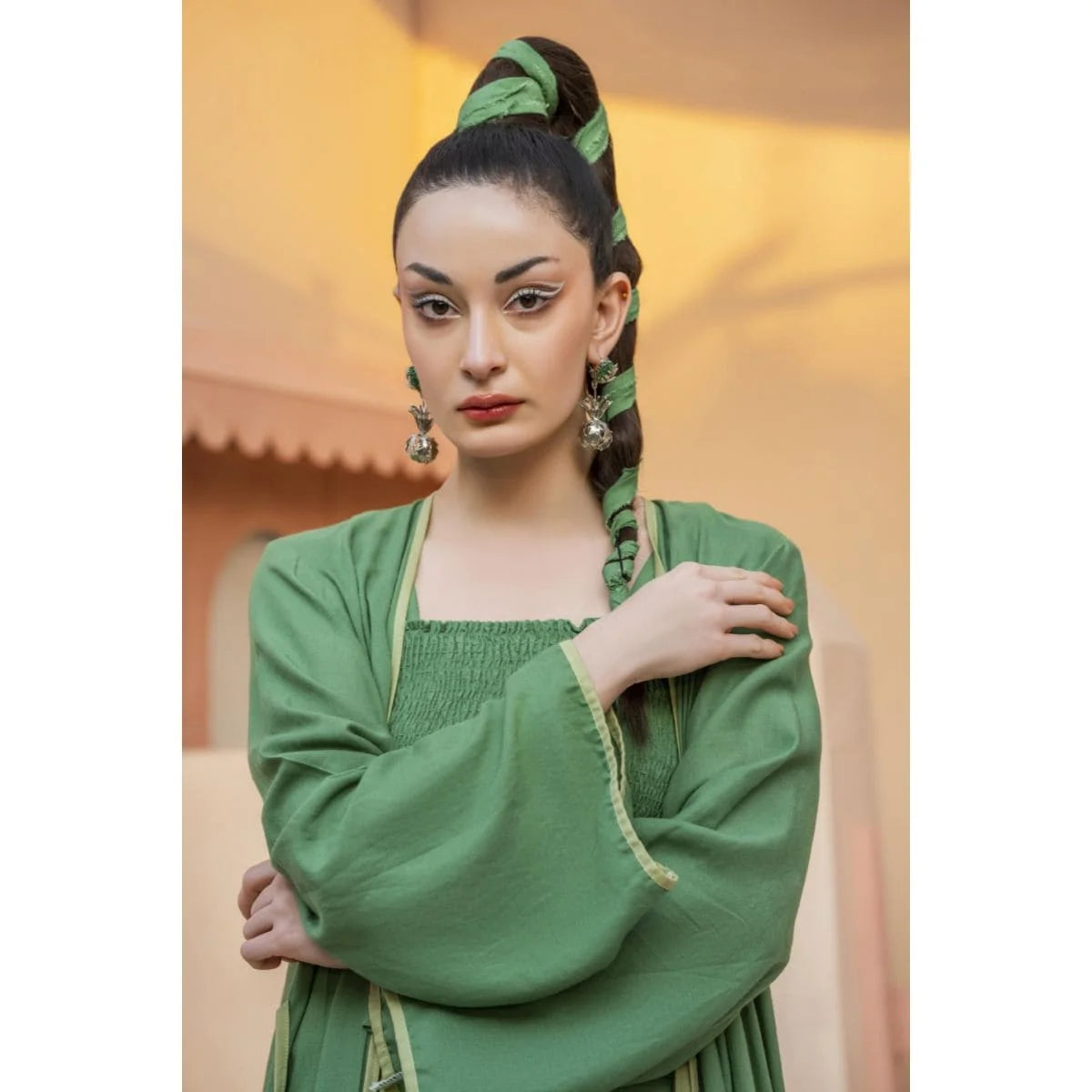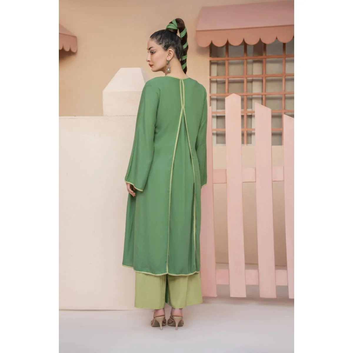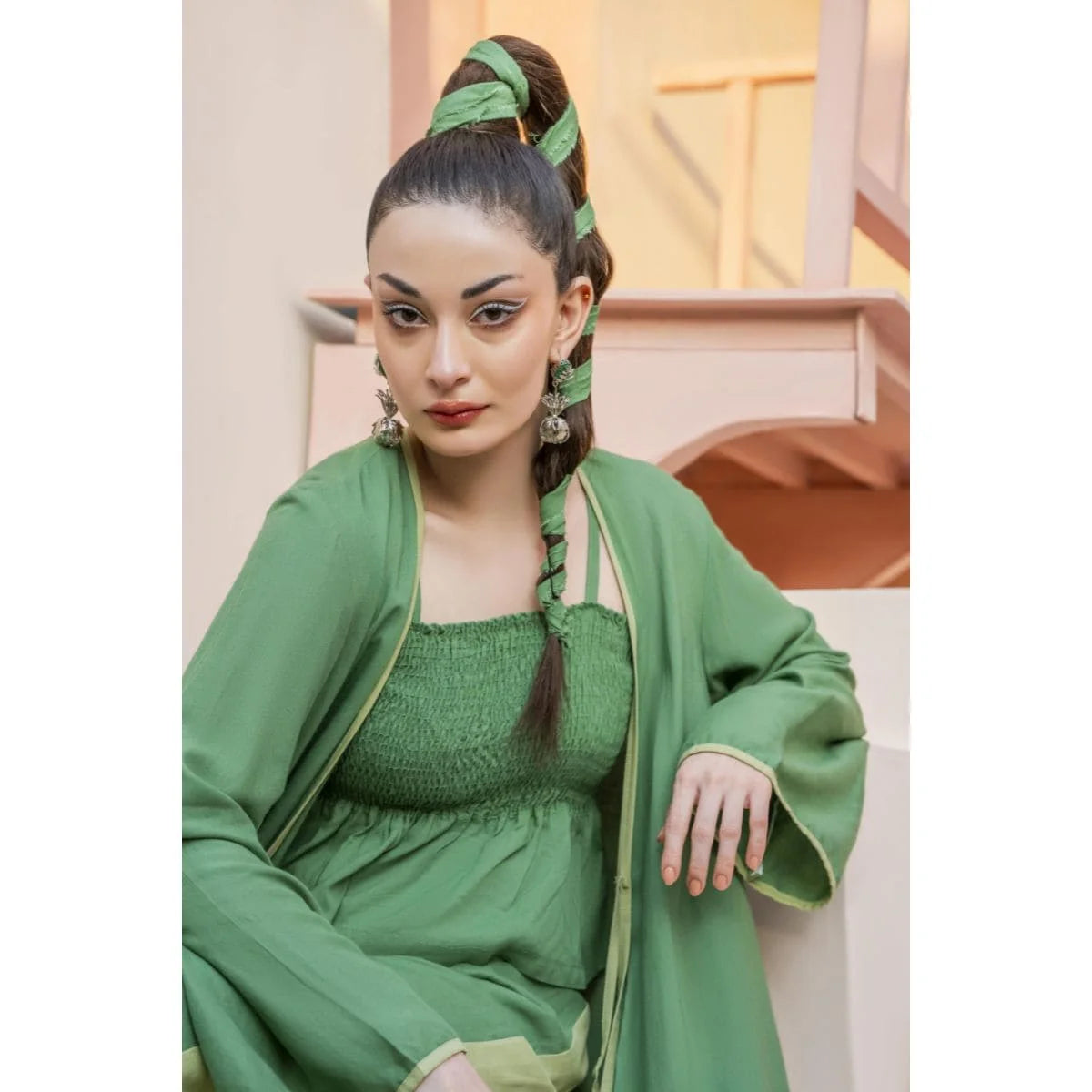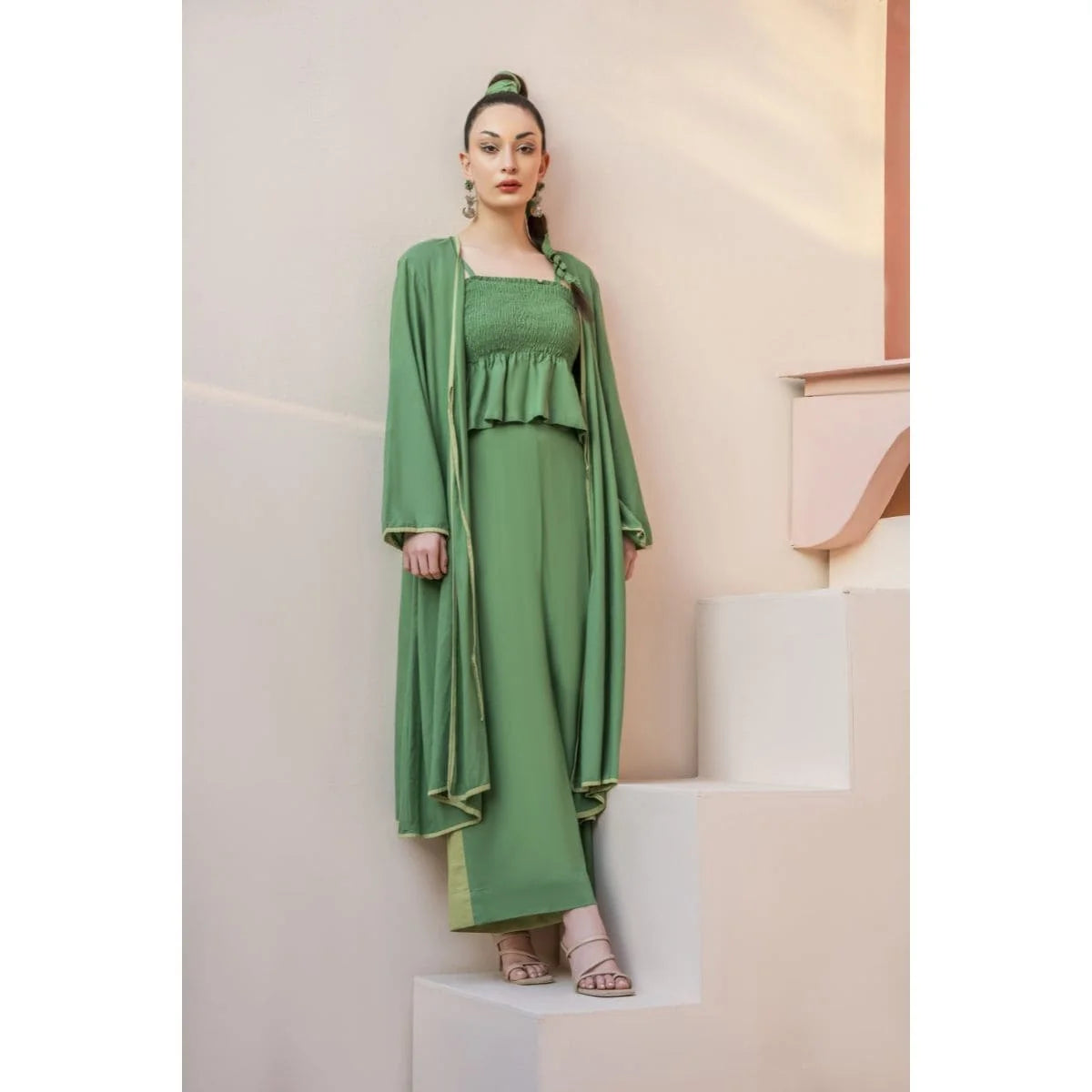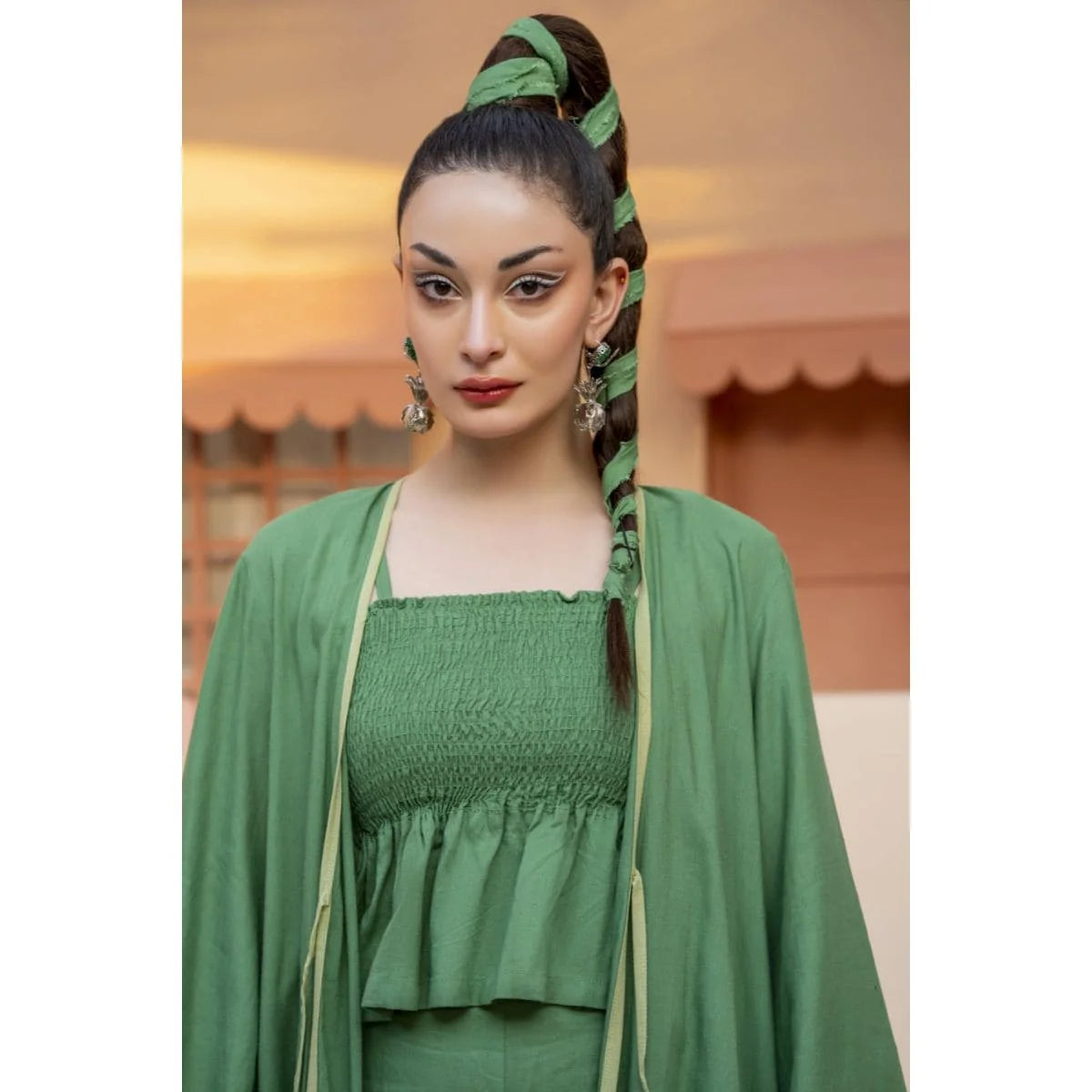 Green cord set with a long jacket and inverted pleat at the back. Paired up with a smocking peplum top with adjustable straps. Its statement high-waisted color-blocked pants make it a must-have summer essential for your wardrobe.