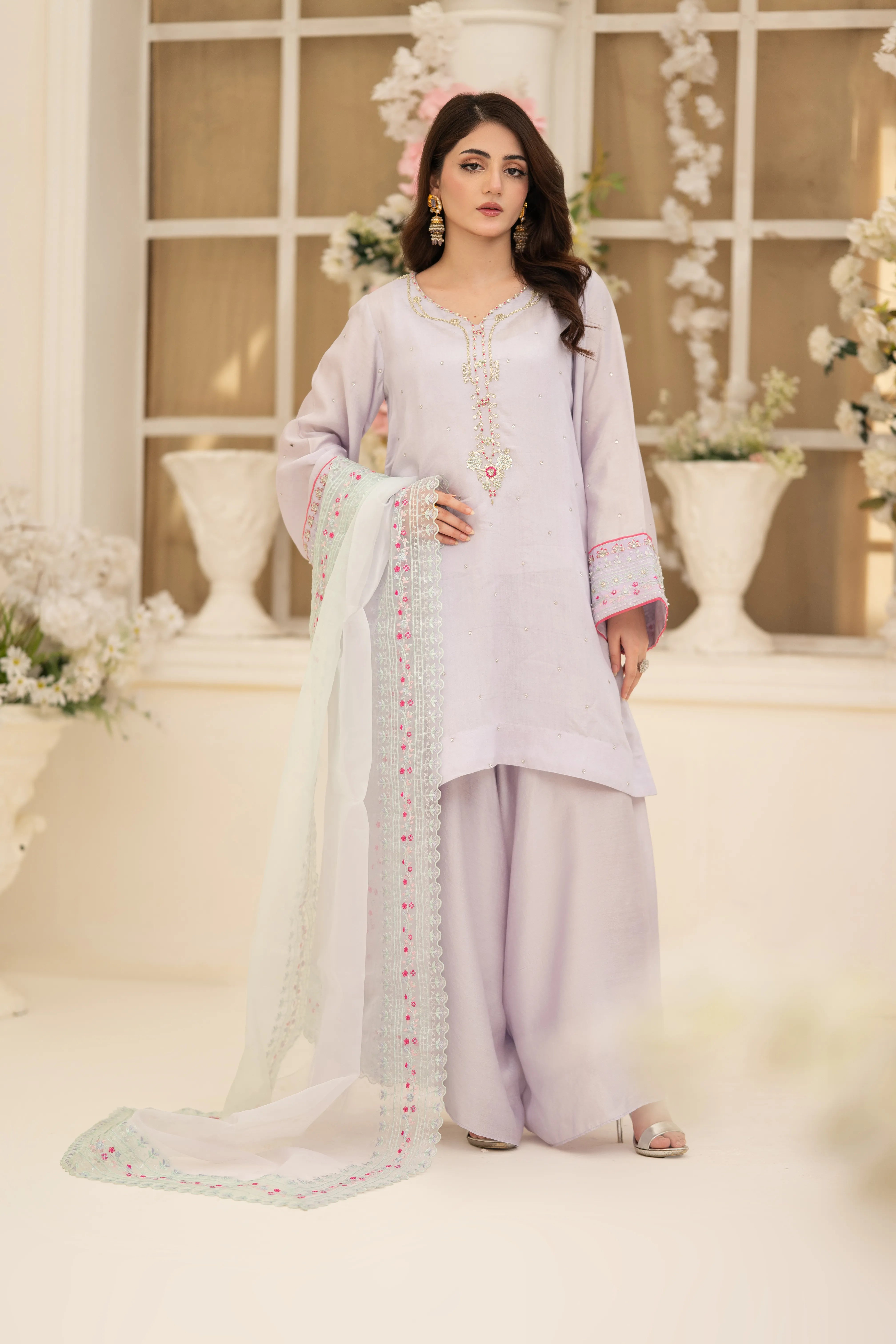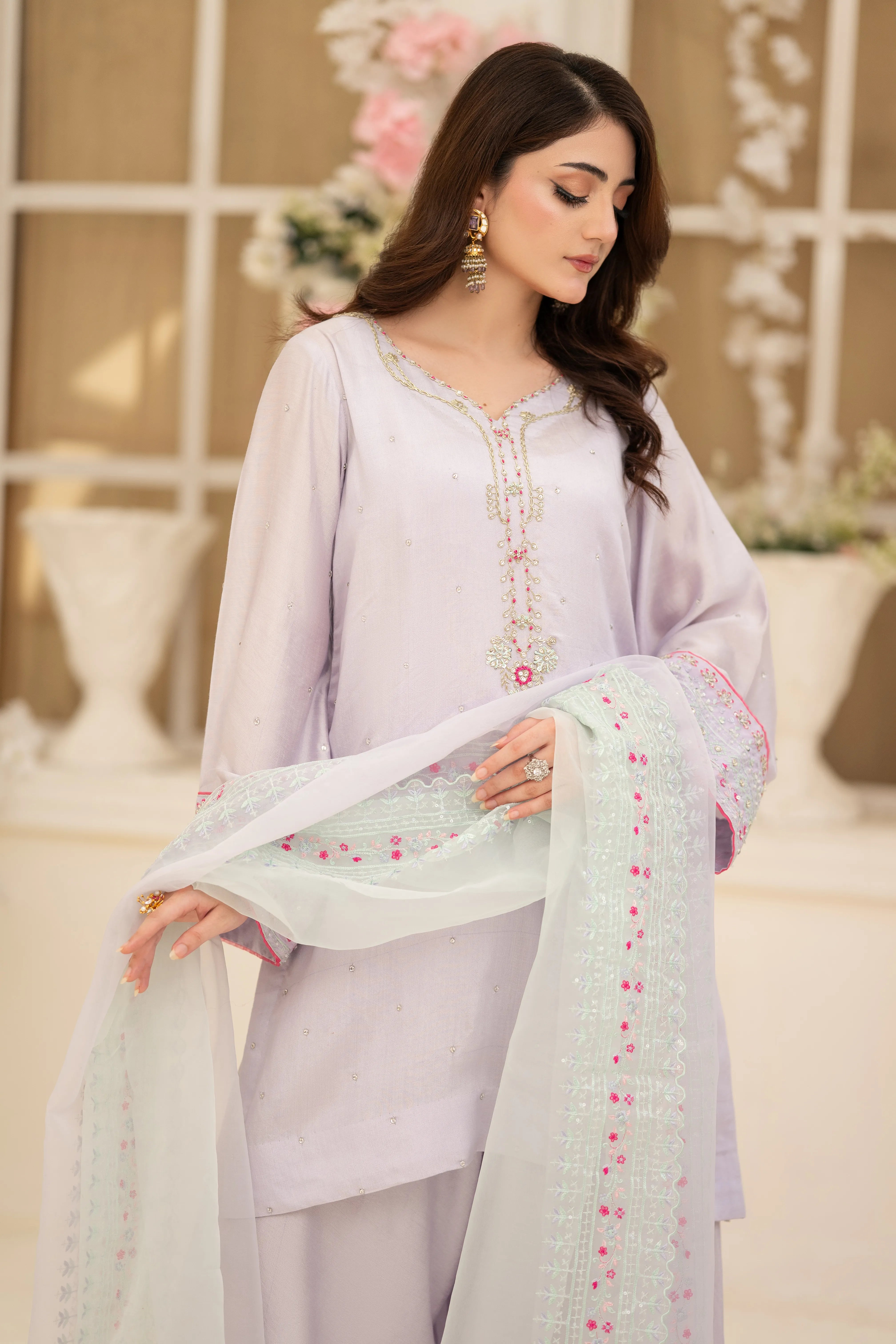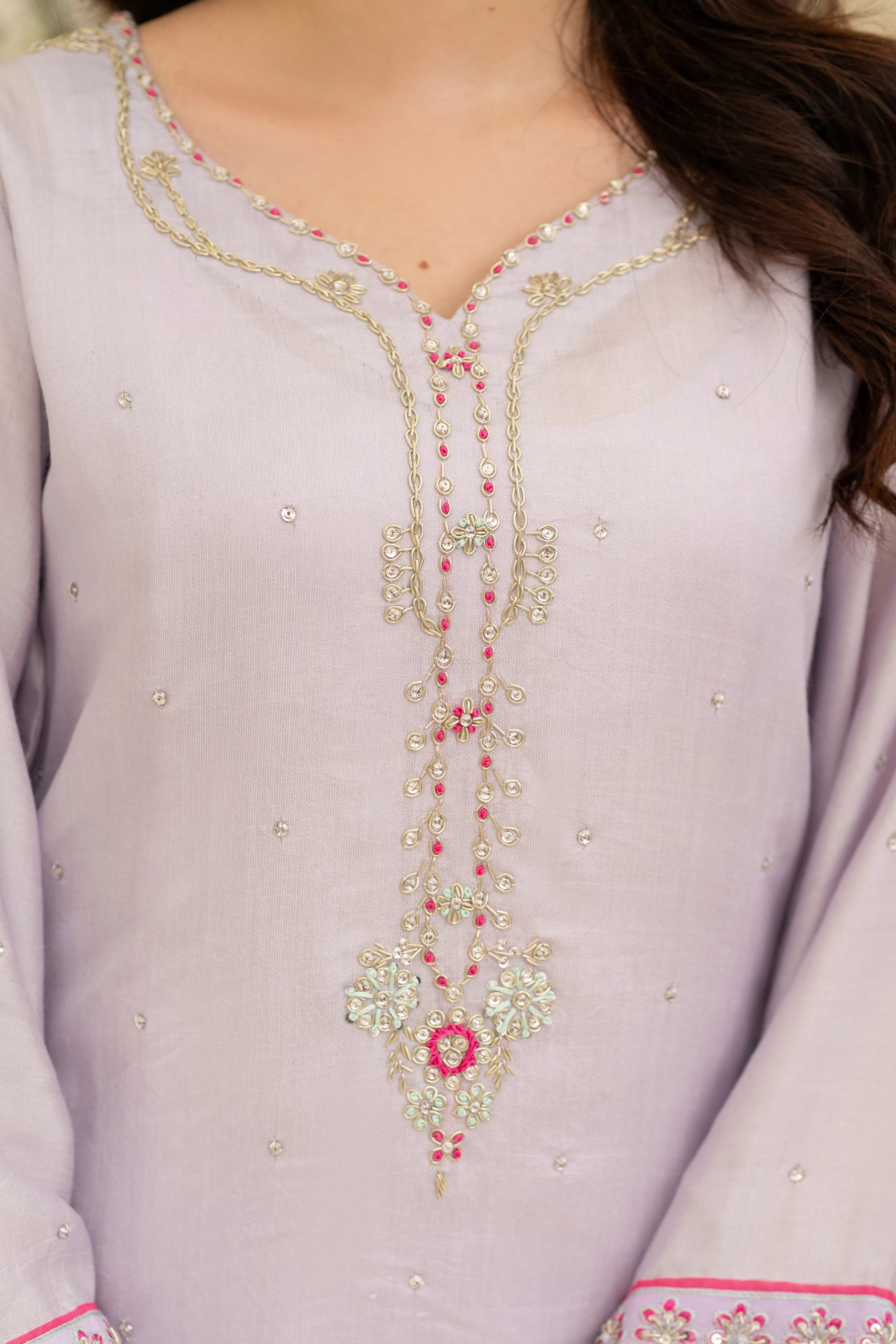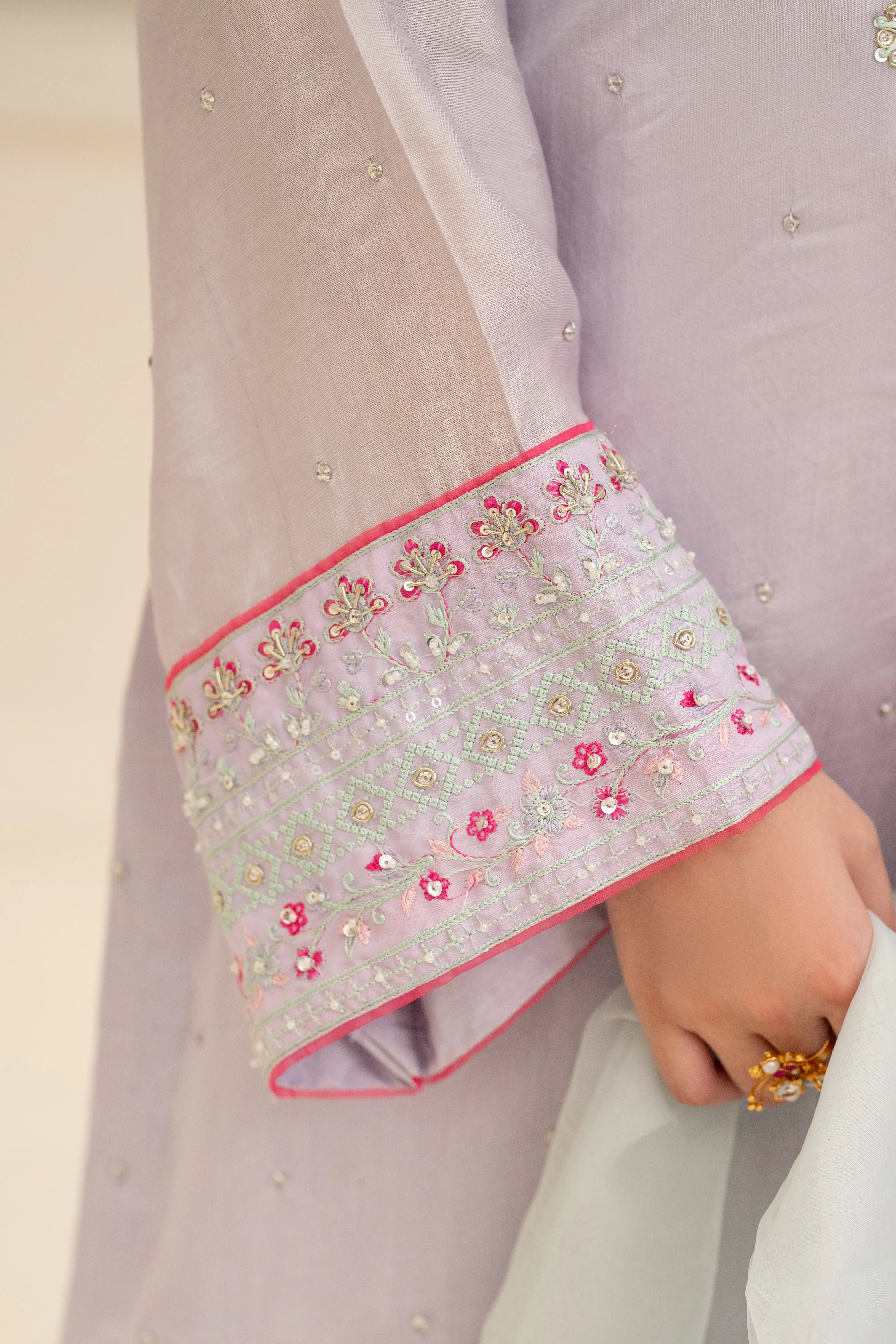 Minha - Eid Festive: The ensemble features a lavender pure sheesha rawsilk short shirt  with Kurta sleeves finished with a thread embroidery border and organza. Intricate silver zardozi, pearl, sequins and Swarovski hand embroidery with a bit of accent colours. Paired with the same coloured  flared pants and tie and dye organza dupatta with thread embroidery border. This versatile piece is effortlessly adaptable for any occasion.
