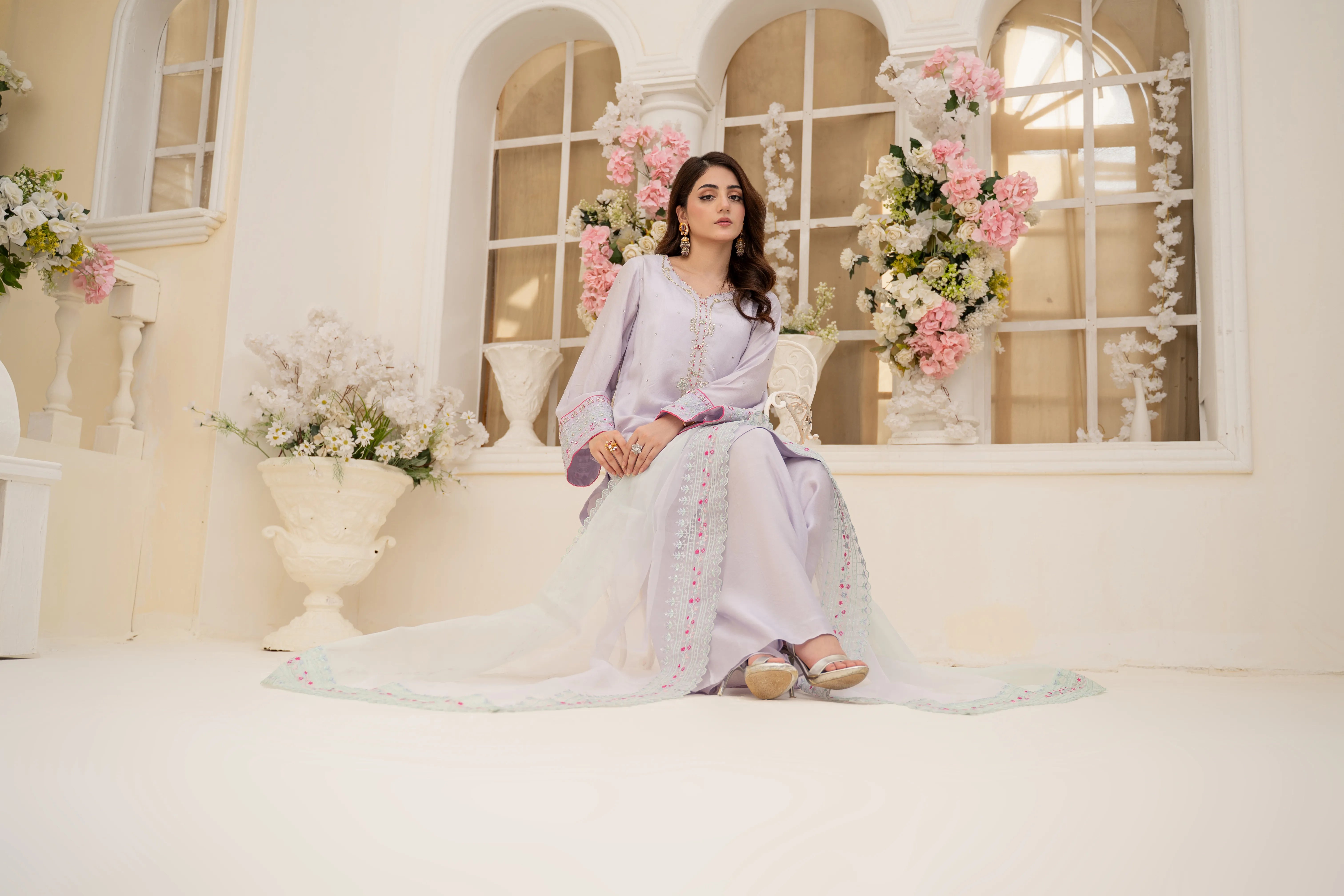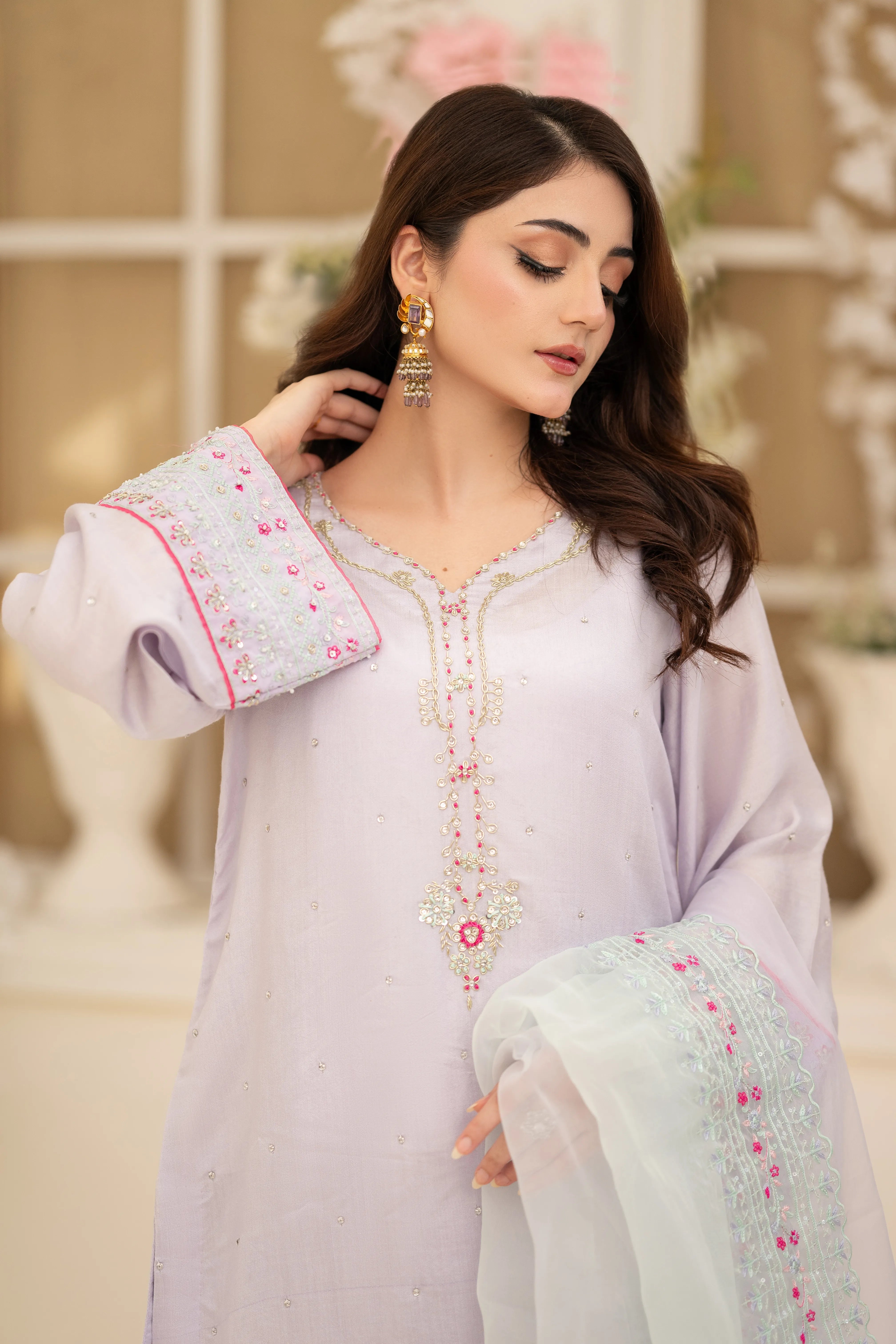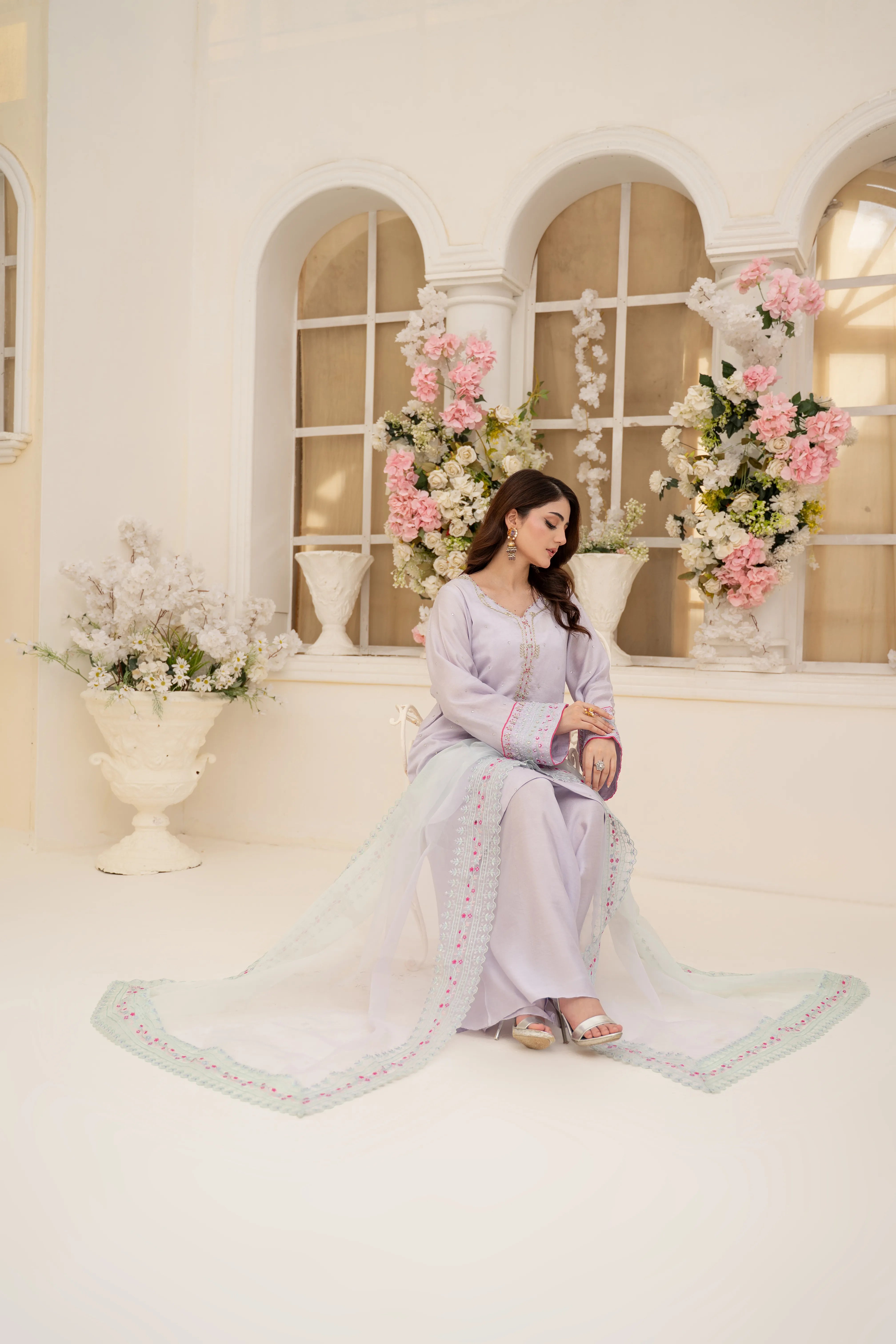 Minha - Eid Festive: The ensemble features a lavender pure sheesha rawsilk short shirt  with Kurta sleeves finished with a thread embroidery border and organza. Intricate silver zardozi, pearl, sequins and Swarovski hand embroidery with a bit of accent colours. Paired with the same coloured  flared pants and tie and dye organza dupatta with thread embroidery border. This versatile piece is effortlessly adaptable for any occasion.