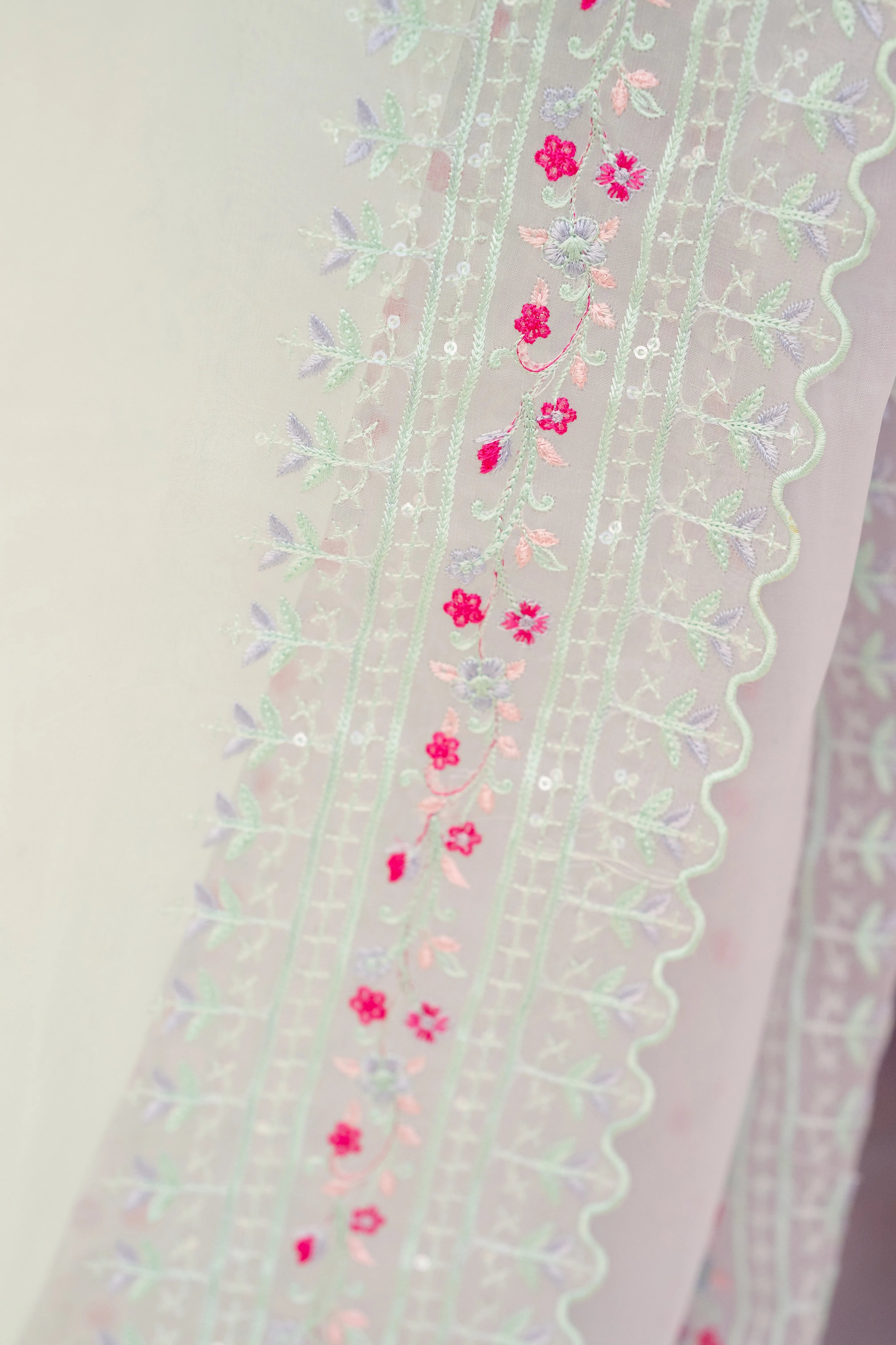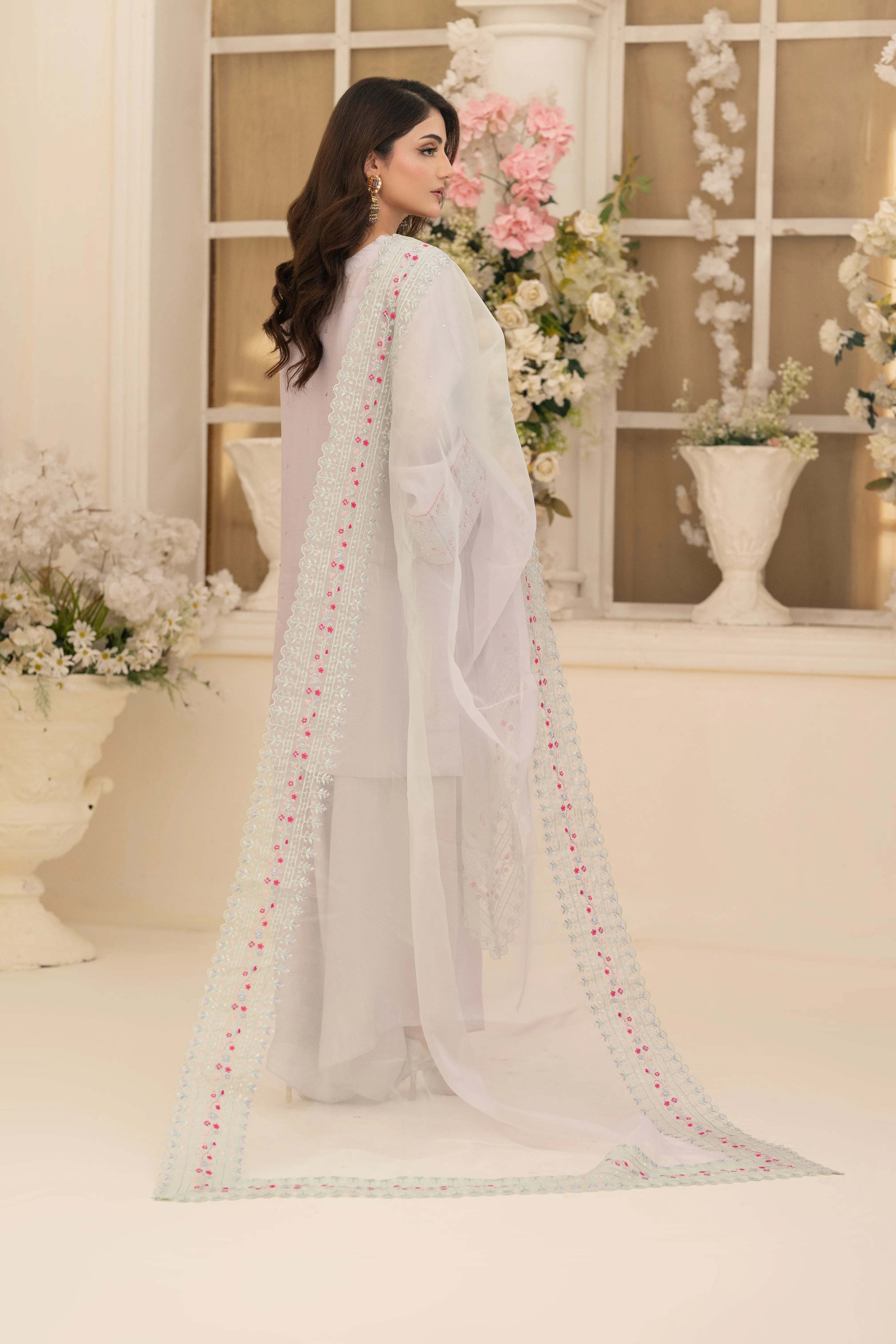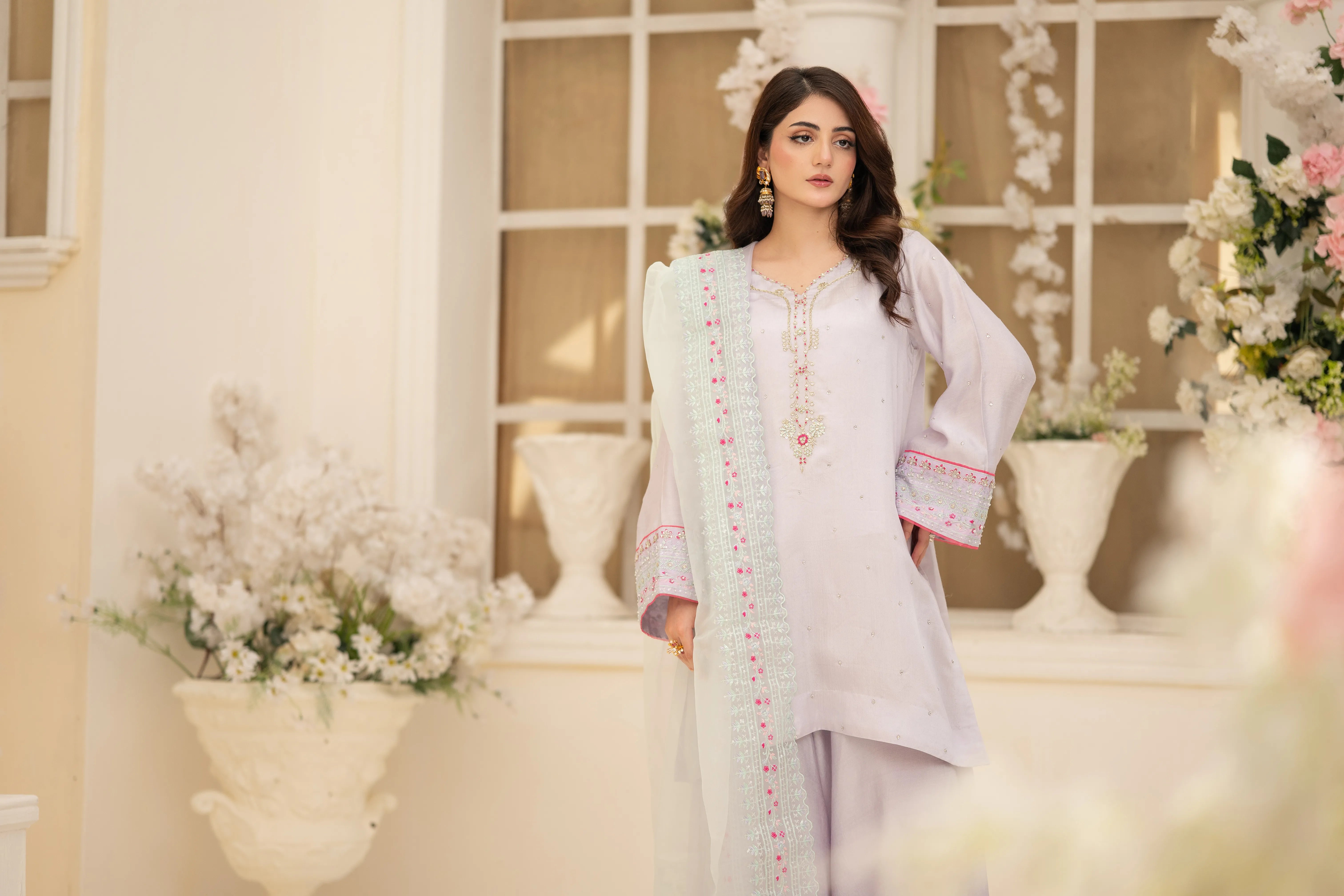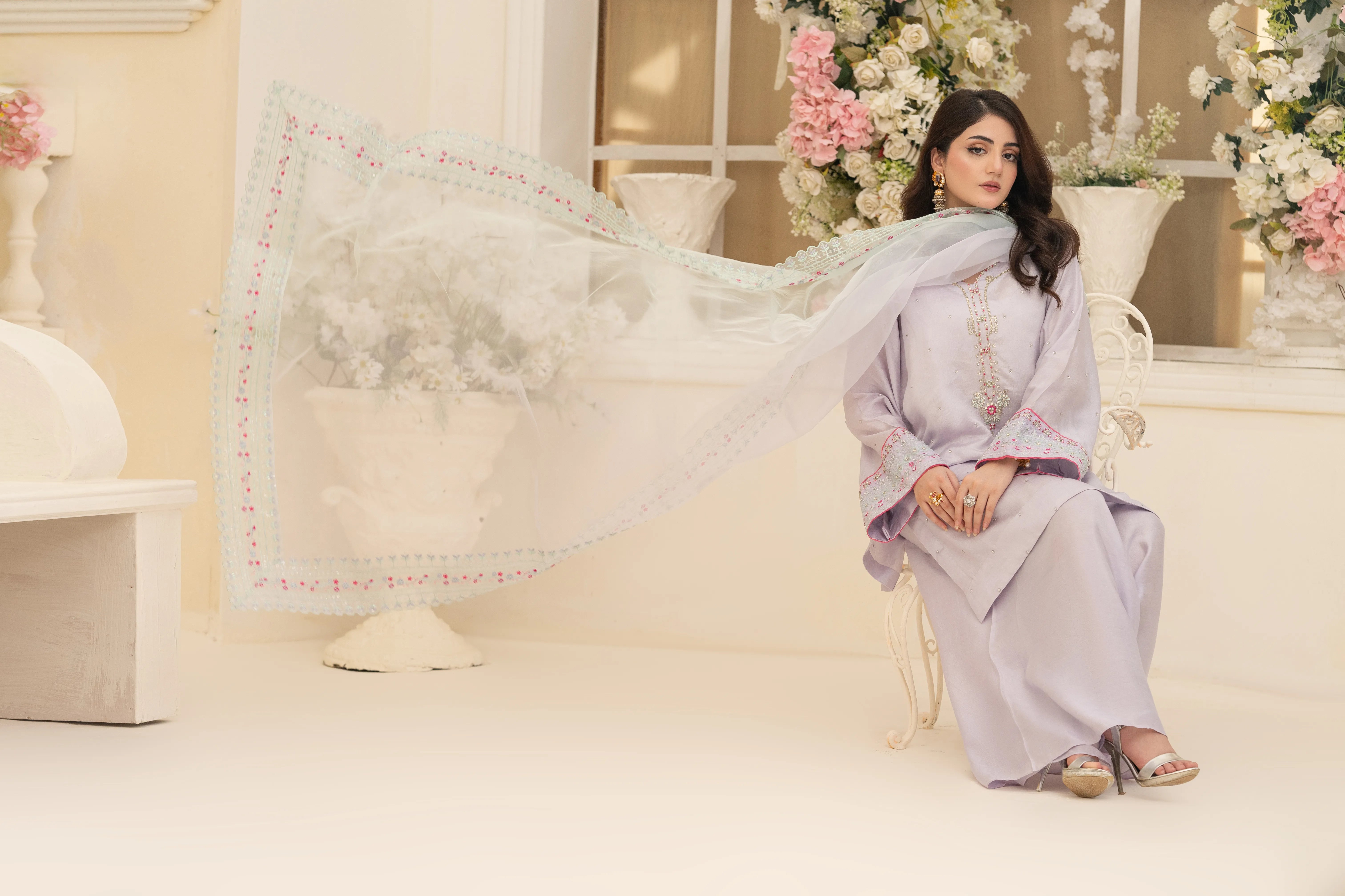 Minha - Eid Festive: The ensemble features a lavender pure sheesha rawsilk short shirt  with Kurta sleeves finished with a thread embroidery border and organza. Intricate silver zardozi, pearl, sequins and Swarovski hand embroidery with a bit of accent colours. Paired with the same coloured  flared pants and tie and dye organza dupatta with thread embroidery border. This versatile piece is effortlessly adaptable for any occasion.