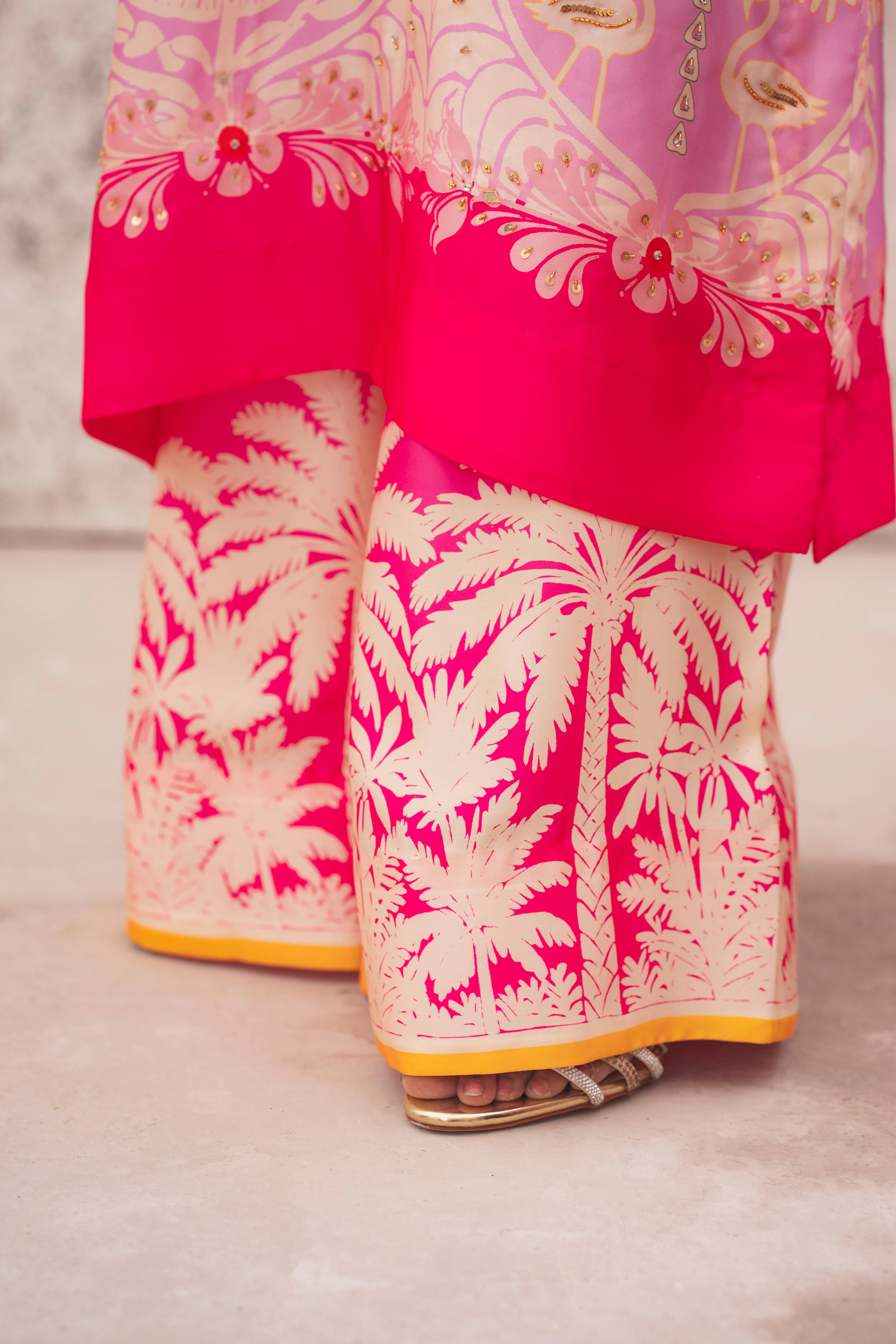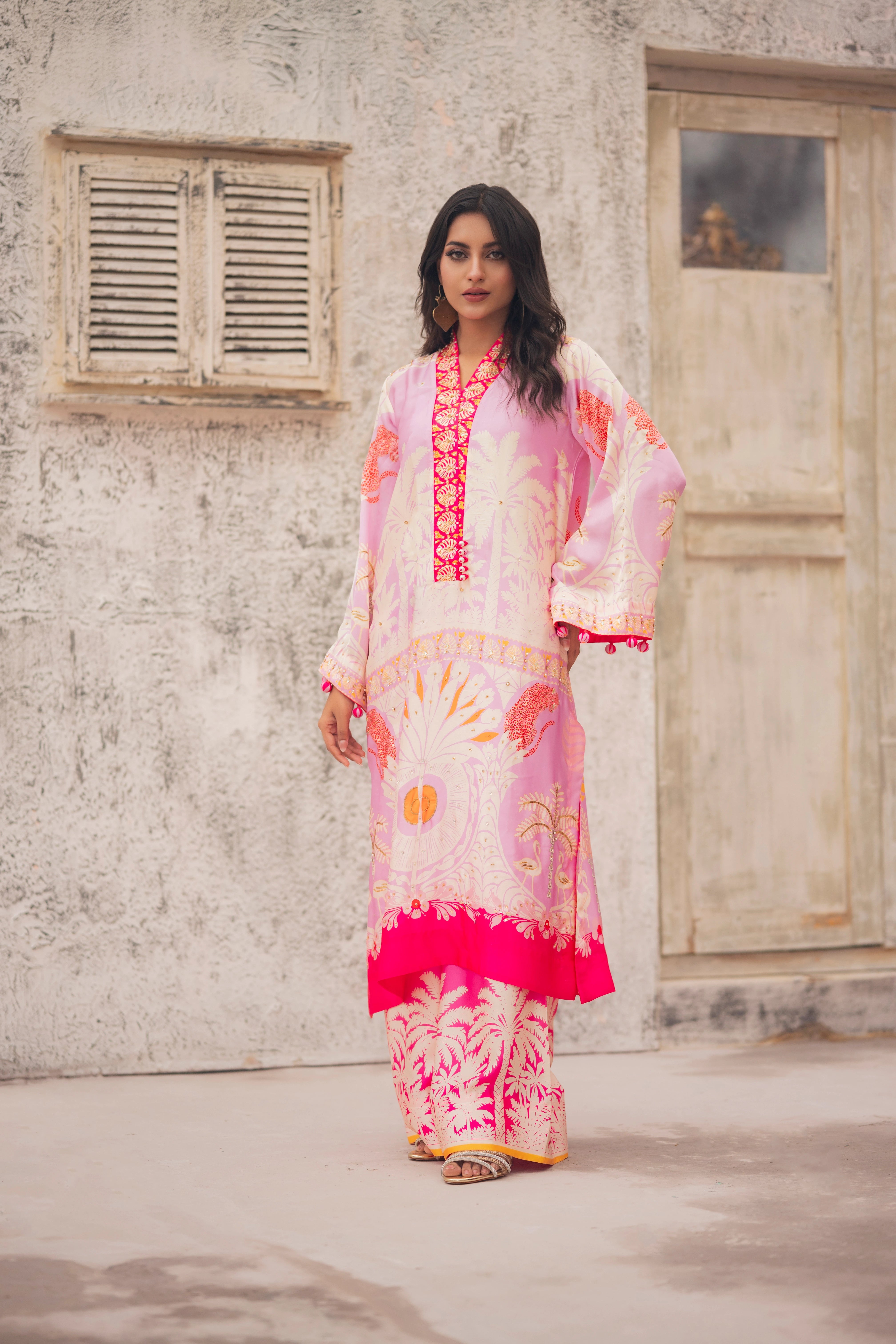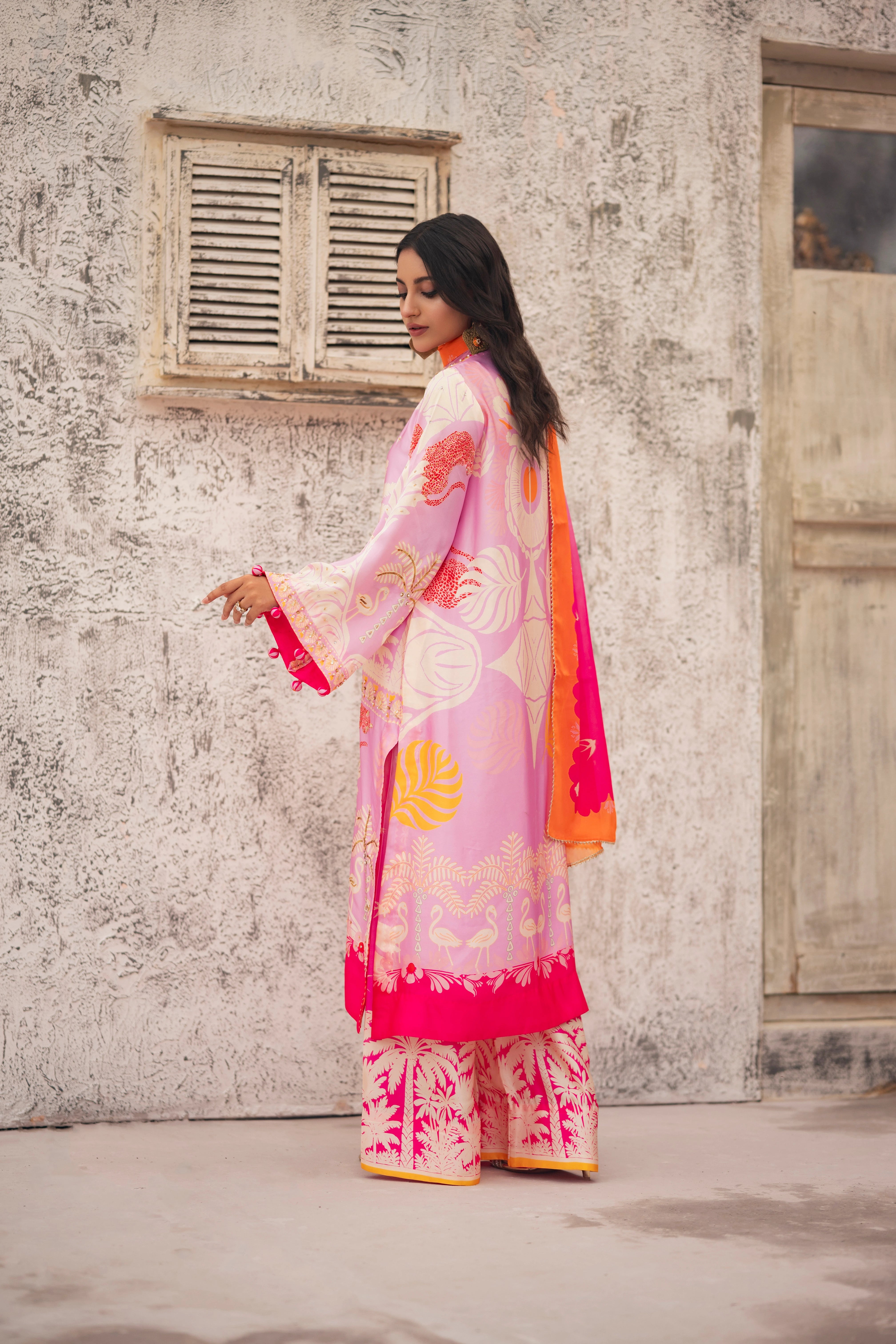 LIA - Festive Formal - VOL 2: A vision of effortless elegance, this digitally printed pink lavender shamooz silk A-lined shirt unfolds in a relaxed long silhouette. The neckline is traced with delicate embroidery, while vivid fuchsia, blush and beige borders frame the sleeves and hem in floral details. Across the canvas, motifs of palm trees, birds, leopards bloom with a subtle shimmer of sequins, zardoze, beads and gota. Paired with digitally printed shamooz silk culottes and silk dupatta finished with kingri.