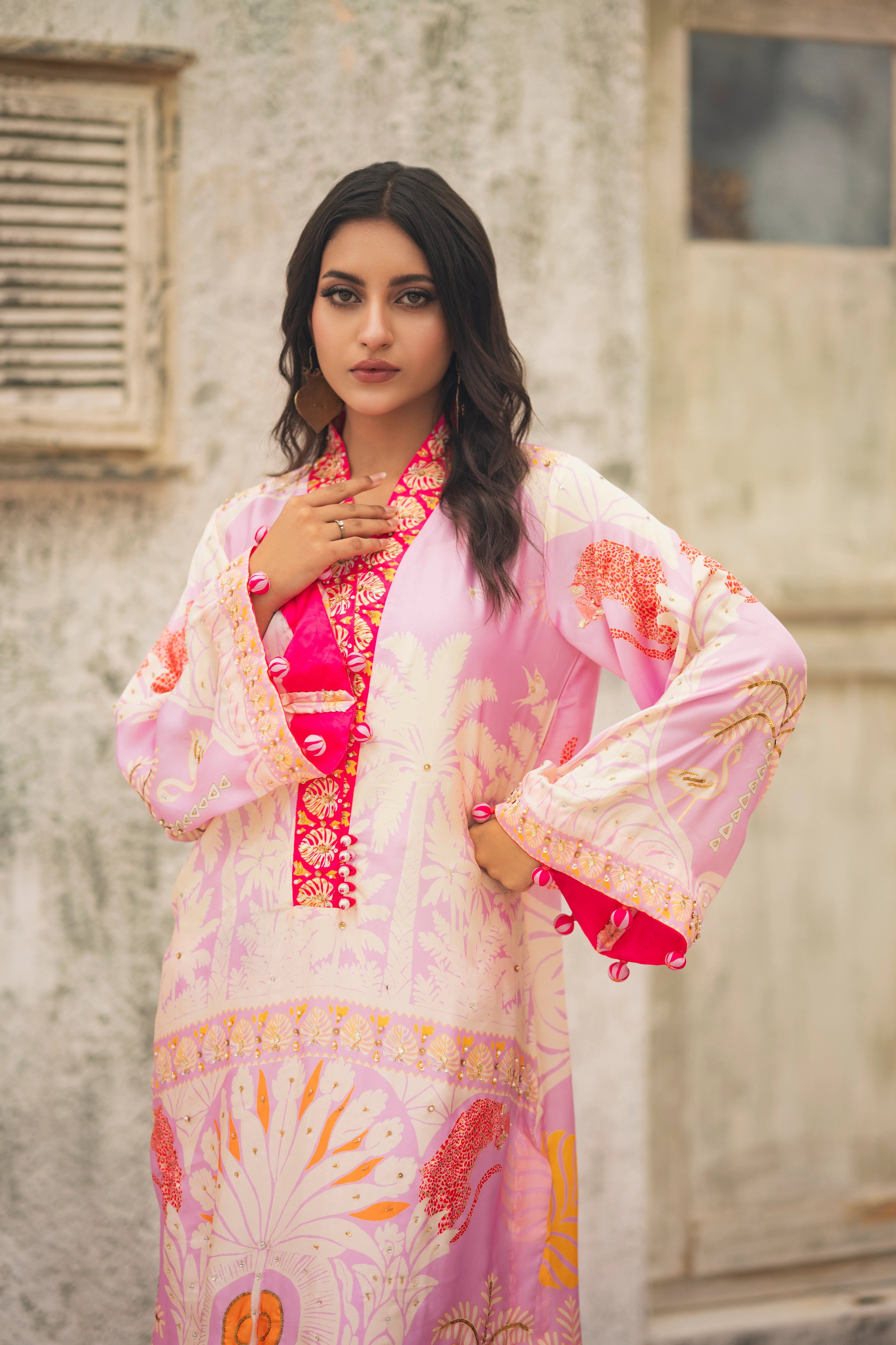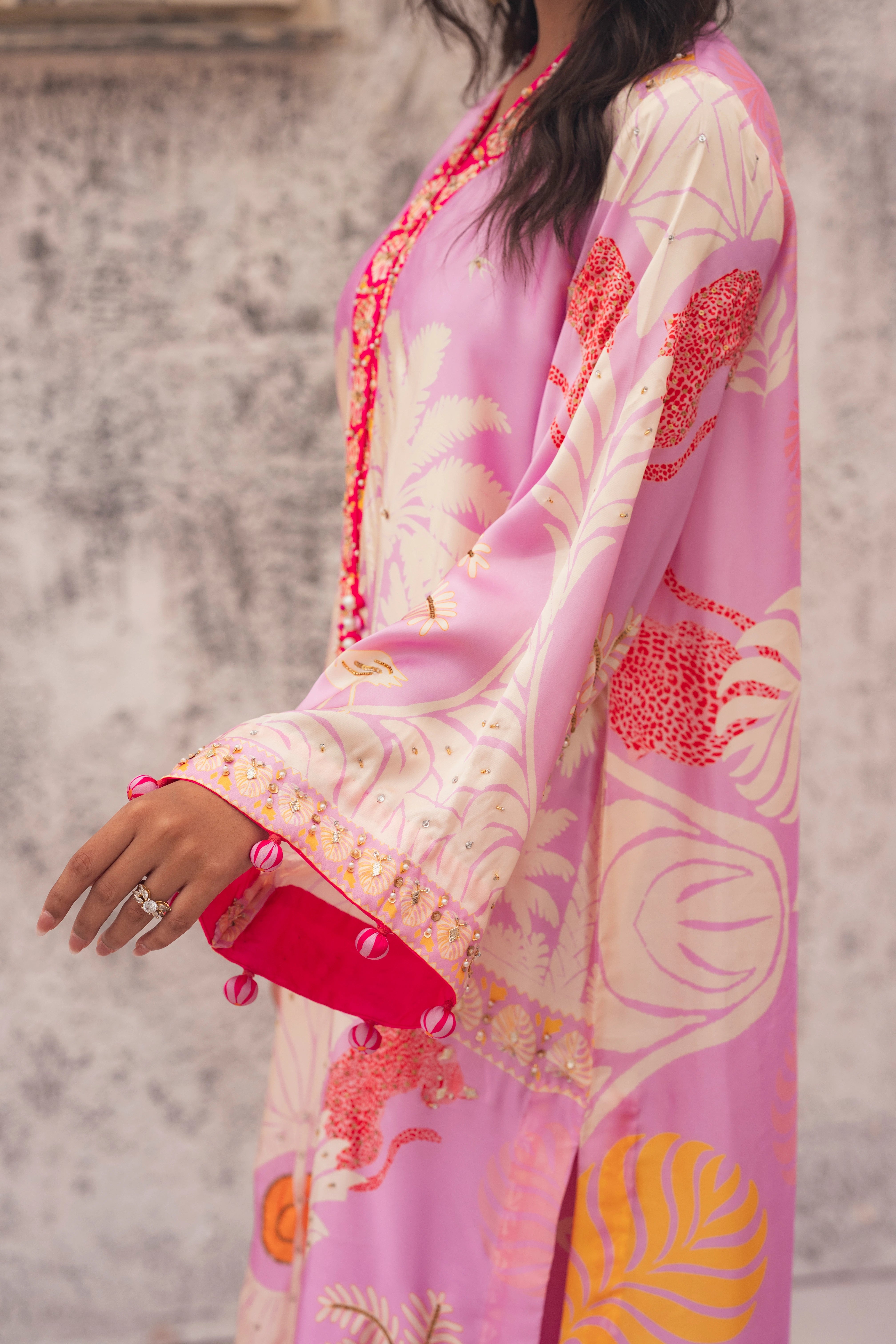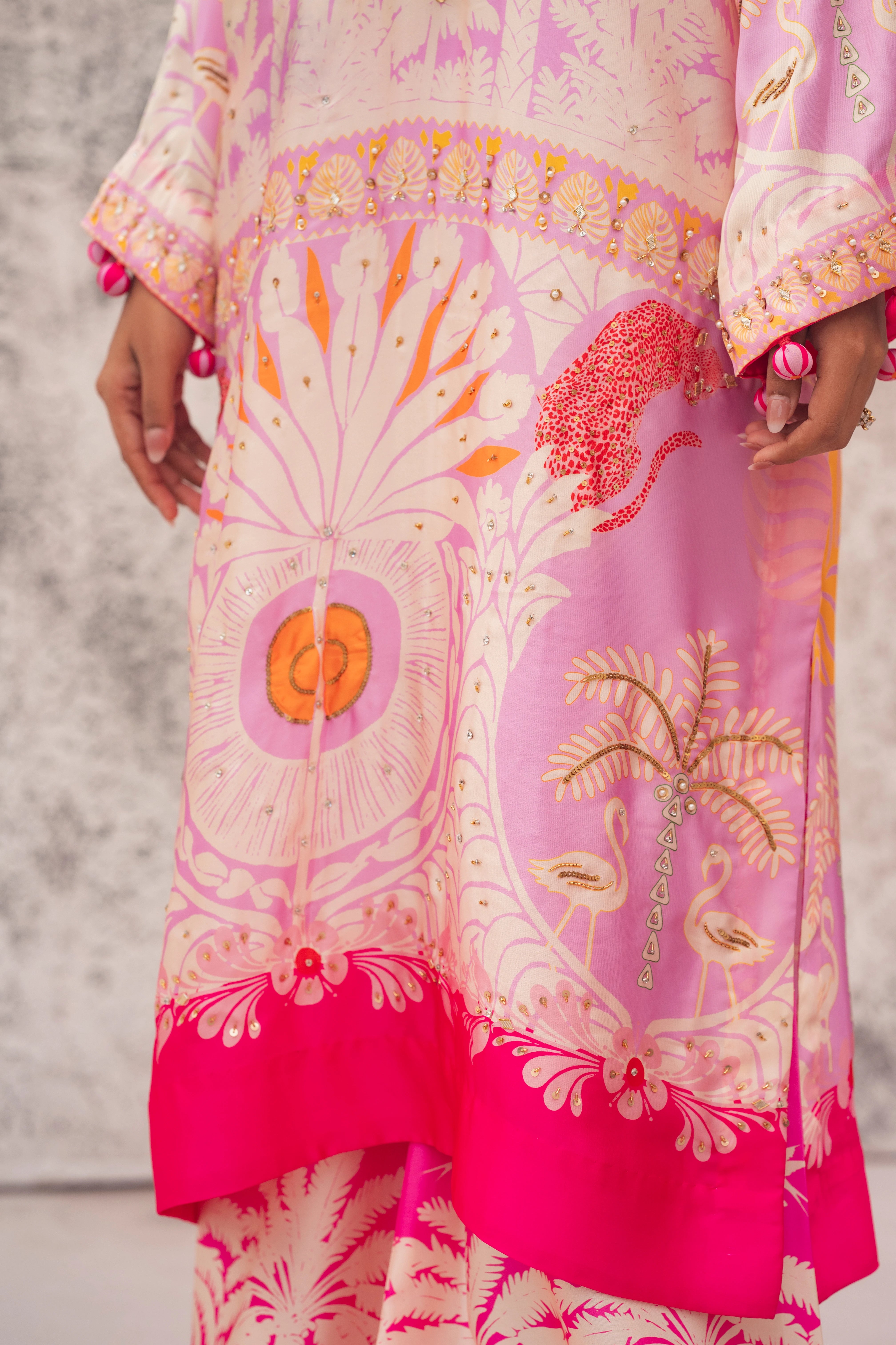 LIA - Festive Formal - VOL 2: A vision of effortless elegance, this digitally printed pink lavender shamooz silk A-lined shirt unfolds in a relaxed long silhouette. The neckline is traced with delicate embroidery, while vivid fuchsia, blush and beige borders frame the sleeves and hem in floral details. Across the canvas, motifs of palm trees, birds, leopards bloom with a subtle shimmer of sequins, zardoze, beads and gota. Paired with digitally printed shamooz silk culottes and silk dupatta finished with kingri.