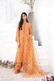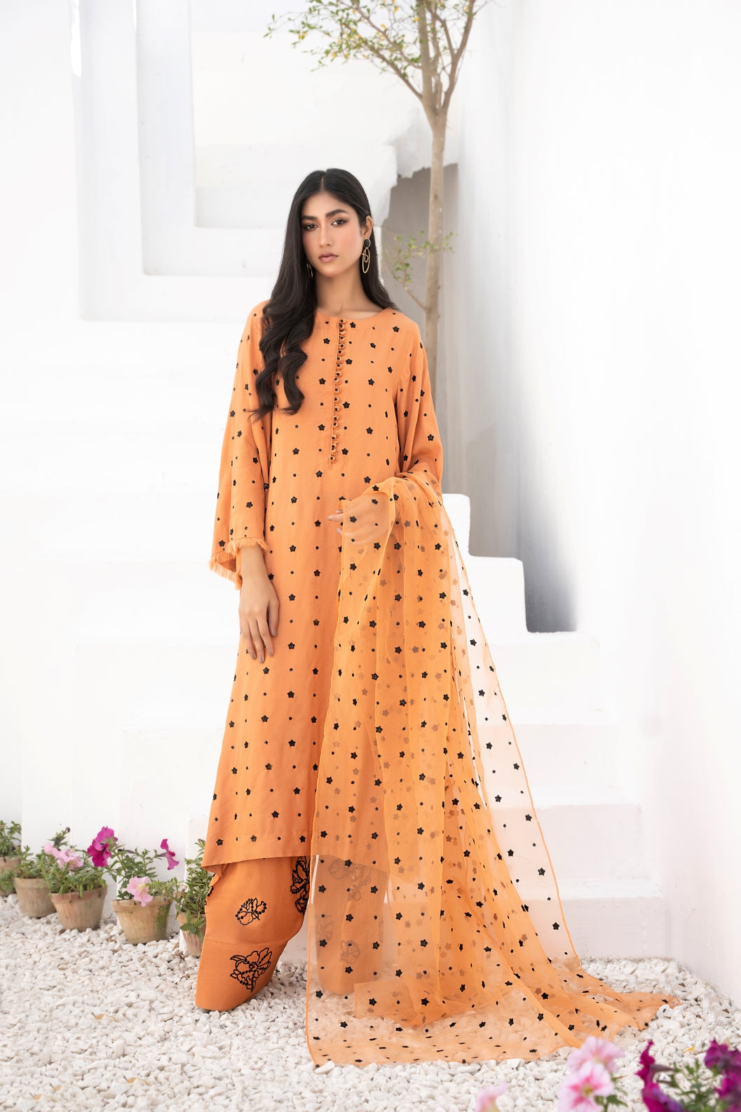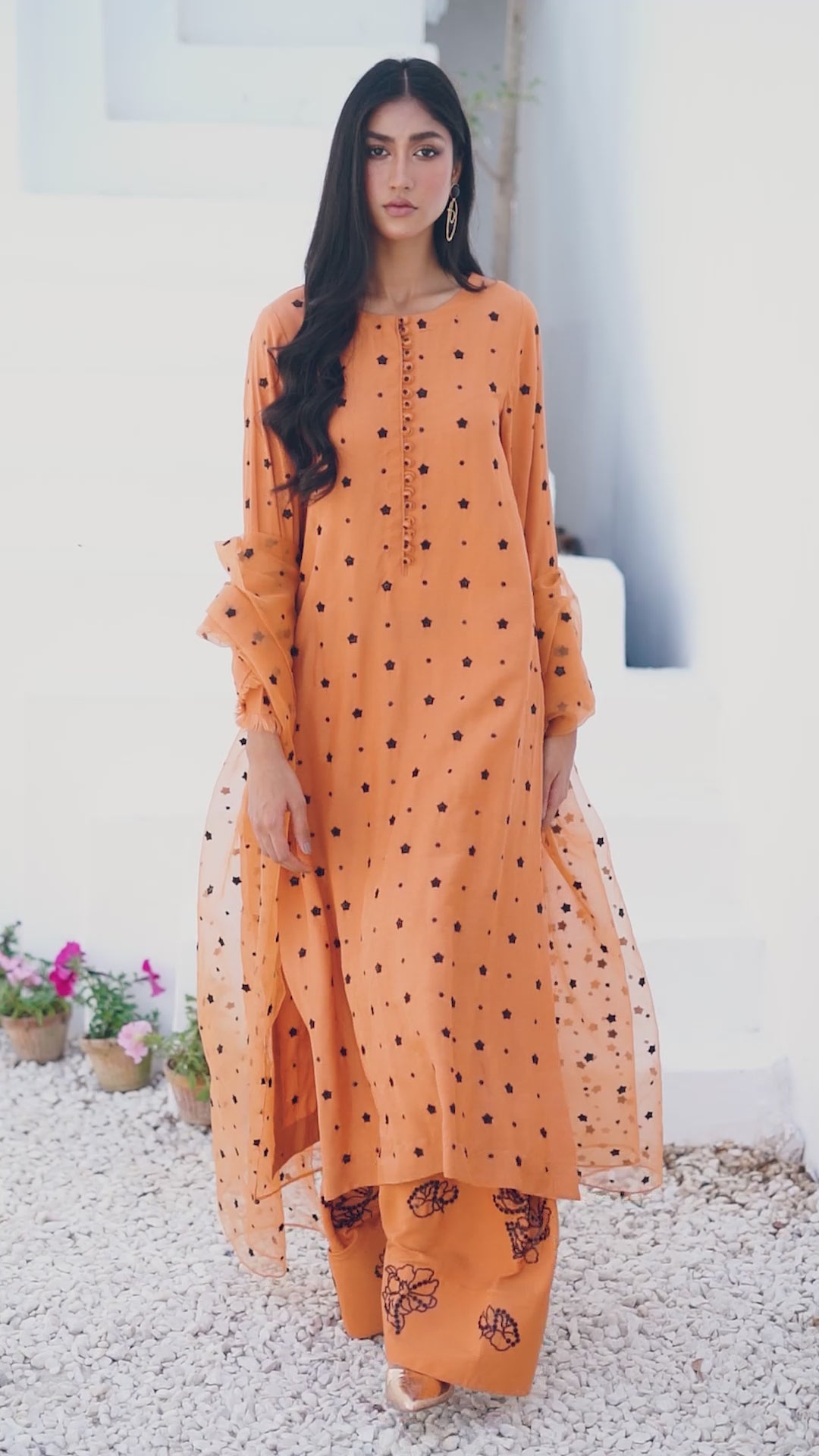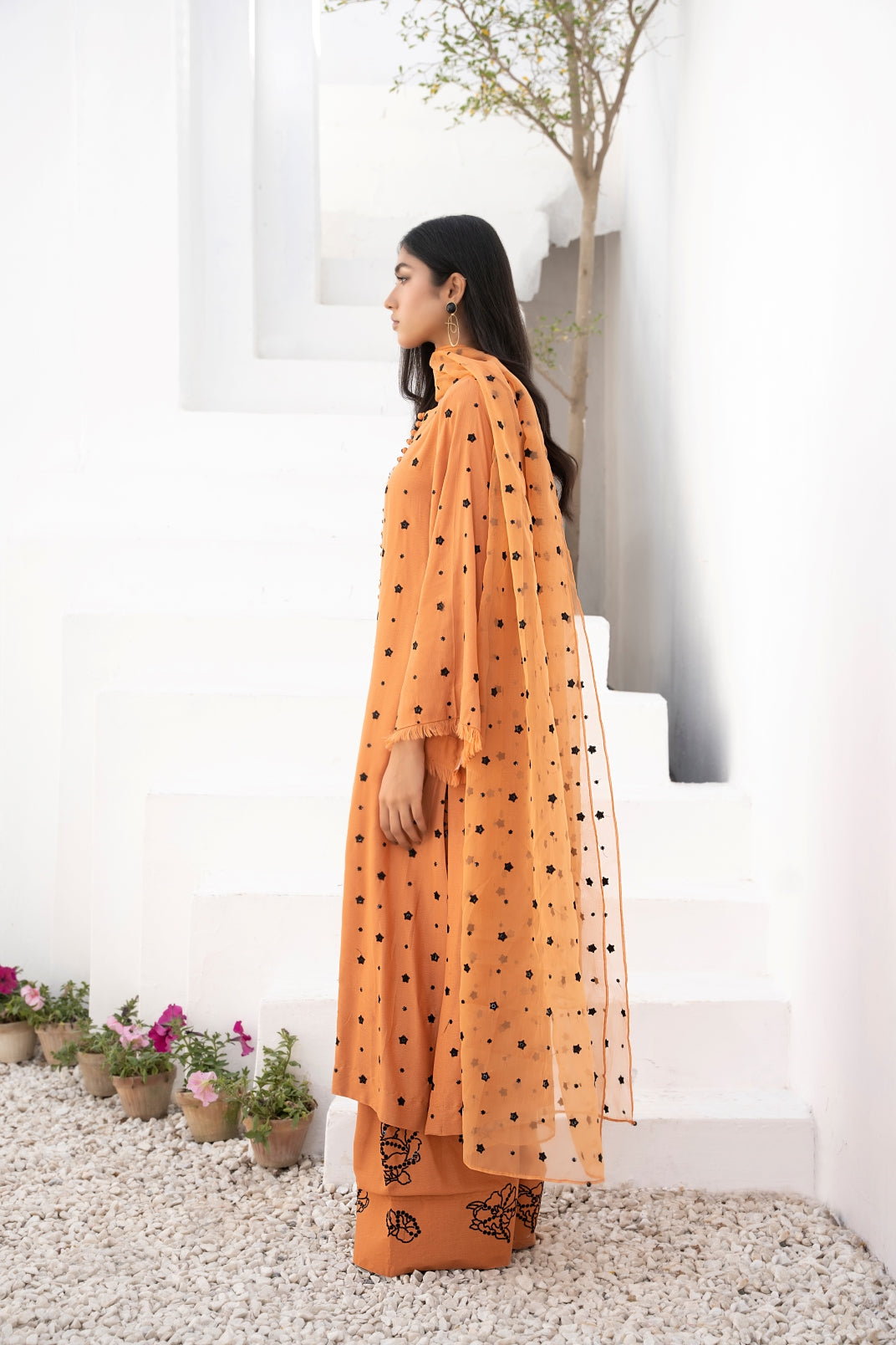 Melia'24: The ensemble features a rust orange pure crepe georgette long tunic with an organza dupatta featuring black thread with sequins motif embroidery all over. Embellished with crystal beads and frayed edges. Paired up with a matching shalwar featuring floral line sequins embroidery all over in black to create an elegant and classic look.