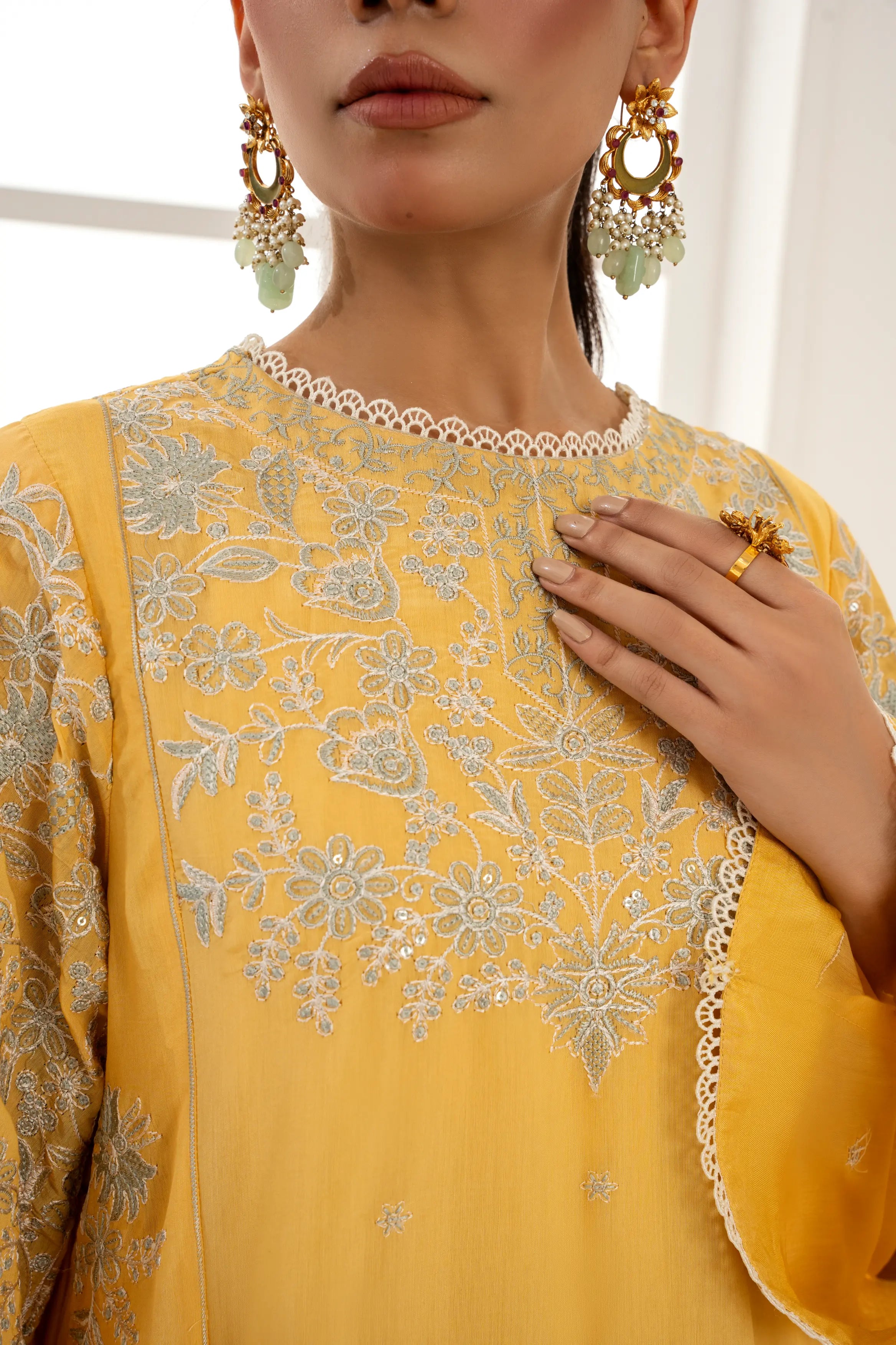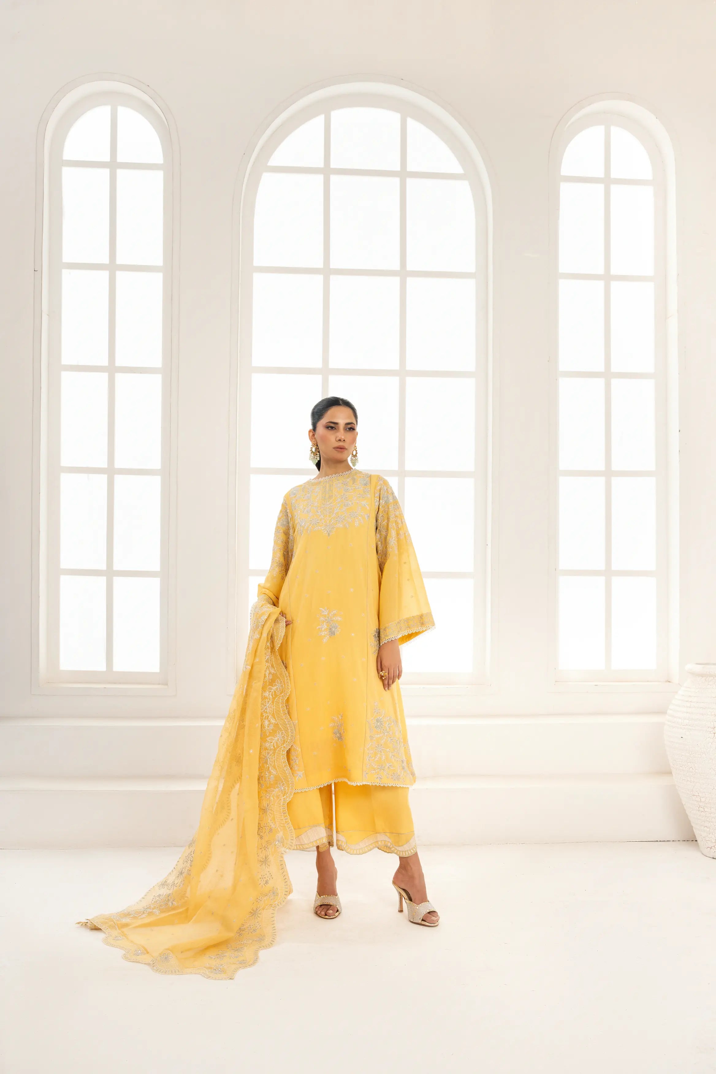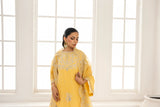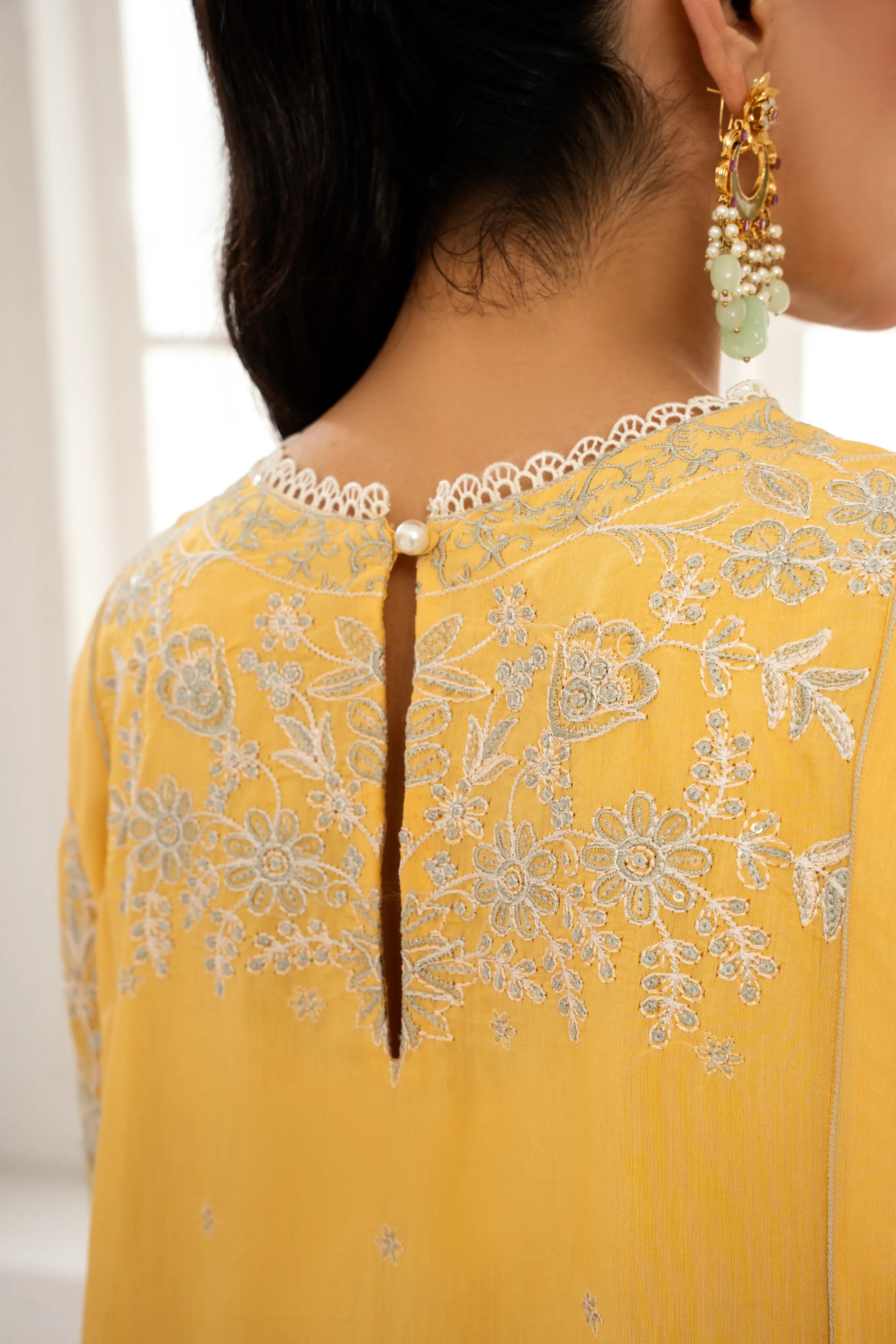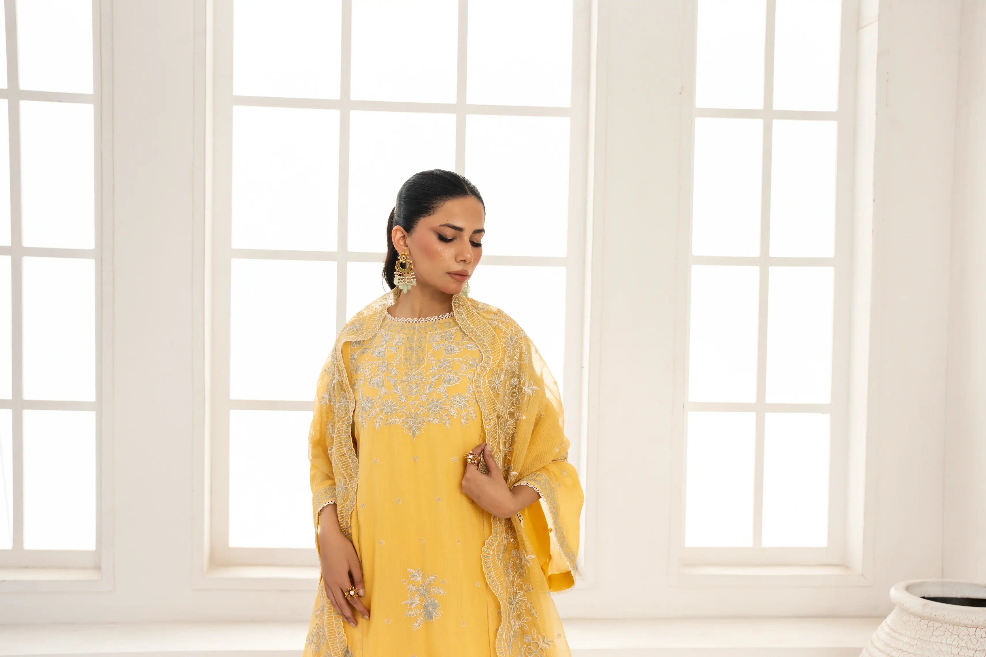 FLORA & FAUNA - Eid Festive: A lemon voile panelled long underlined shirt with round neck features detailed contrasting thread and sequins embroidery. Kurta sleeves adorned with embroidery and lace finishing. Ivory lace and pearl finishing on the neckline. Lemon katan silk culotte embellished with thread embroidered and cutwork edges. Paired with lemon khaadi silk dupatta adorned with thread and sequins embroidery.