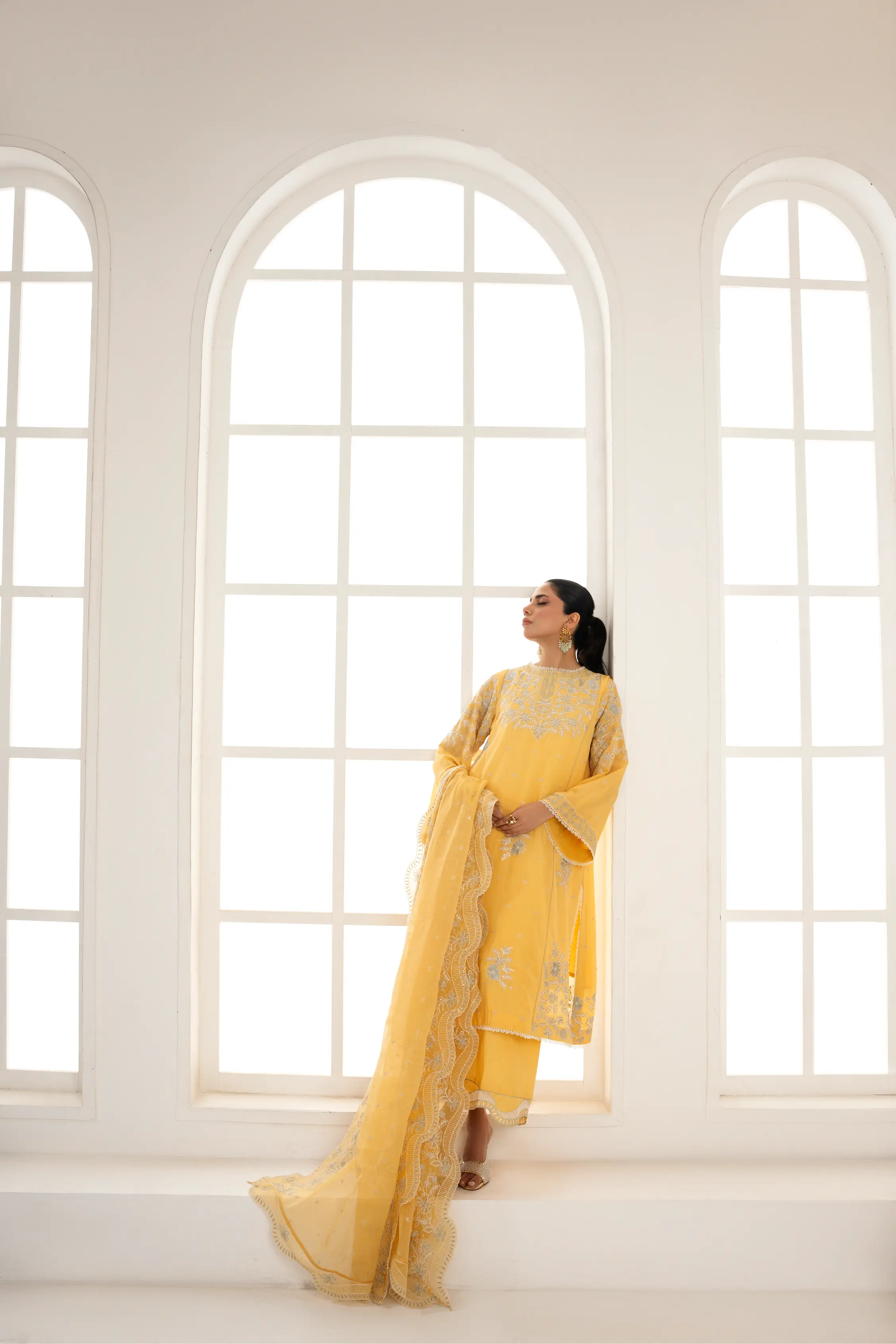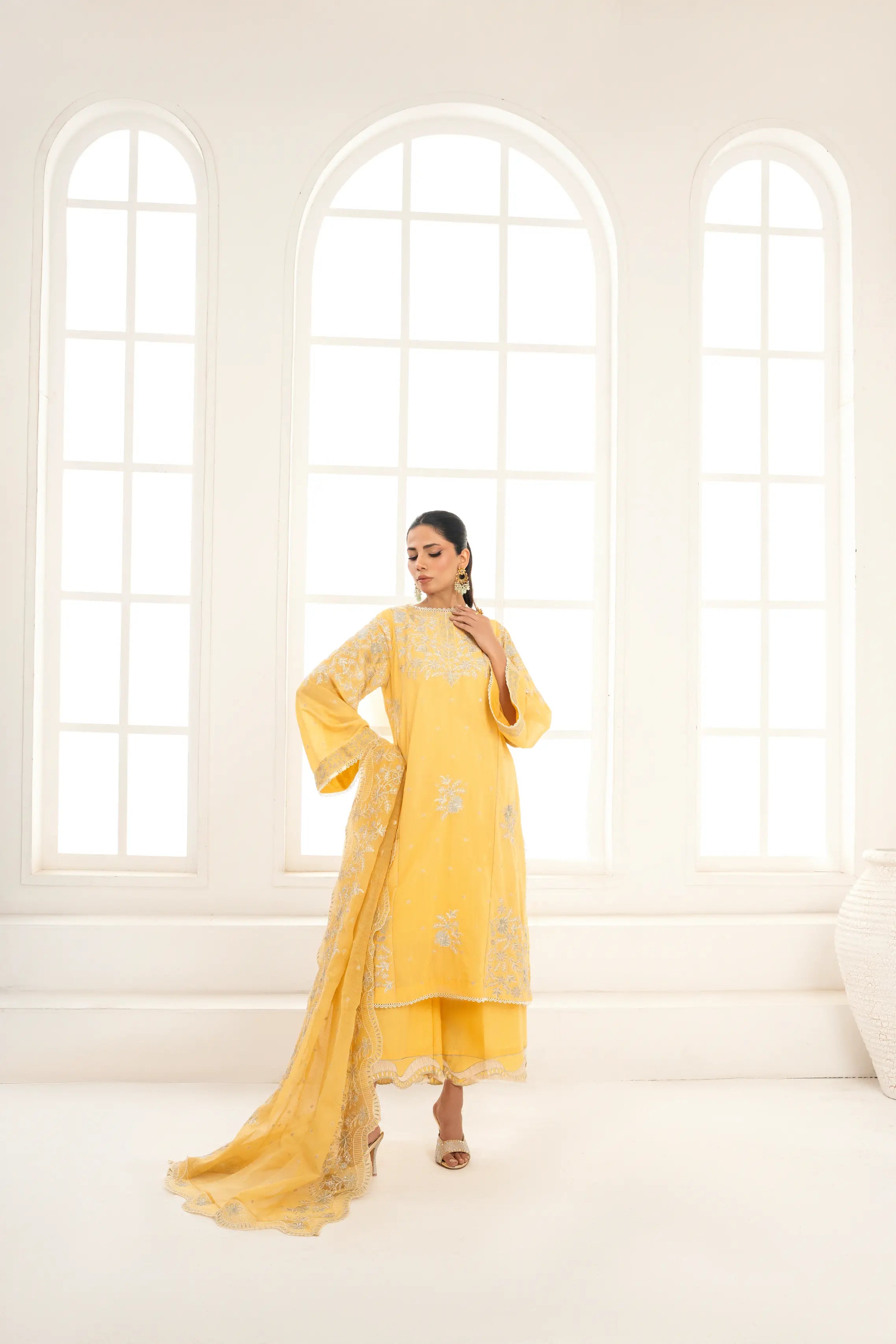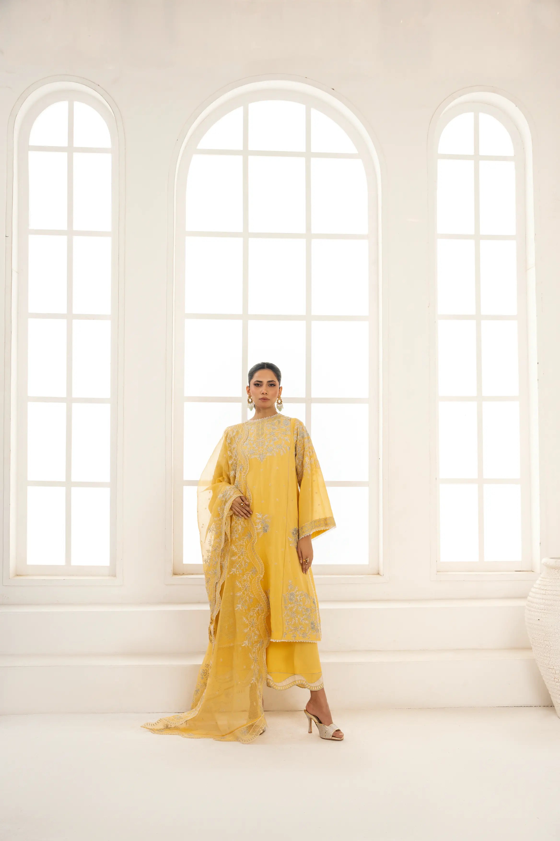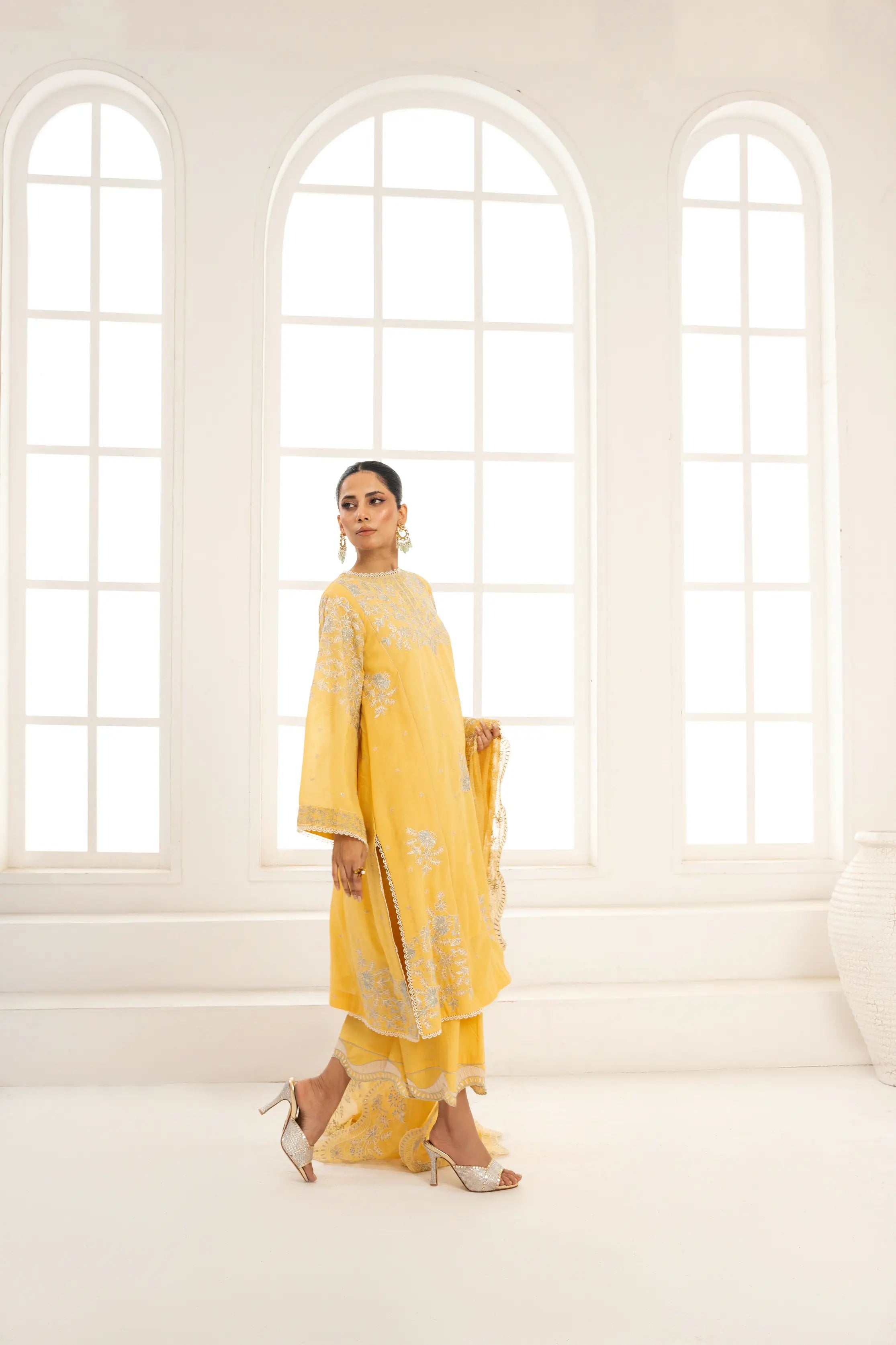 FLORA & FAUNA - Eid Festive: A lemon voile panelled long underlined shirt with round neck features detailed contrasting thread and sequins embroidery. Kurta sleeves adorned with embroidery and lace finishing. Ivory lace and pearl finishing on the neckline. Lemon katan silk culotte embellished with thread embroidered and cutwork edges. Paired with lemon khaadi silk dupatta adorned with thread and sequins embroidery.