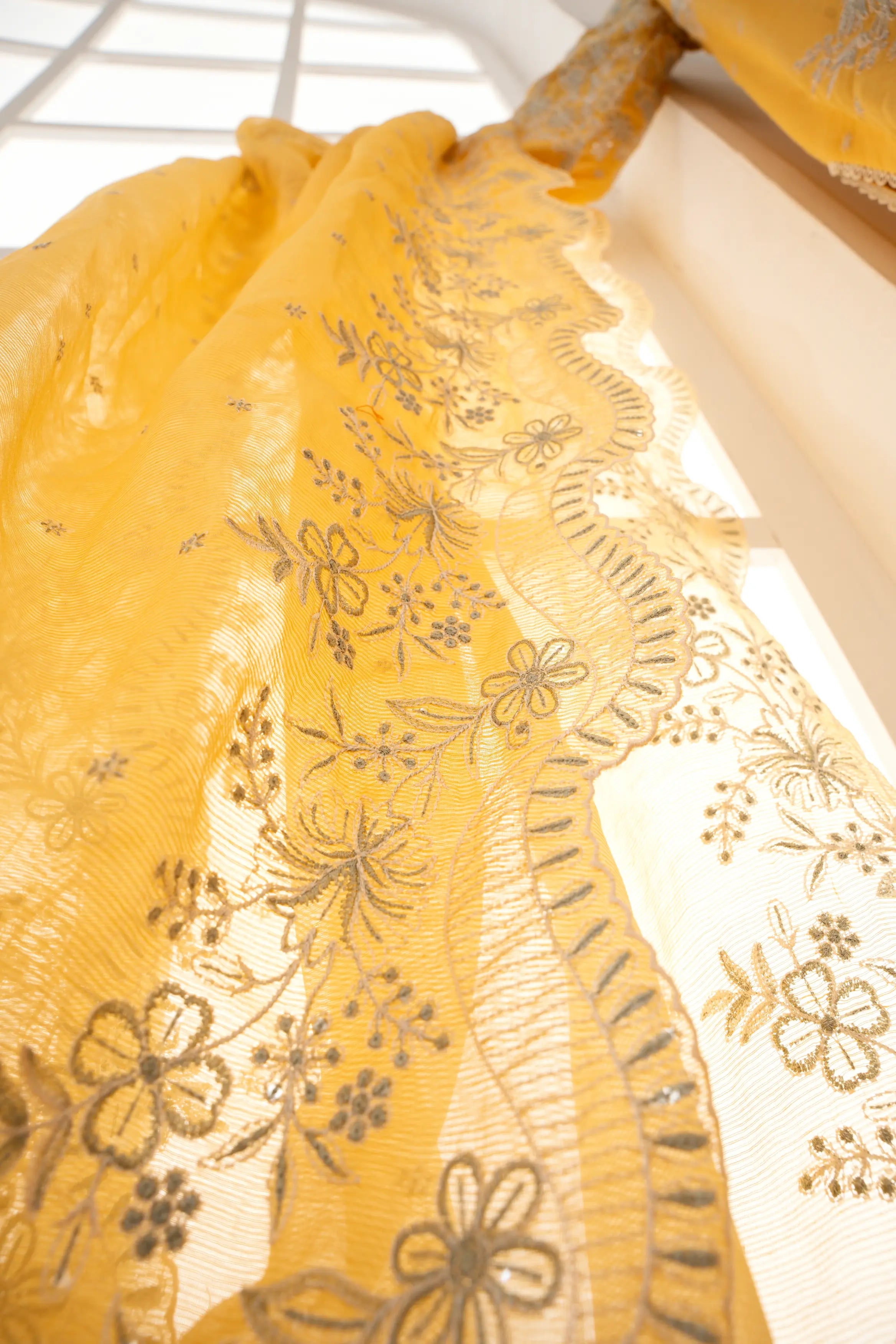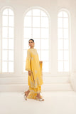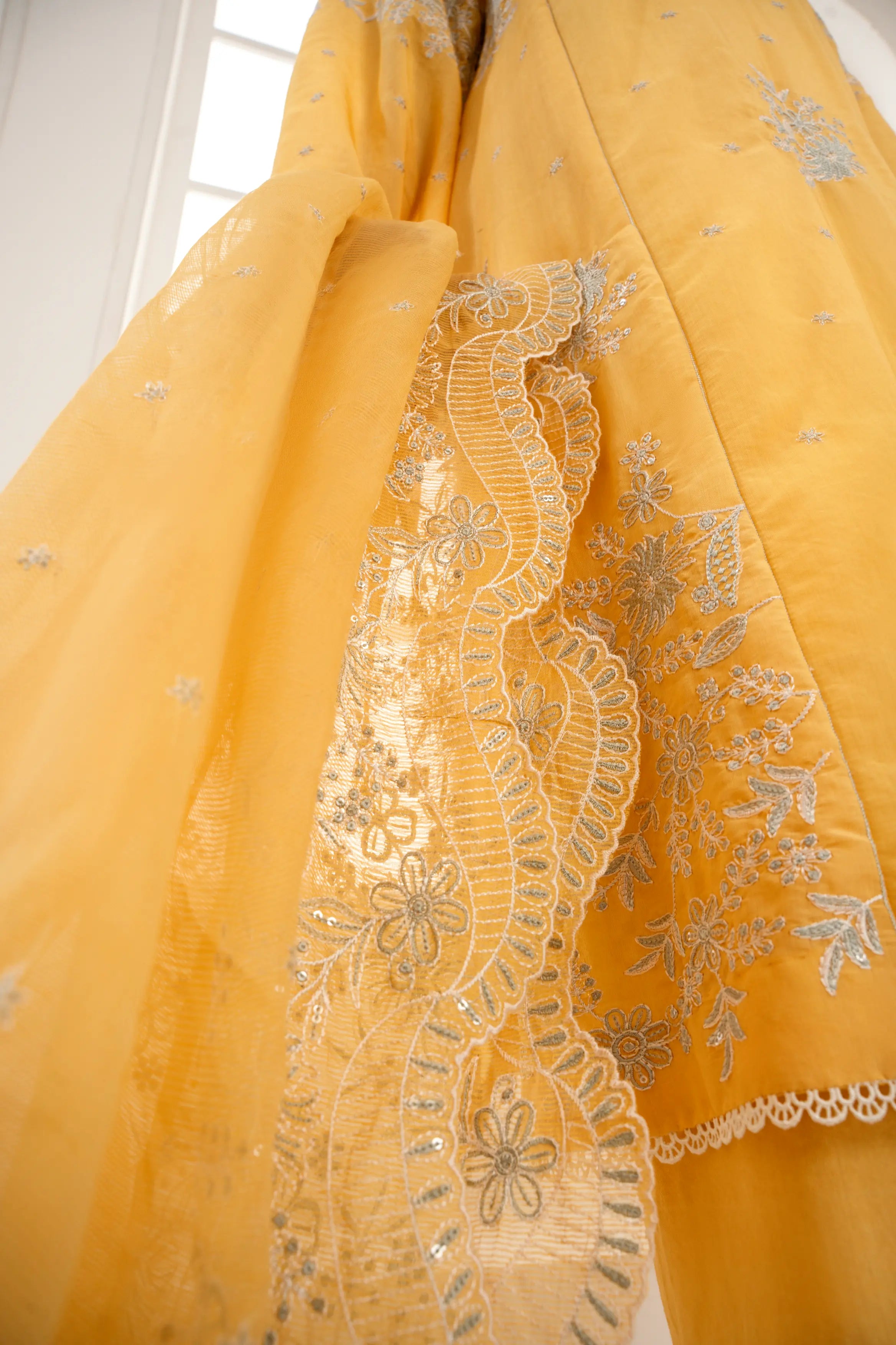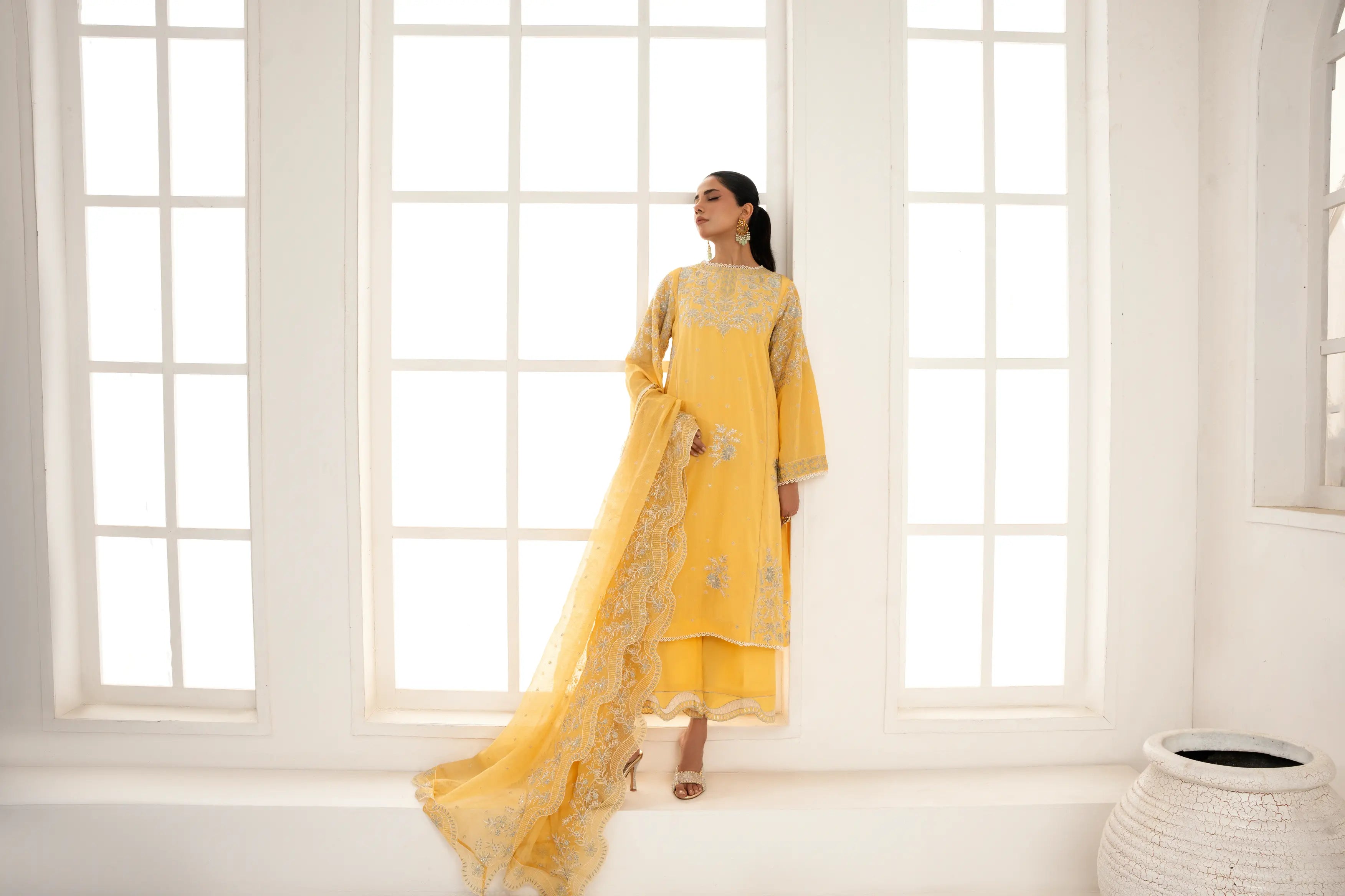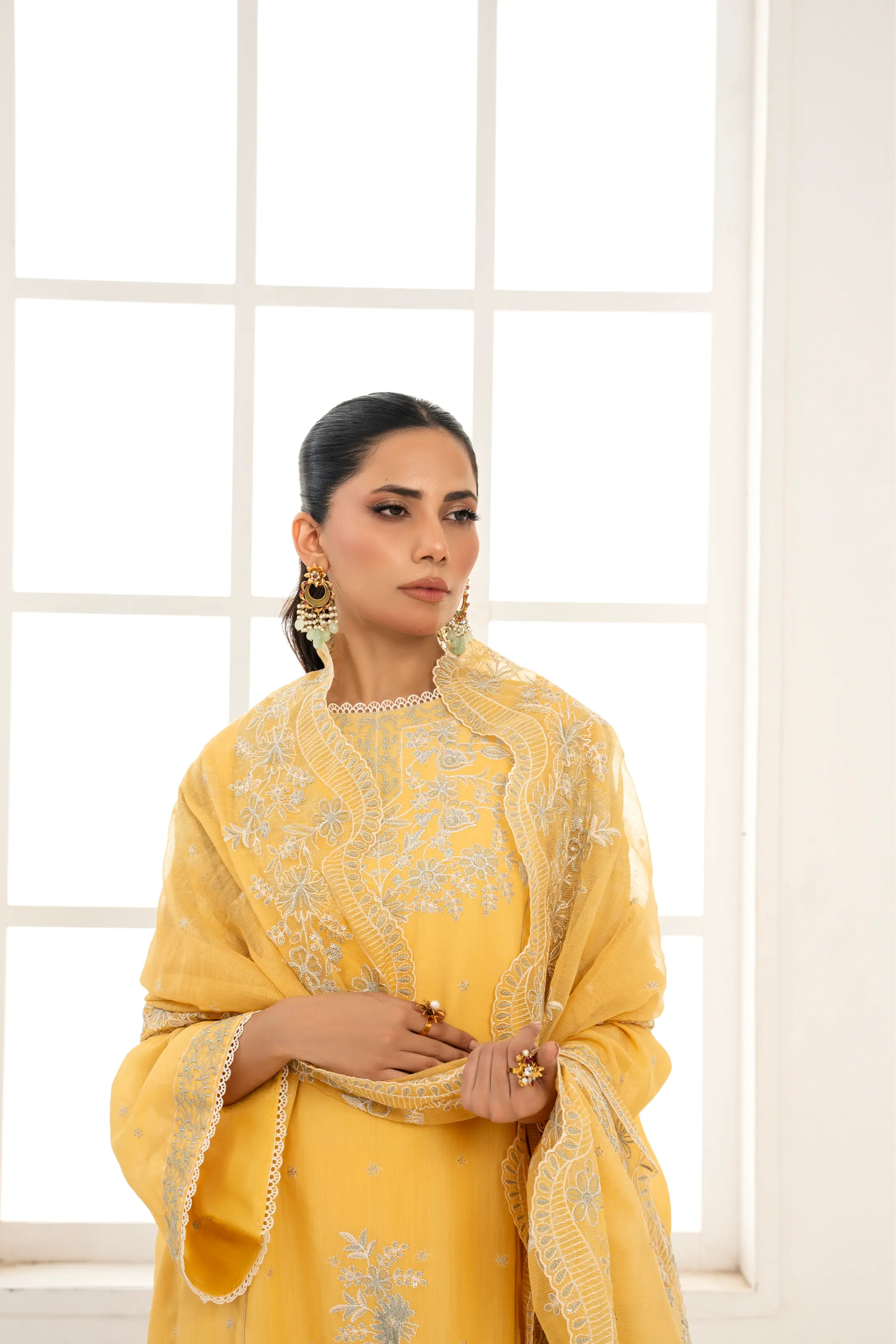 FLORA & FAUNA - Eid Festive: A lemon voile panelled long underlined shirt with round neck features detailed contrasting thread and sequins embroidery. Kurta sleeves adorned with embroidery and lace finishing. Ivory lace and pearl finishing on the neckline. Lemon katan silk culotte embellished with thread embroidered and cutwork edges. Paired with lemon khaadi silk dupatta adorned with thread and sequins embroidery.
