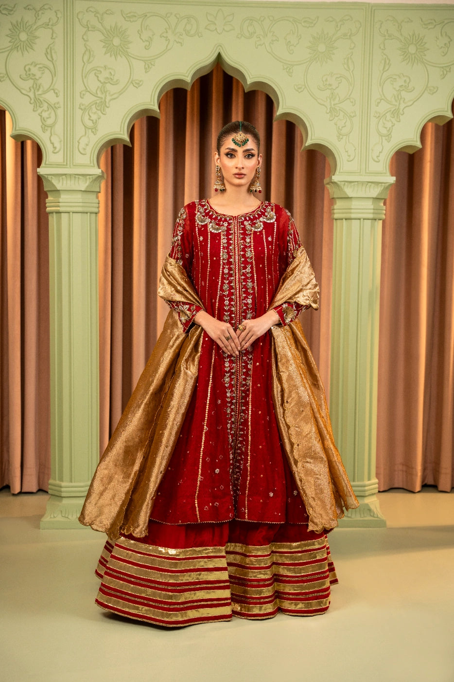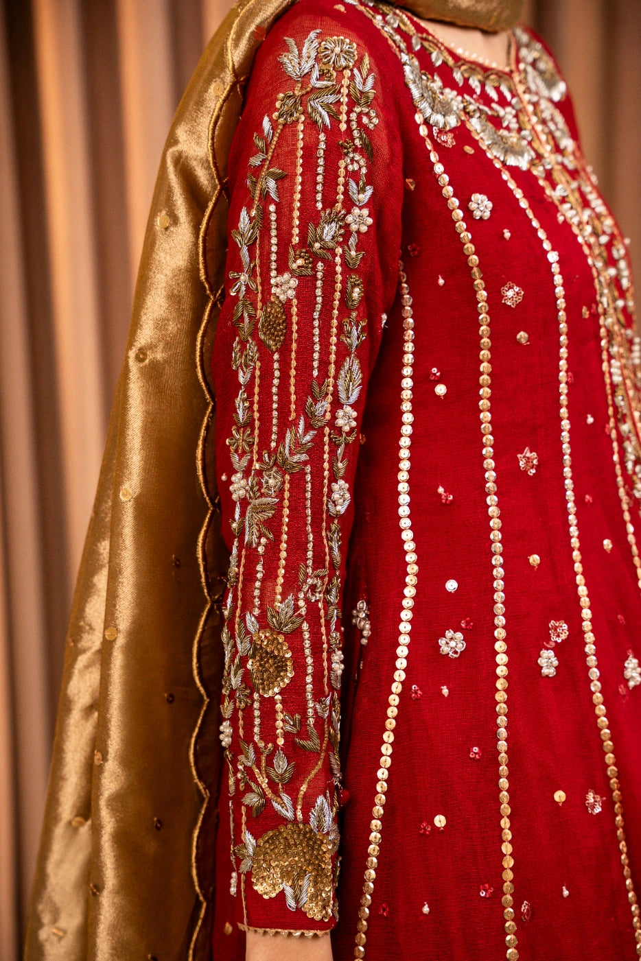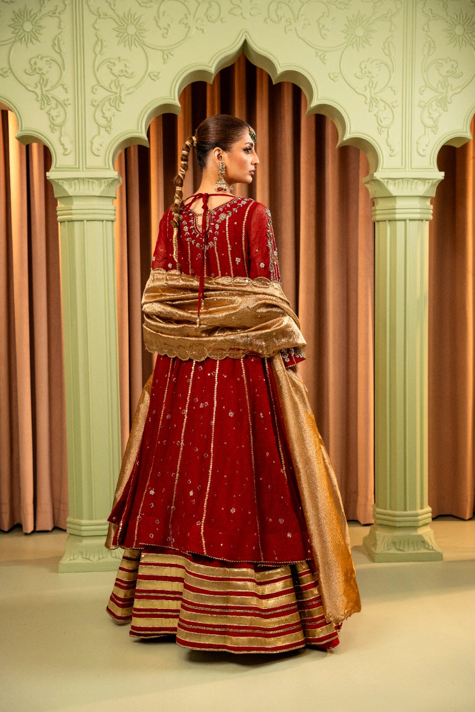 A sandoori red Khaadi net features detailed floral silver and dull gold handwork embroidery. The sandoori red Korean raw silk lengha embellished with gota border. Paired with gold lama tissue dupatta embellished zari embroidery.