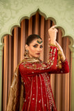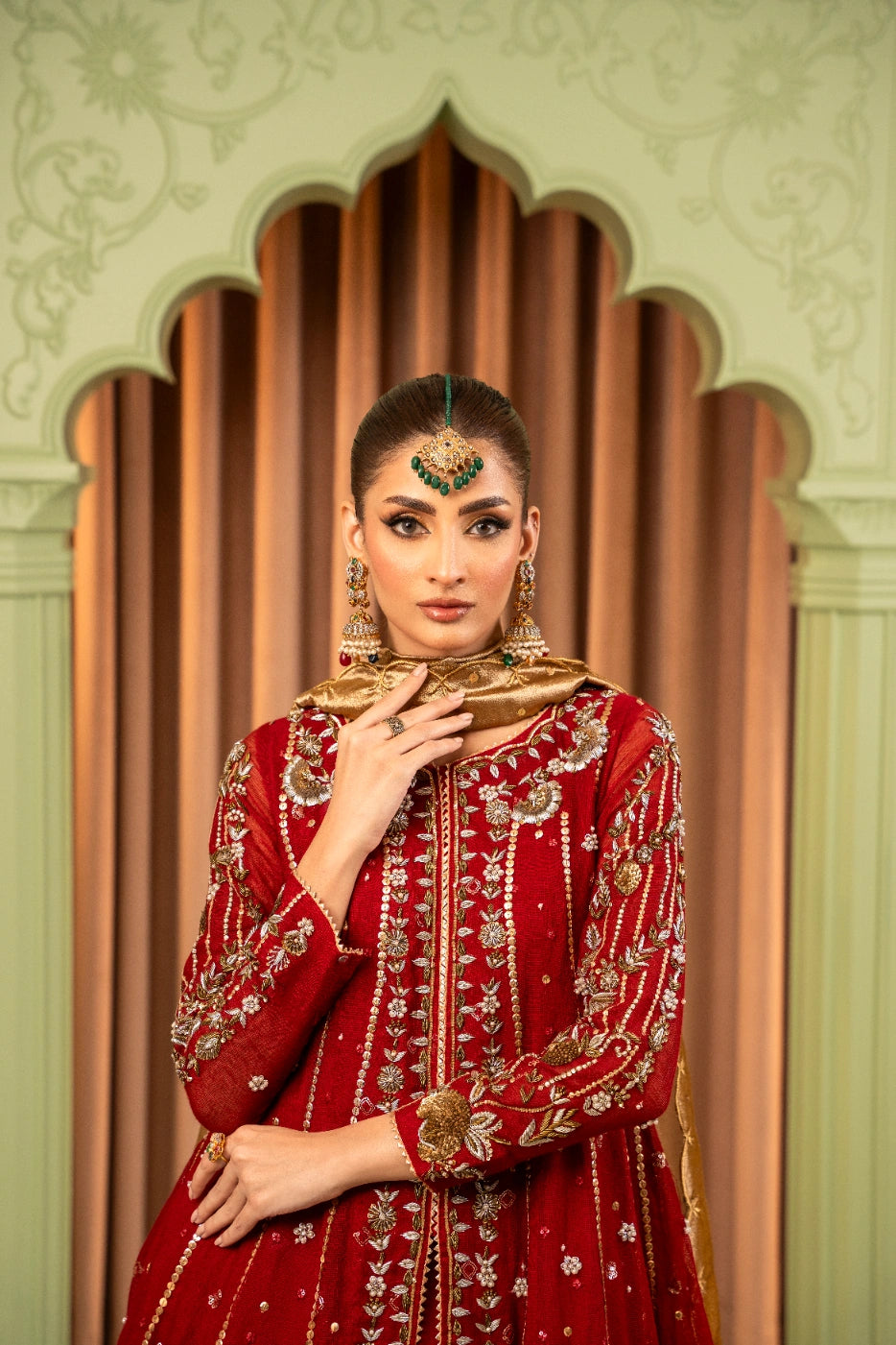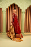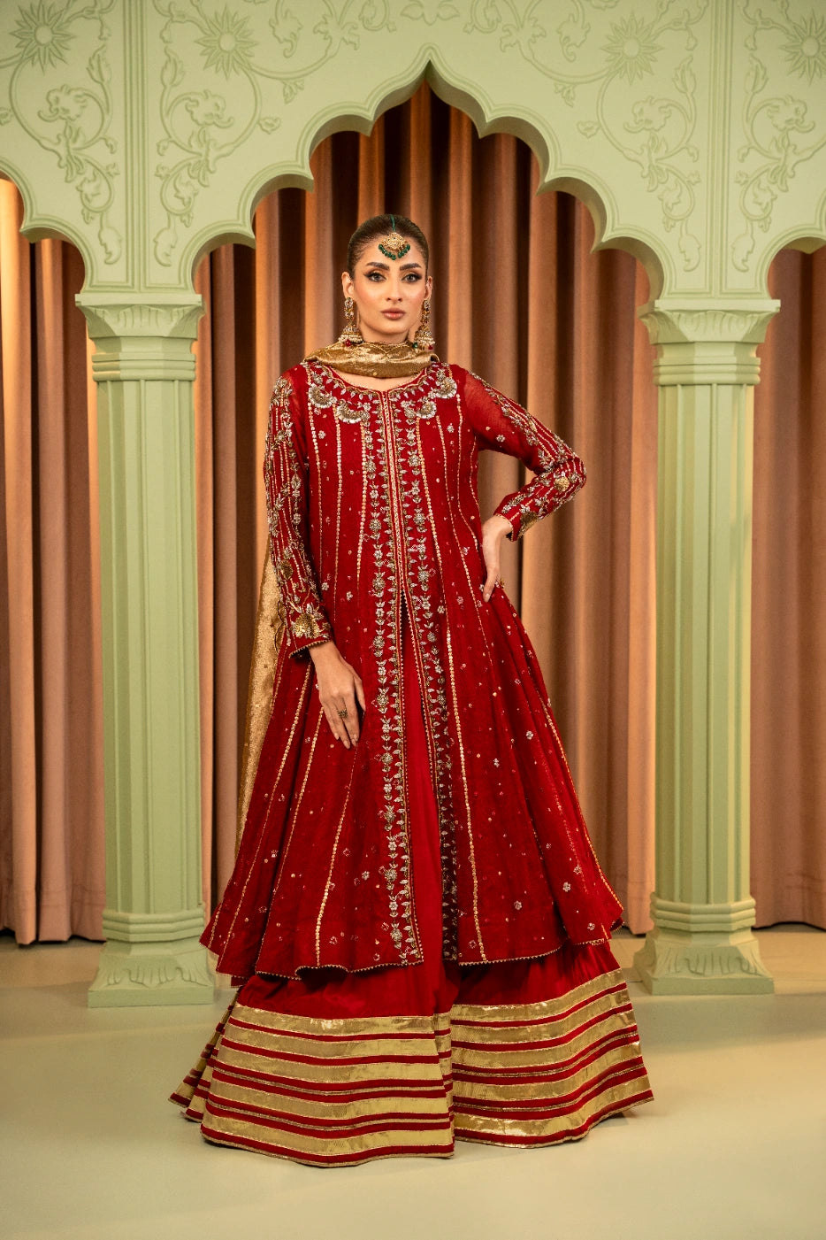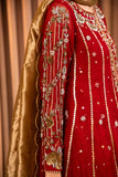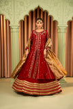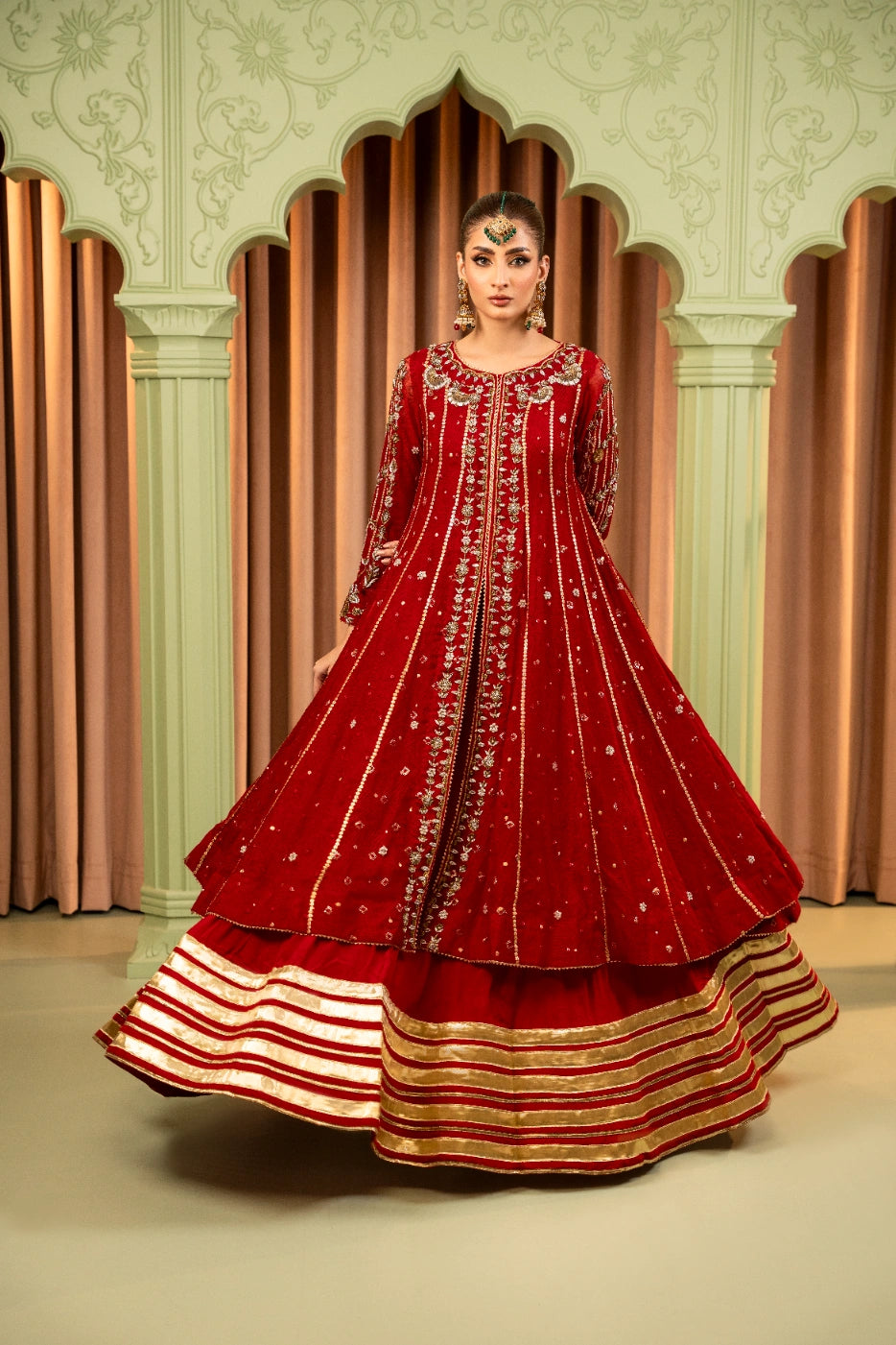 A sandoori red Khaadi net features detailed floral silver and dull gold handwork embroidery. The sandoori red Korean raw silk lengha embellished with gota border. Paired with gold lama tissue dupatta embellished zari embroidery.