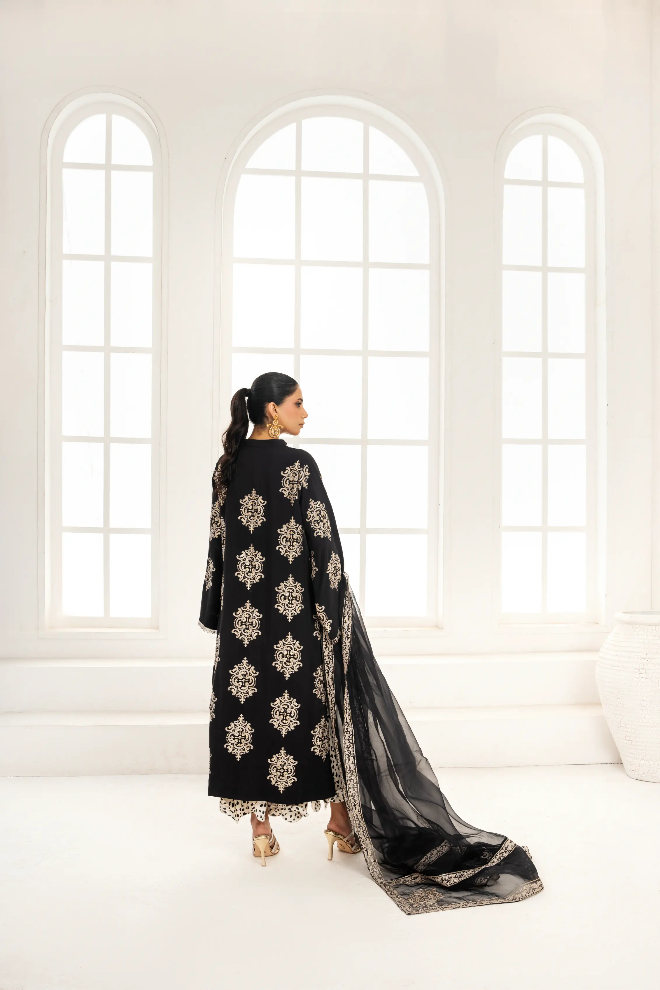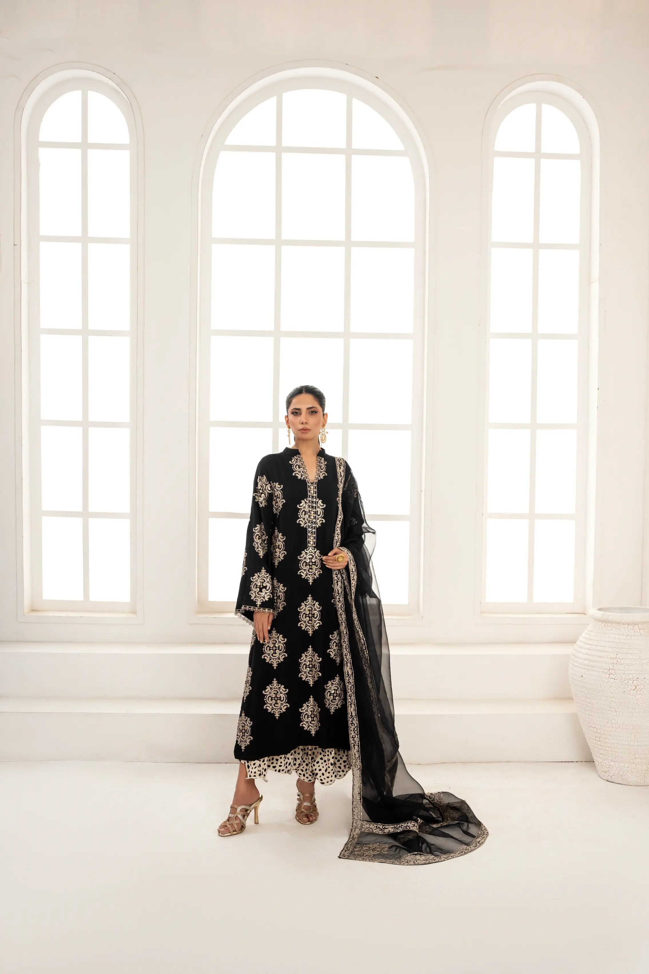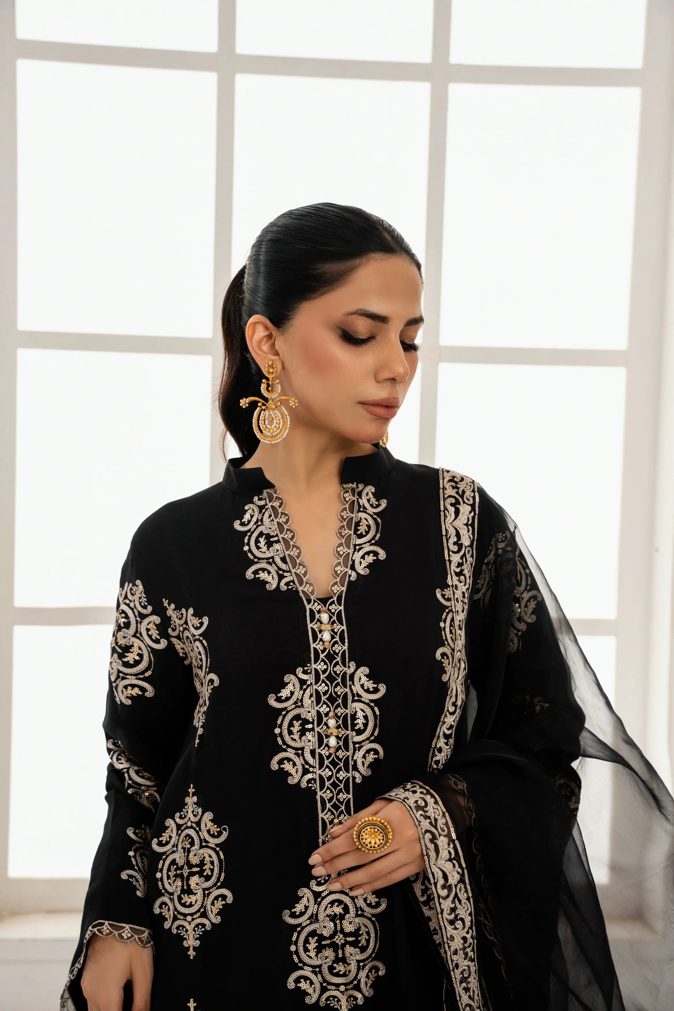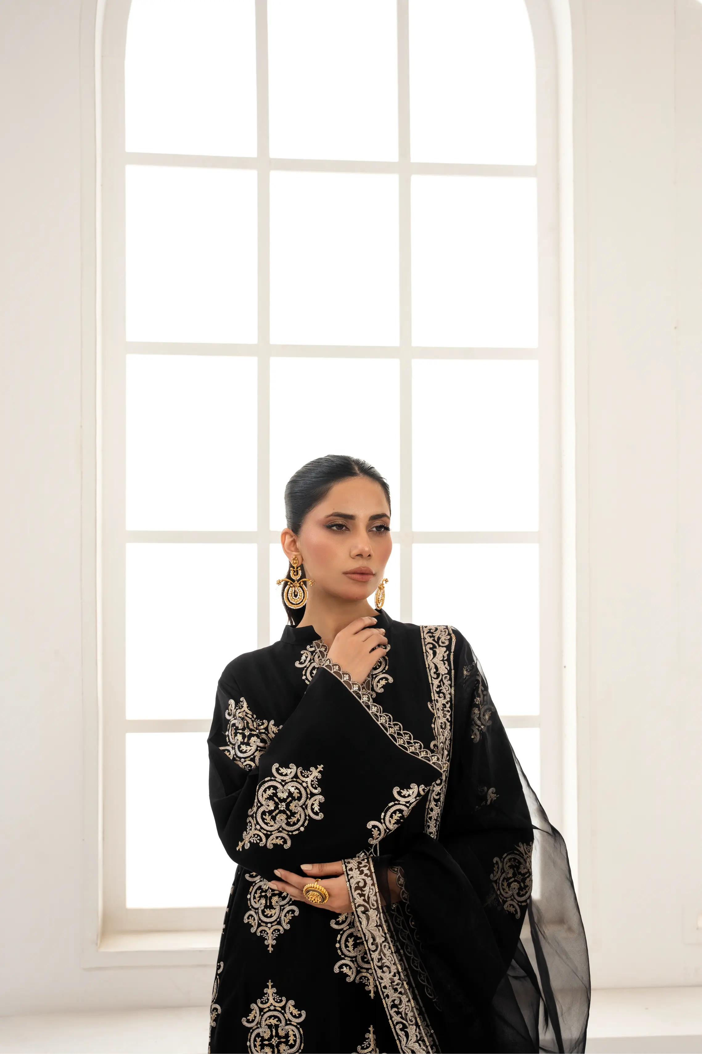 FLORA & FAUNA - Eid Festive: A black crepe georgette band collar long shirt features detailed thread and sequins embroidery. Kurta sleeves with organza lace finishing. The printed crepe georgette swirl dhaka pajama. Paired with black organza dupatta adorned with thread and sequins embroidery motifs and borders.
