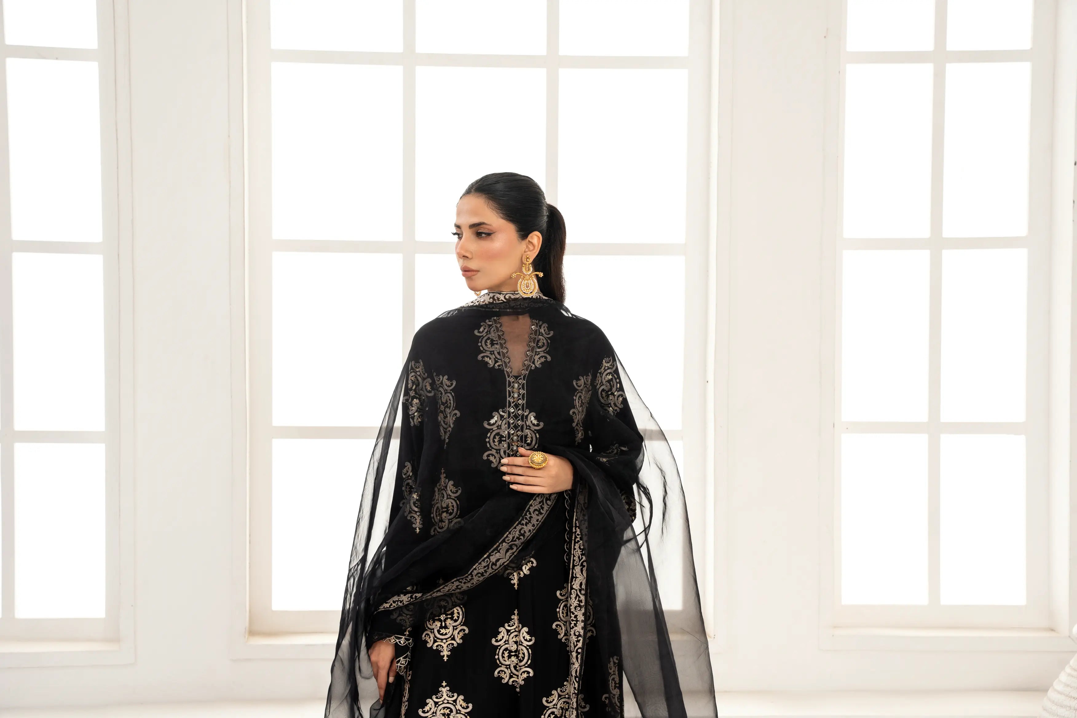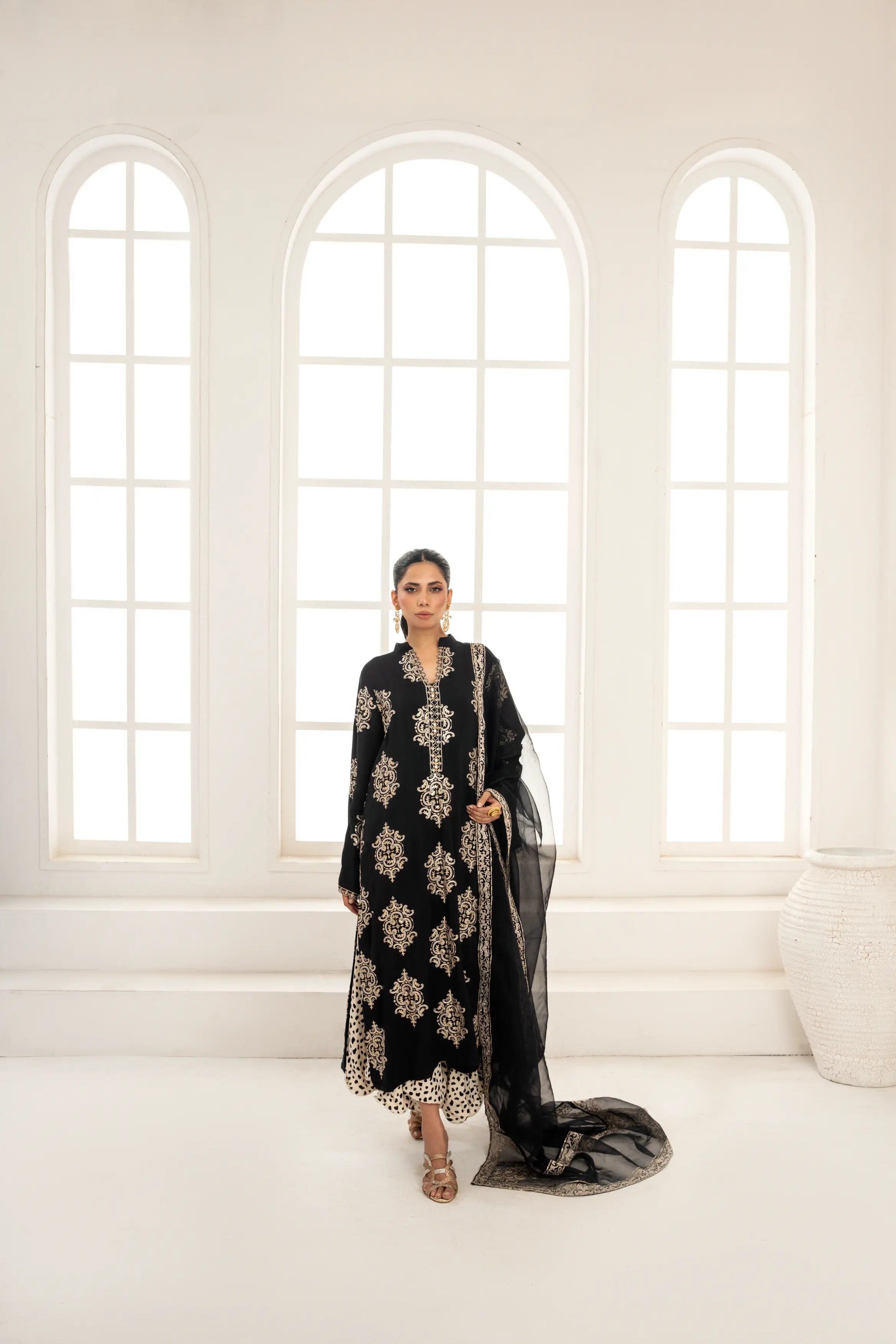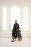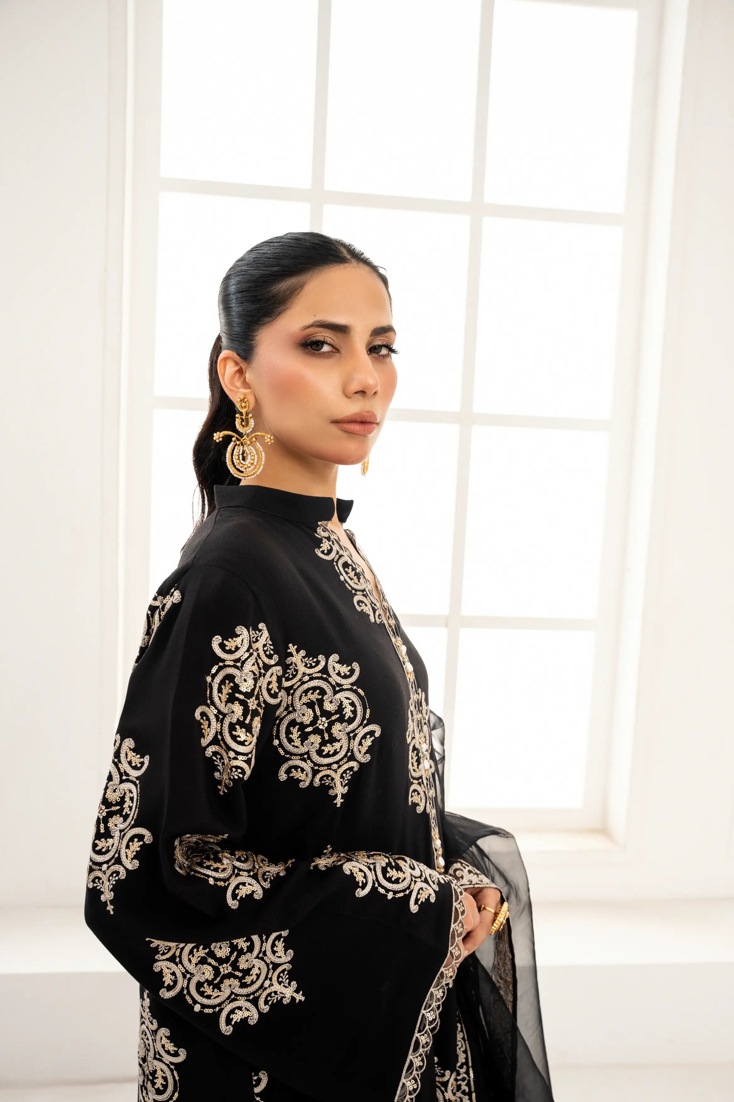 FLORA & FAUNA - Eid Festive: A black crepe georgette band collar long shirt features detailed thread and sequins embroidery. Kurta sleeves with organza lace finishing. The printed crepe georgette swirl dhaka pajama. Paired with black organza dupatta adorned with thread and sequins embroidery motifs and borders.