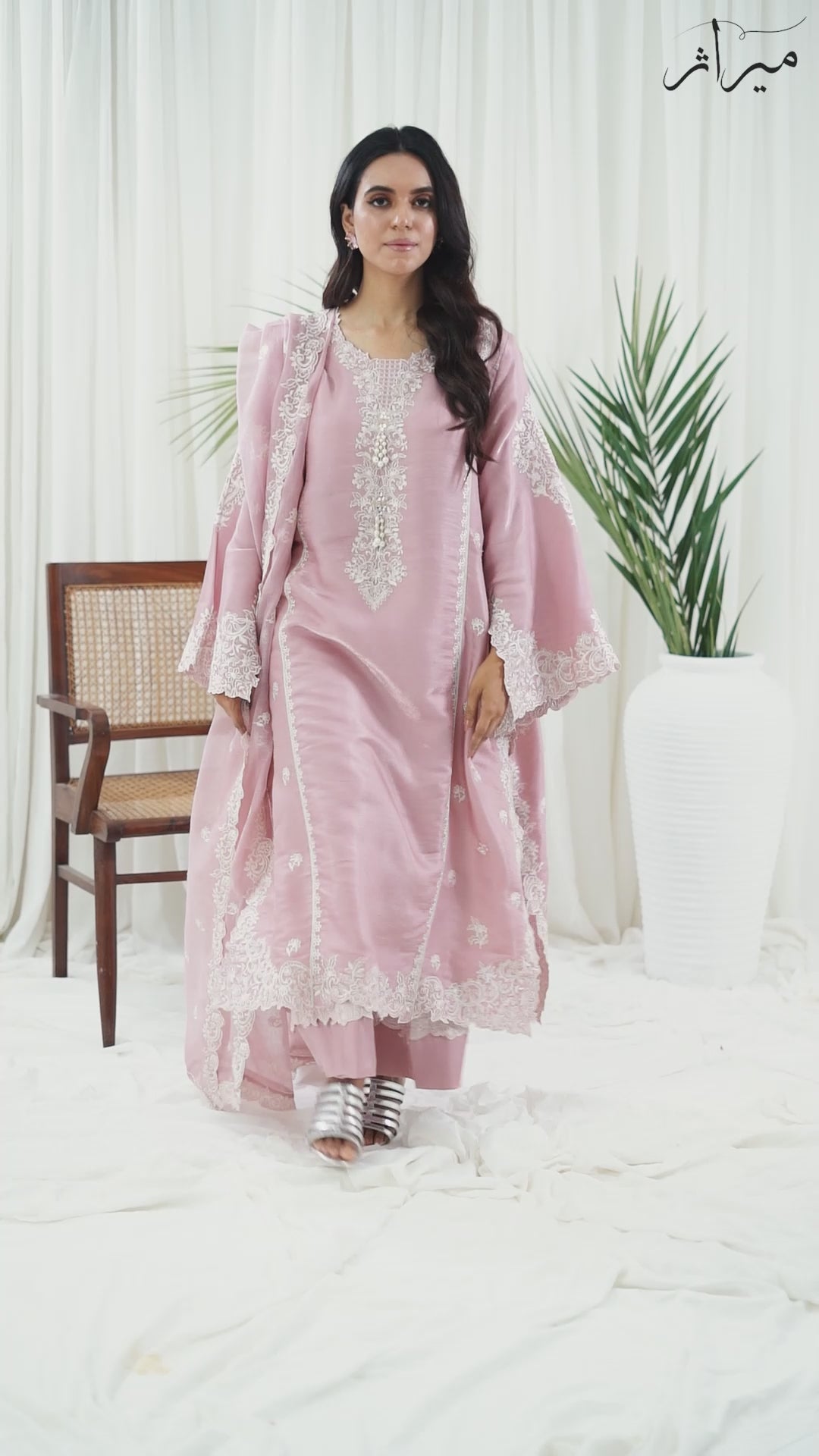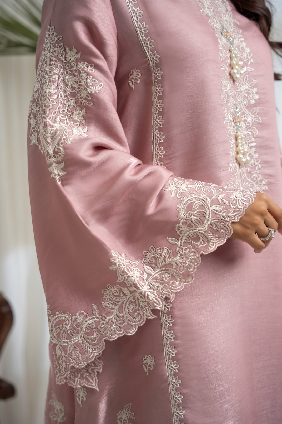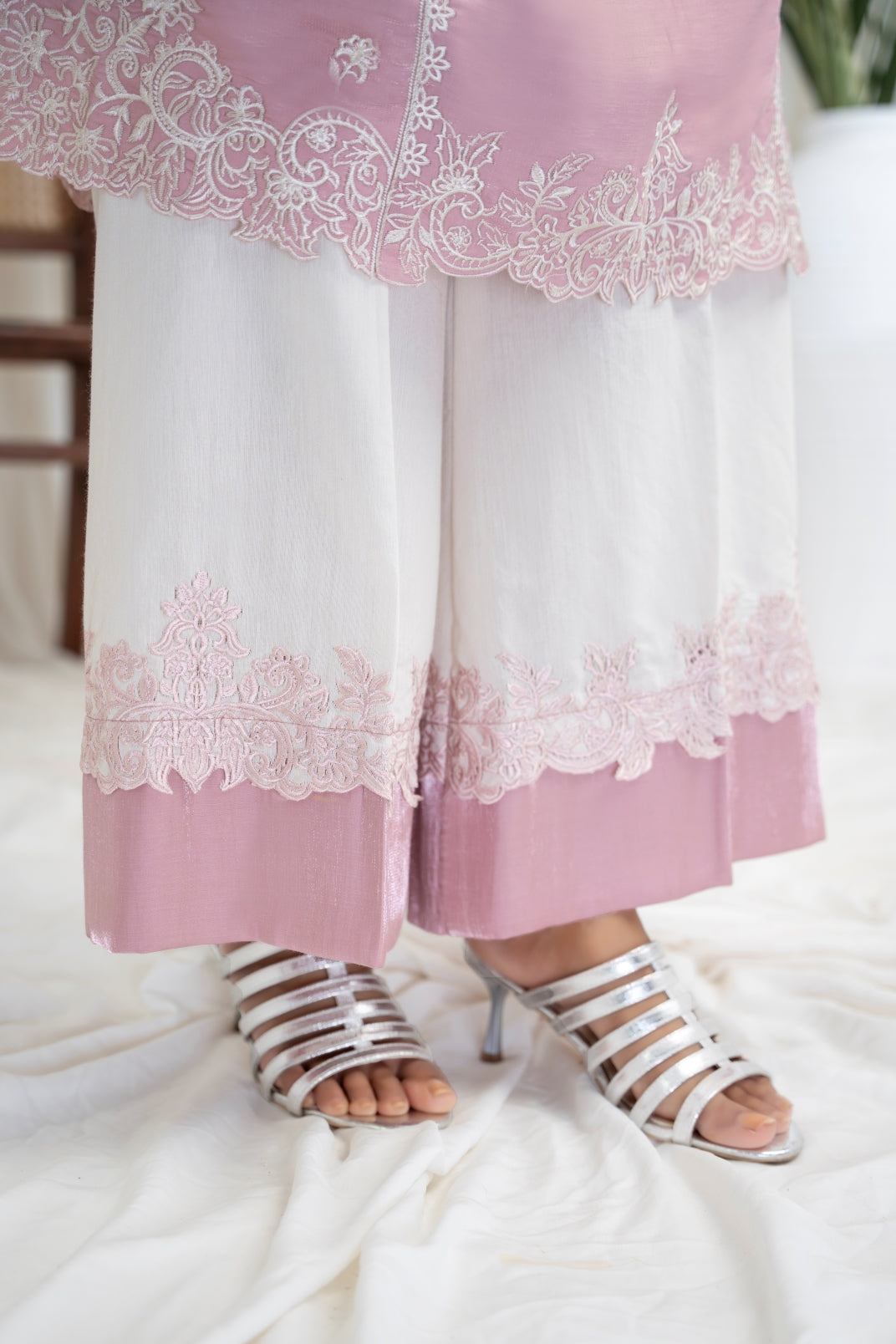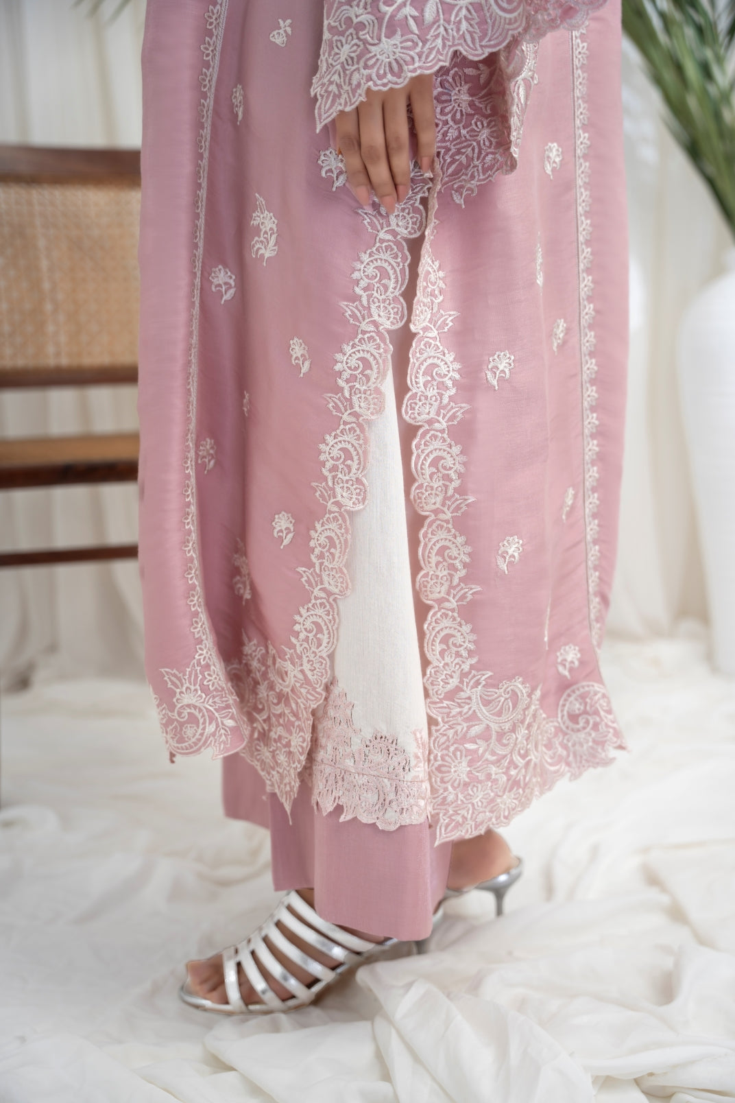 The ensemble features a tea pink A-line sheesha silk tunic with slit sleeves. Paired khaddi silk dupatta embellished with ivory cutwork thread embroidery all over. Finished with hand embroidered motifs and pearl tassels on neckline. Paired up with a matching silk cotton culotte with cutwork thread embroidery to create an elegant and timeless look.