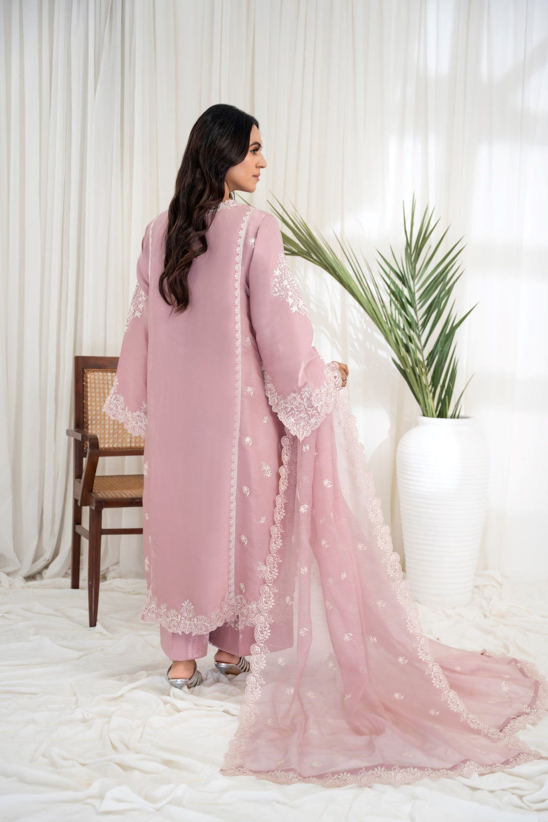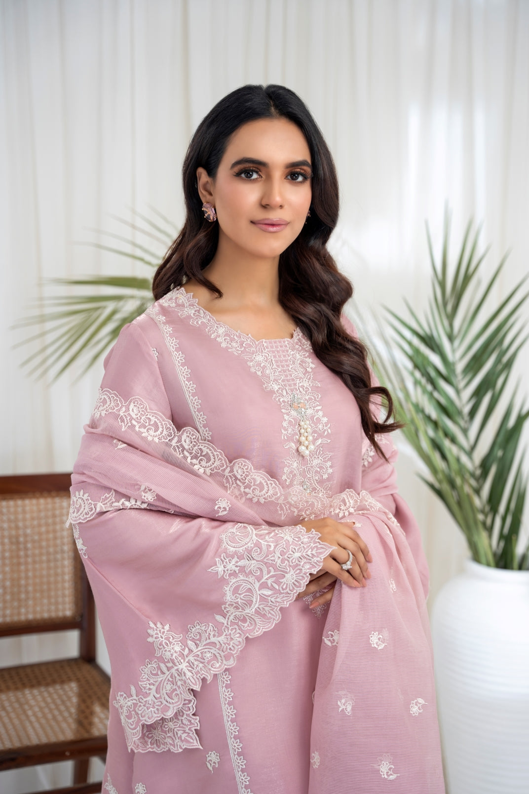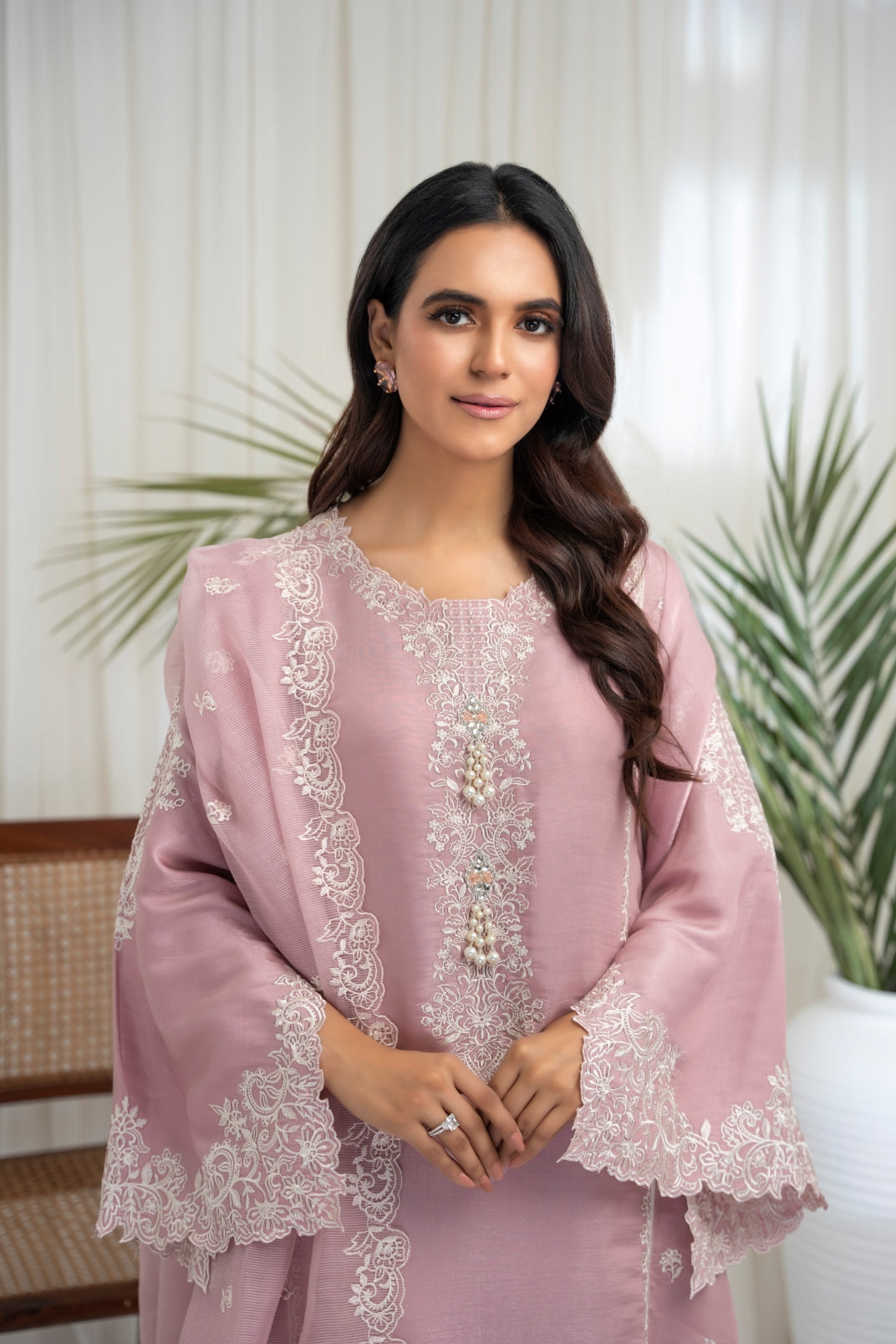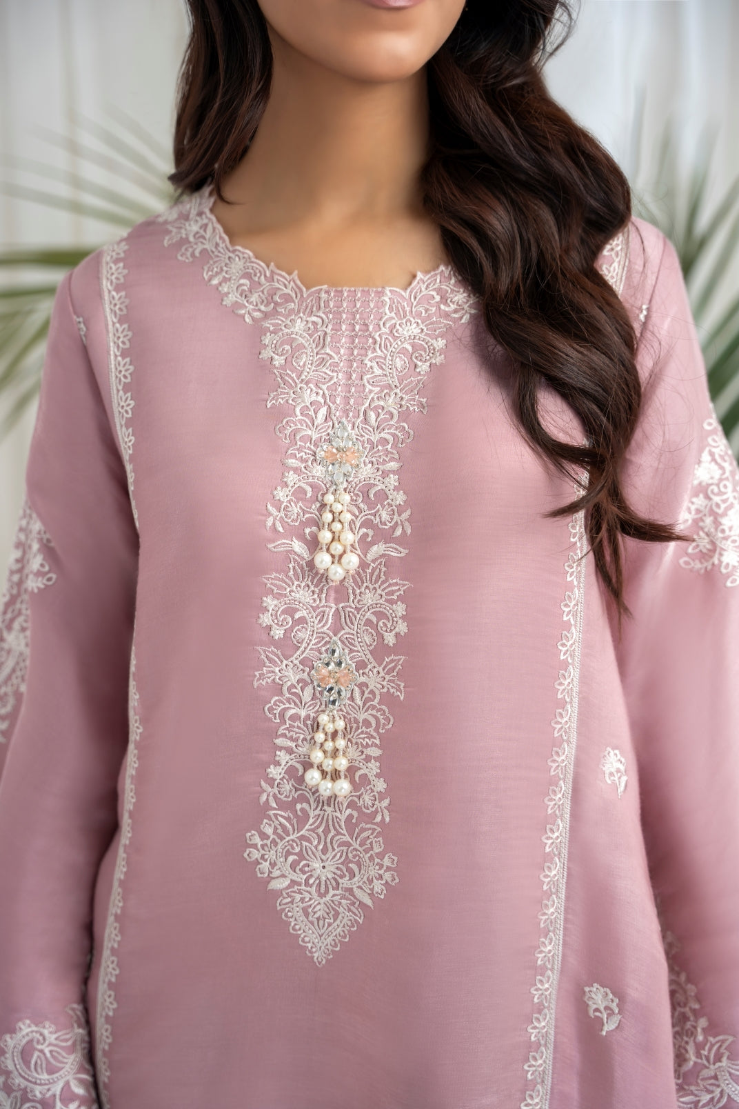 The ensemble features a tea pink A-line sheesha silk tunic with slit sleeves. Paired khaddi silk dupatta embellished with ivory cutwork thread embroidery all over. Finished with hand embroidered motifs and pearl tassels on neckline. Paired up with a matching silk cotton culotte with cutwork thread embroidery to create an elegant and timeless look.