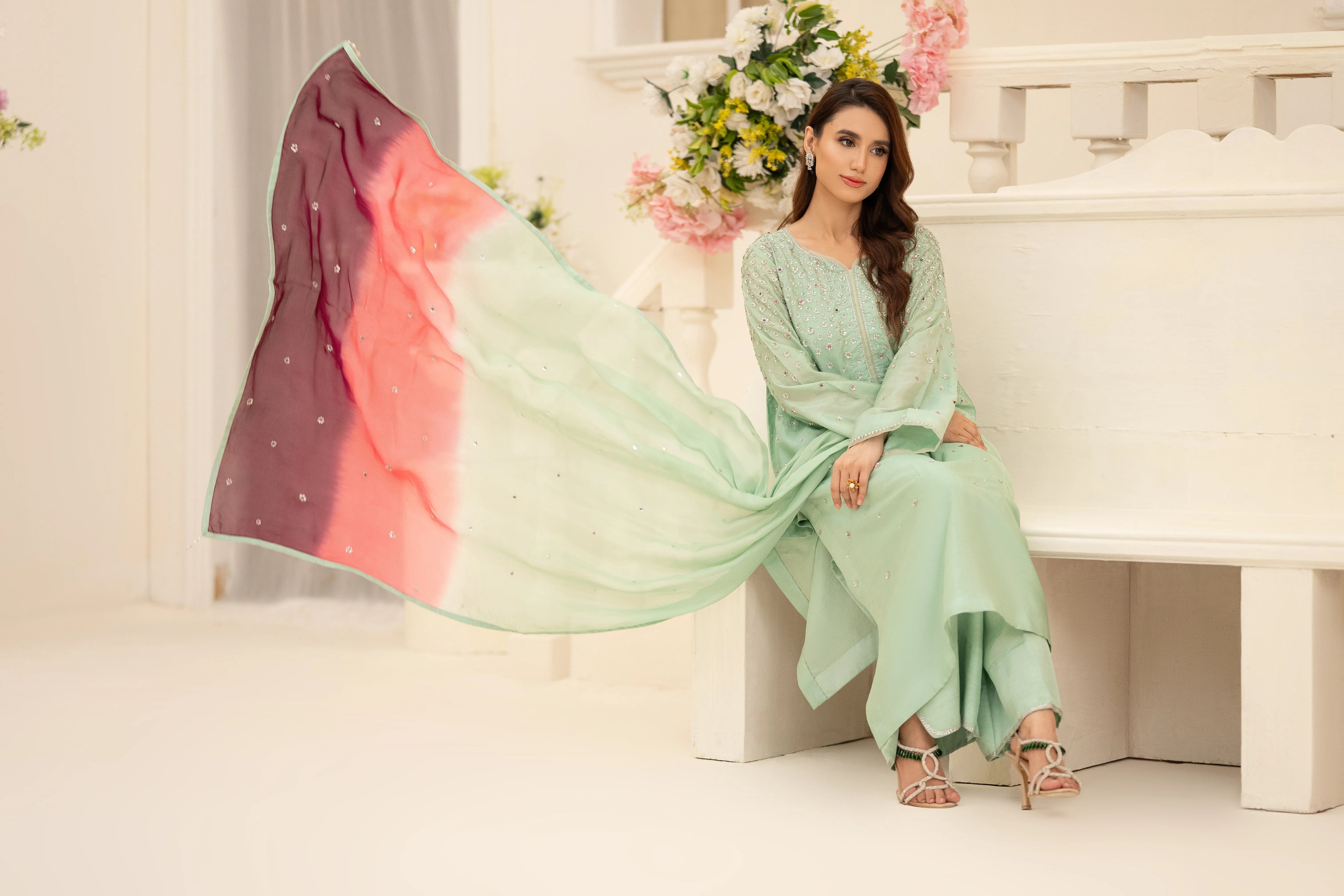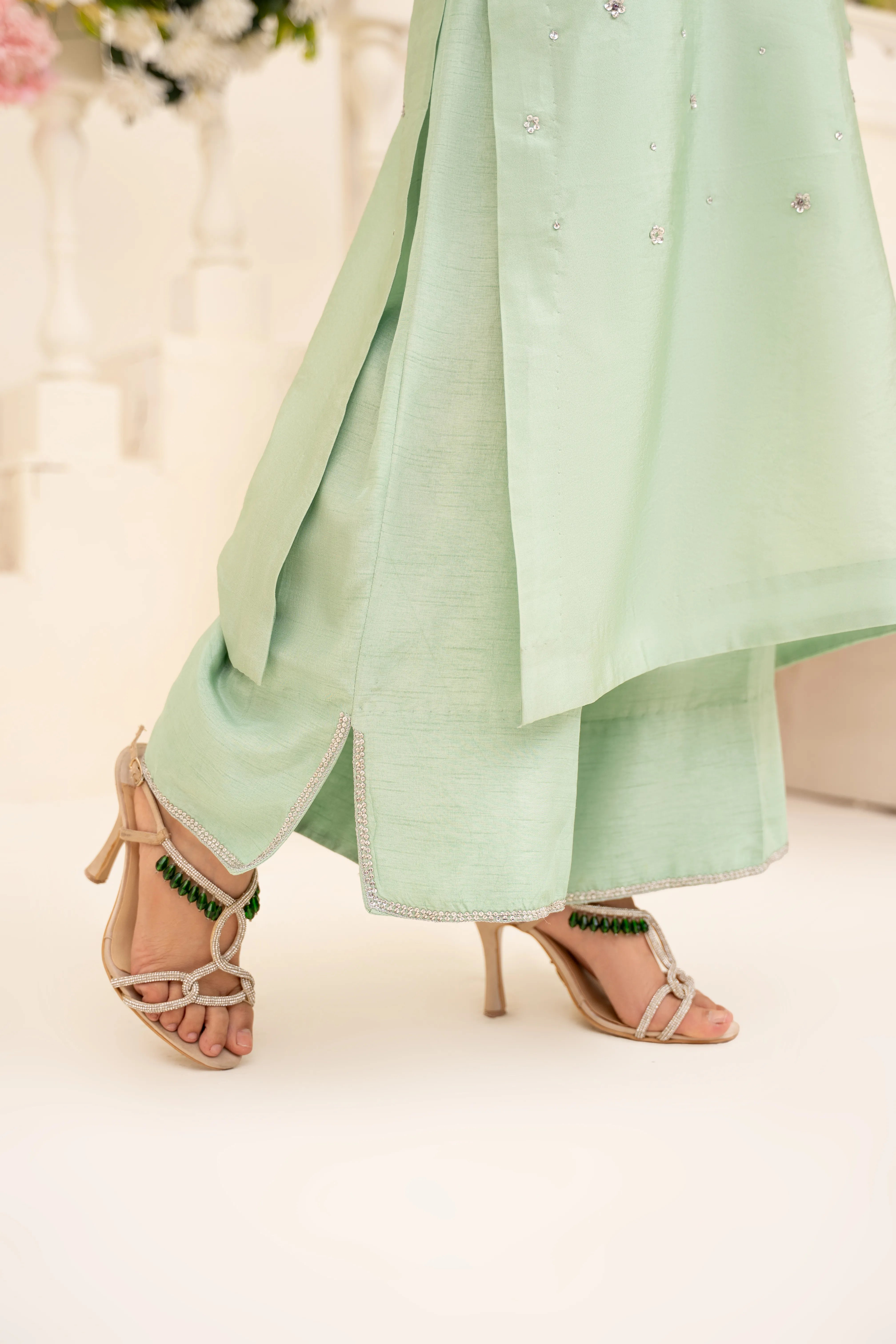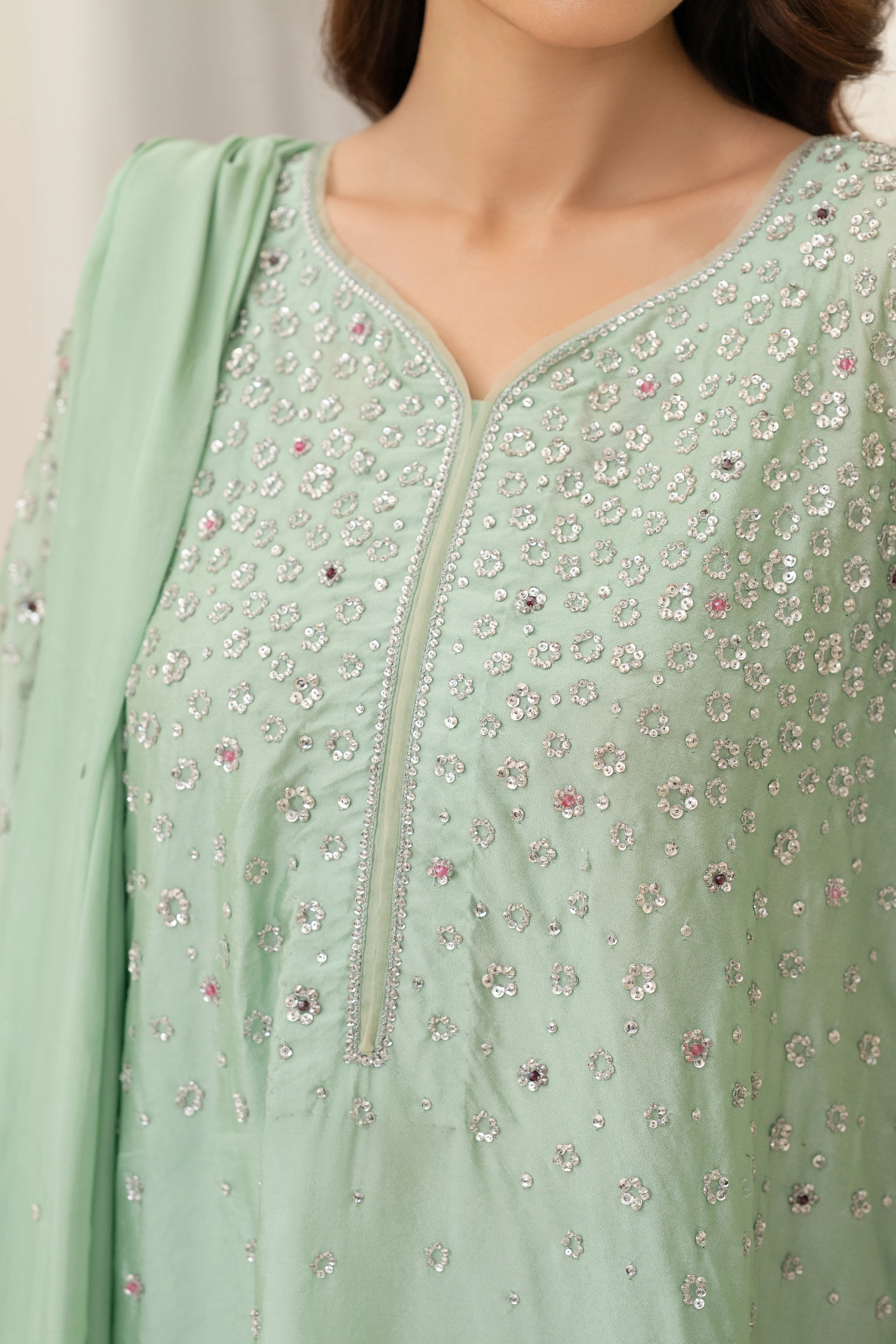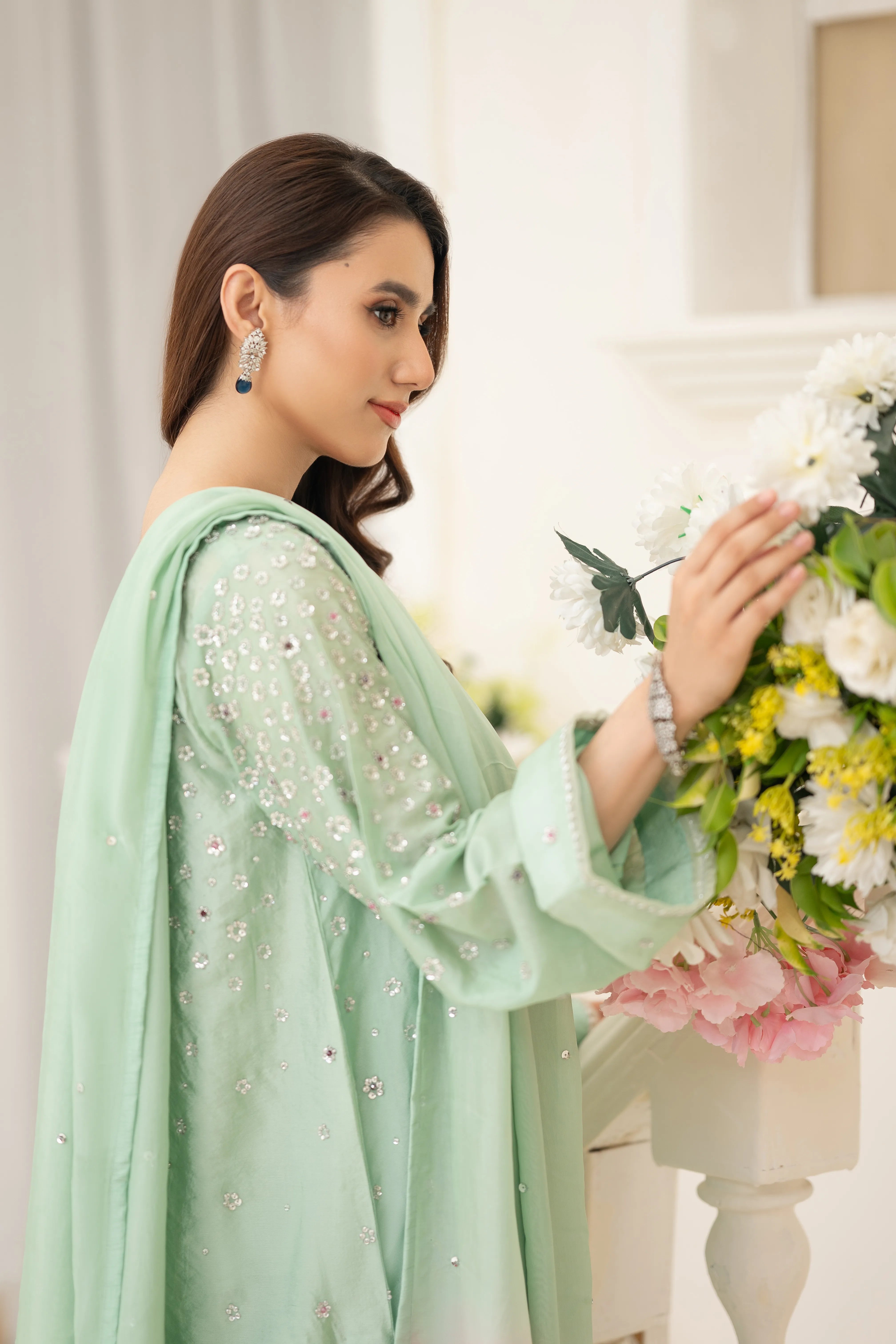Minha - Eid Festive: The ensemble features a mint green sheesha silk long shirt with Kurt sleeves finished with hand embroidery and organza. Intricate silver zardozi, pearl, sequins and Swarovski hand embroidery with a bit of accent colours. Paired with the same coloured hand embroidered culottes and tie and dye medium silk dupatta adorned with sequins and Swarovski chaan. This versatile piece is effortlessly adaptable for any occasion.
