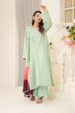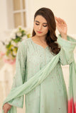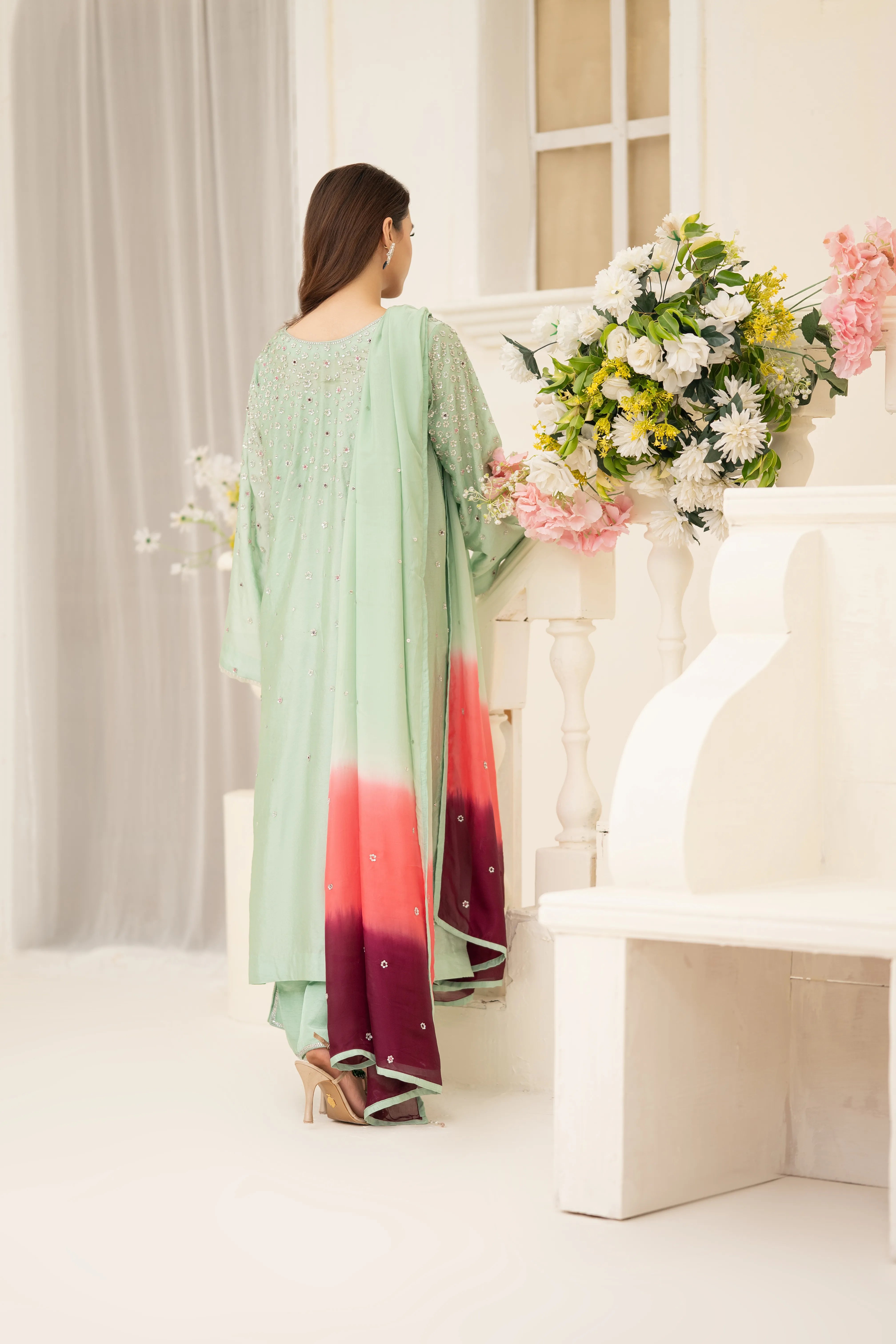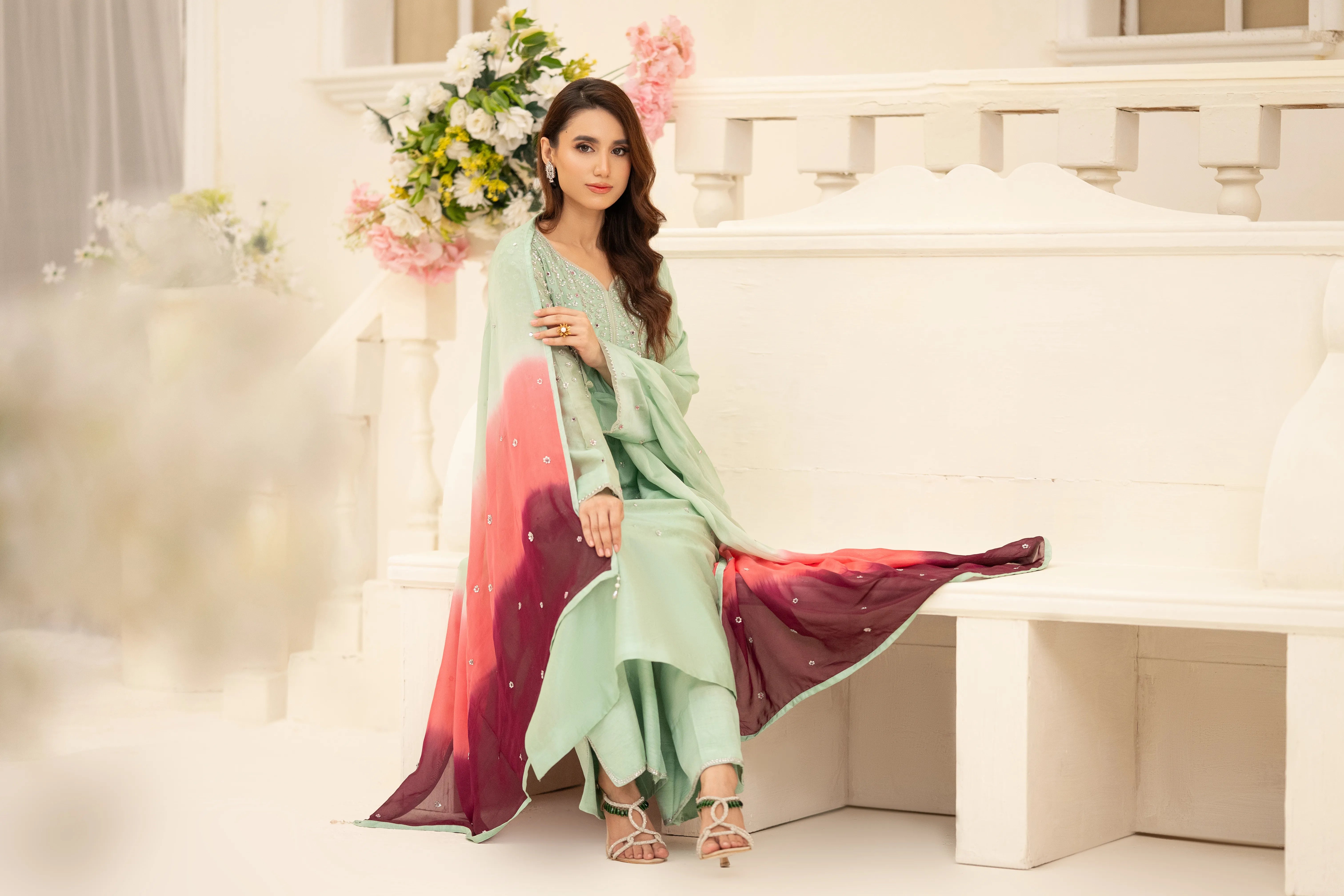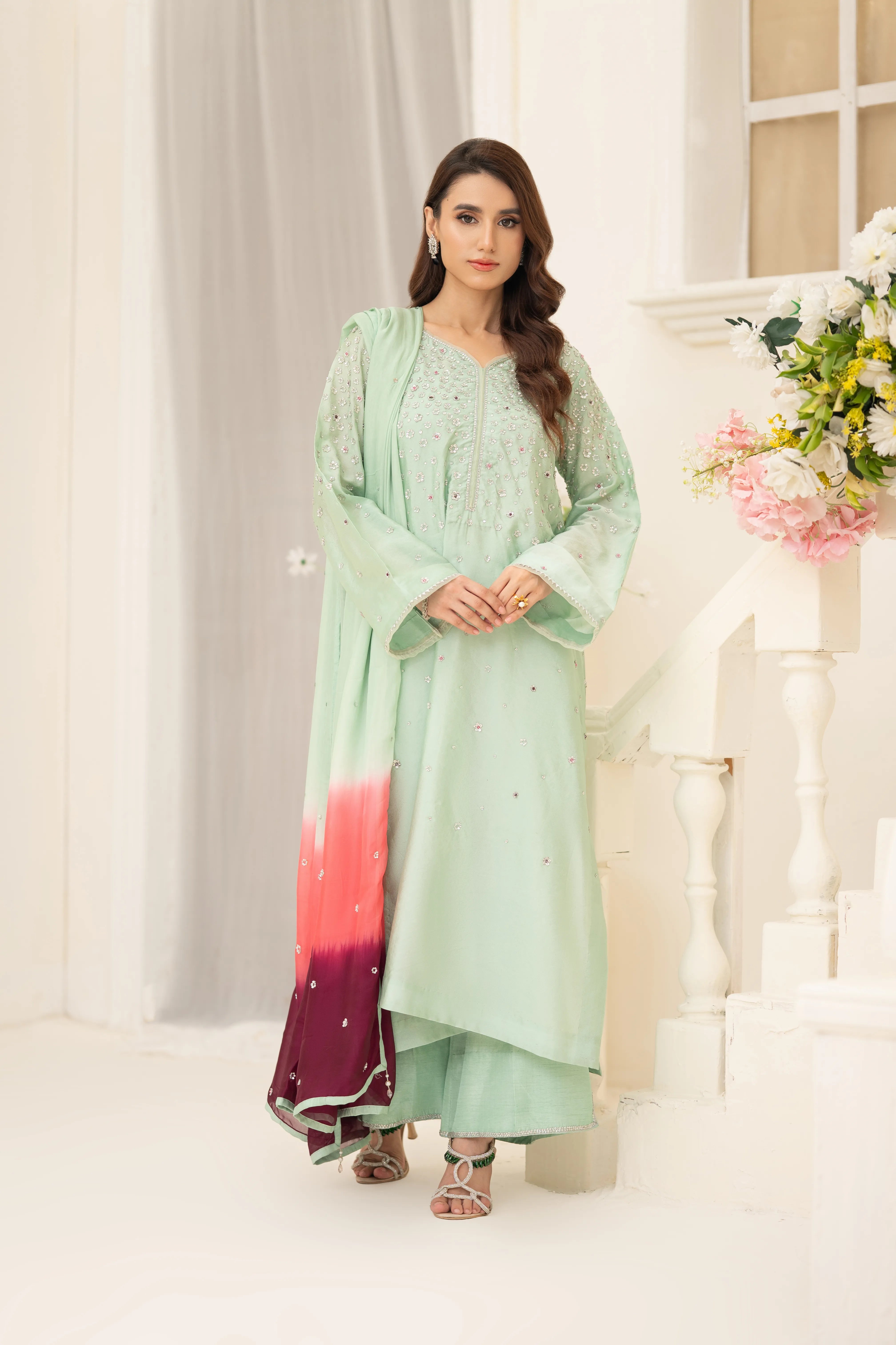 Minha - Eid Festive: The ensemble features a mint green sheesha silk long shirt with Kurt sleeves finished with hand embroidery and organza. Intricate silver zardozi, pearl, sequins and Swarovski hand embroidery with a bit of accent colours. Paired with the same coloured hand embroidered culottes and tie and dye medium silk dupatta adorned with sequins and Swarovski chaan. This versatile piece is effortlessly adaptable for any occasion.
