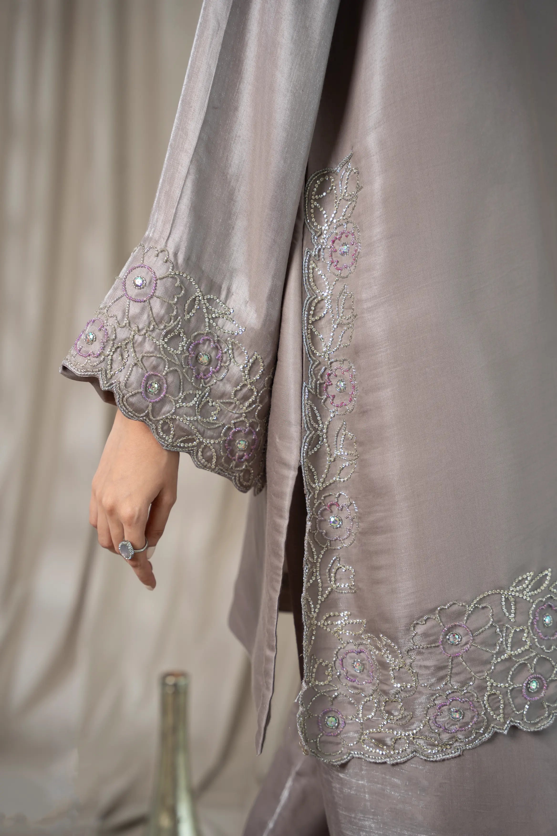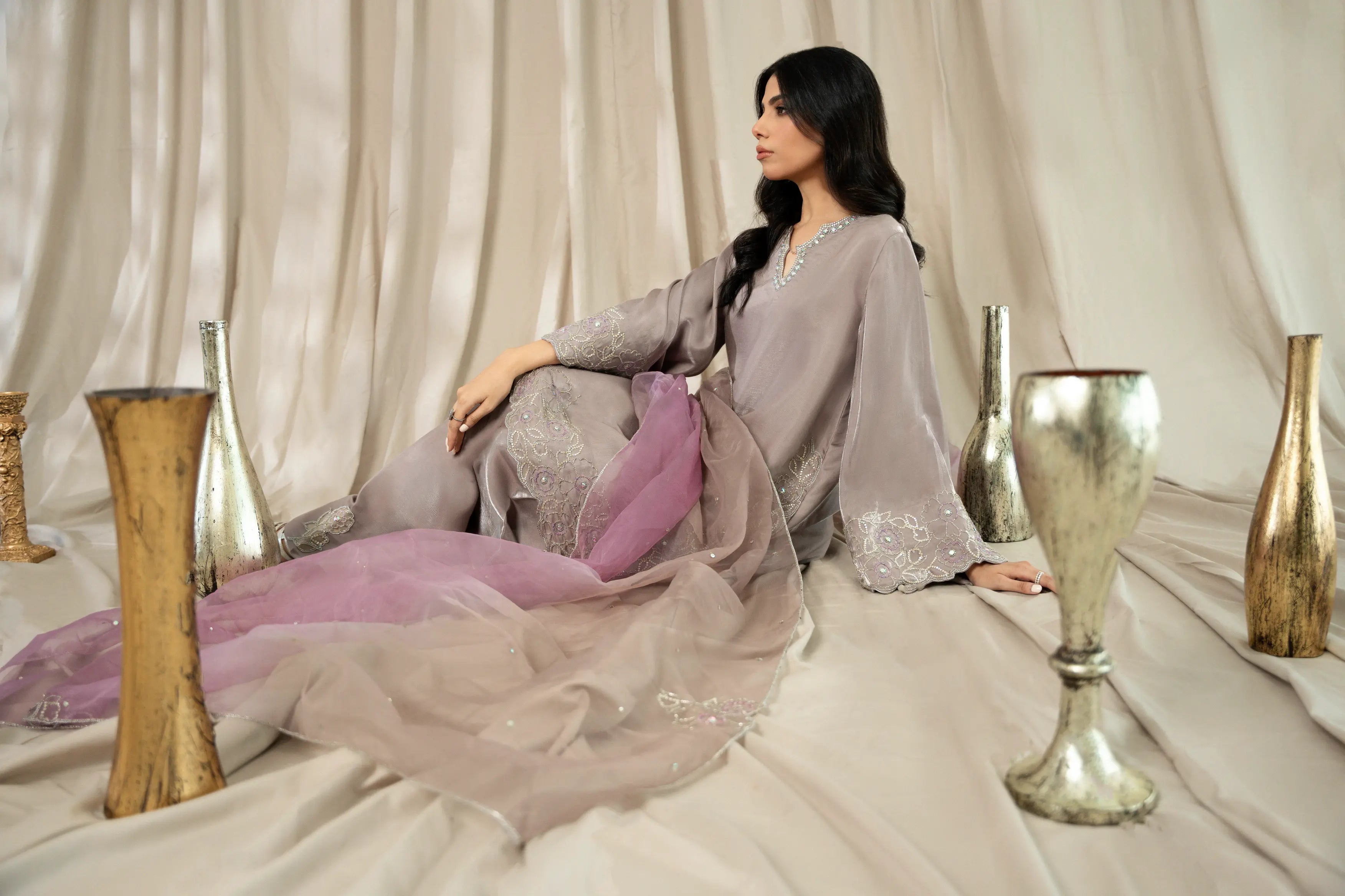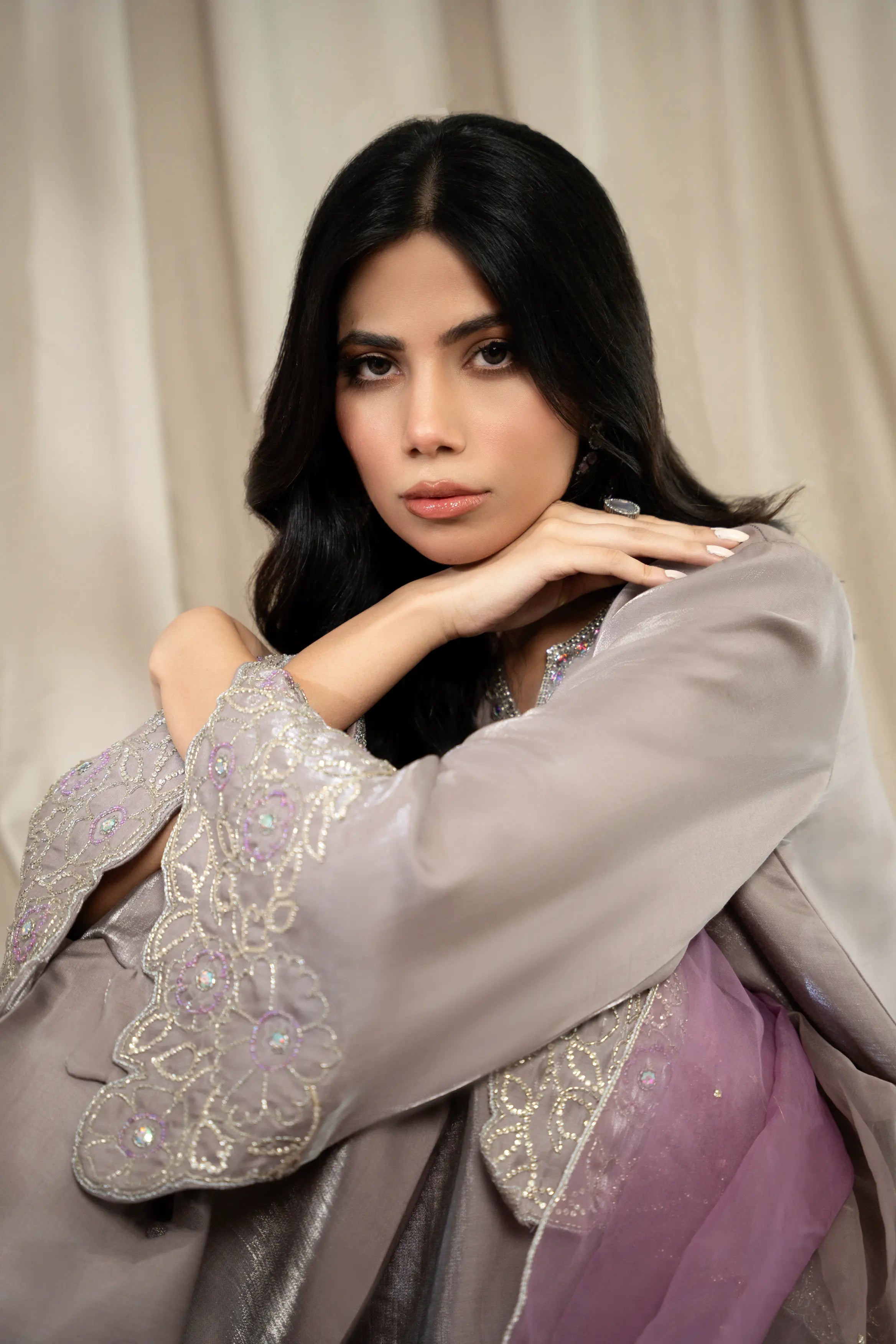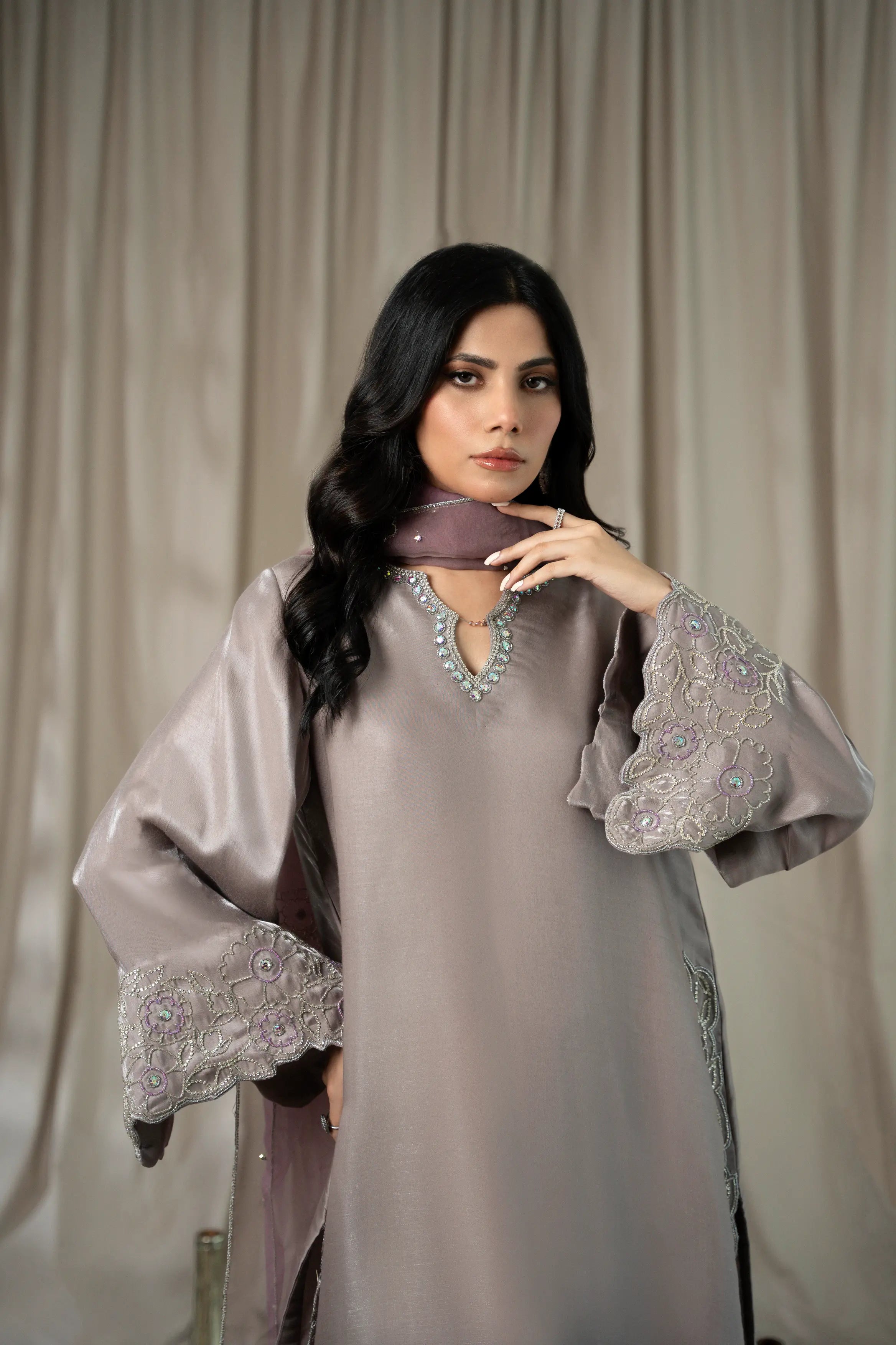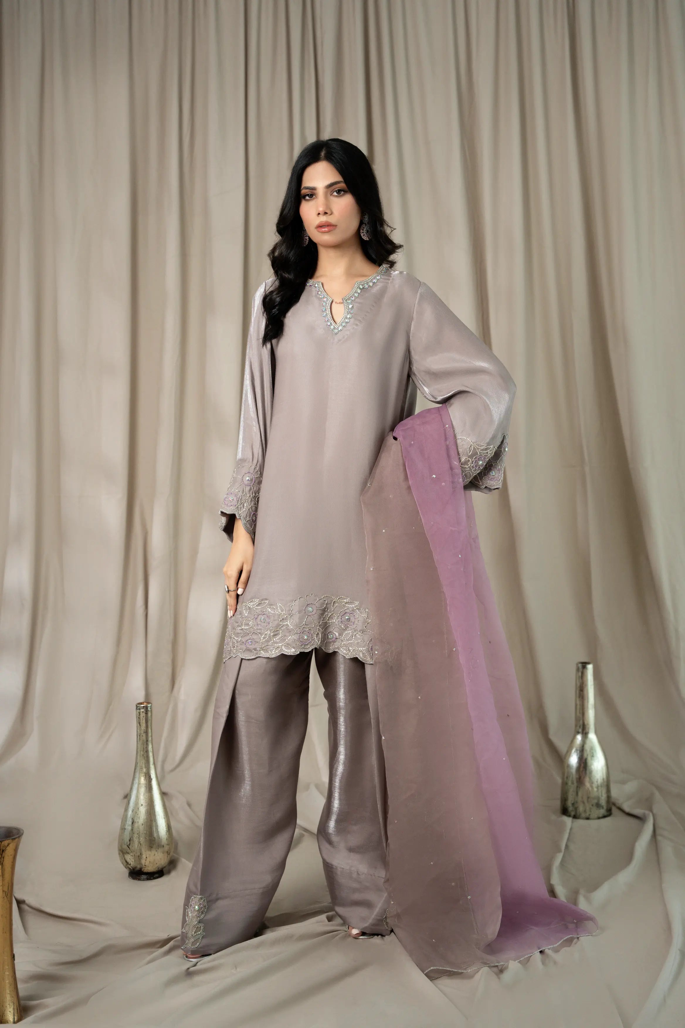 purplish grey sheesha silk short shirt paired with wide leg shalwar. Adorned with floral Swarovski and cutwork embroidery. Half and half organza dupatta embellished with floral Swarovski and cutwork embroidery on edges exudes an air of effortless elegance, making it the perfect choice for any occasion.