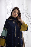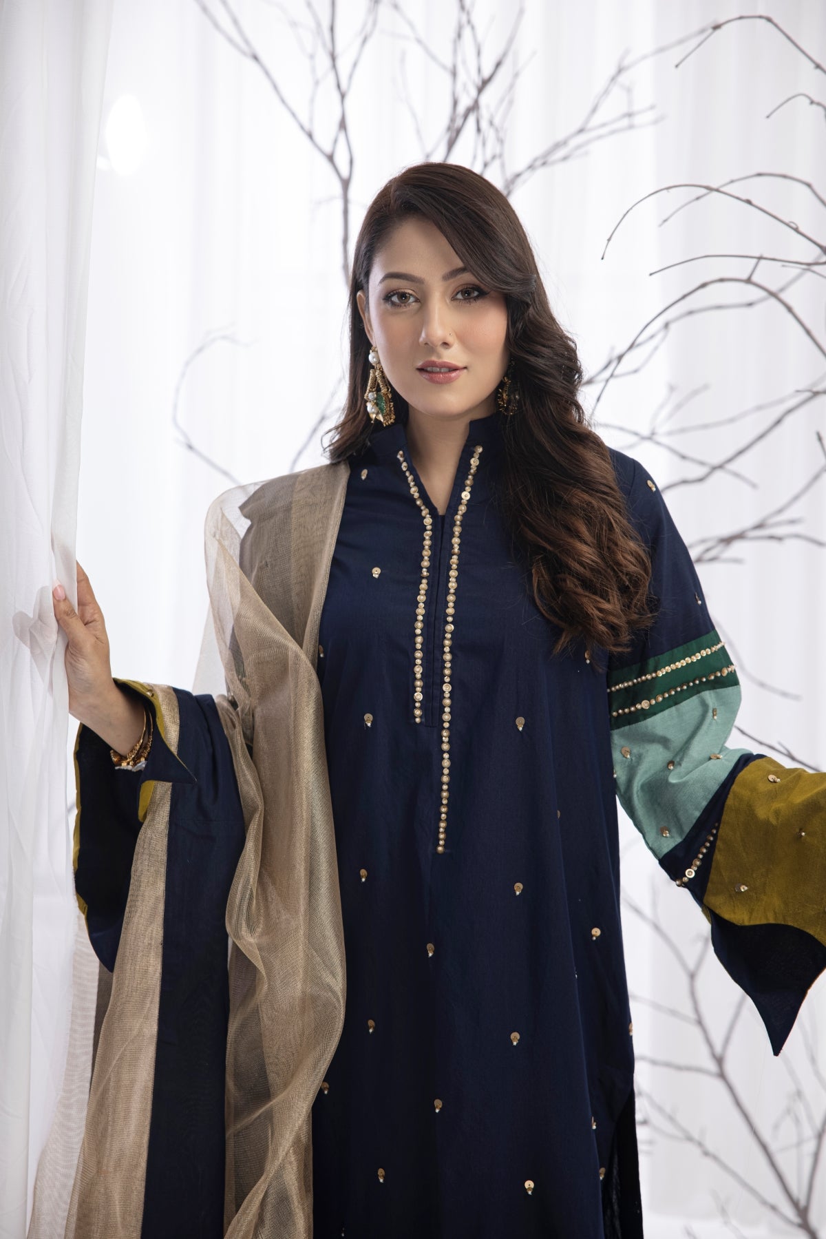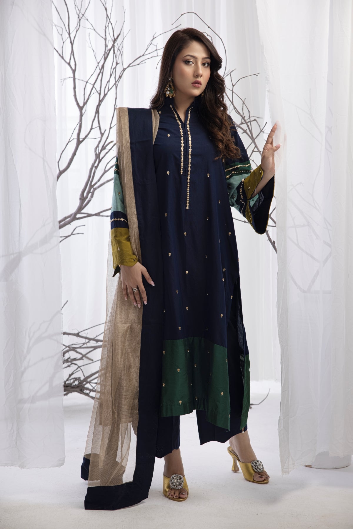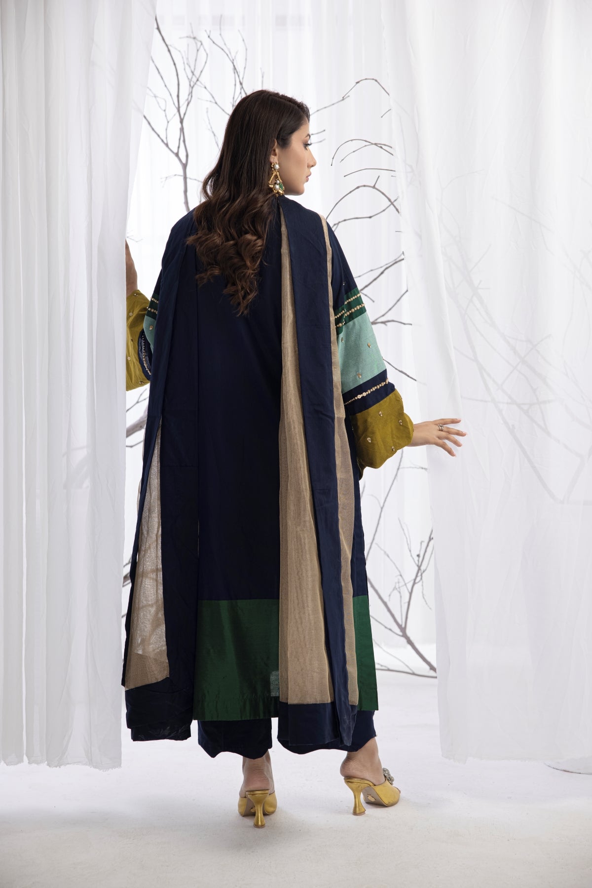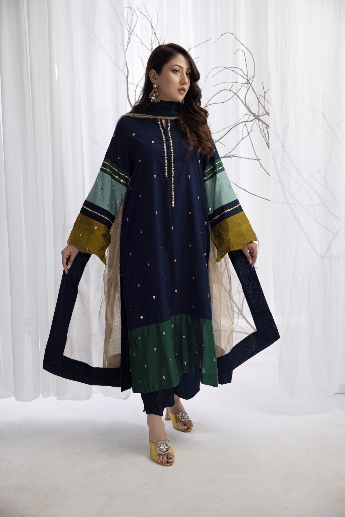 Jahaan'23: Color-blocked katan silk Oxford blue shirt with shades of green. A line shirt adorned with pearls & sequins hand embroidery all over. Paired up with the same color straight slit culottes and zari net dupatta. A perfect chic look for this festive season.