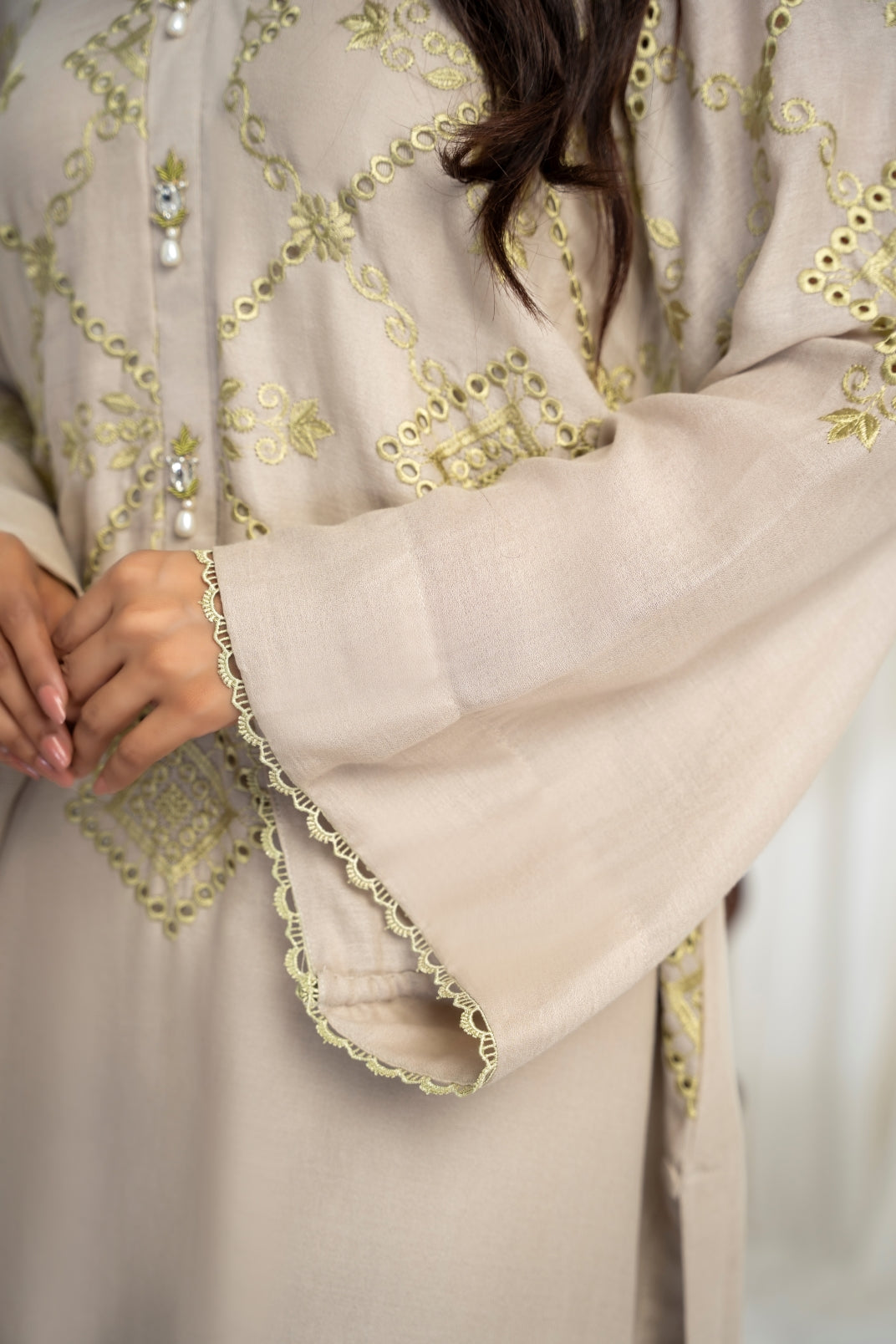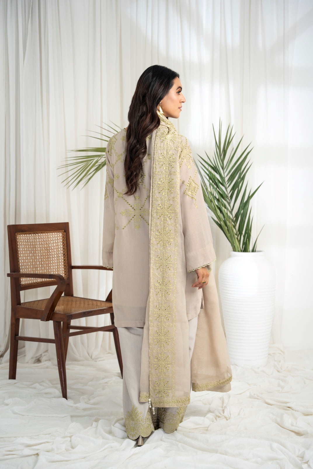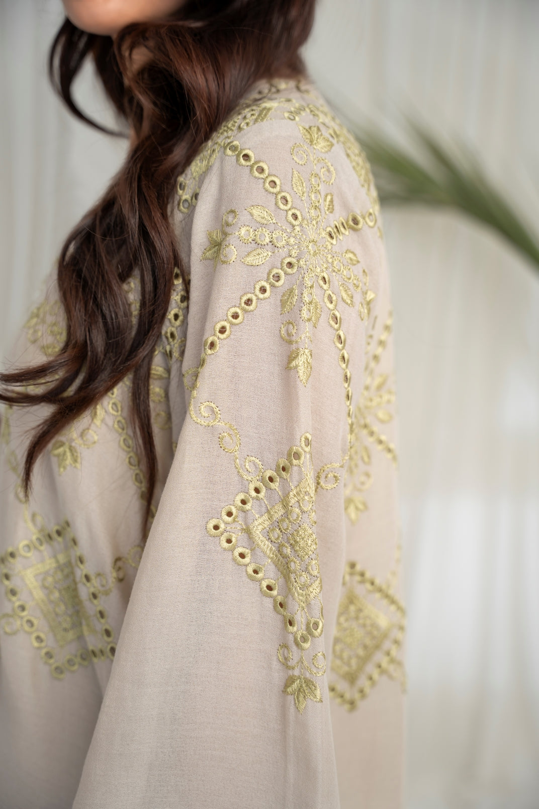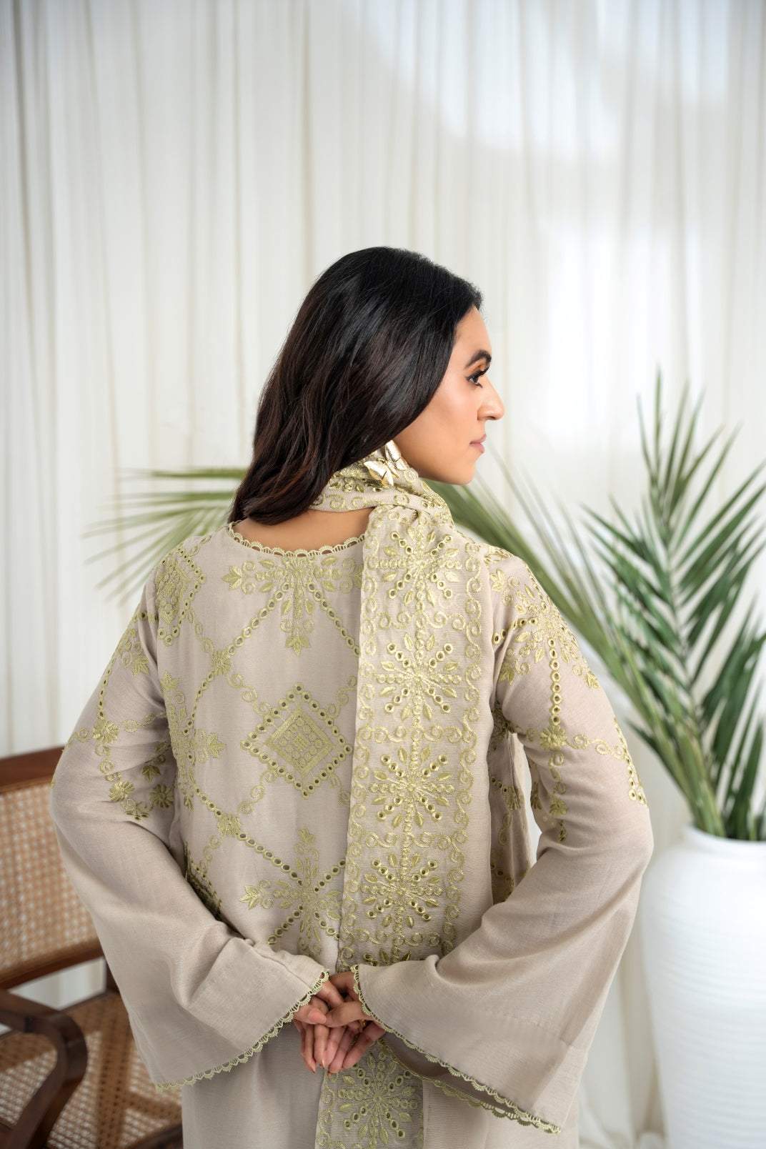 The ensemble features a beige cotton lawn voile round daman short tunic with a khaddi silk dupatta featuring apple green schiffli thread embroidery all over. Embellished with hand embroidered motifs. Paired up with a matching cotton loose shalwar featuring scalloped thread embroidery on the hem to create an elegant and timeless look.