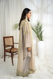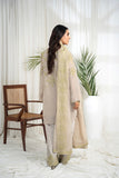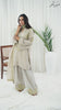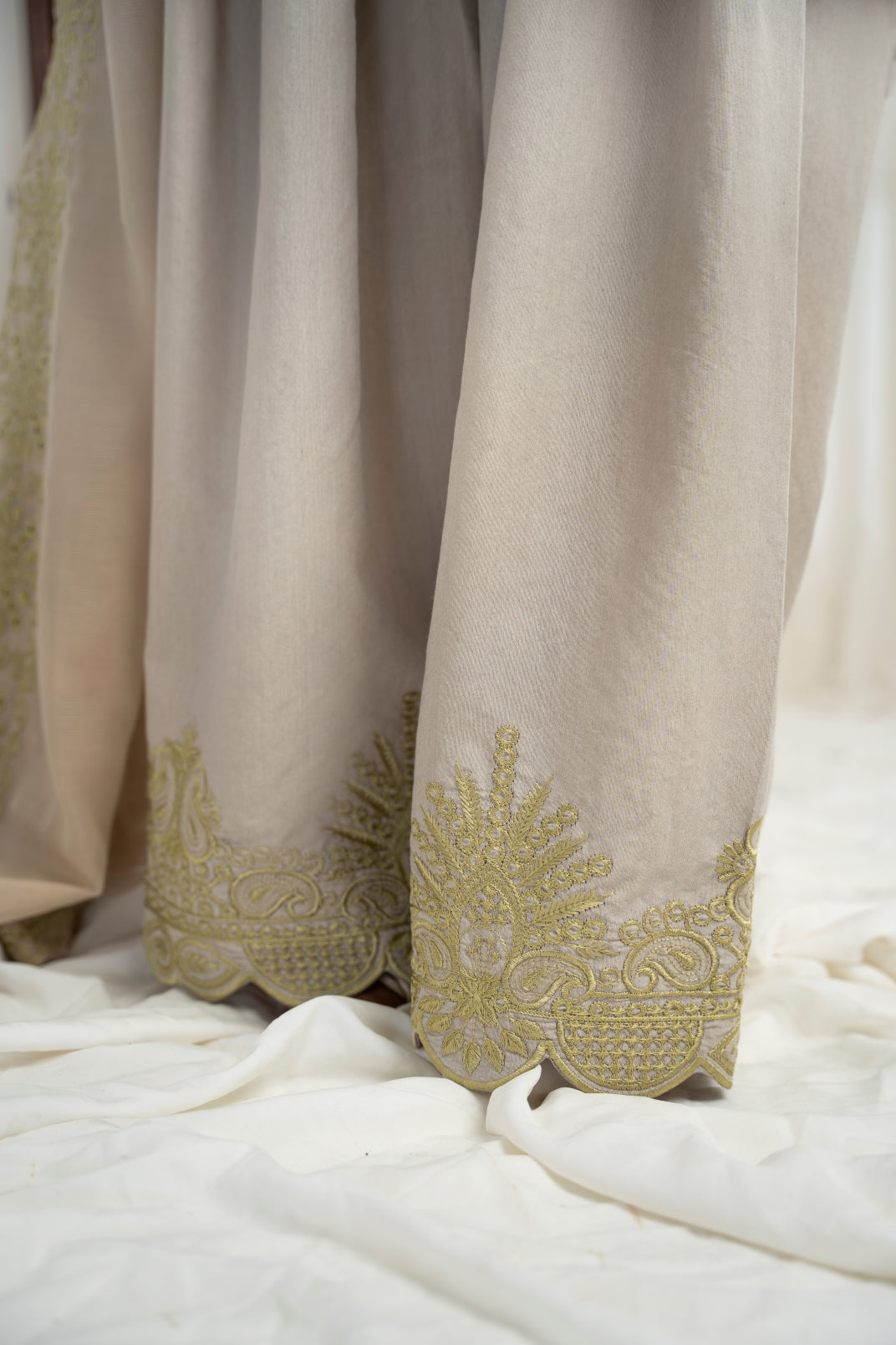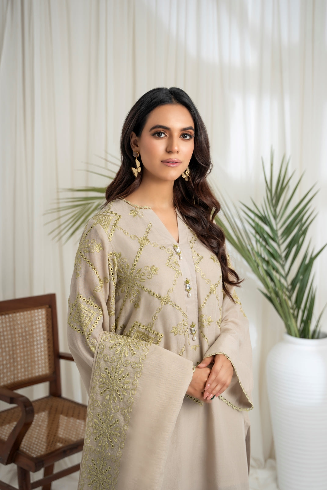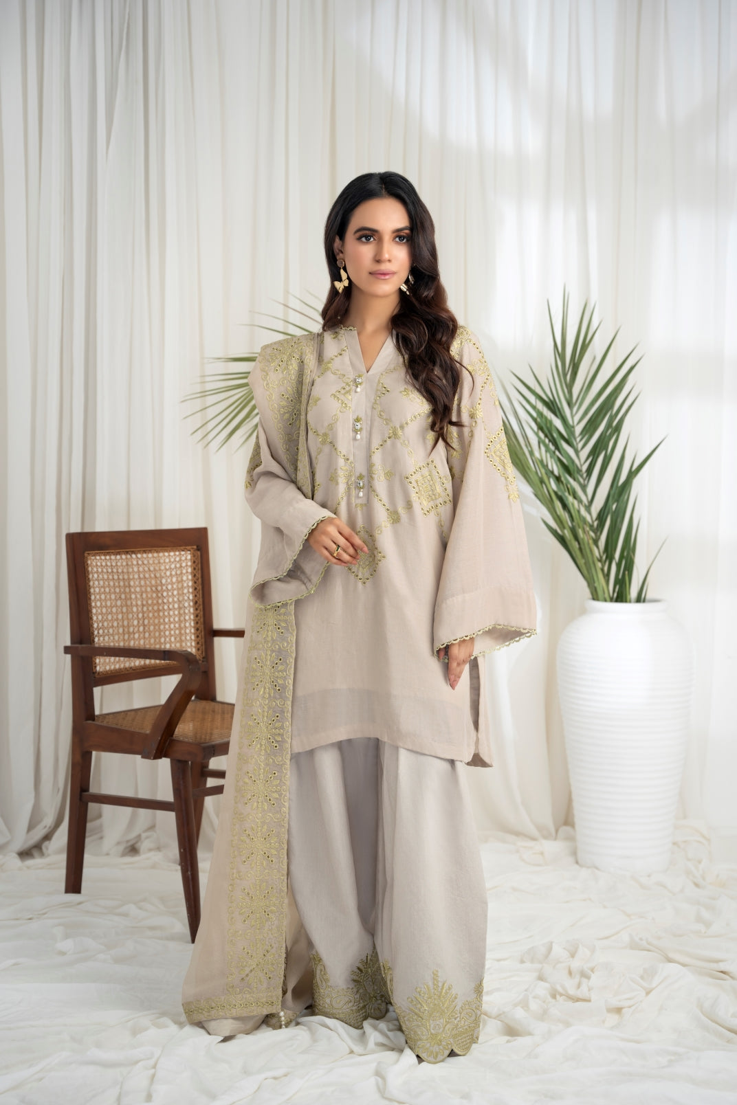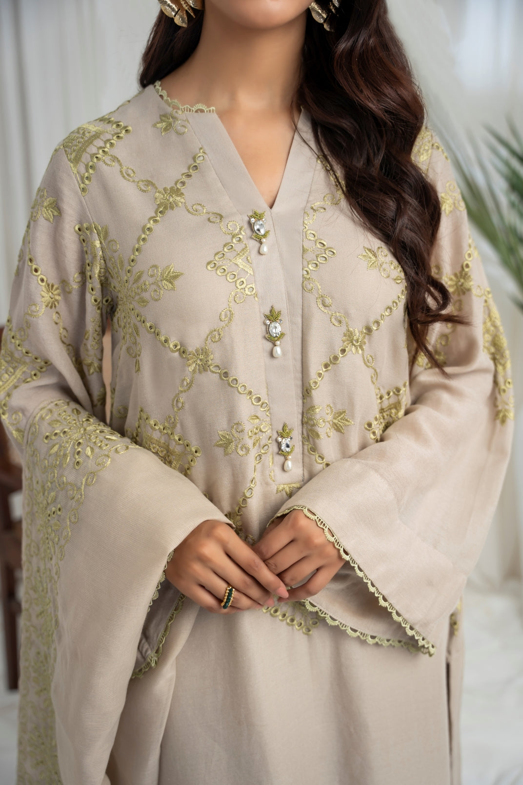 The ensemble features a beige cotton lawn voile round daman short tunic with a khaddi silk dupatta featuring apple green schiffli thread embroidery all over. Embellished with hand embroidered motifs. Paired up with a matching cotton loose shalwar featuring scalloped thread embroidery on the hem to create an elegant and timeless look.