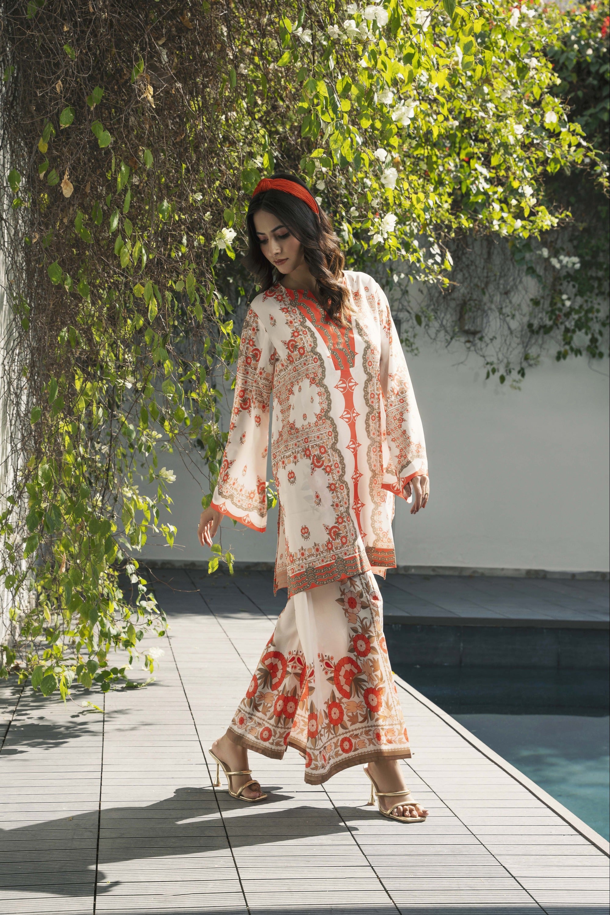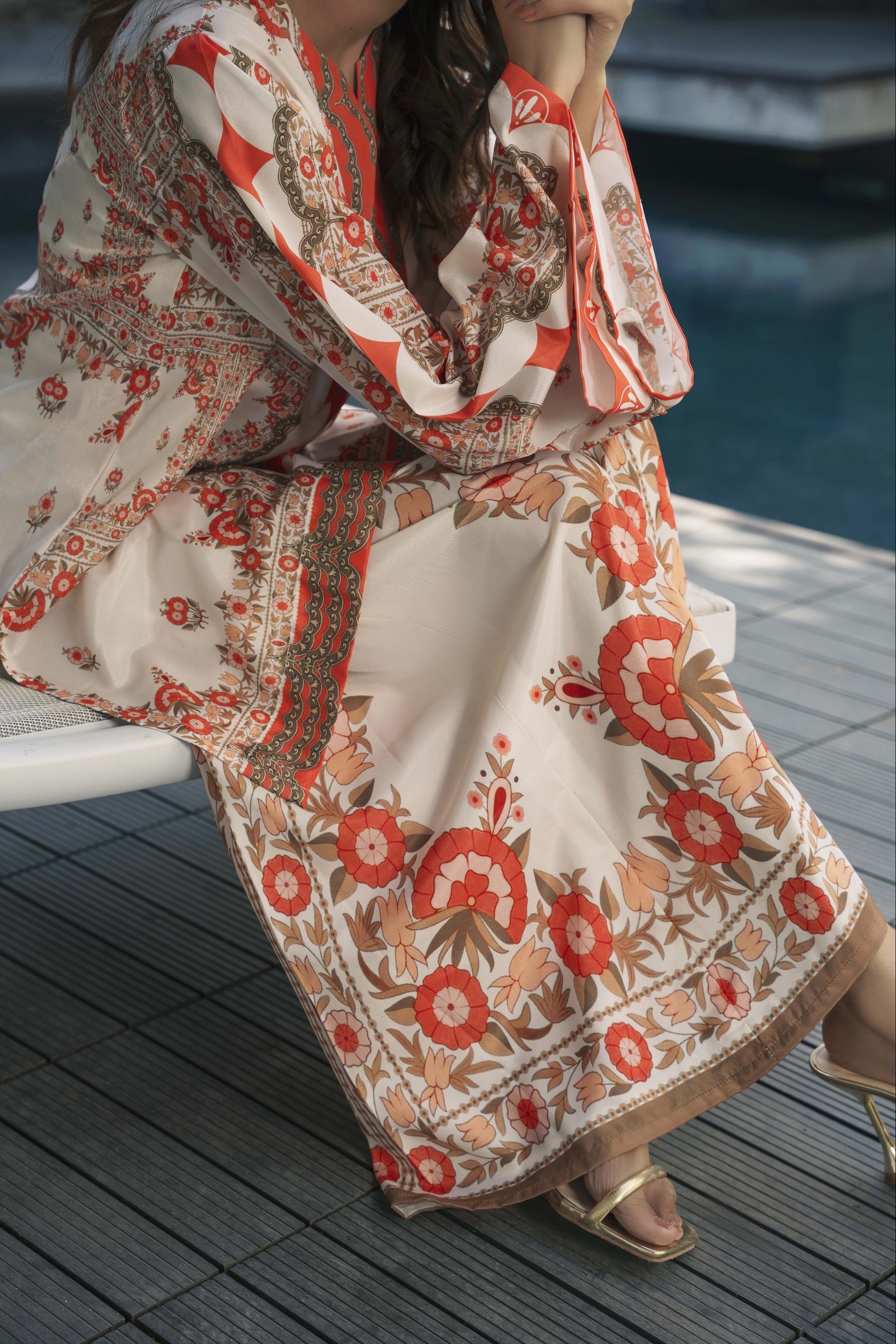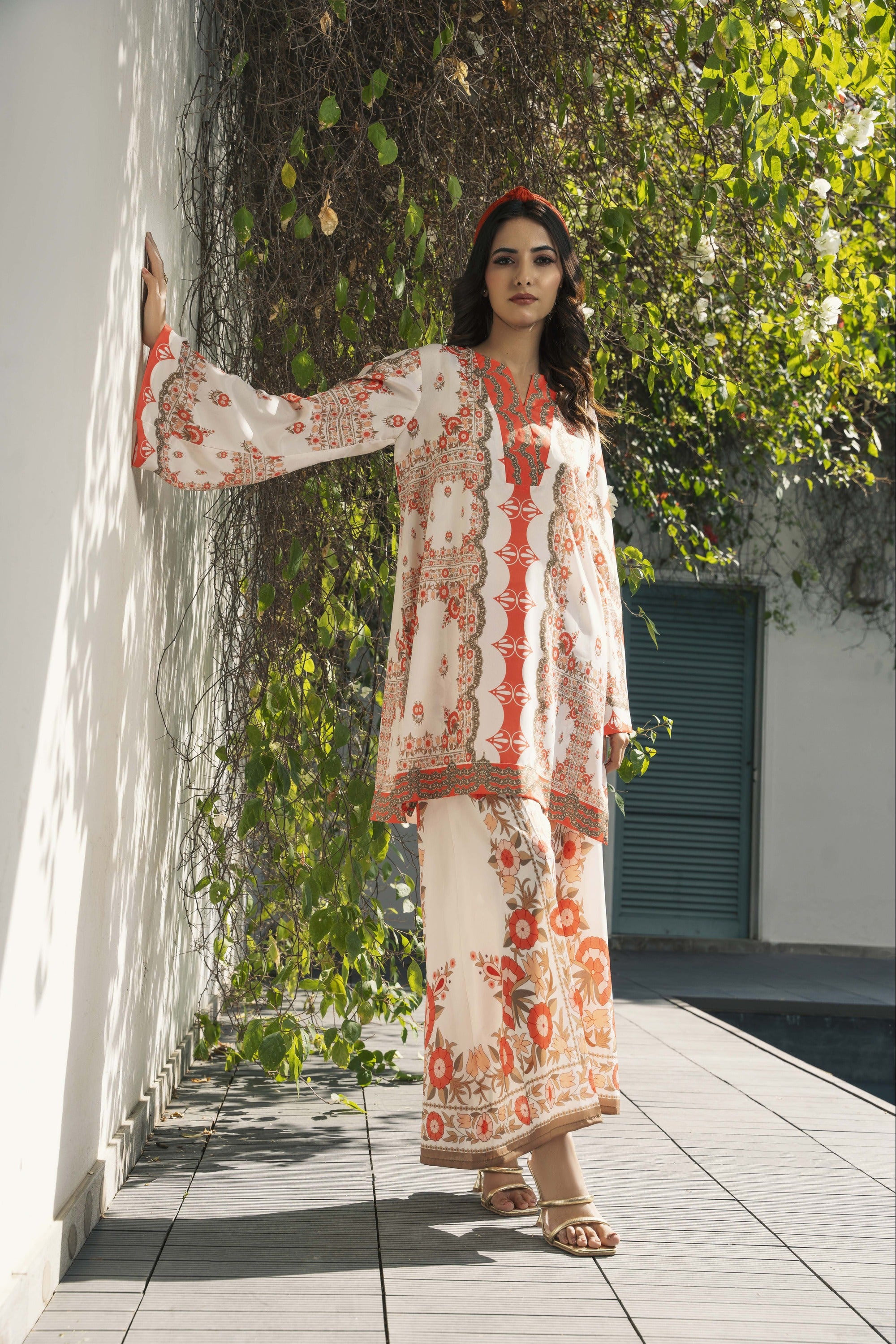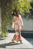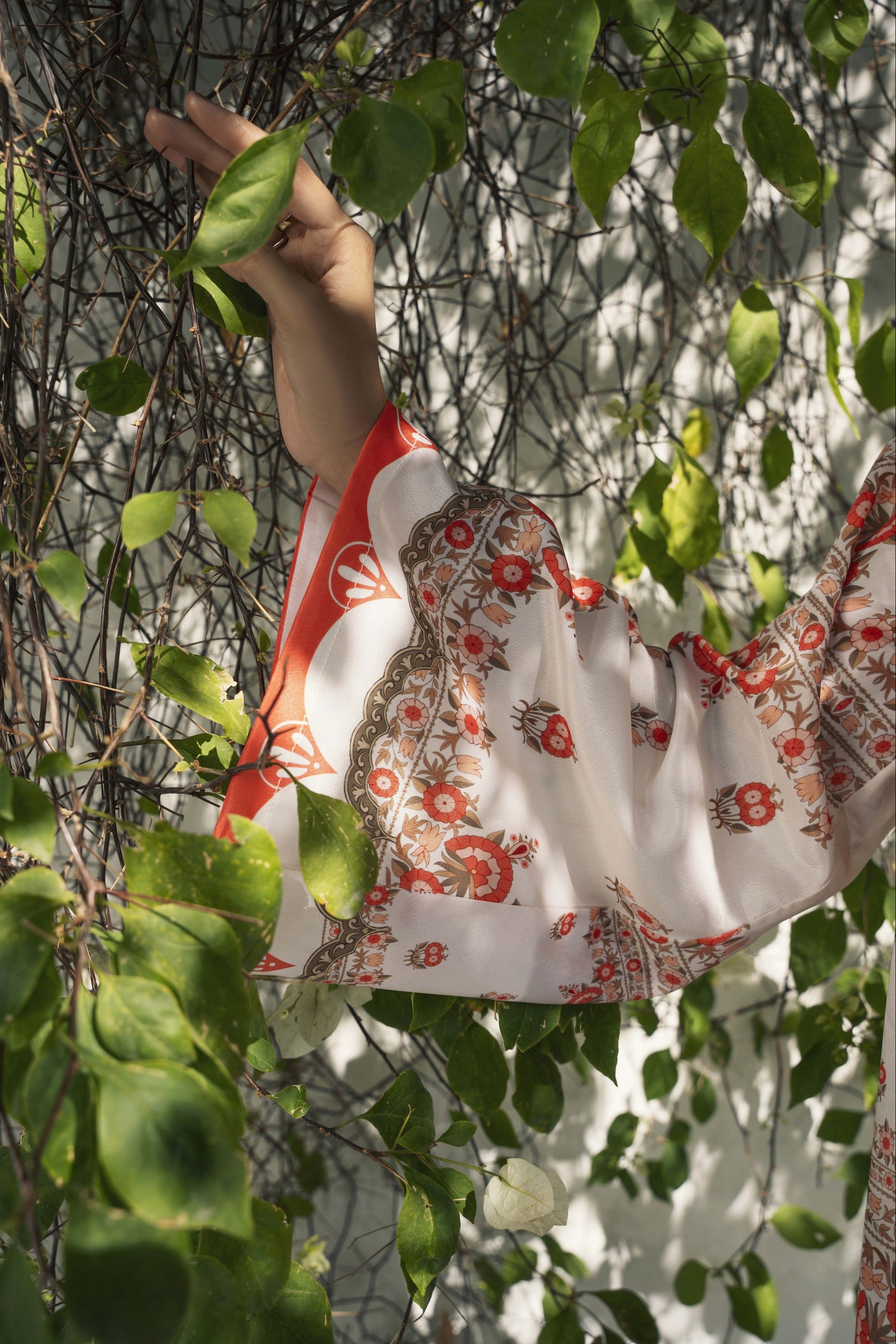 IRA - Luxury Printed Co-ords: Make a striking entrance in this short shirt with kurta sleeves paired with flared culottes, expertly crafted from crepe silk. This co-ord set’s earthy print is inspired by tribal floral, adds a touch of whimsical flair to the effortless silhouette. Style it for a sunny brunch with a blowout or polish it up for the night with a sleek ponytail.