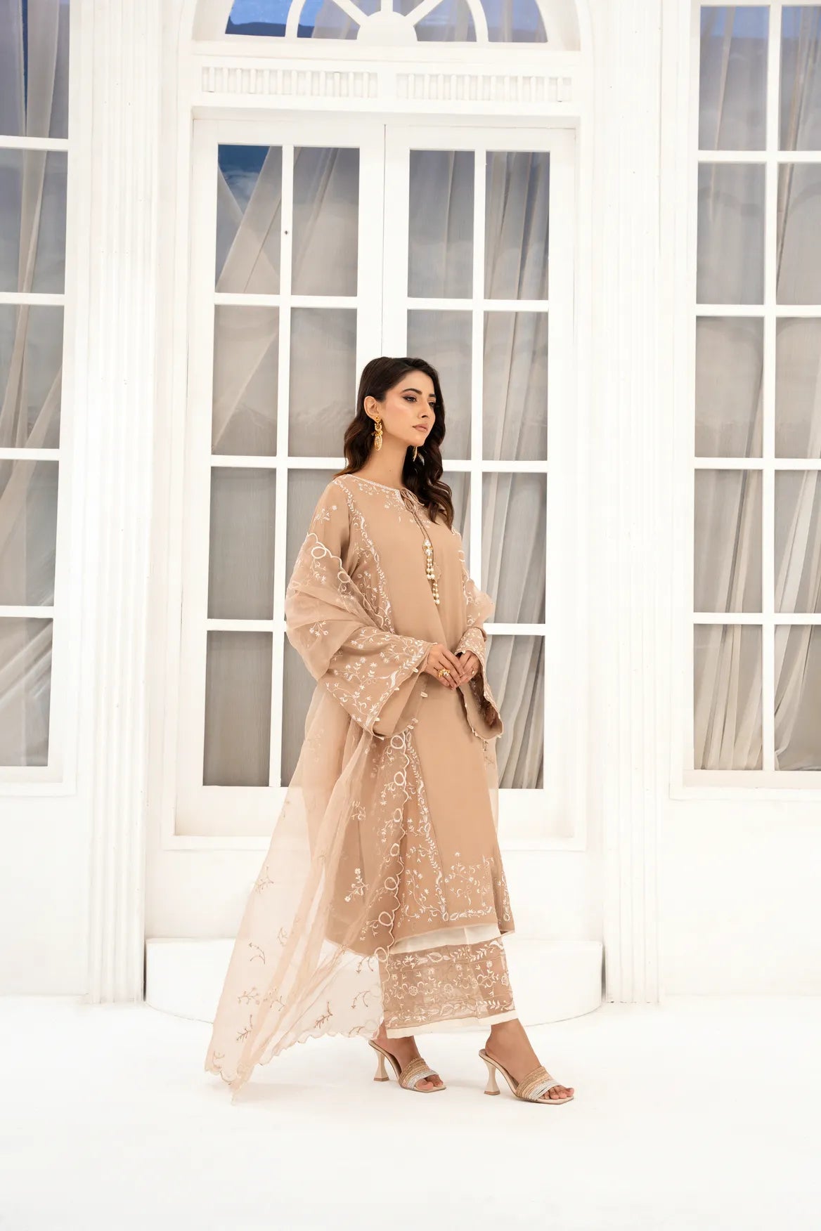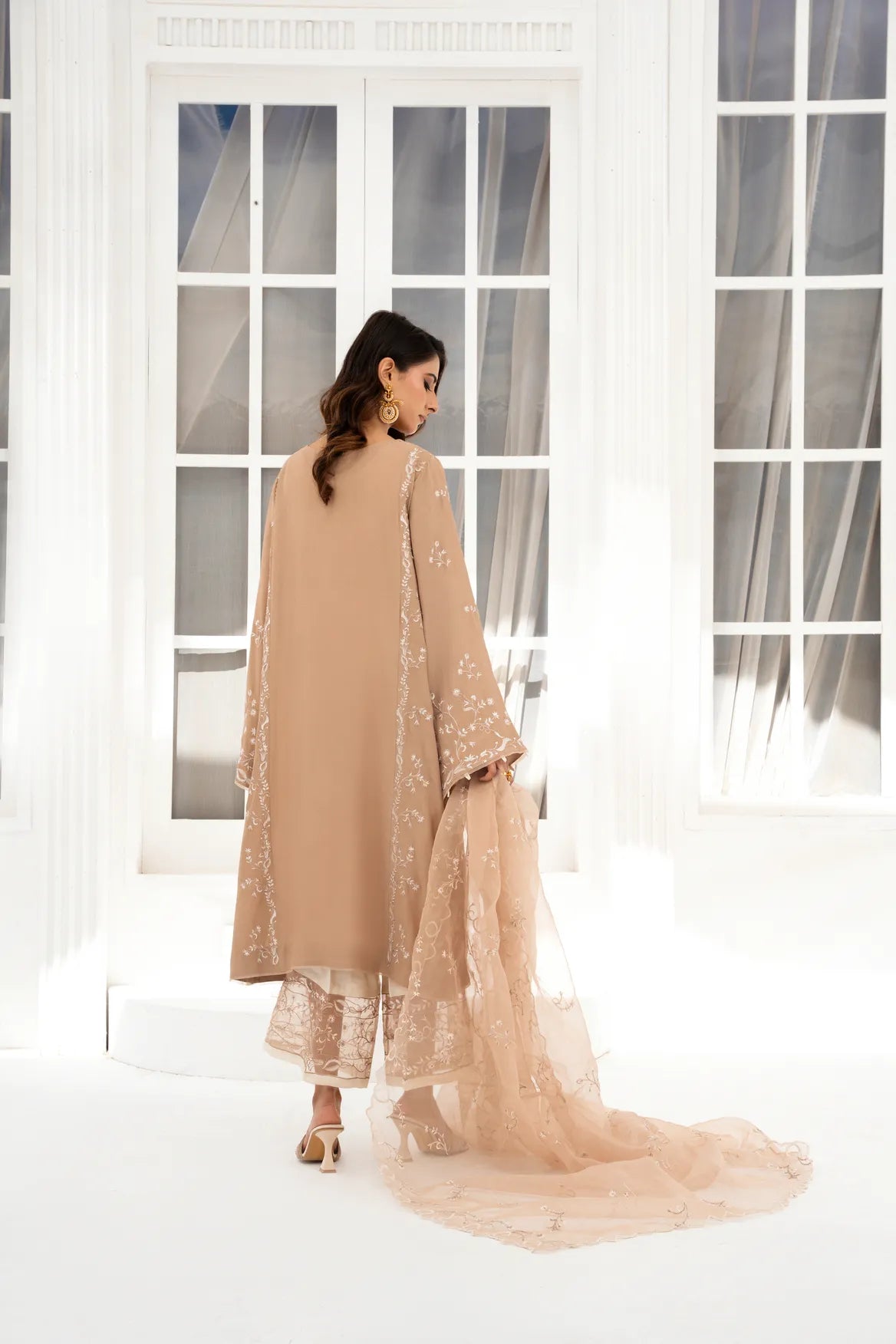 FLORA & FAUNA - Eid Festive: A mocha mousse crepe georgette panelled A-line shirt with round keyhole neck features detailed contrasting thread embroidery. Kurta sleeves with thread embroidery and pearl finishing. Tassel finishing on the neckline. Cream bamboo rawsilk culotte embellished with embroidered organza on the edges. Paired with mocha mousse organza dupatta adorned with contrasting thread embroidery and cutwork borders.