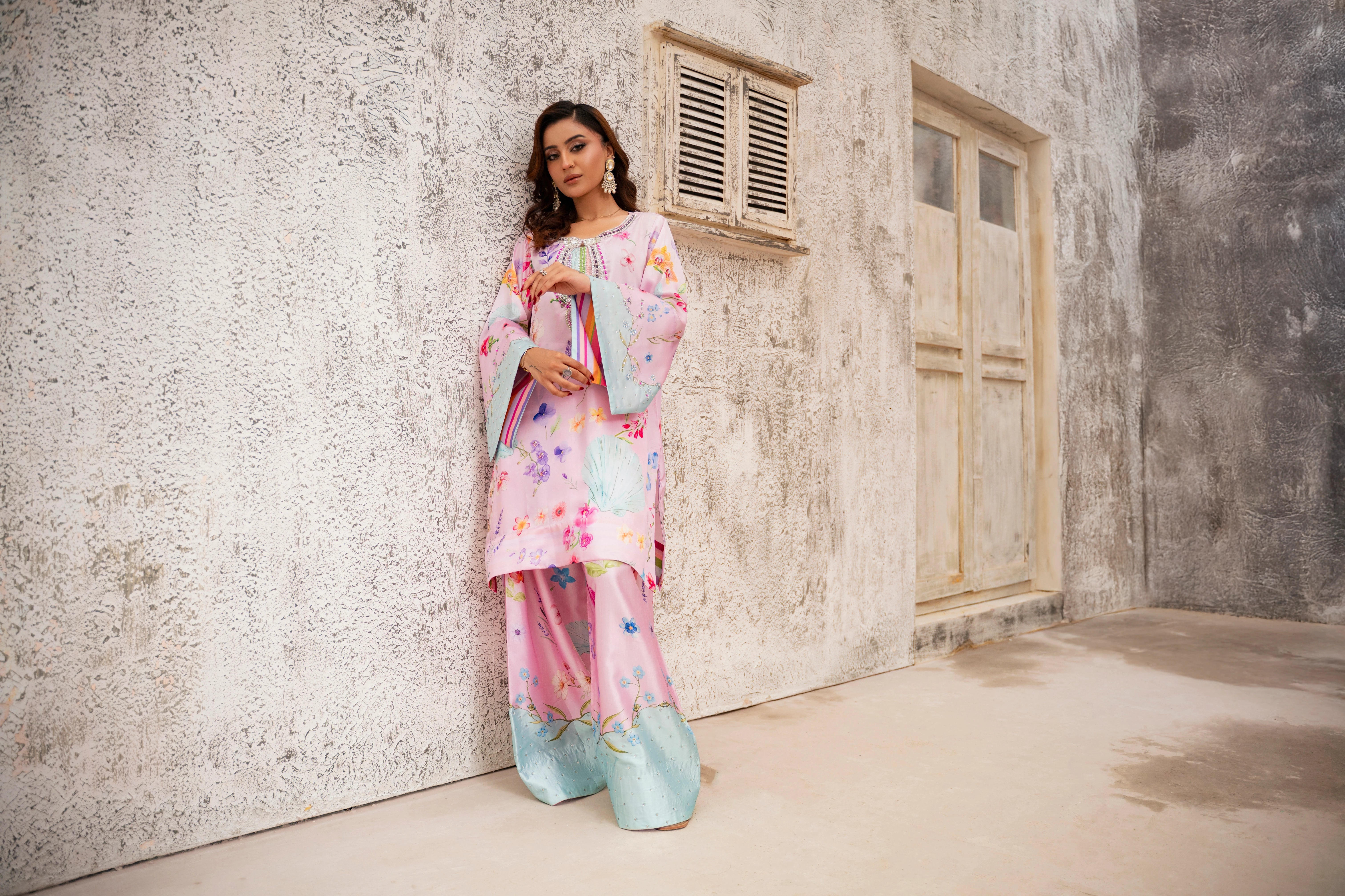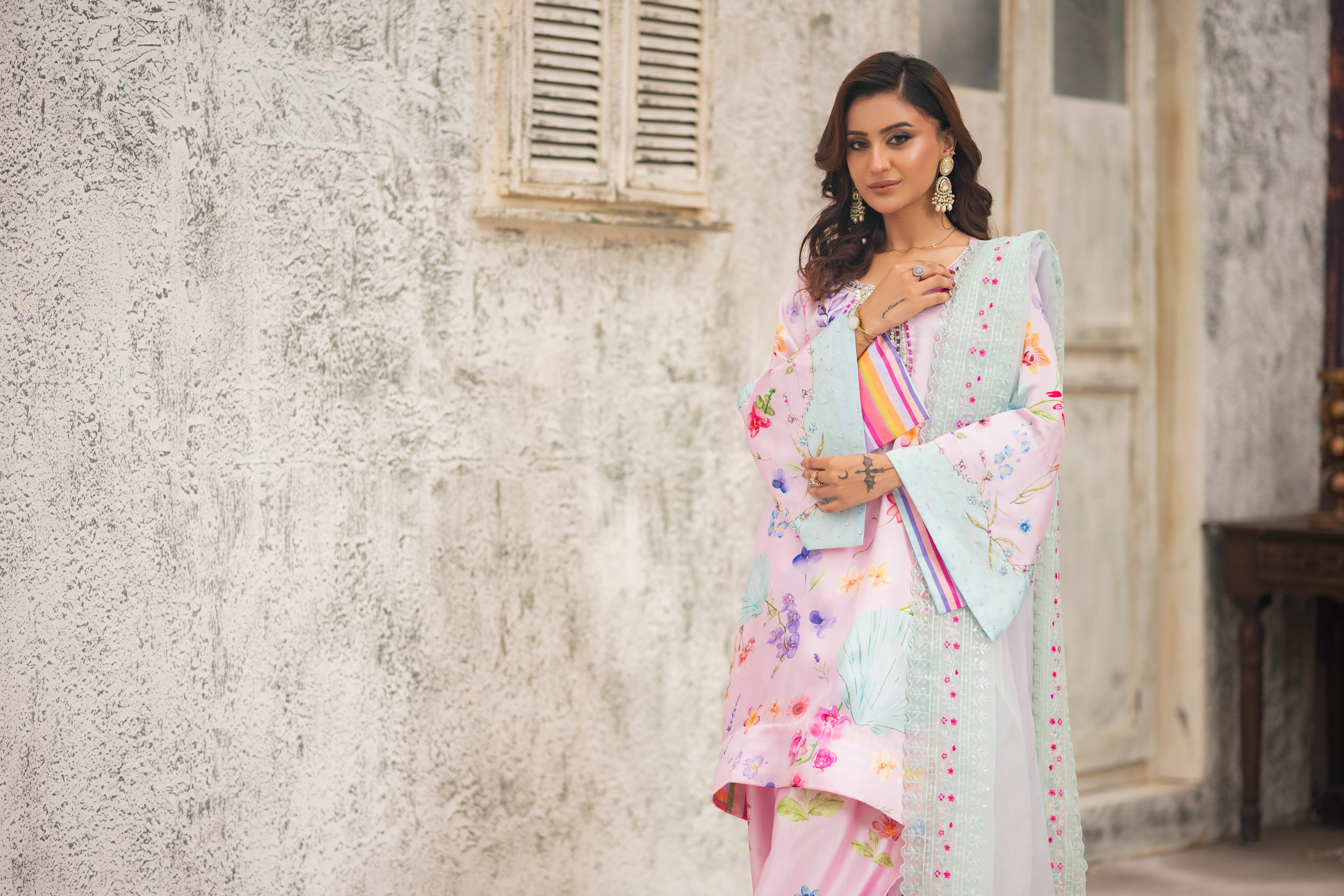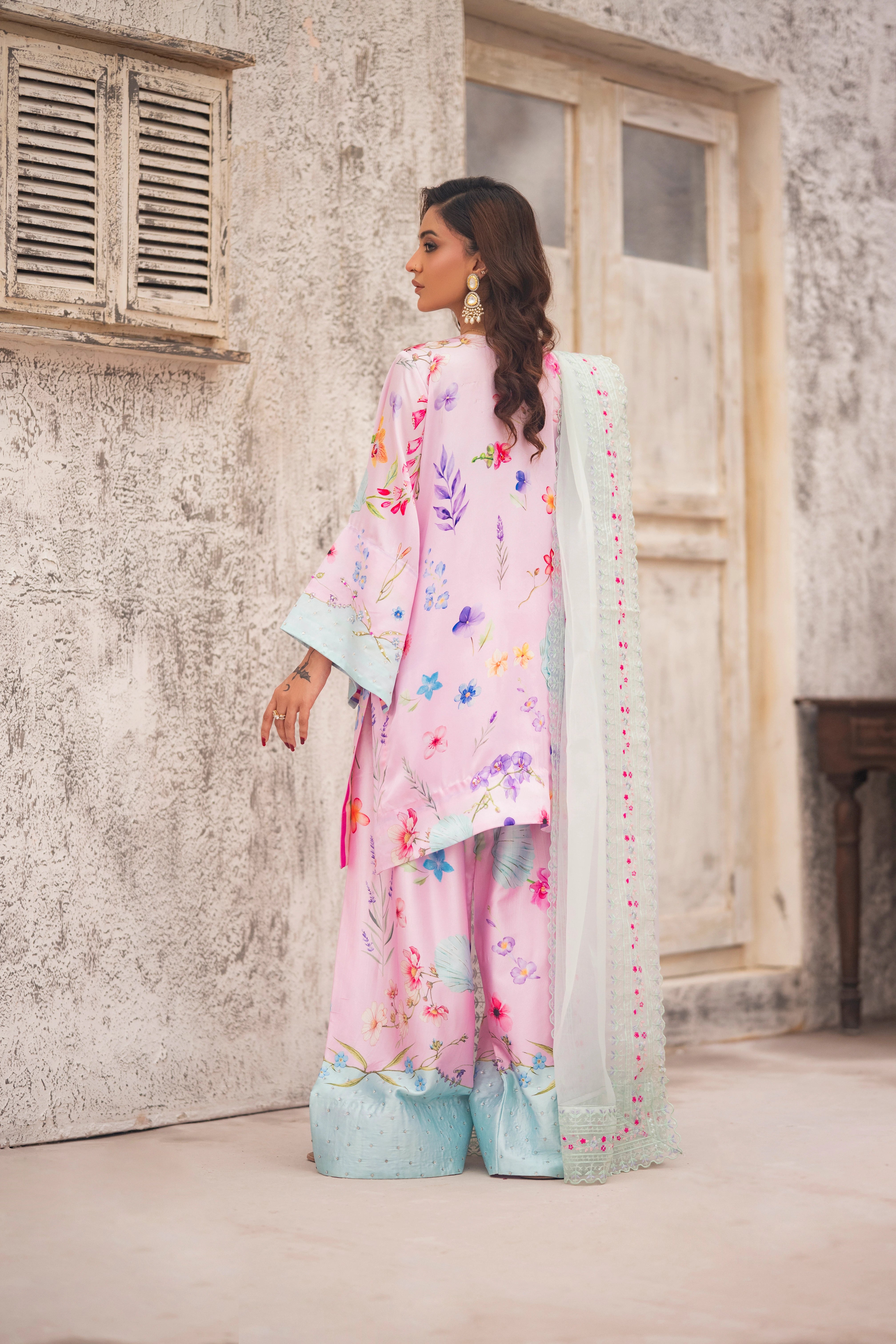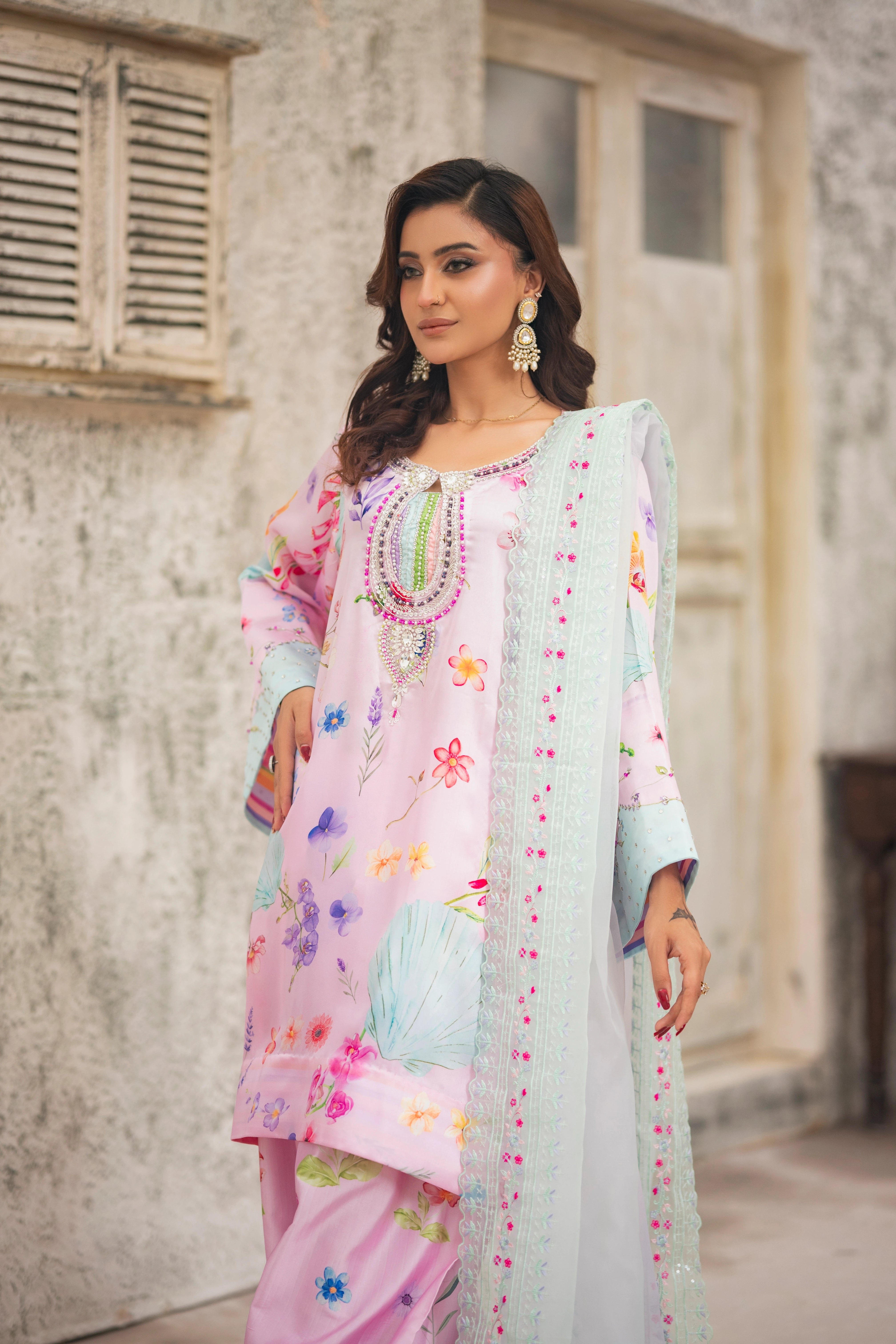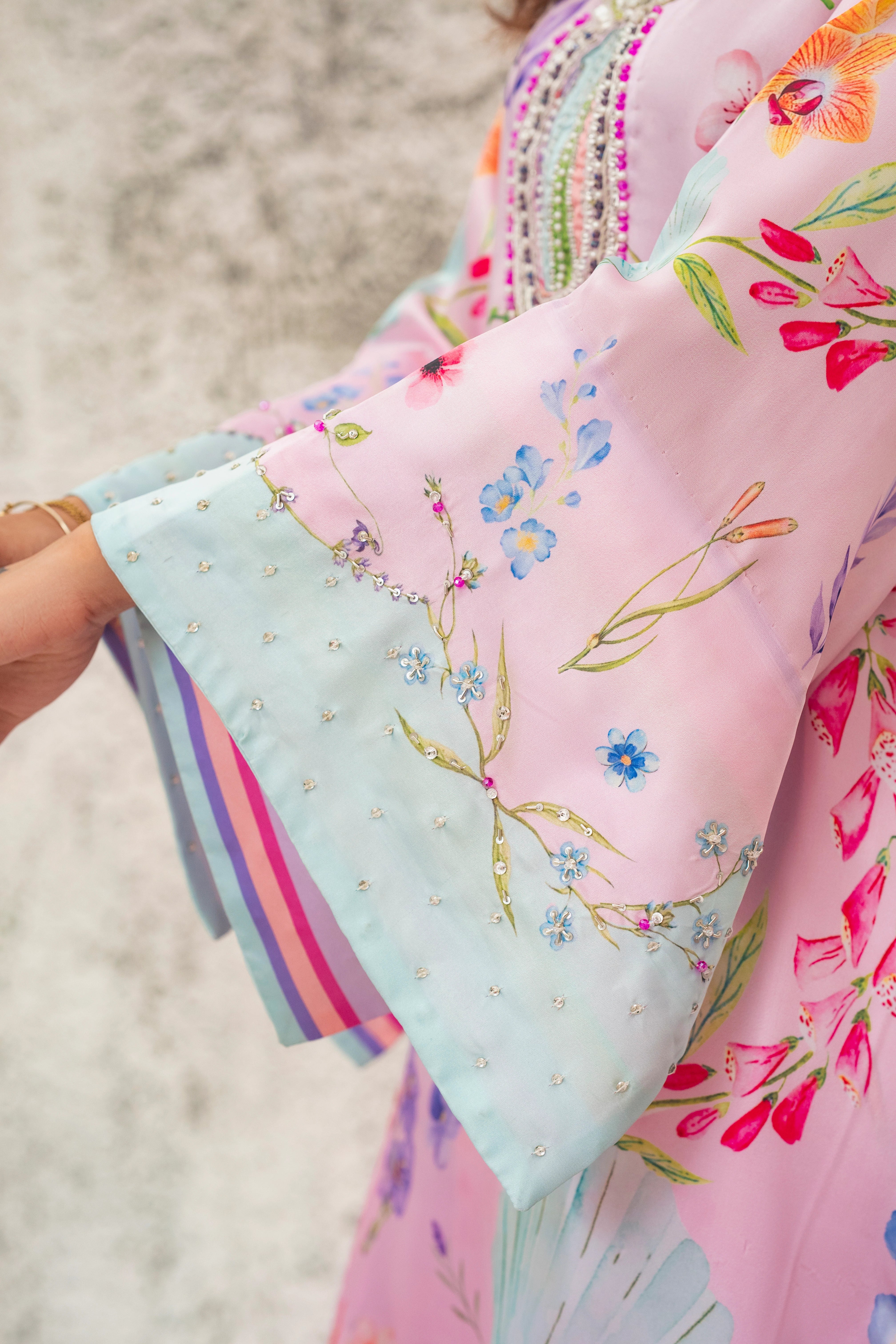 LIA - Festive Formal - VOL 2: Bathed in playful pastels, this three piece ensemble unfolds in shades of blush pink, fuchsia, lavender, tea green and soft blues. The short shamooz silk kurta is adorned with delicate floral and shell motifs, accented with intricate hand embroidery with zardoze, sequins, Swarovski crystals and beads on the neck and sleeve hem. Paired with a farshi shalwar in matching shamooz silk while soft pale turquoise scattered Swarovski crystal chaan border frame the shalwar hem. An organza dupatta, washed in subtle pale turquoise and lavender hue with florals thread embroidery. The look strikes a graceful balance of tradition and flair.