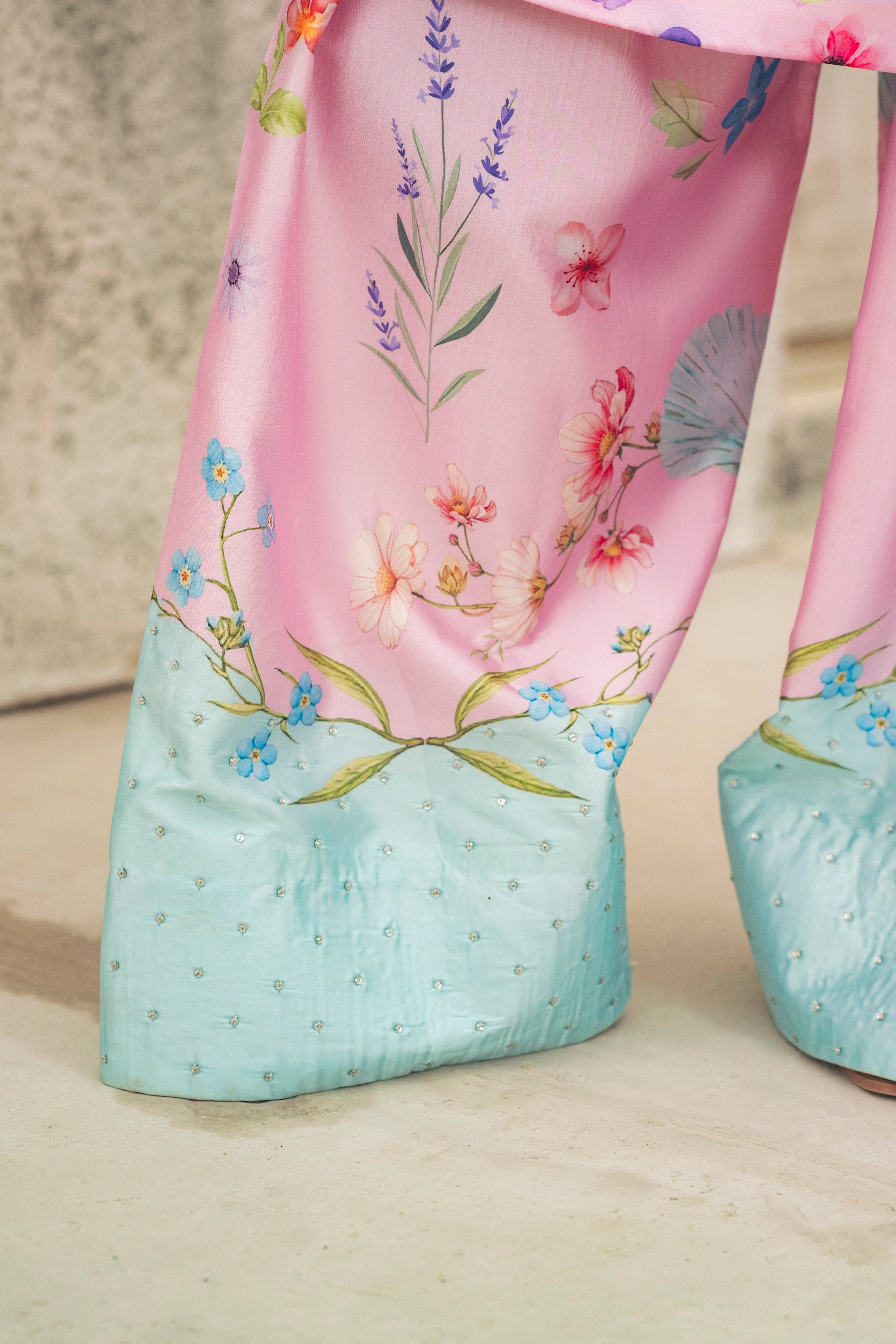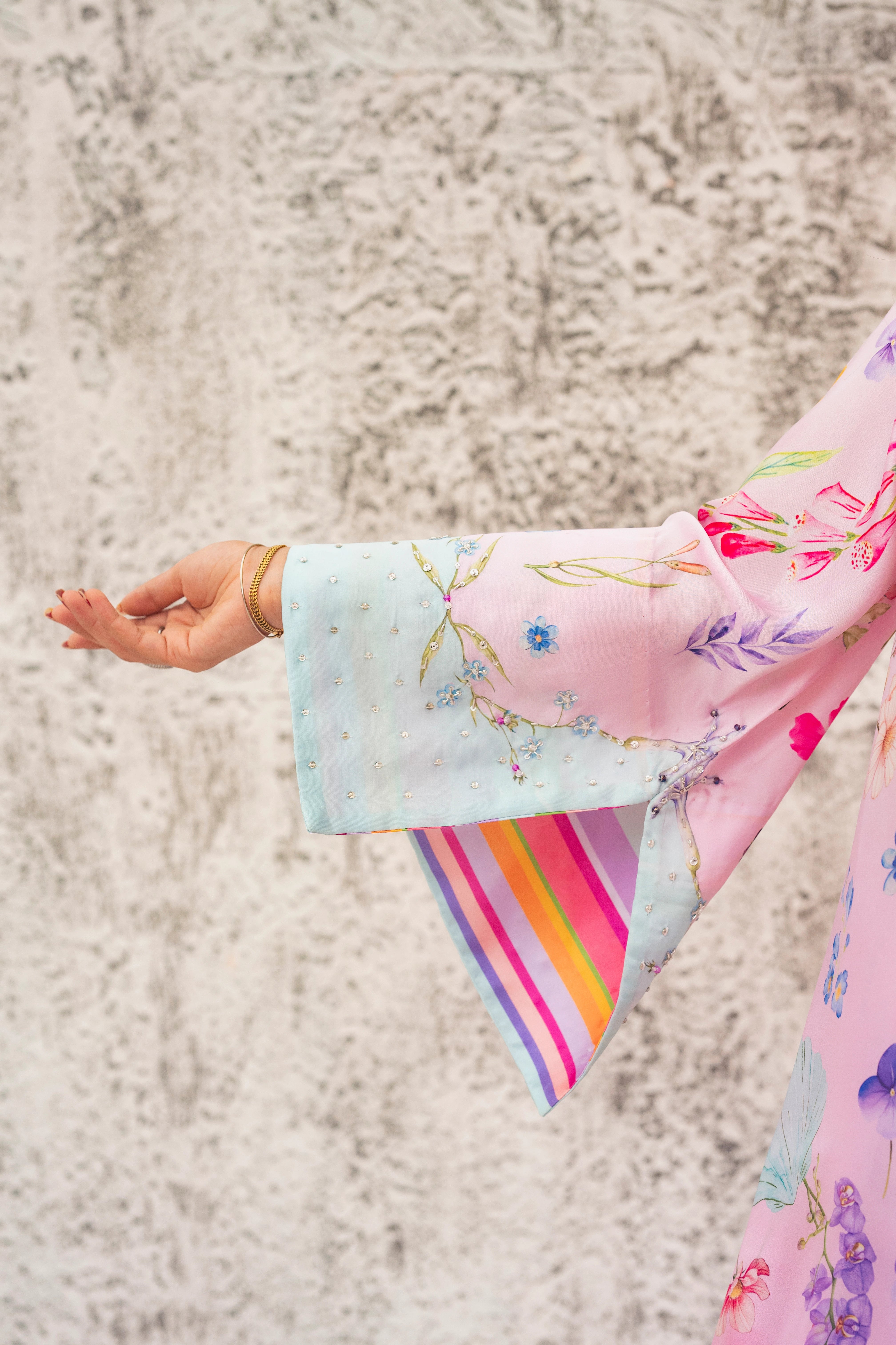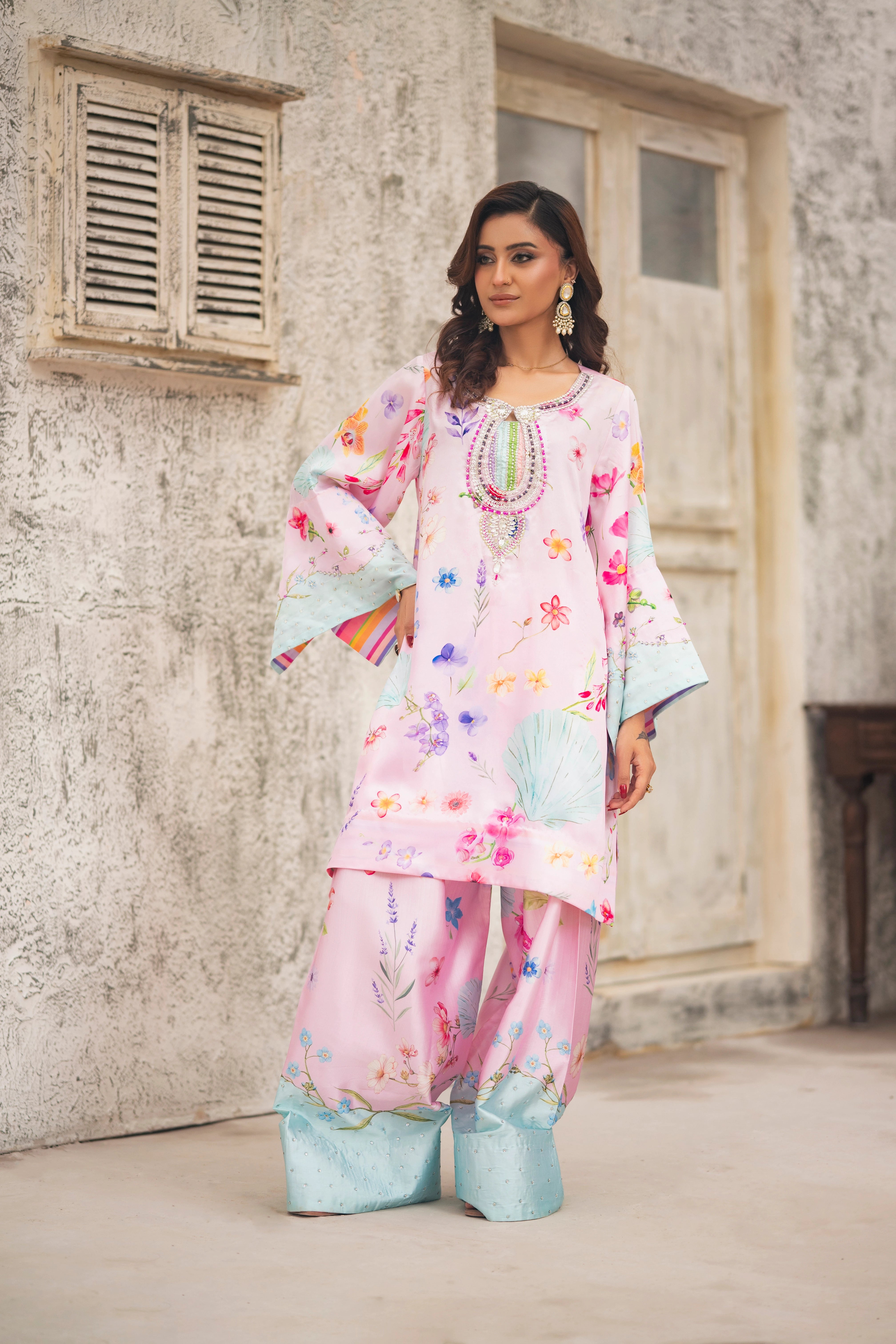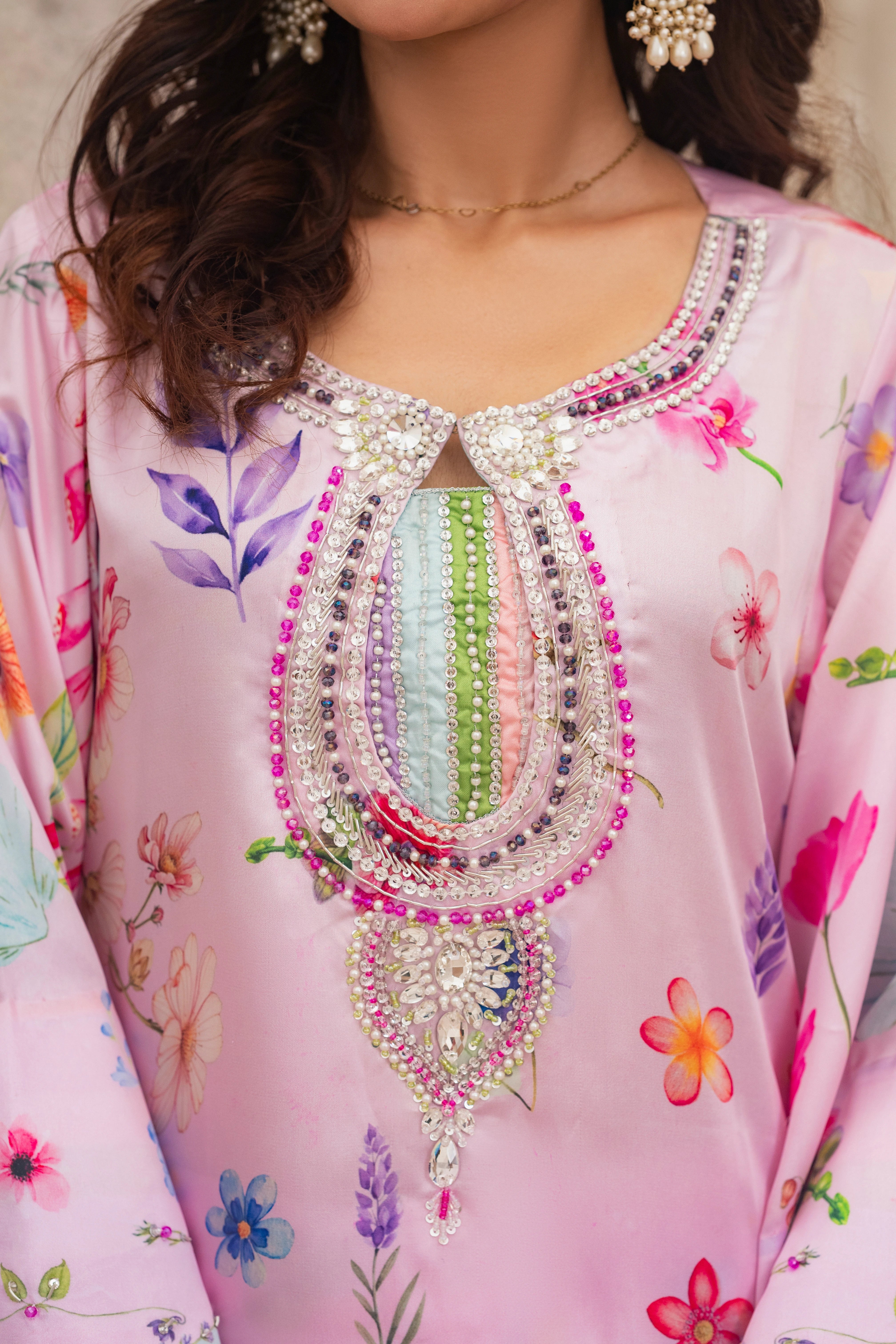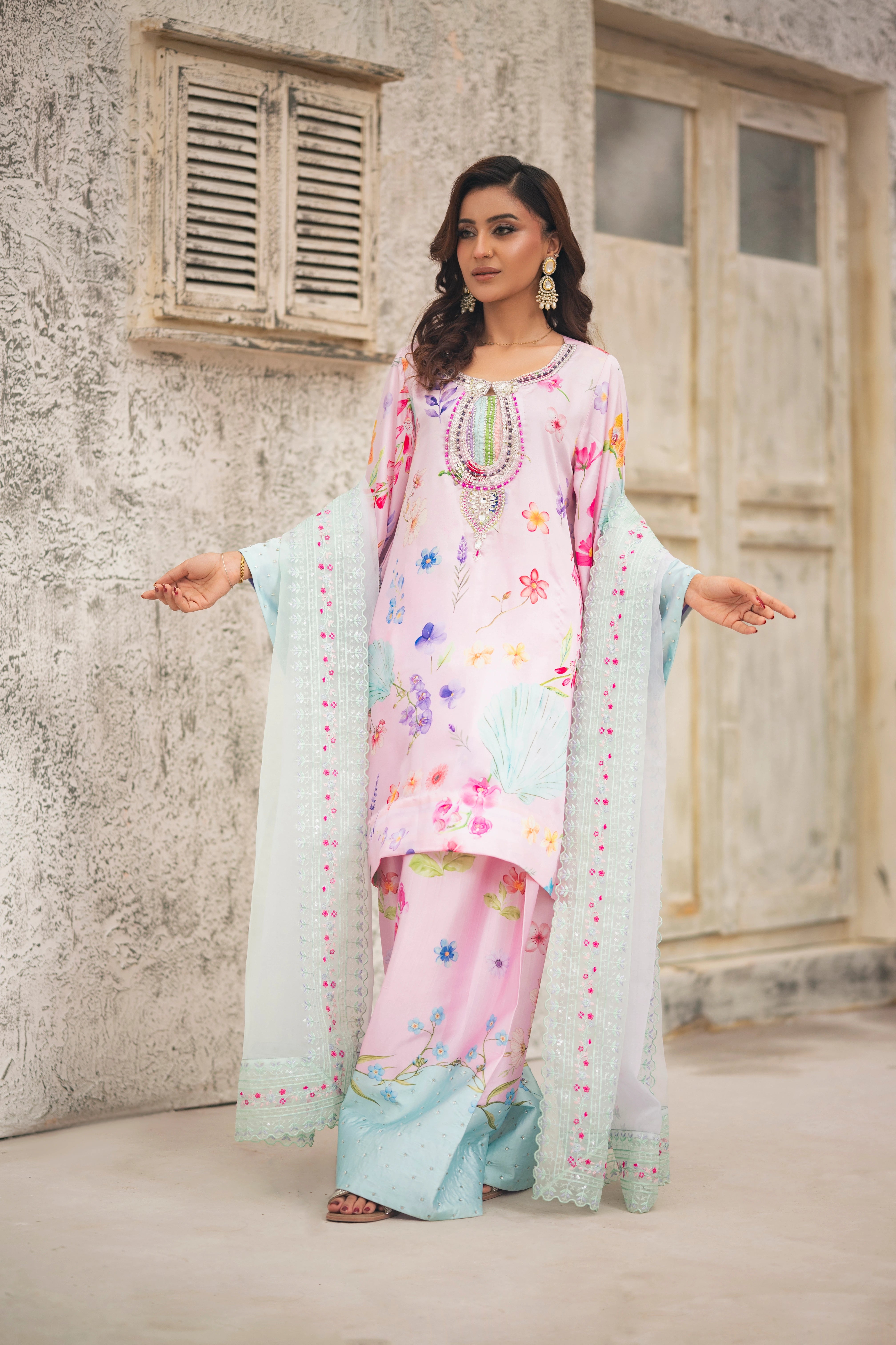 LIA - Festive Formal - VOL 2: Bathed in playful pastels, this three piece ensemble unfolds in shades of blush pink, fuchsia, lavender, tea green and soft blues. The short shamooz silk kurta is adorned with delicate floral and shell motifs, accented with intricate hand embroidery with zardoze, sequins, Swarovski crystals and beads on the neck and sleeve hem. Paired with a farshi shalwar in matching shamooz silk while soft pale turquoise scattered Swarovski crystal chaan border frame the shalwar hem. An organza dupatta, washed in subtle pale turquoise and lavender hue with florals thread embroidery. The look strikes a graceful balance of tradition and flair.