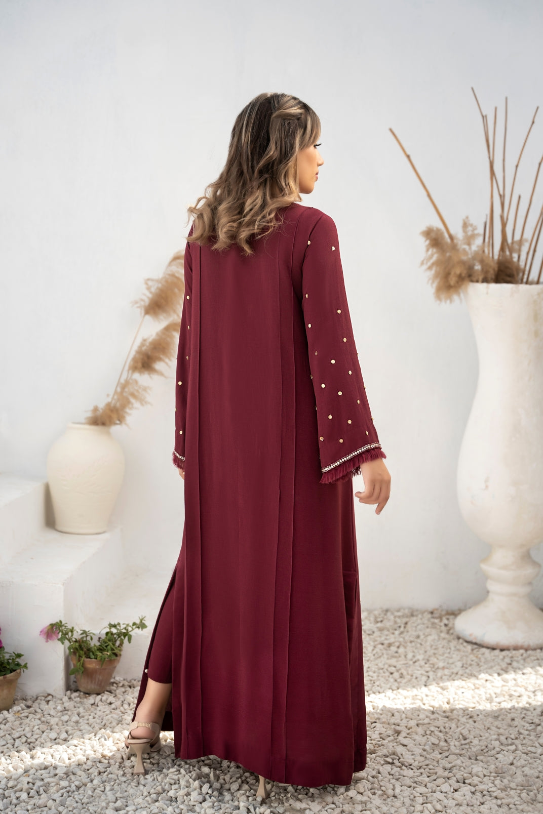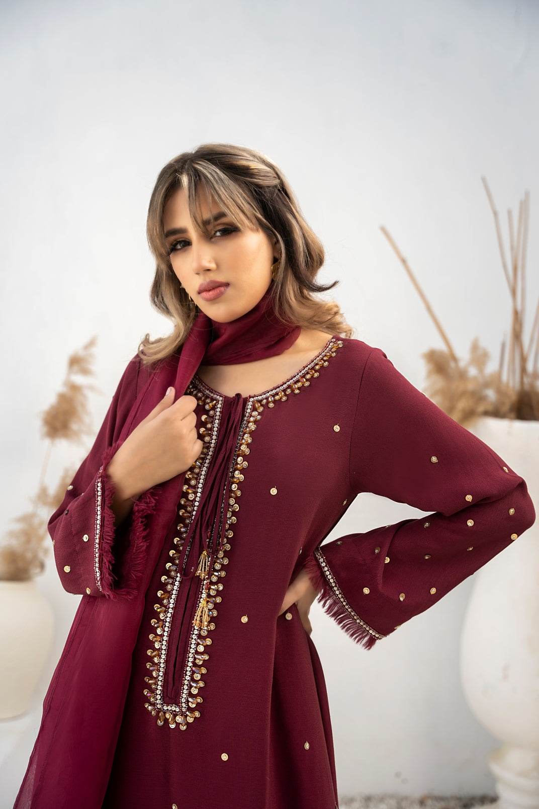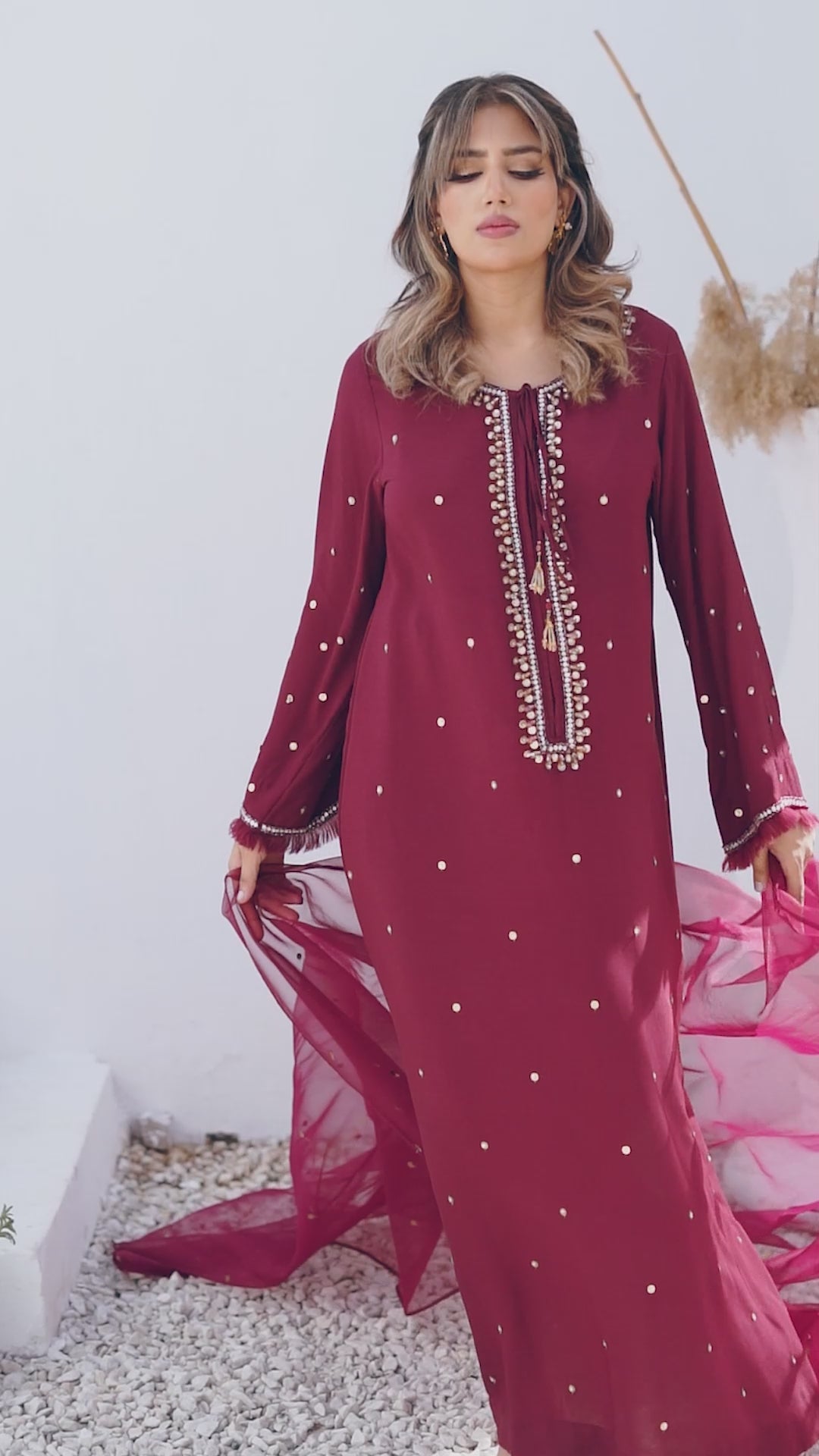 Melia'24: The ensemble features a maroon pure crepe georgette long tunic with sequins spray organza dupatta. Tunic embellished with hand embroidery on neckline and sleeves with sequins, bugle beads, and crystals. Finished with tassel on the neckline and frayed edges on the sleeves. Paired up with a matching straight pant to create an elegant and classic look.