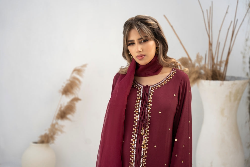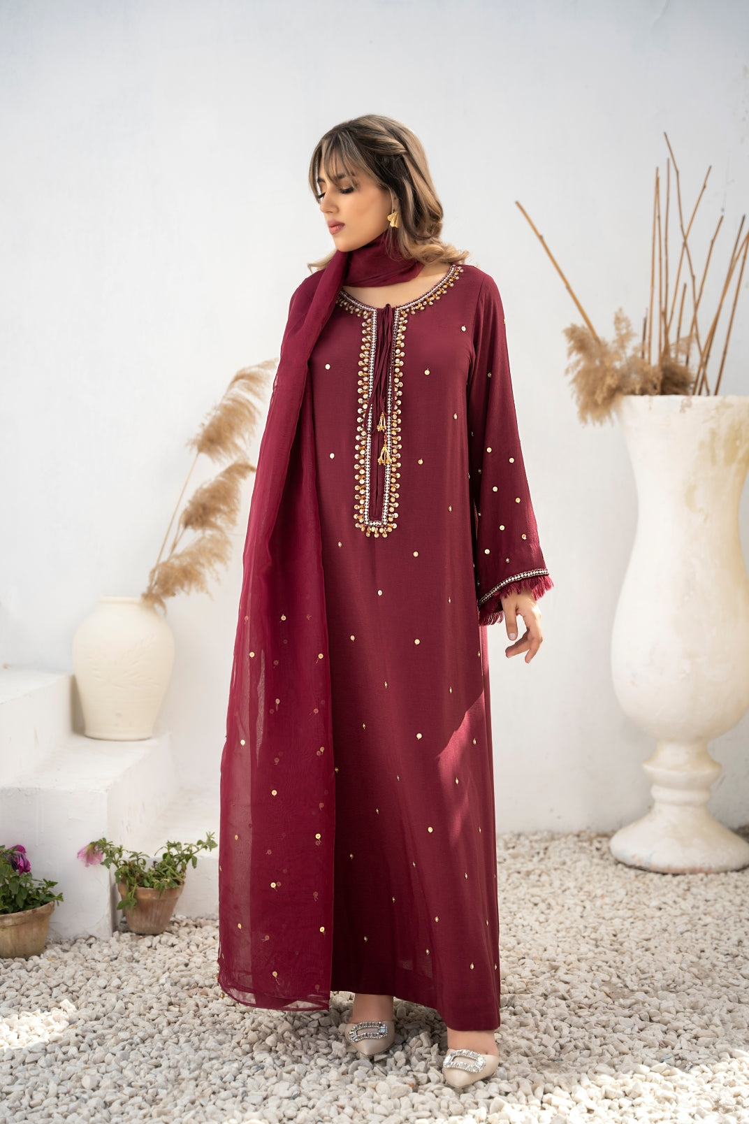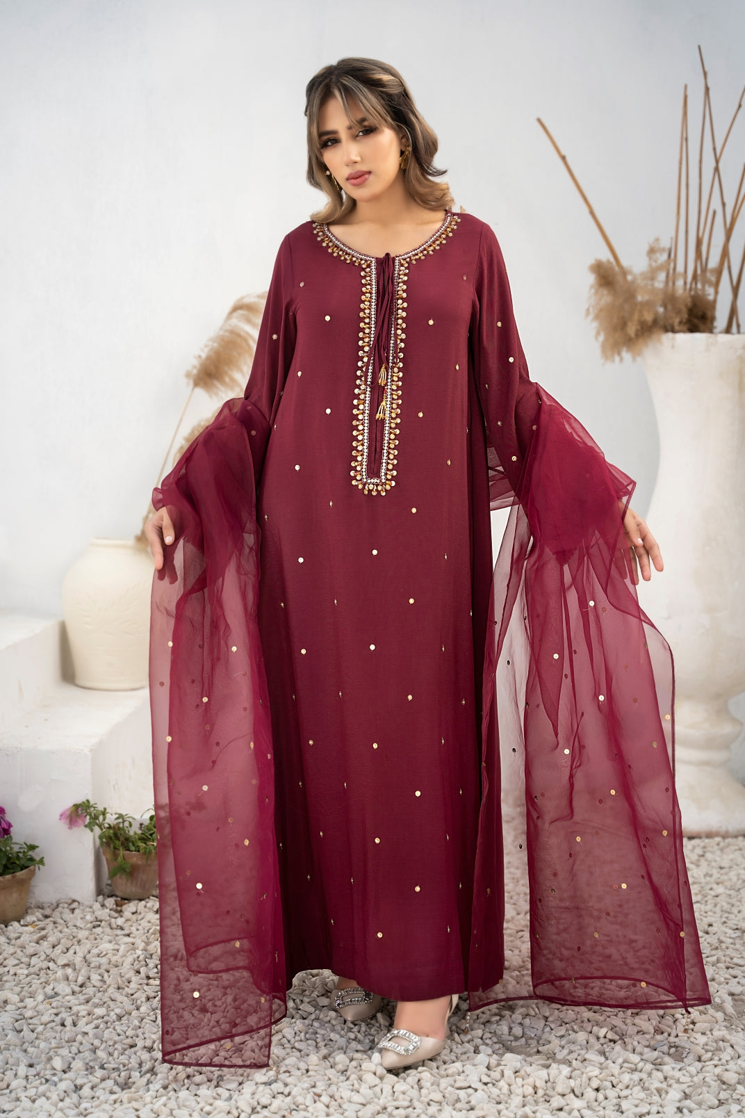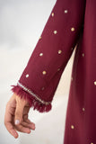 Melia'24: The ensemble features a maroon pure crepe georgette long tunic with sequins spray organza dupatta. Tunic embellished with hand embroidery on neckline and sleeves with sequins, bugle beads, and crystals. Finished with tassel on the neckline and frayed edges on the sleeves. Paired up with a matching straight pant to create an elegant and classic look.