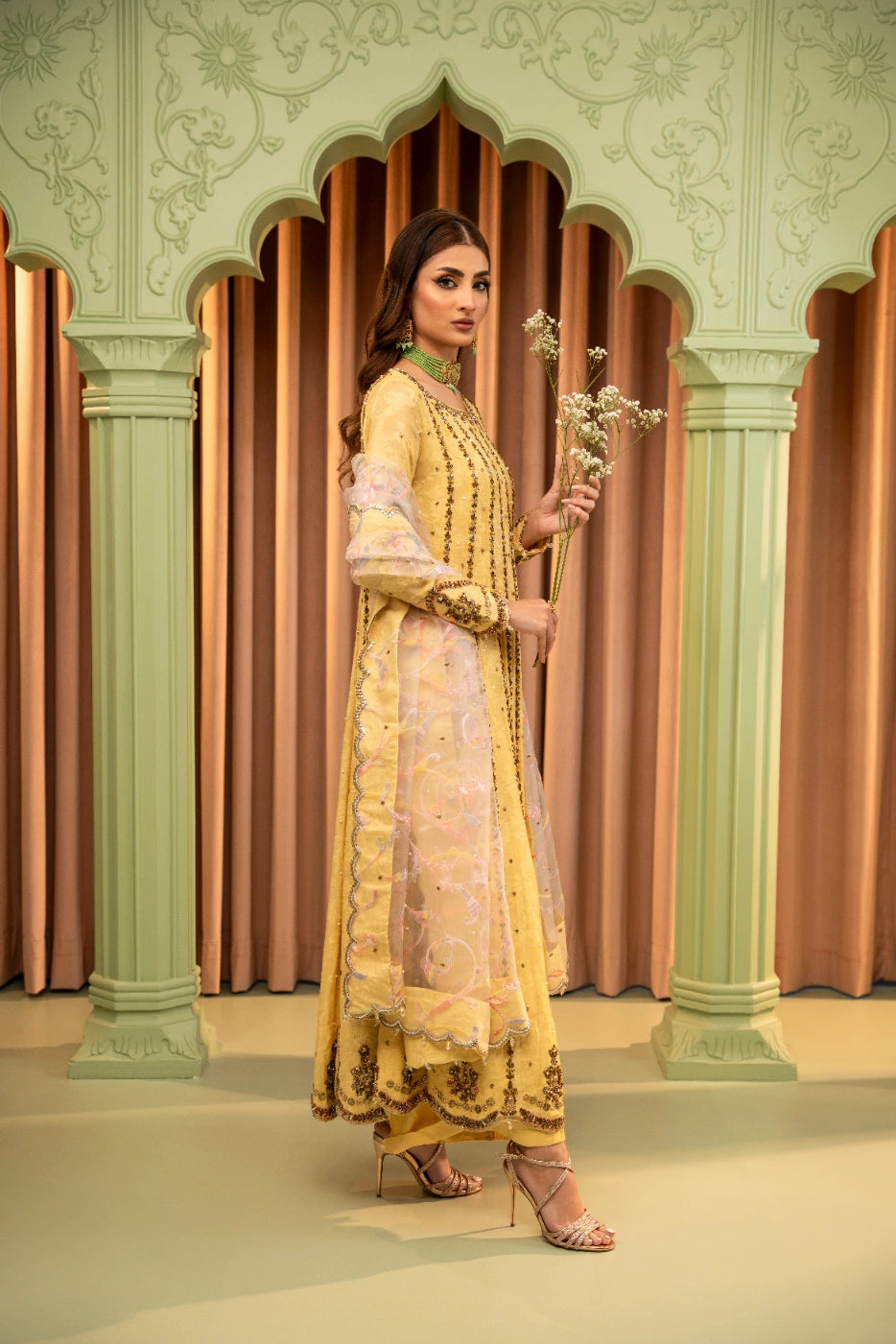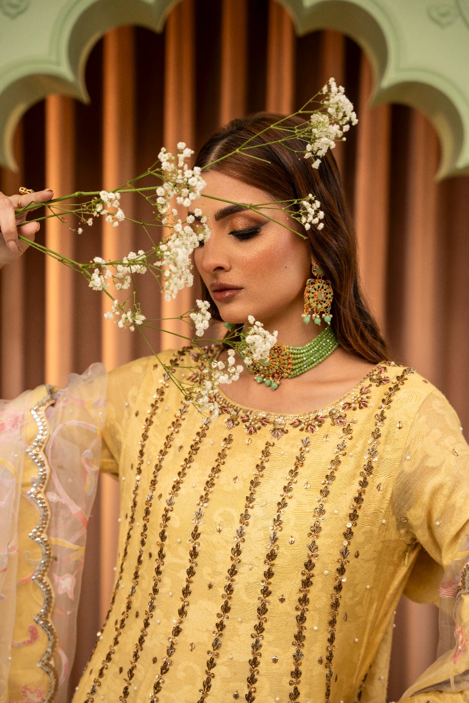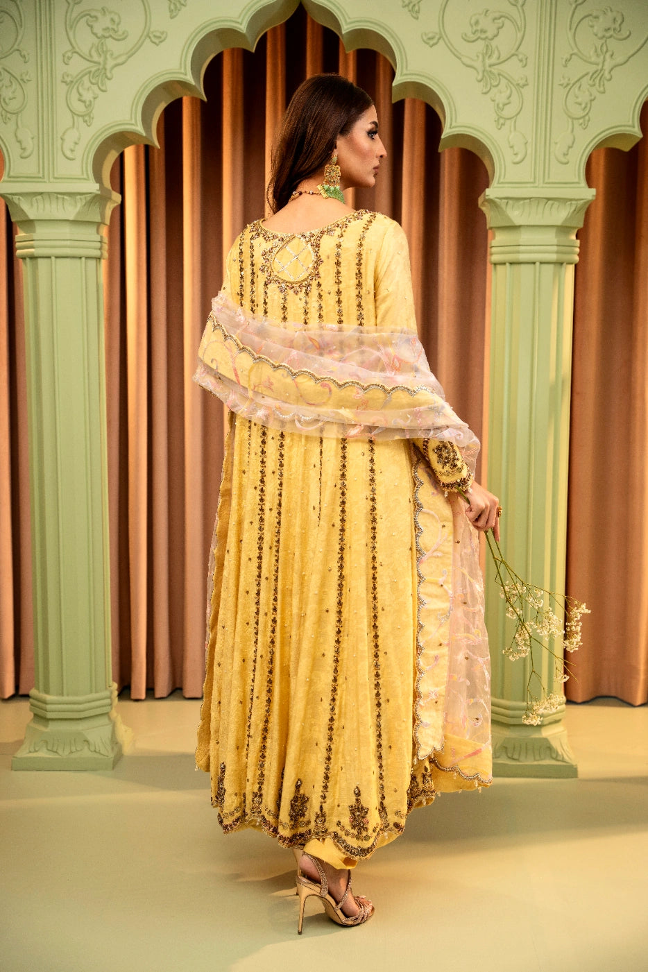 A lemon self Khaadi silk kalidar is delicately hand embroidered with dull gold and hint of silver zardoze and gold sequins and crystals. Embellished with baby pink and lavender colour resham details on kalidar. Paired with Khaadi silk pants and broshia organza.