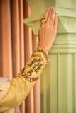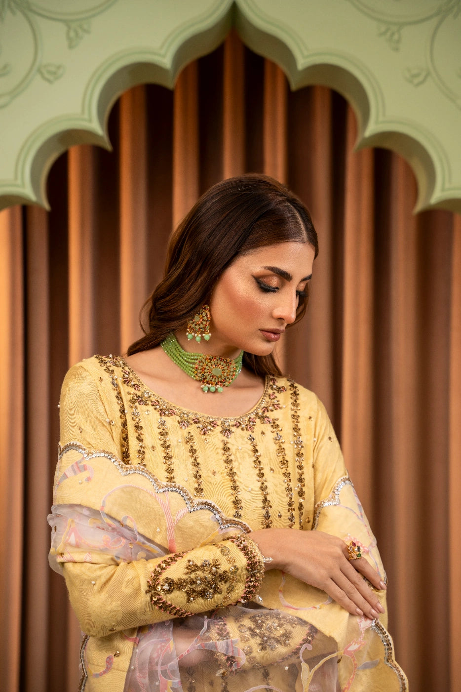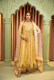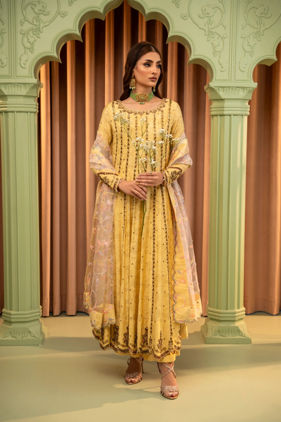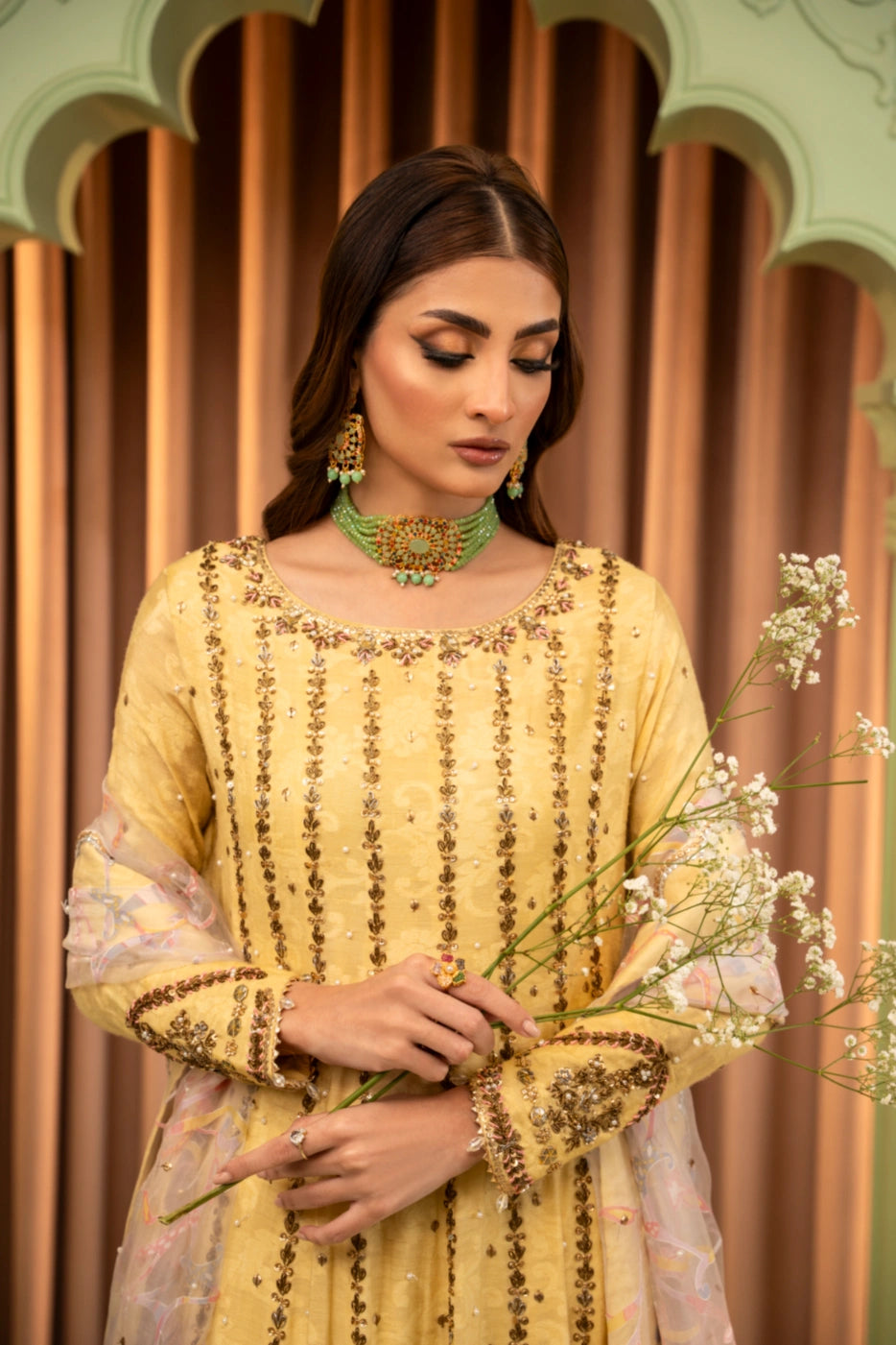 A lemon self Khaadi silk kalidar is delicately hand embroidered with dull gold and hint of silver zardoze and gold sequins and crystals. Embellished with baby pink and lavender colour resham details on kalidar. Paired with Khaadi silk pants and broshia organza.