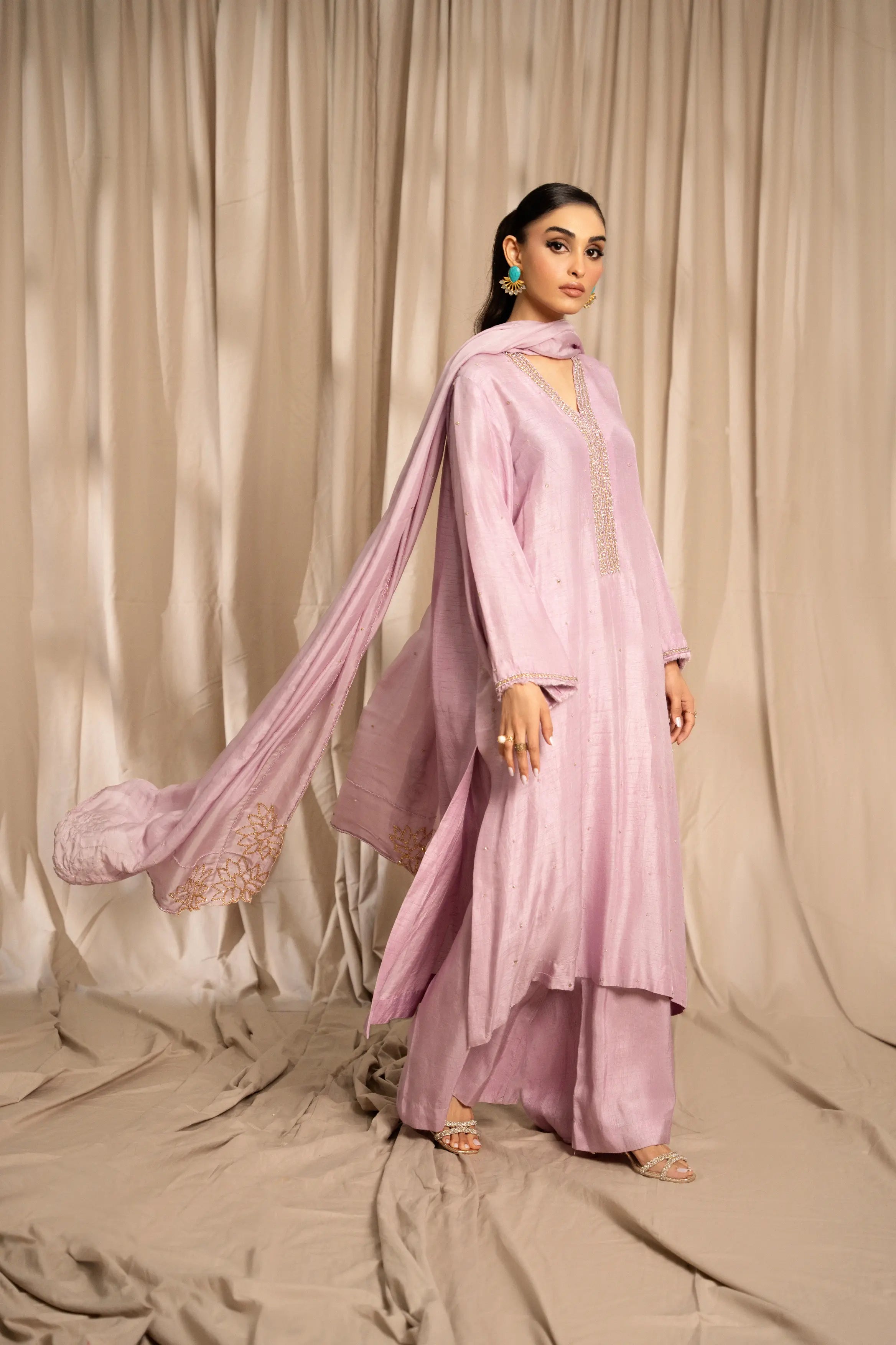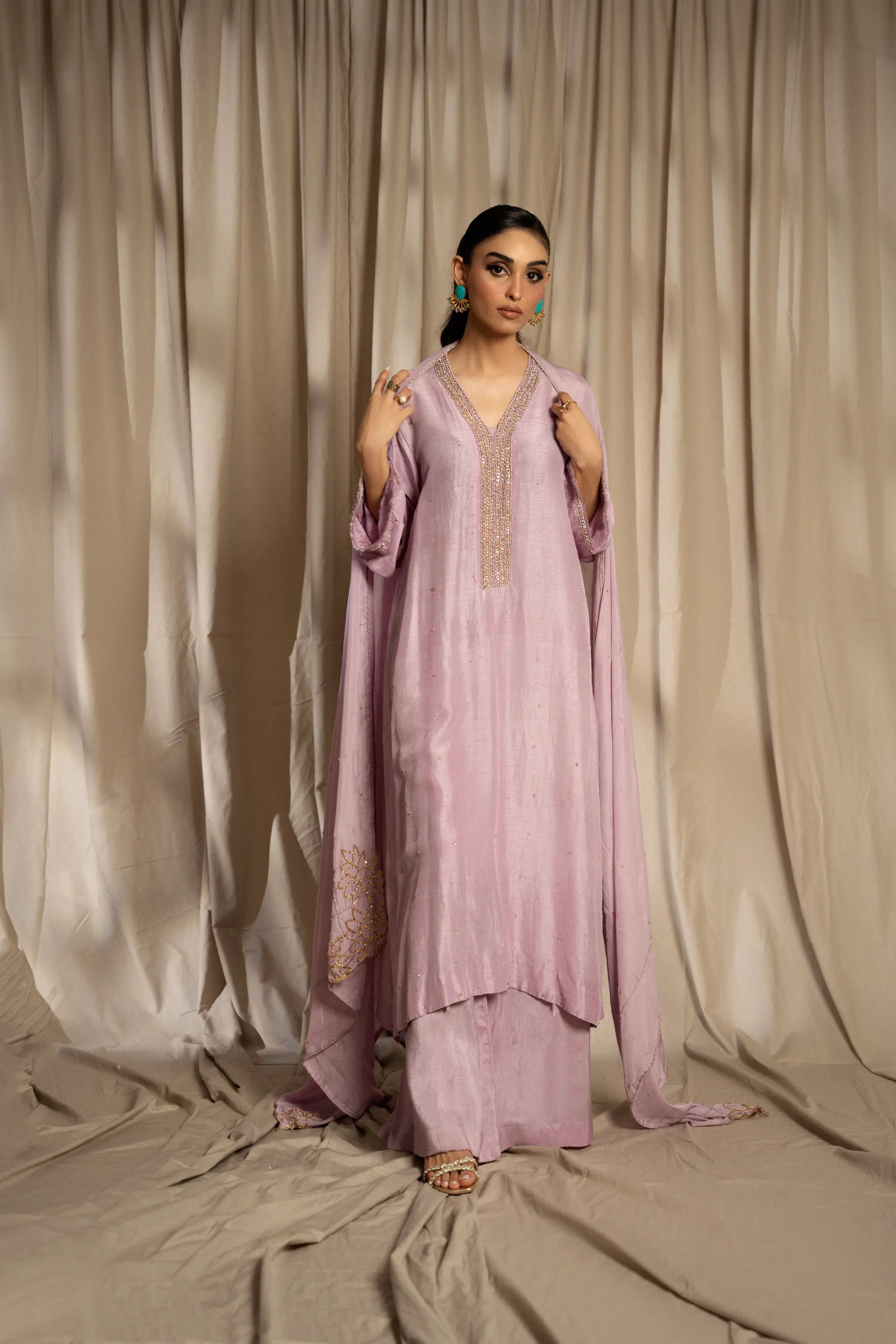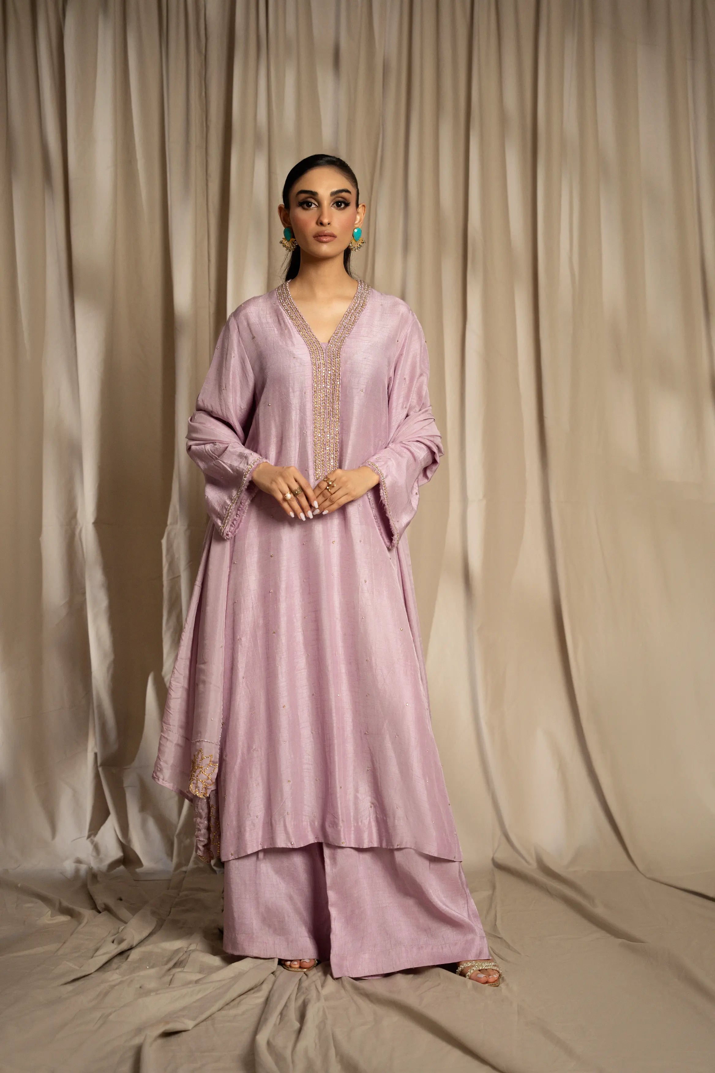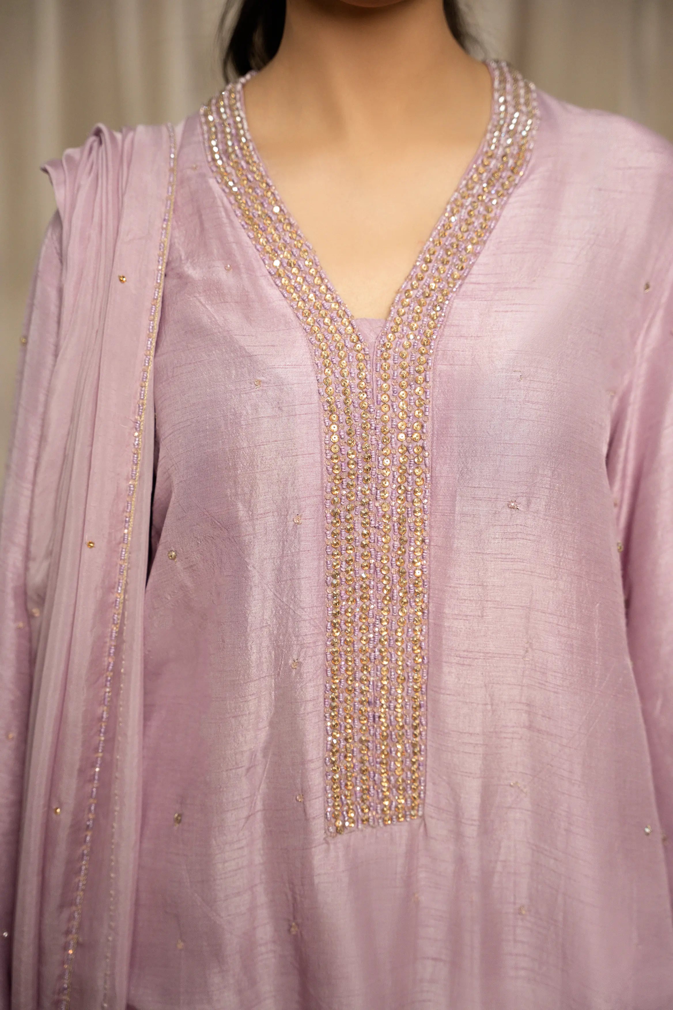 LIA - Festive Formal: The ensemble features a lilac korean raw silk long shirt embellished with delicate Swarovski linear neckline and chaan all over. Full sleeves finished with frayed edges. and culottes with medium silk dupatta adorned with Swarovski and lotus inspired cutwork embroidered edges. A relaxed charm this festive season.