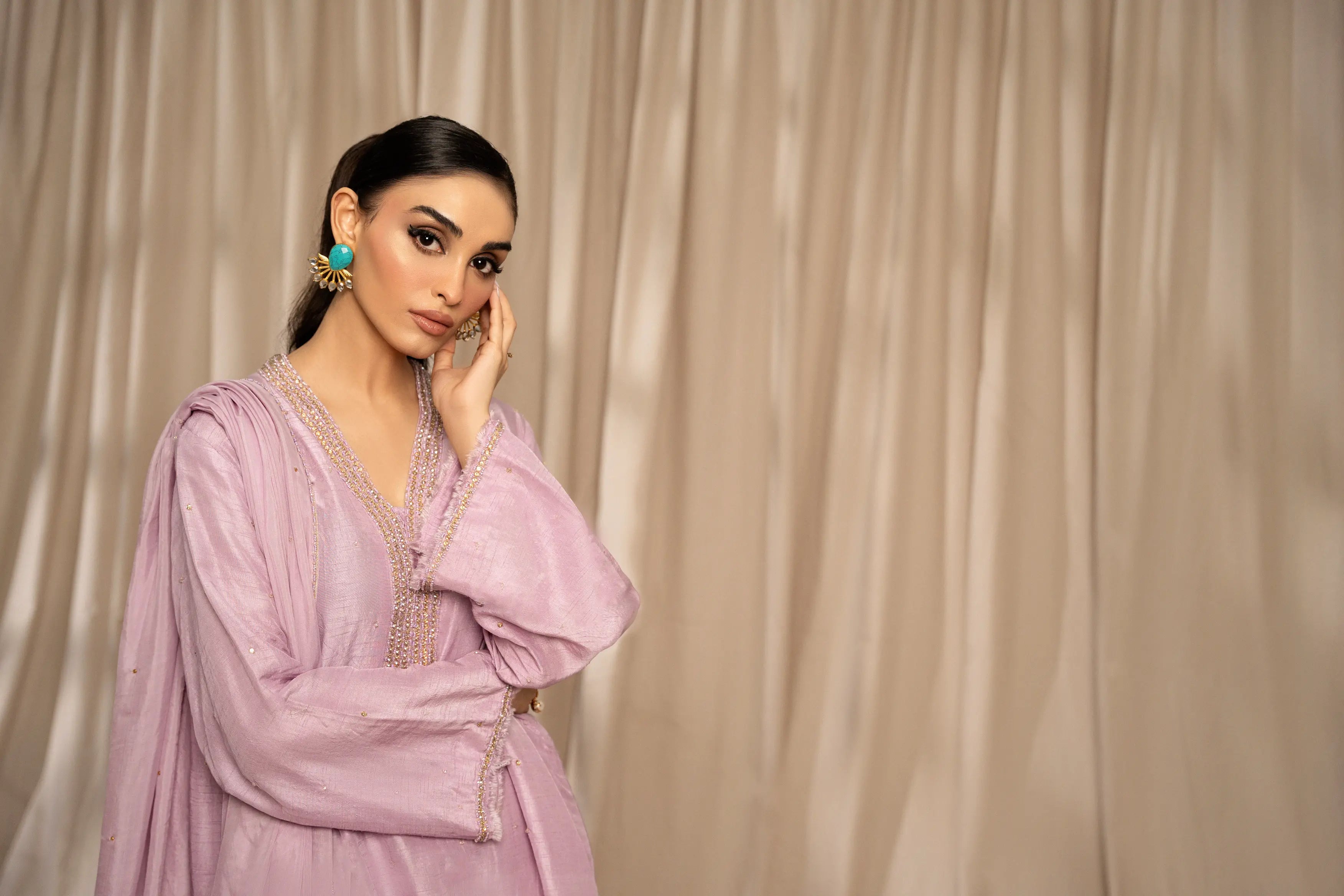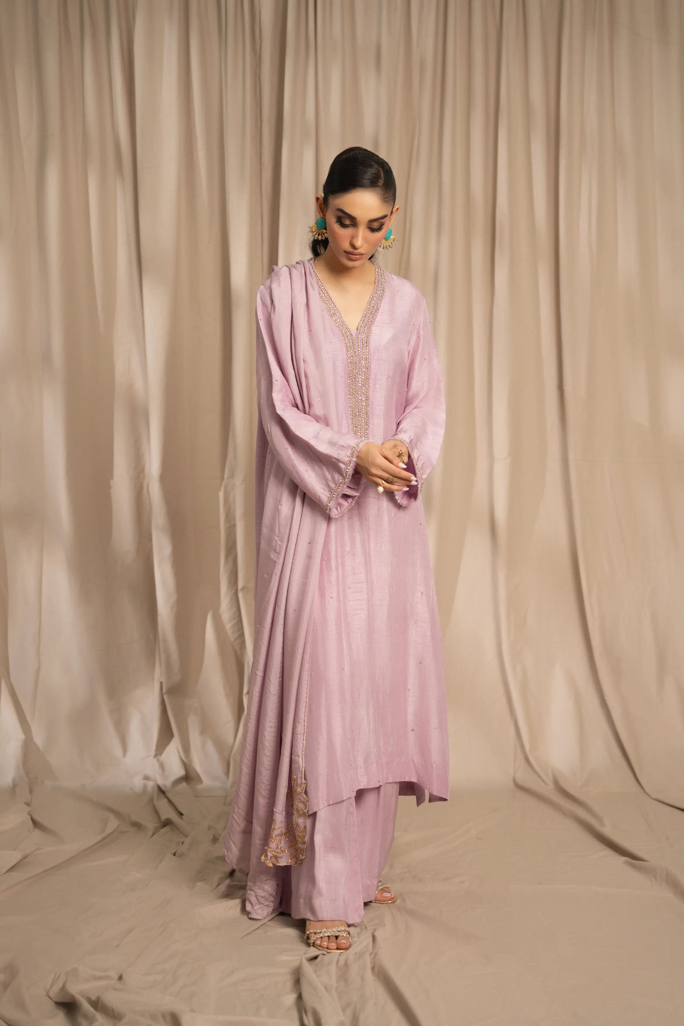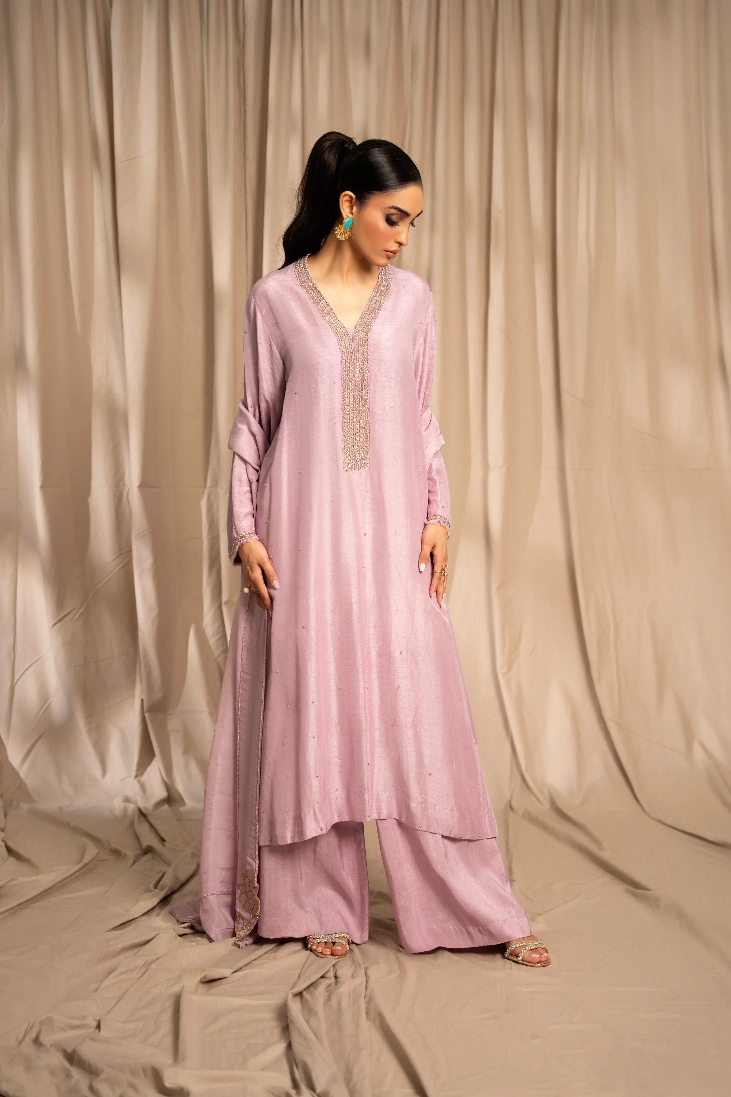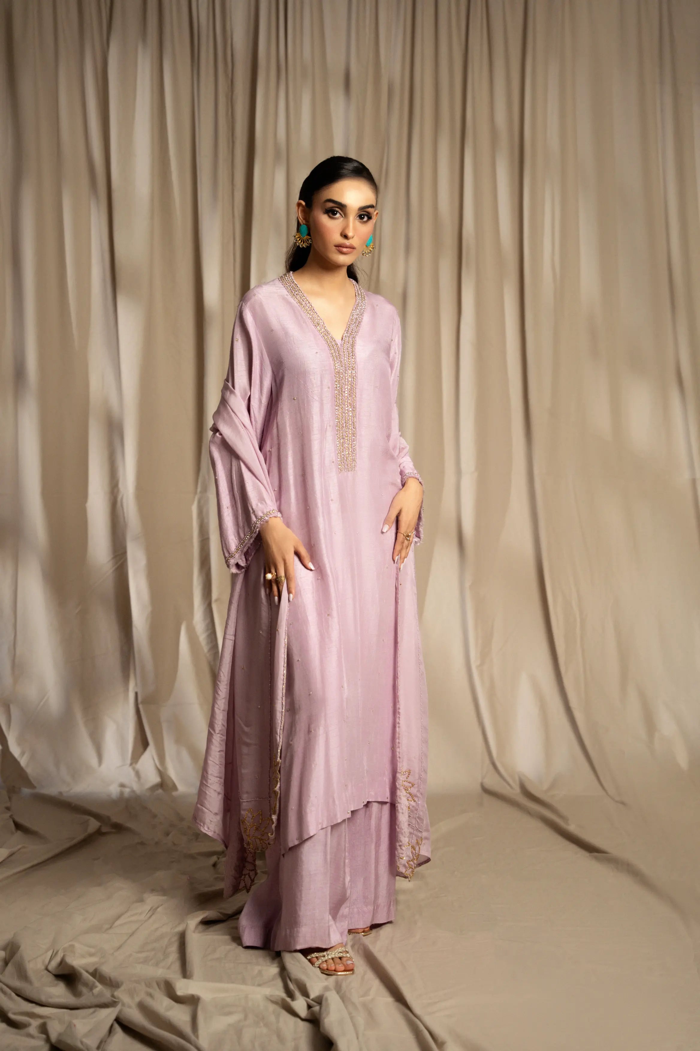 LIA - Festive Formal: The ensemble features a lilac korean raw silk long shirt embellished with delicate Swarovski linear neckline and chaan all over. Full sleeves finished with frayed edges. and culottes with medium silk dupatta adorned with Swarovski and lotus inspired cutwork embroidered edges. A relaxed charm this festive season.