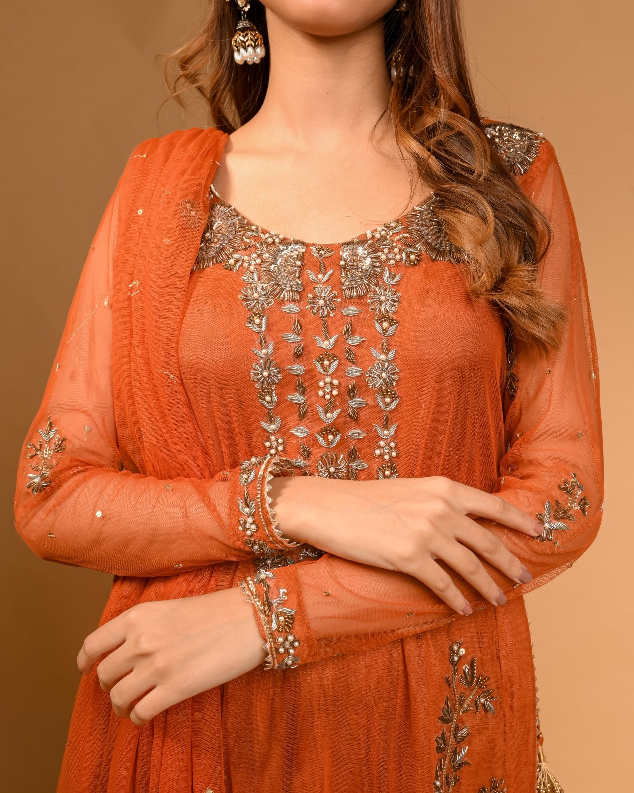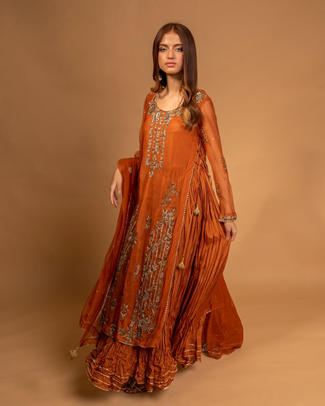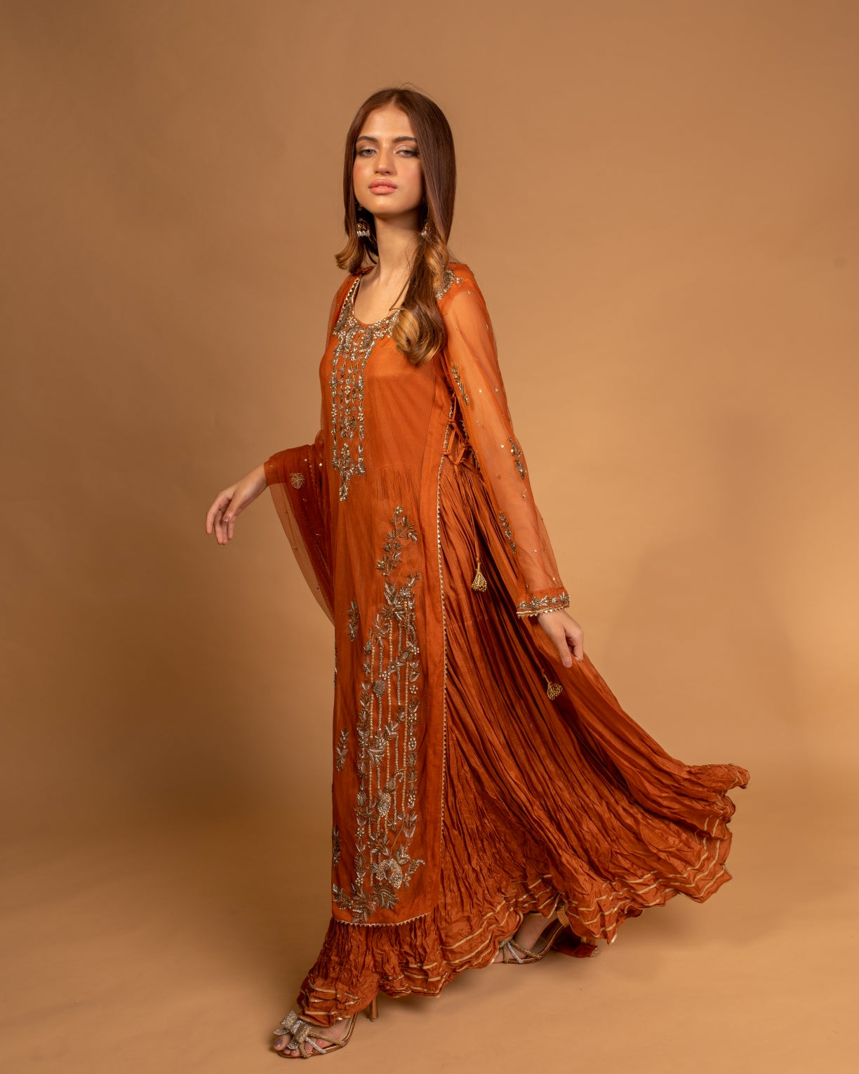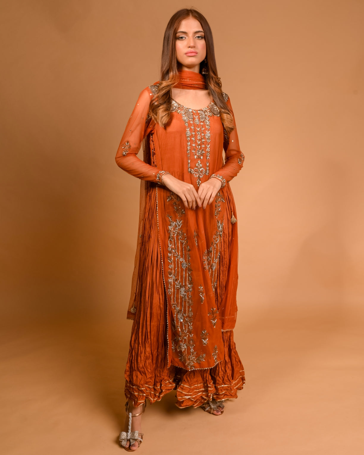 Heer’22: Nain(MHW6): This burnt orange net heavily worked side slit crushed dress is a modern silhouette with its dull gold and silver zardozi work composed on shirt front, back and sleeves. The piece is paired with a same net dupatta with over all sequins and hand worked motifs. Paired it with same coloured straight pants. This wedding season our collection redefines fall fashion and supplants eastern women to dress for the upcoming festive season in style.