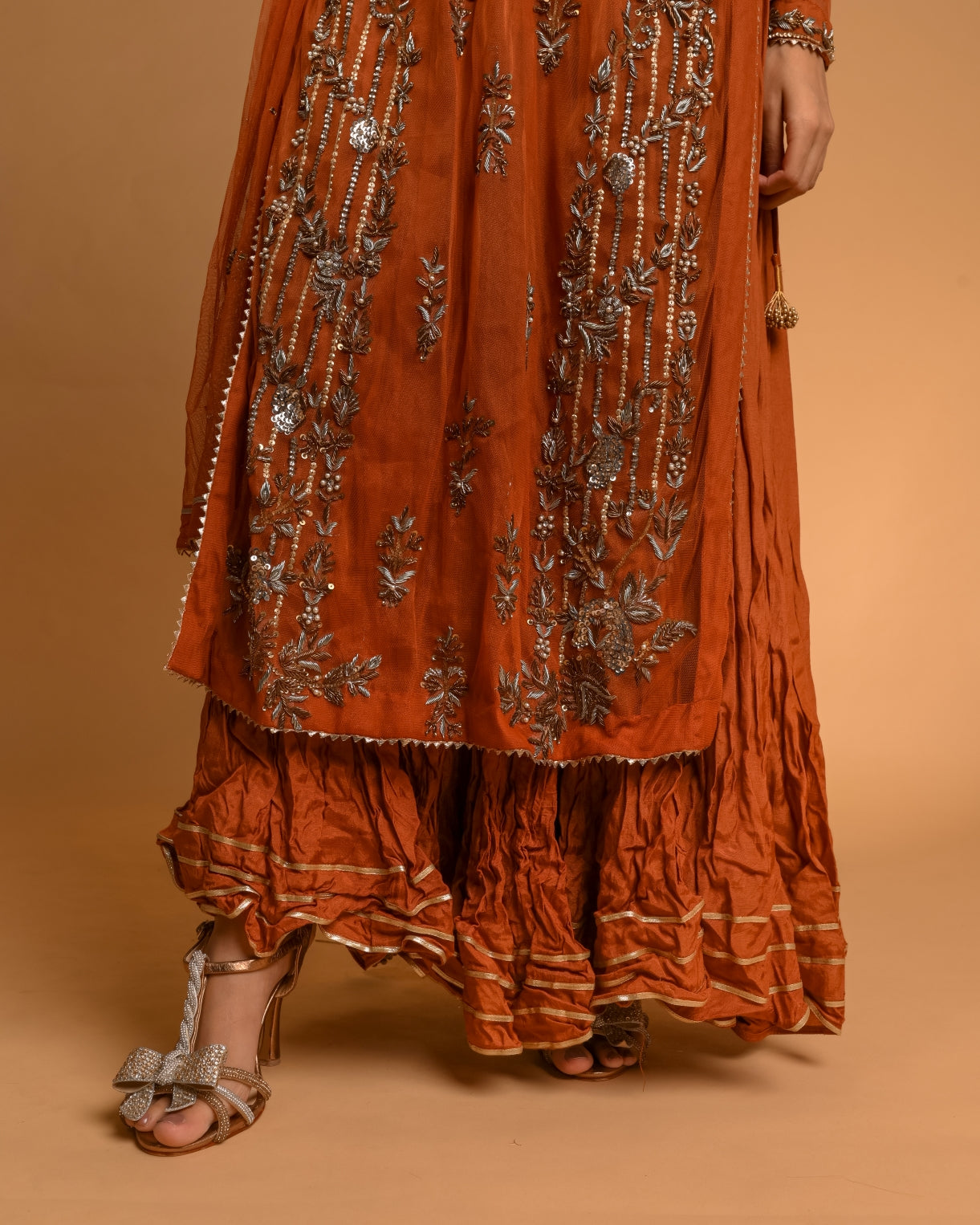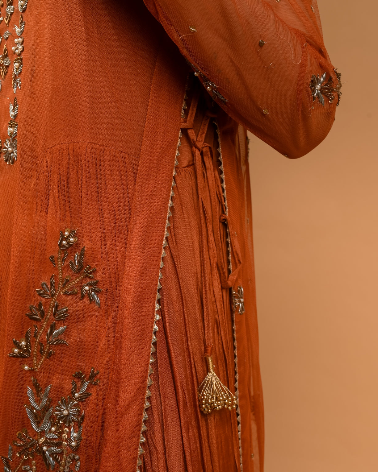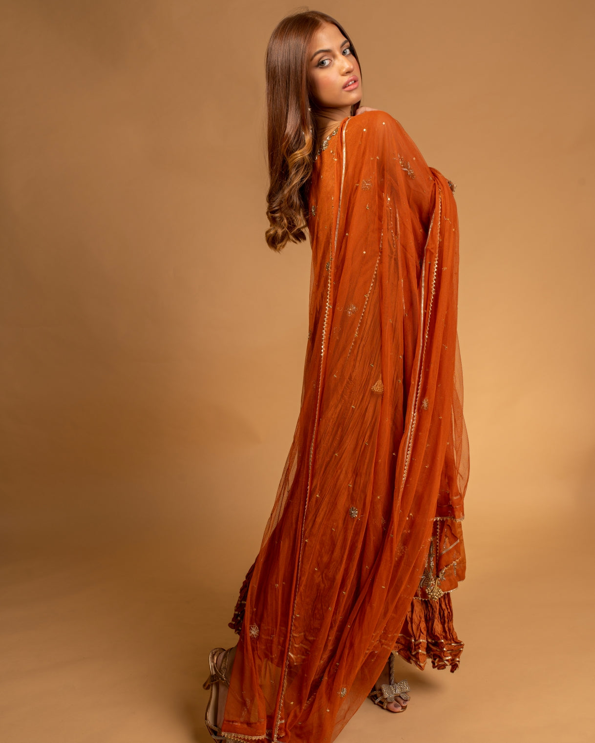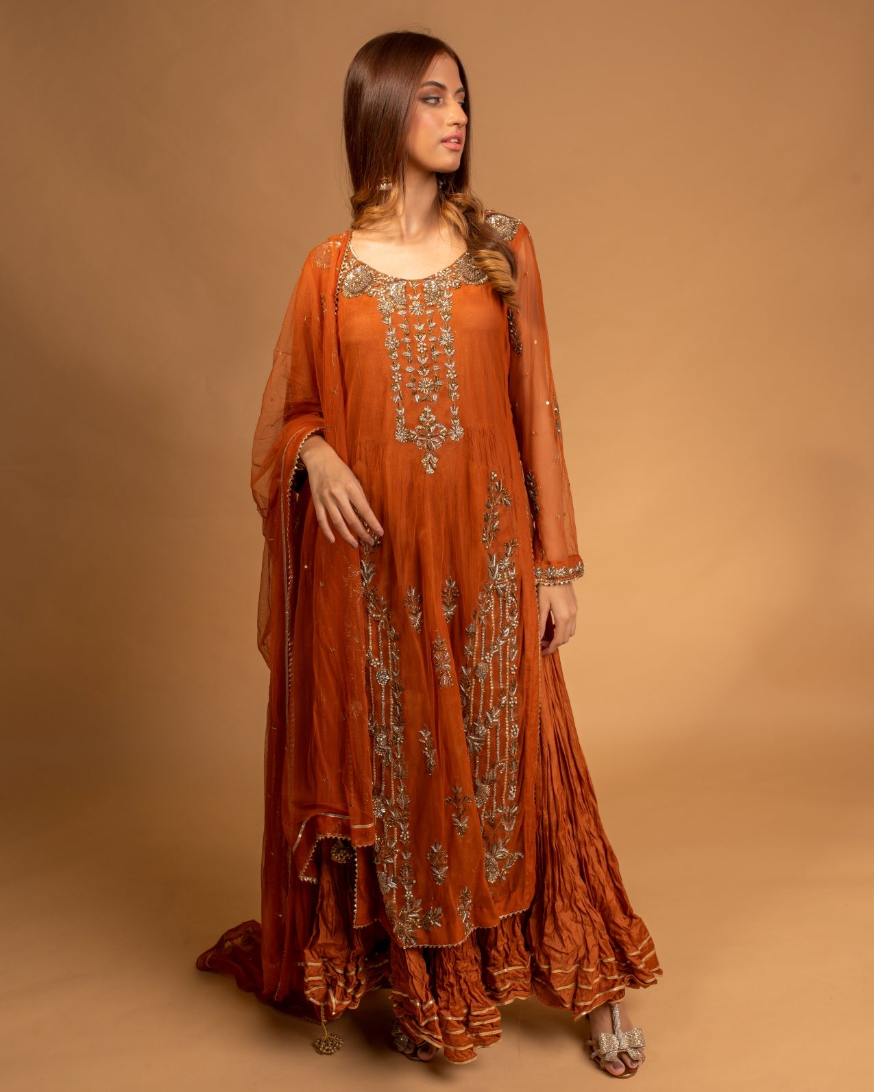 Heer’22: Nain(MHW6): This burnt orange net heavily worked side slit crushed dress is a modern silhouette with its dull gold and silver zardozi work composed on shirt front, back and sleeves. The piece is paired with a same net dupatta with over all sequins and hand worked motifs. Paired it with same coloured straight pants. This wedding season our collection redefines fall fashion and supplants eastern women to dress for the upcoming festive season in style.