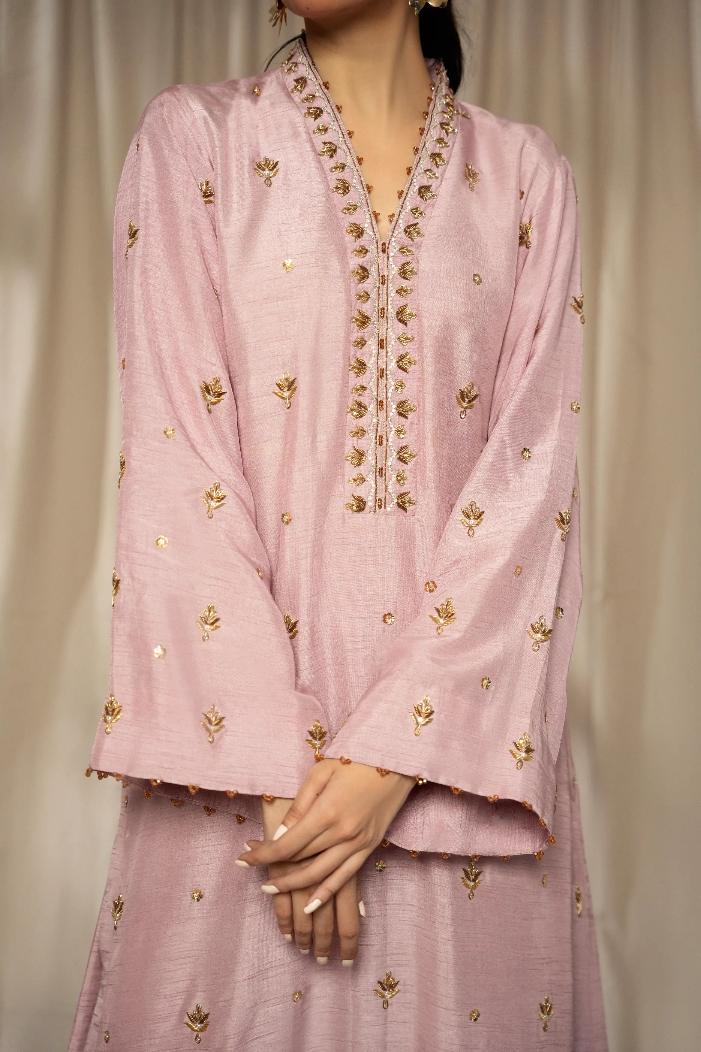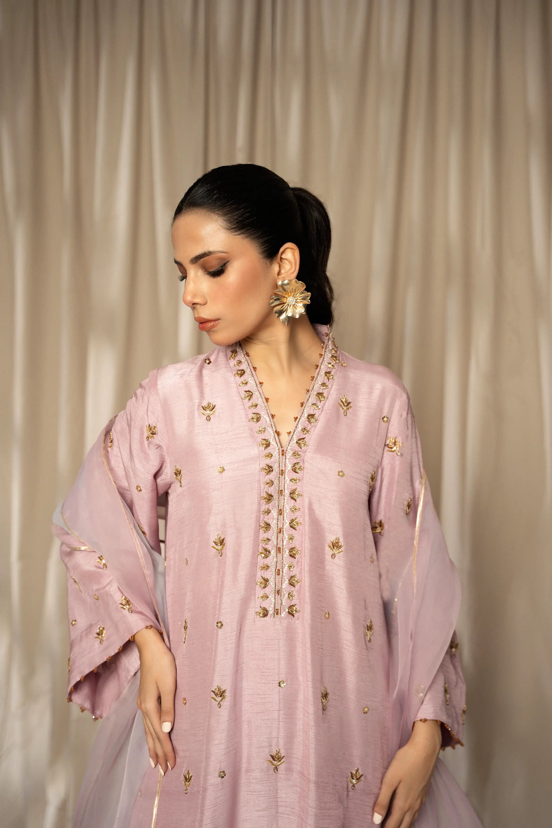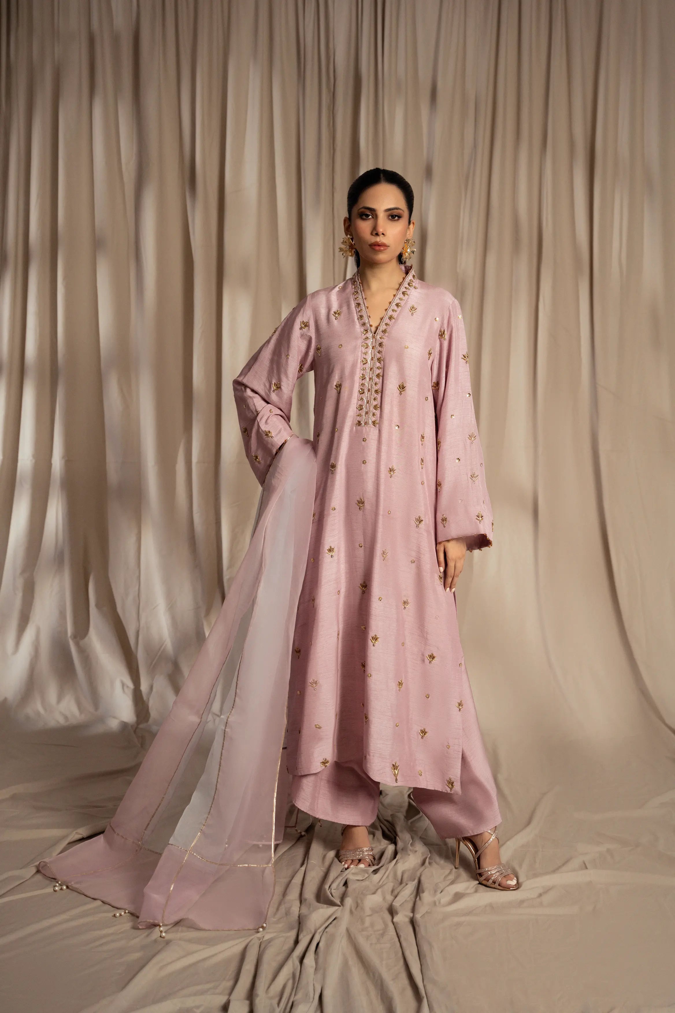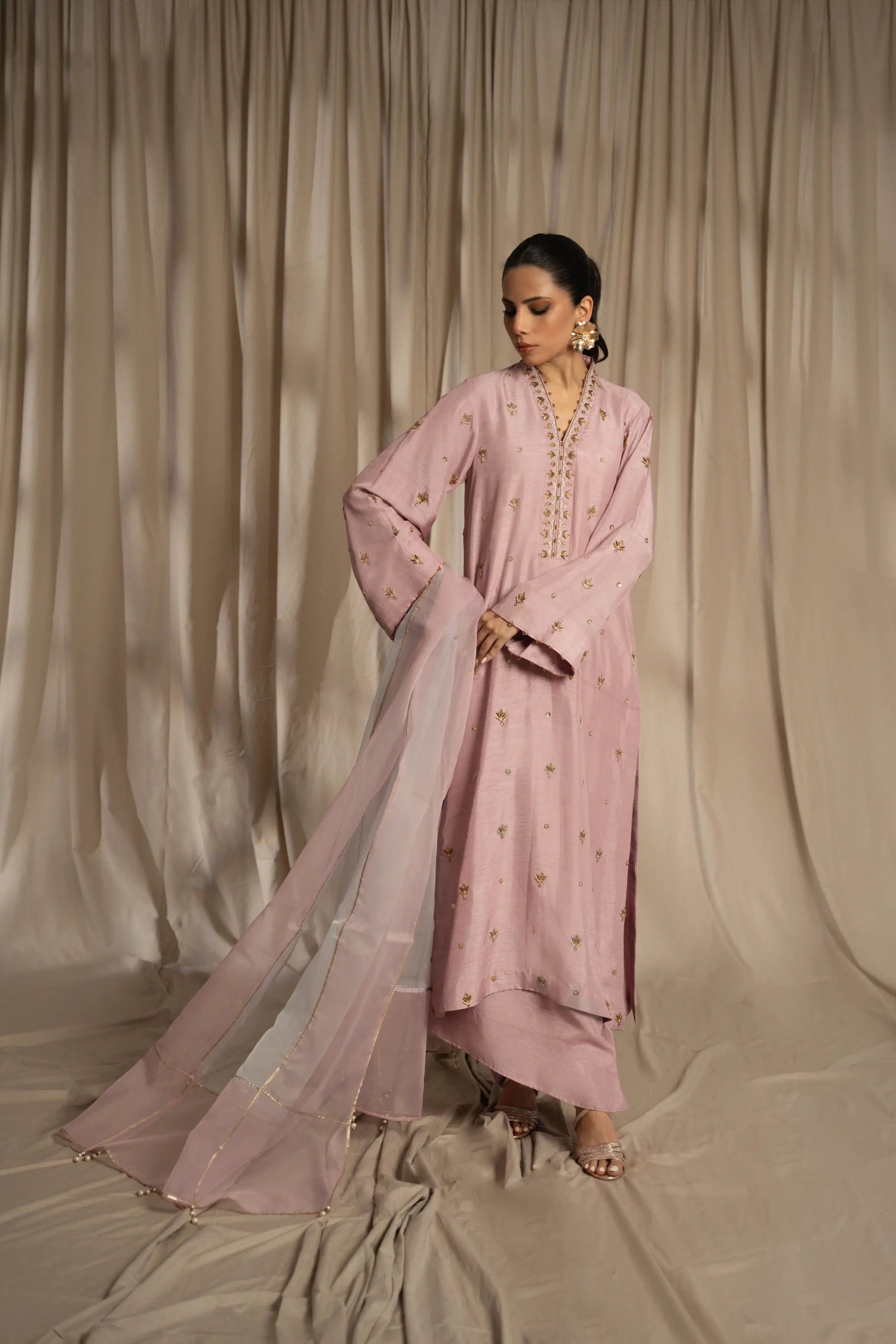 LIA - Festive Formal: The ensemble features a plum lavender korean raw silk long shirt and free flowing pants with organza dupatta. Shirt embellished with zardozi, sequins and crystals embroidery all over. Organza dupatta finished with dhanak and pearl exudes an air of effortless elegance, making it the perfect choice for any occasion.