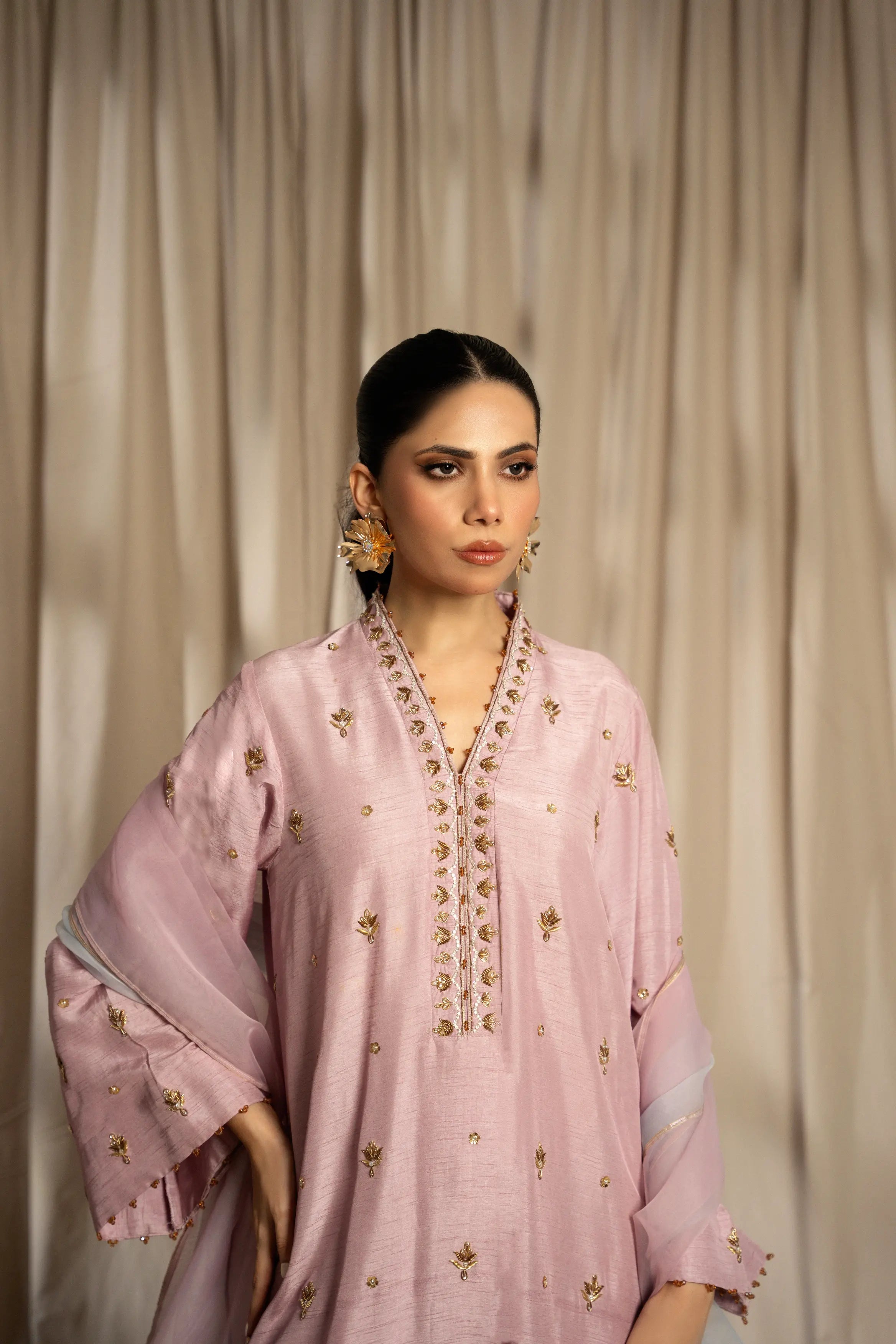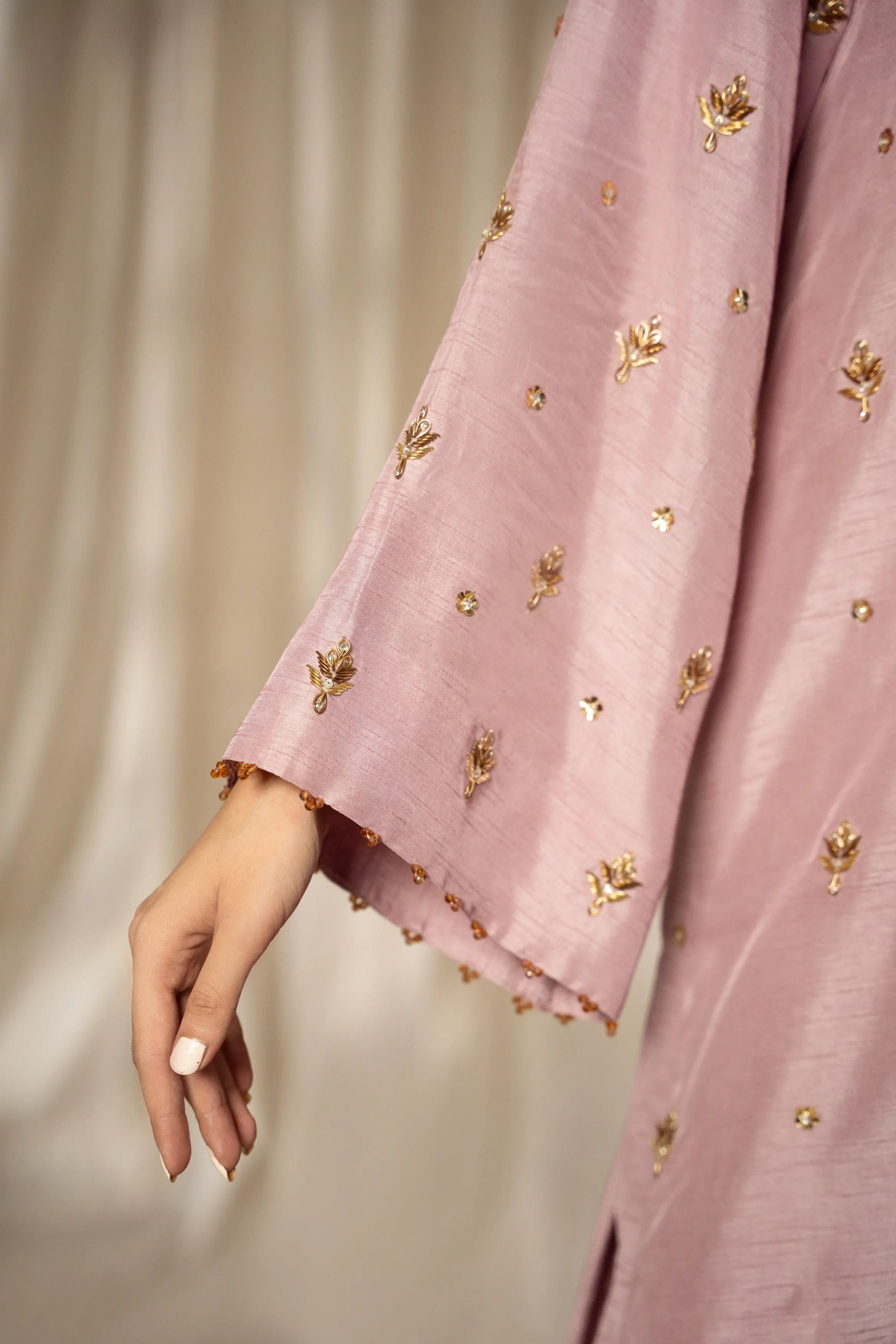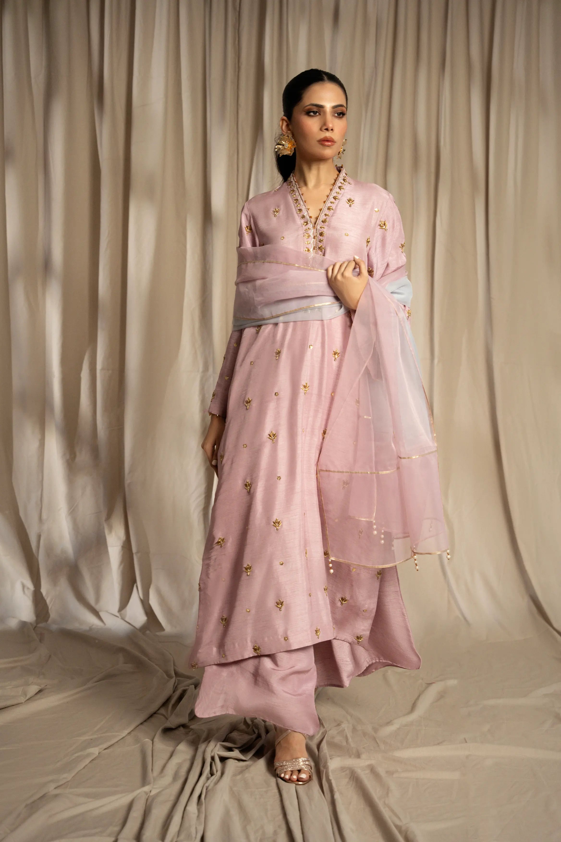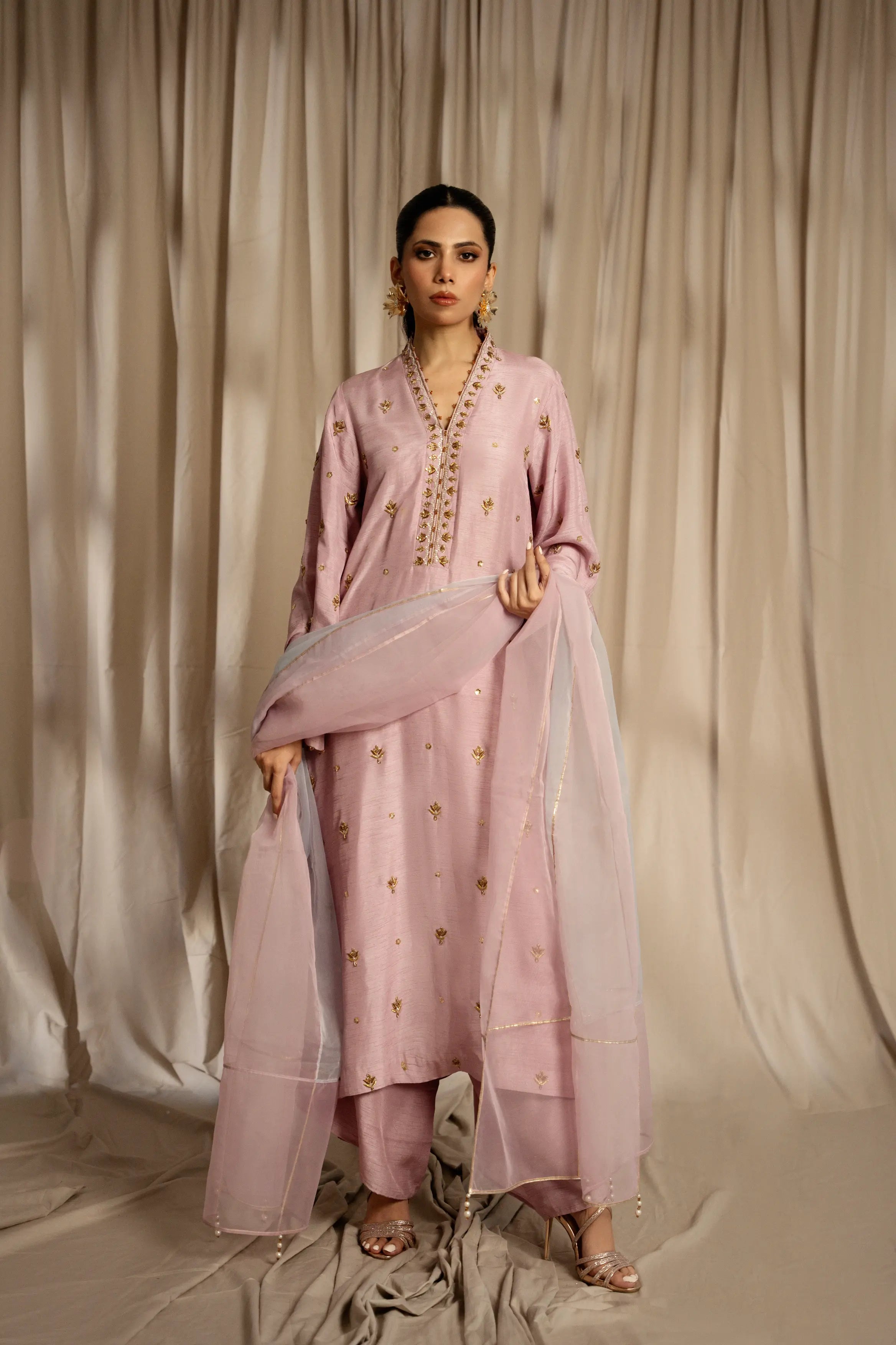 LIA - Festive Formal: The ensemble features a plum lavender korean raw silk long shirt and free flowing pants with organza dupatta. Shirt embellished with zardozi, sequins and crystals embroidery all over. Organza dupatta finished with dhanak and pearl exudes an air of effortless elegance, making it the perfect choice for any occasion.