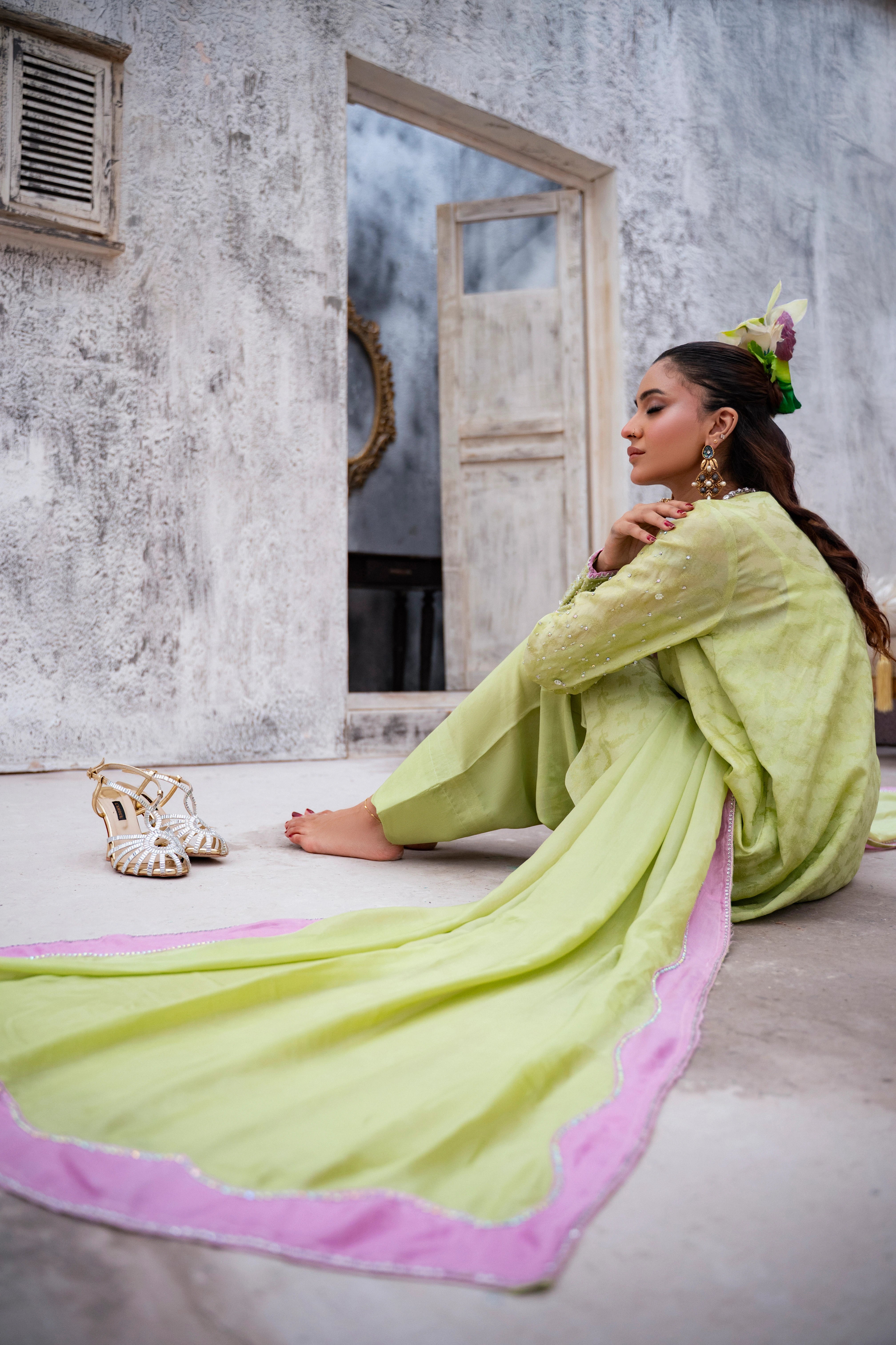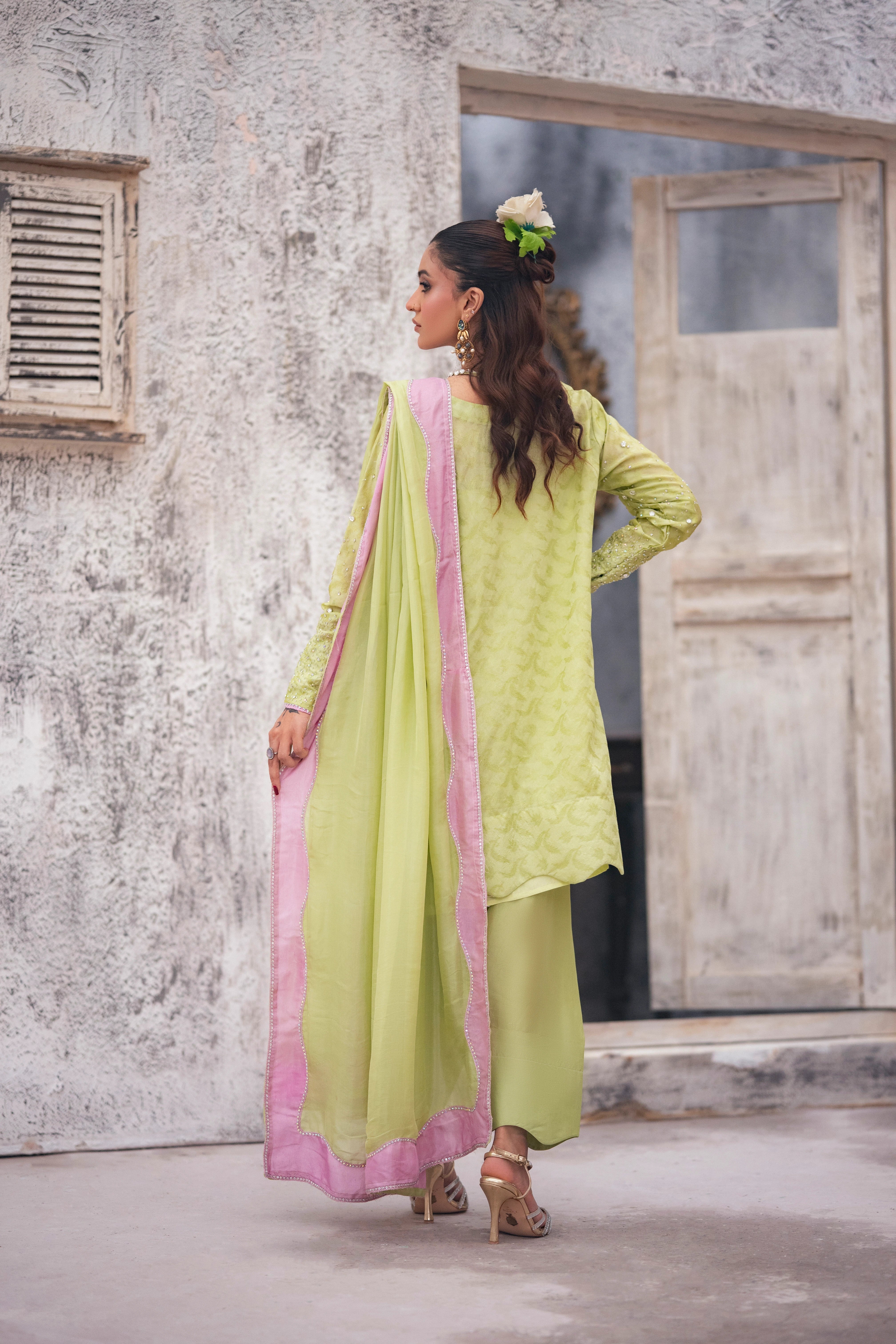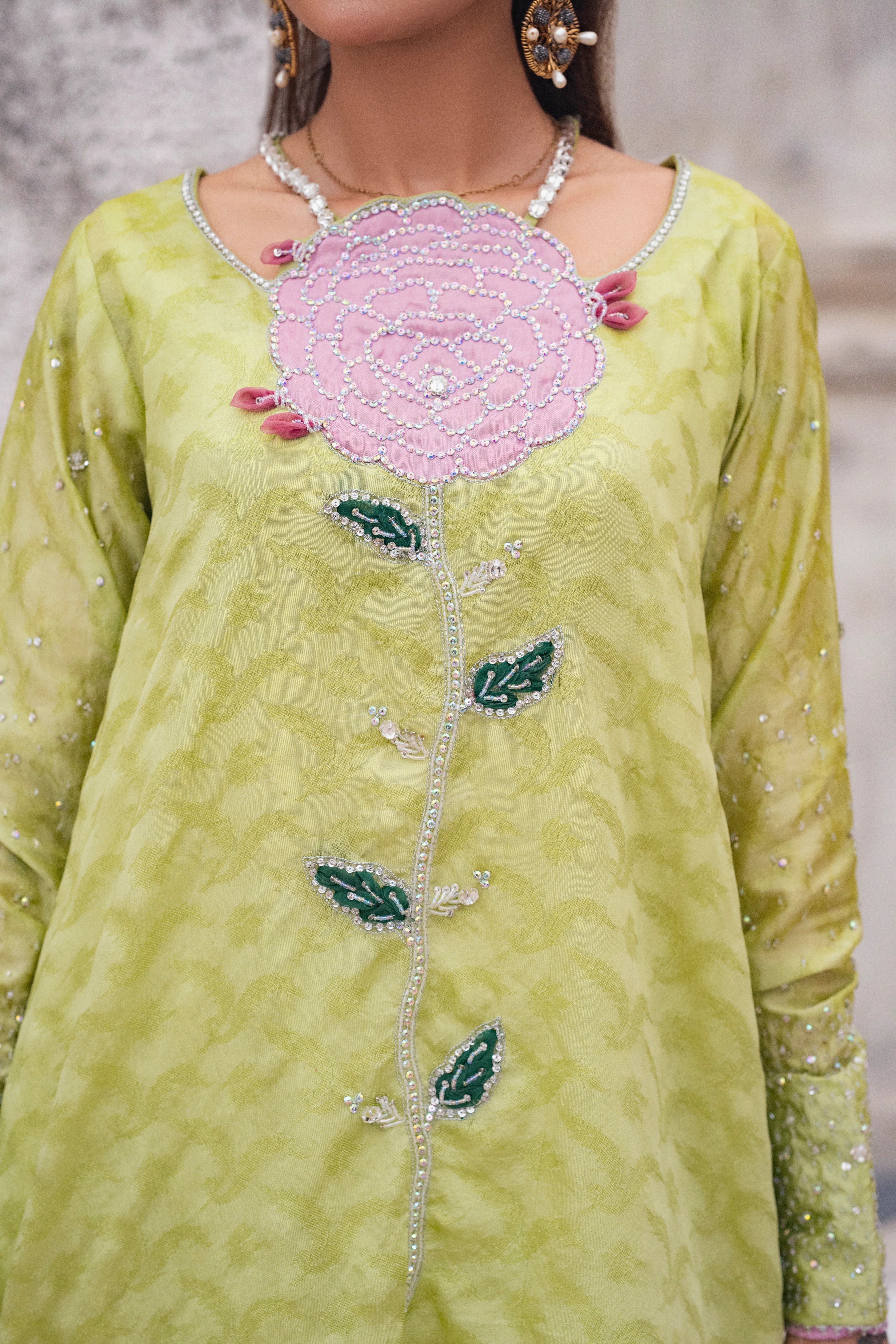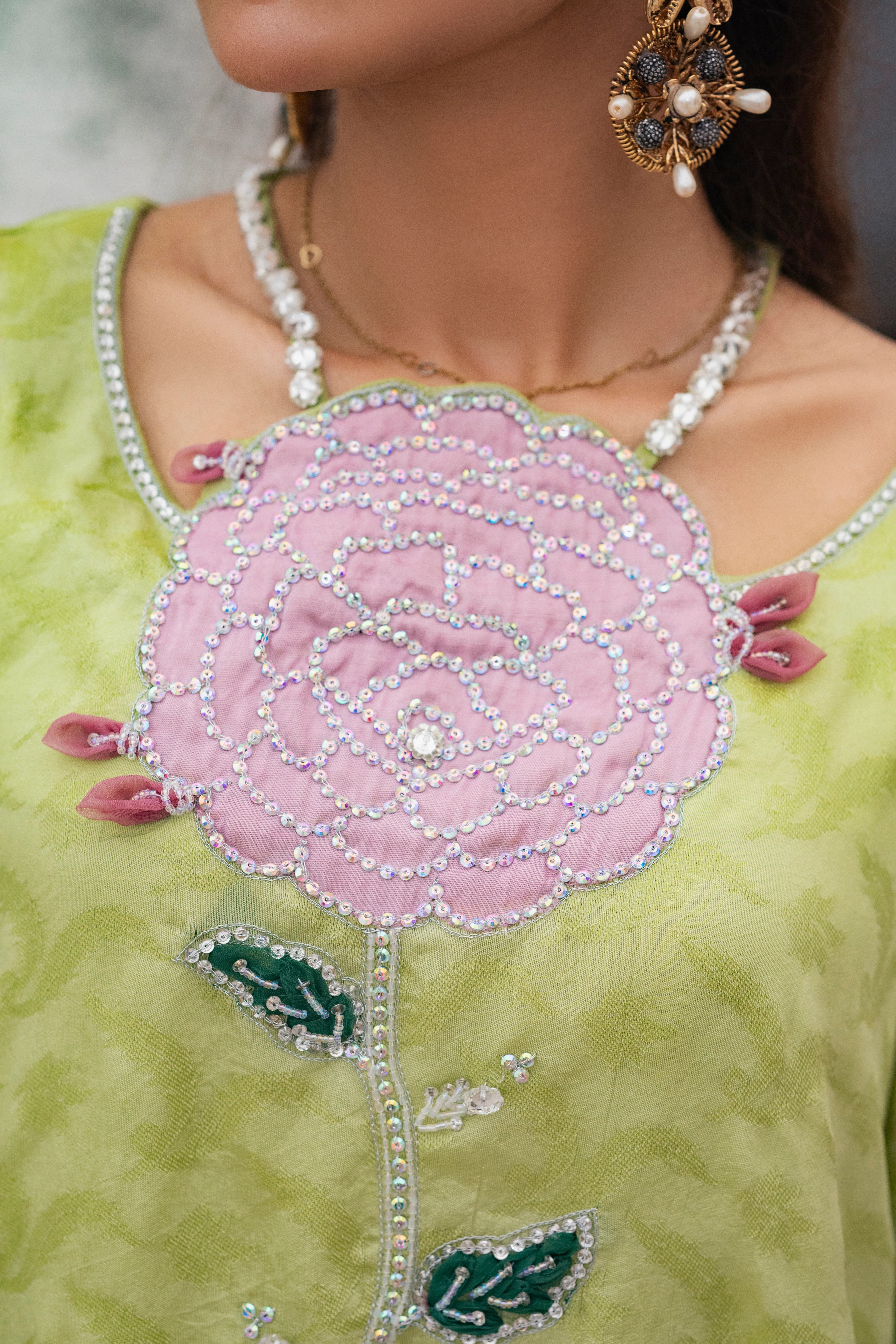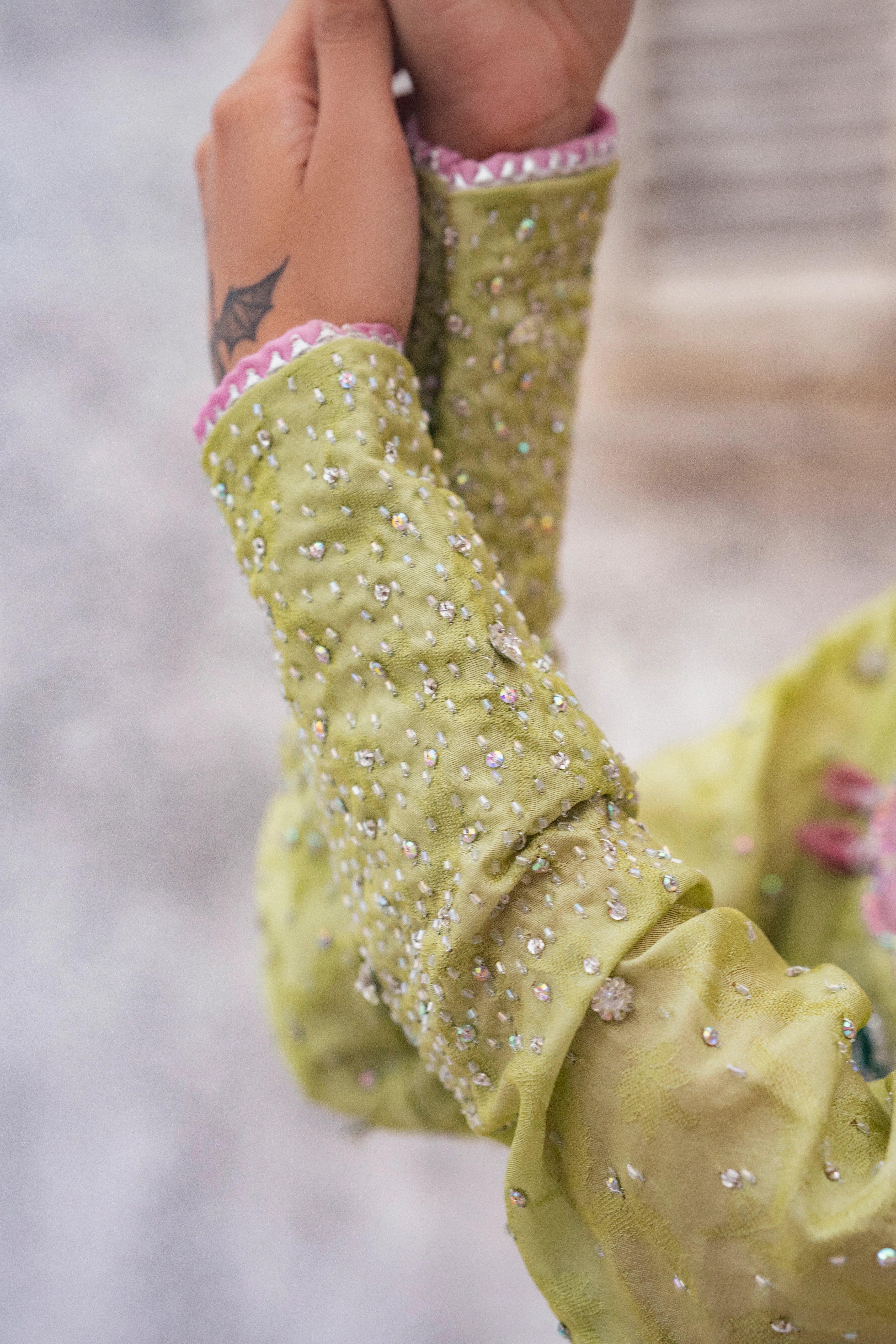 LIA - Festive Formal - VOL 2: Floral pattern self sheesha silk rendered in an apple green hue, this fluid silhouette Ais adorned with accent flower applique neckline and heavy beaded sleeves with scalloped hem and artisanal stitch detailing. The dupatta, crafted from luminous medium silk with tea pink hand appliqued border with crystal stones all around, is paired with skinny shalwar to create an effortlessly elegant ensemble.