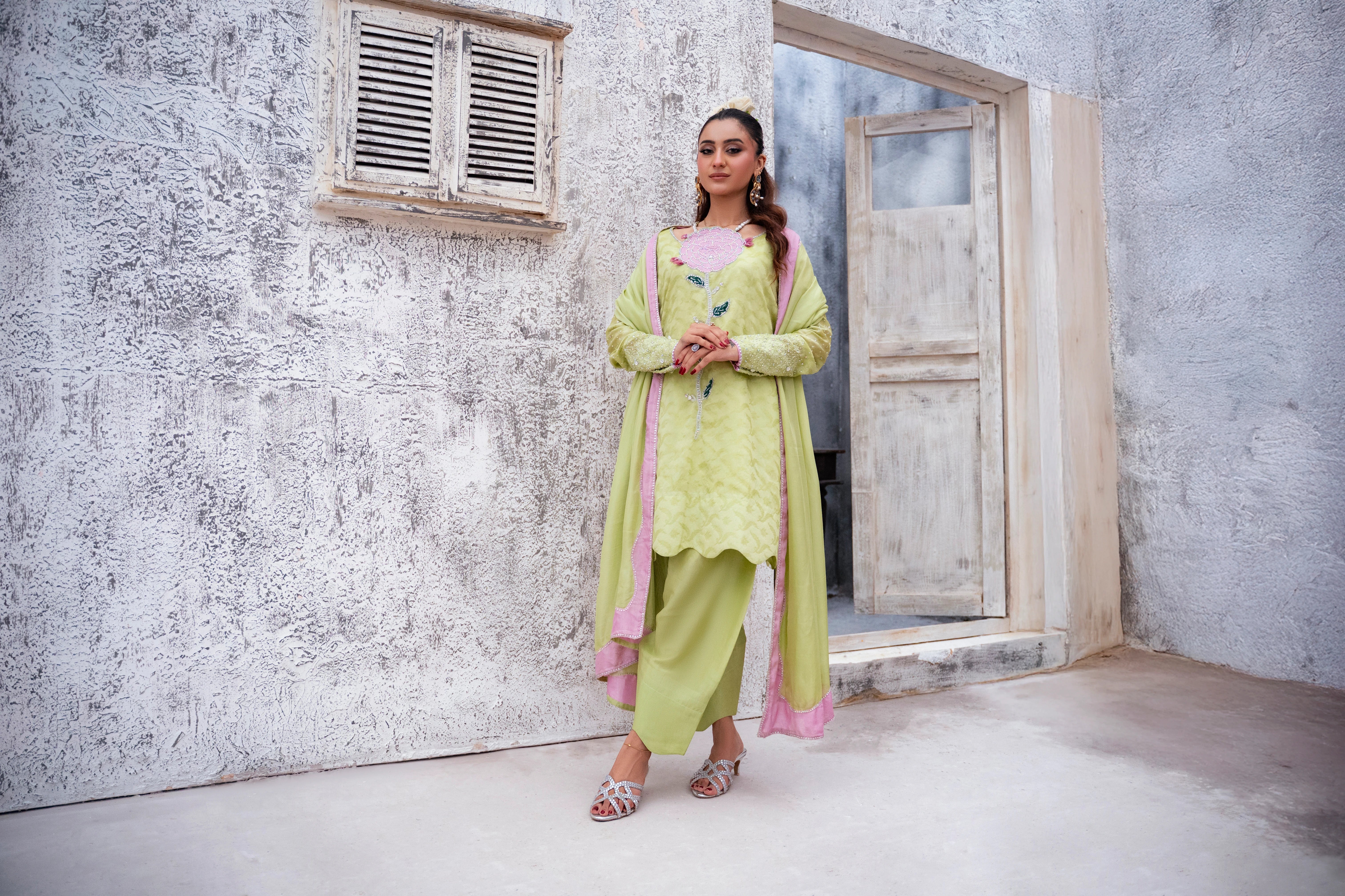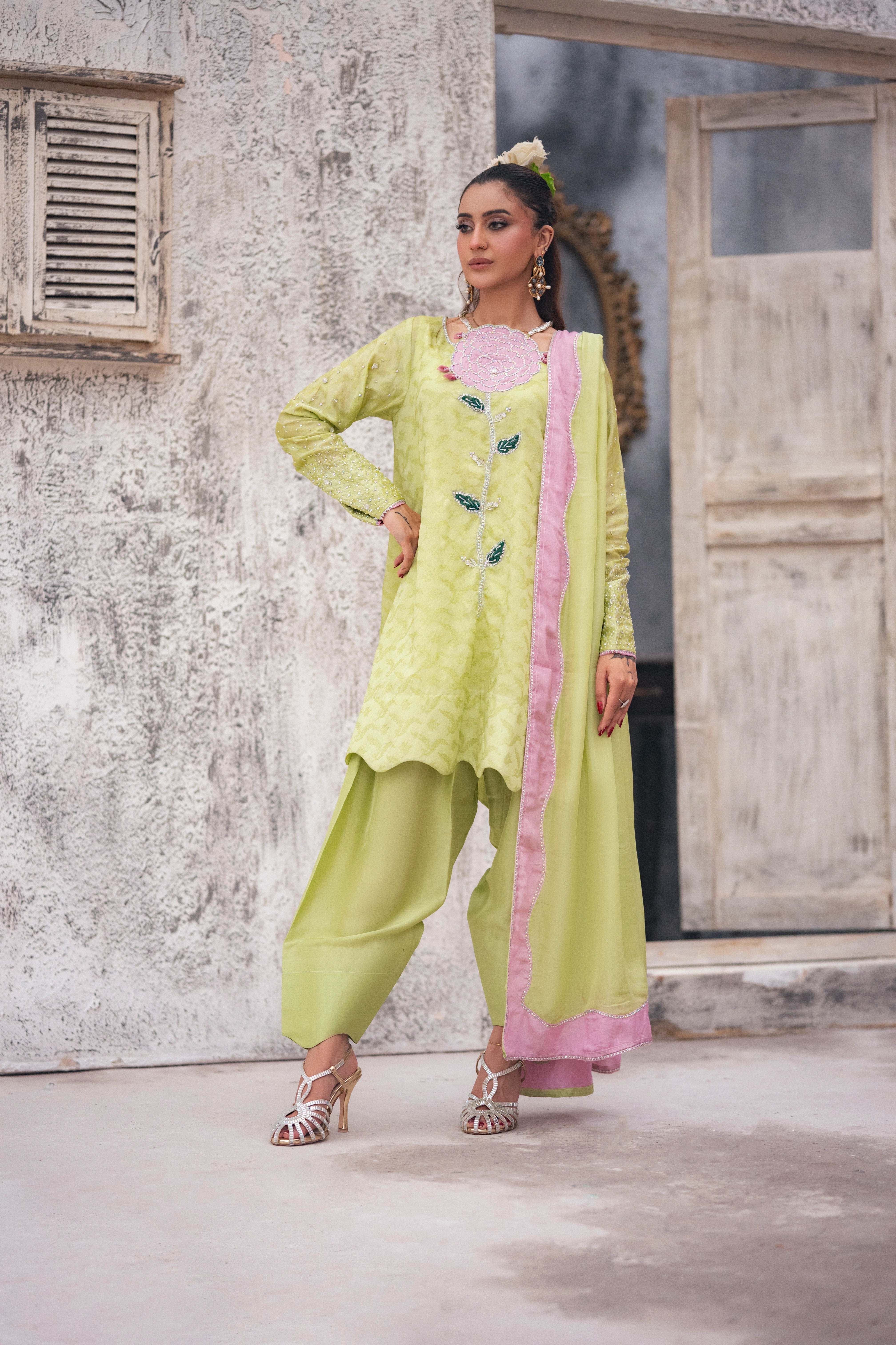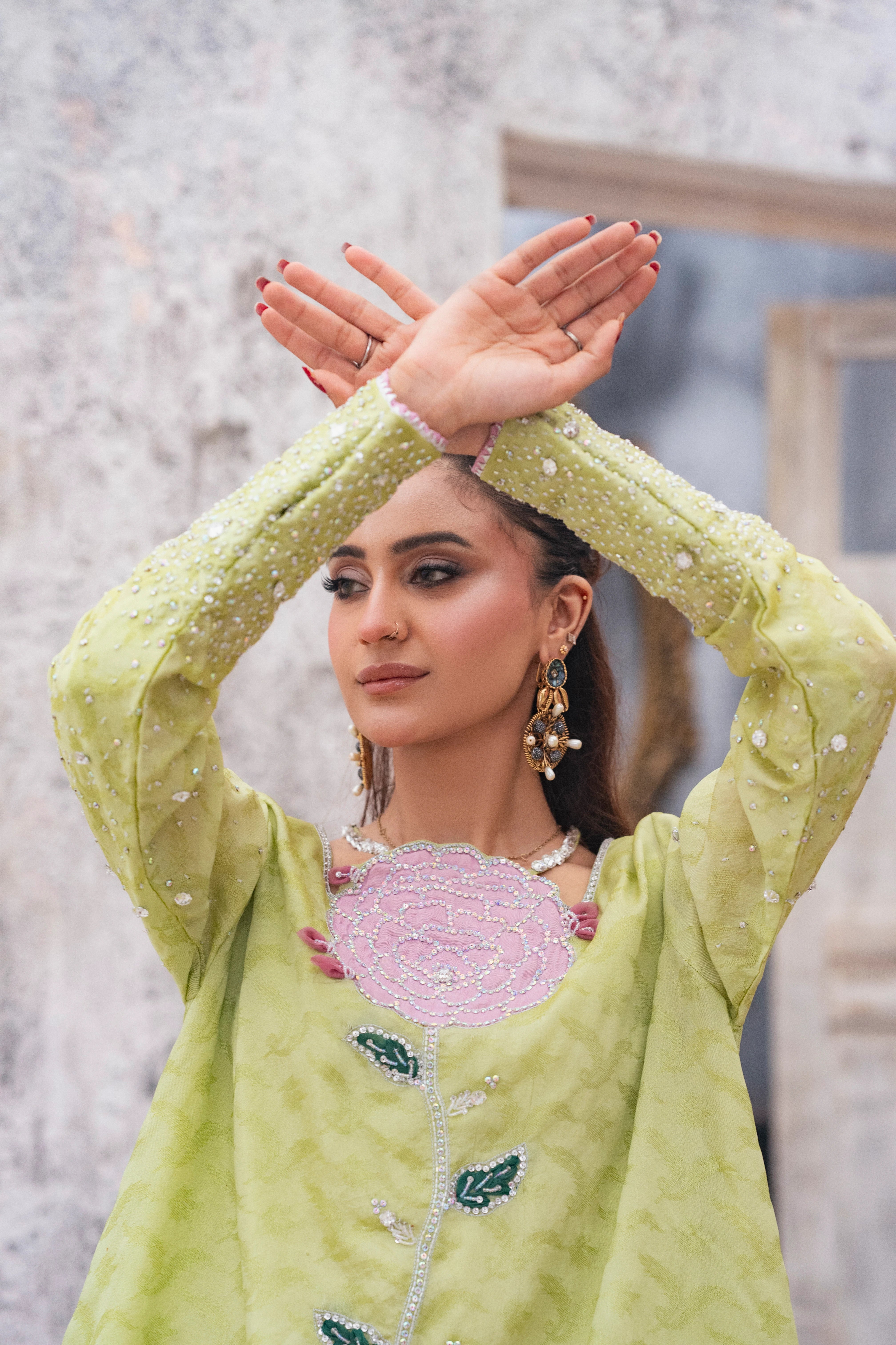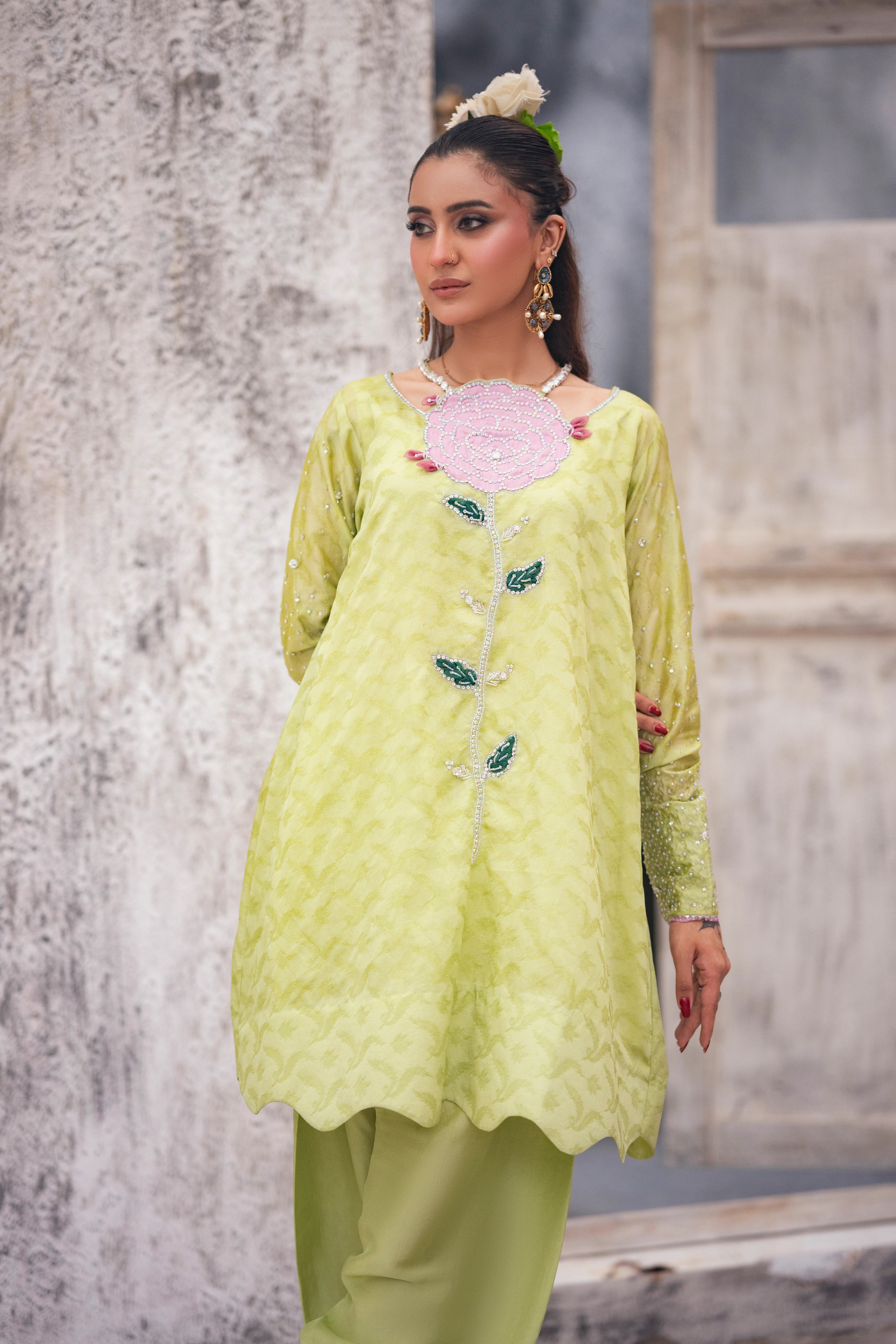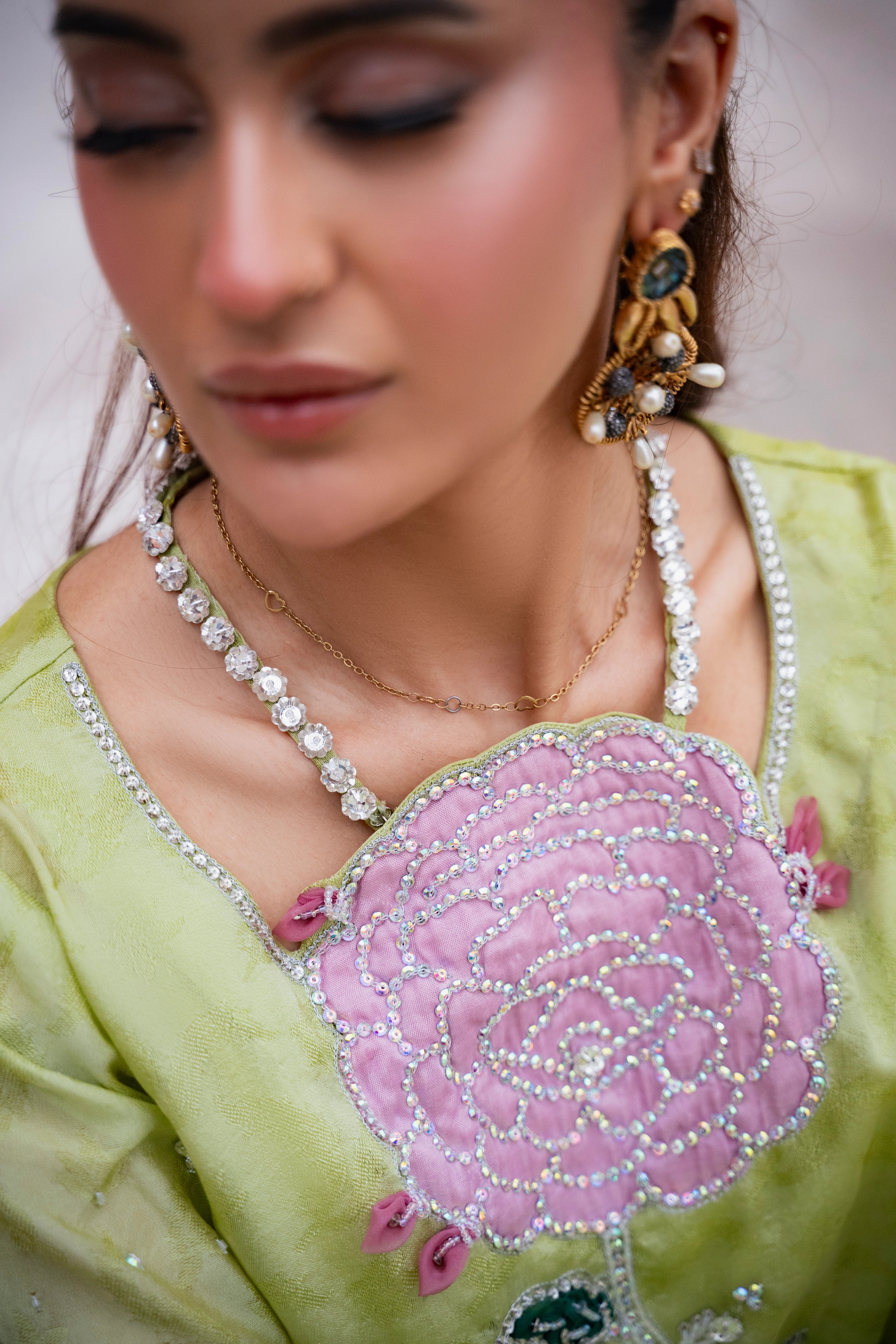 LIA - Festive Formal - VOL 2: Floral pattern self sheesha silk rendered in an apple green hue, this fluid silhouette Ais adorned with accent flower applique neckline and heavy beaded sleeves with scalloped hem and artisanal stitch detailing. The dupatta, crafted from luminous medium silk with tea pink hand appliqued border with crystal stones all around, is paired with skinny shalwar to create an effortlessly elegant ensemble.