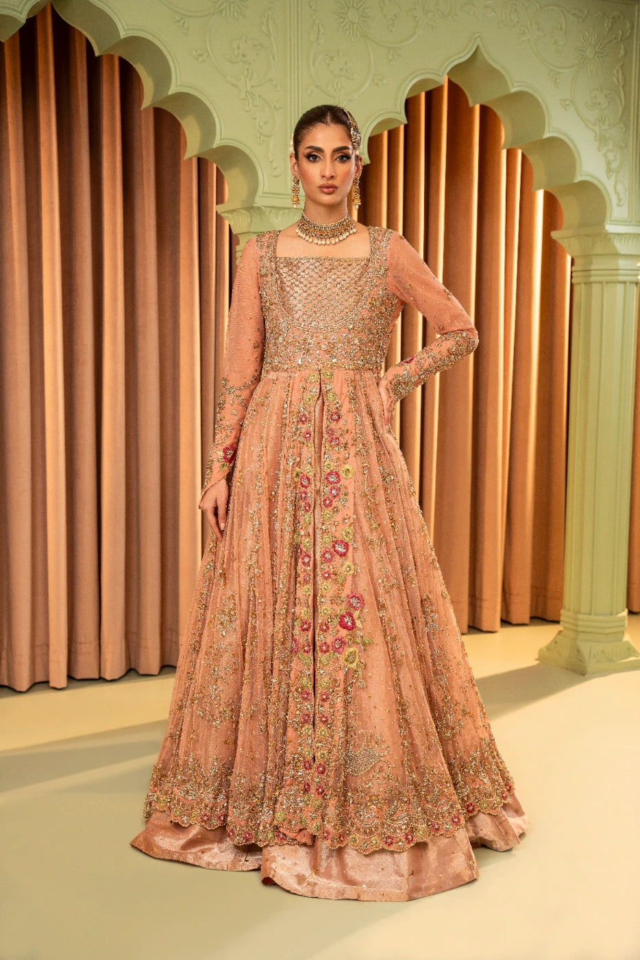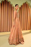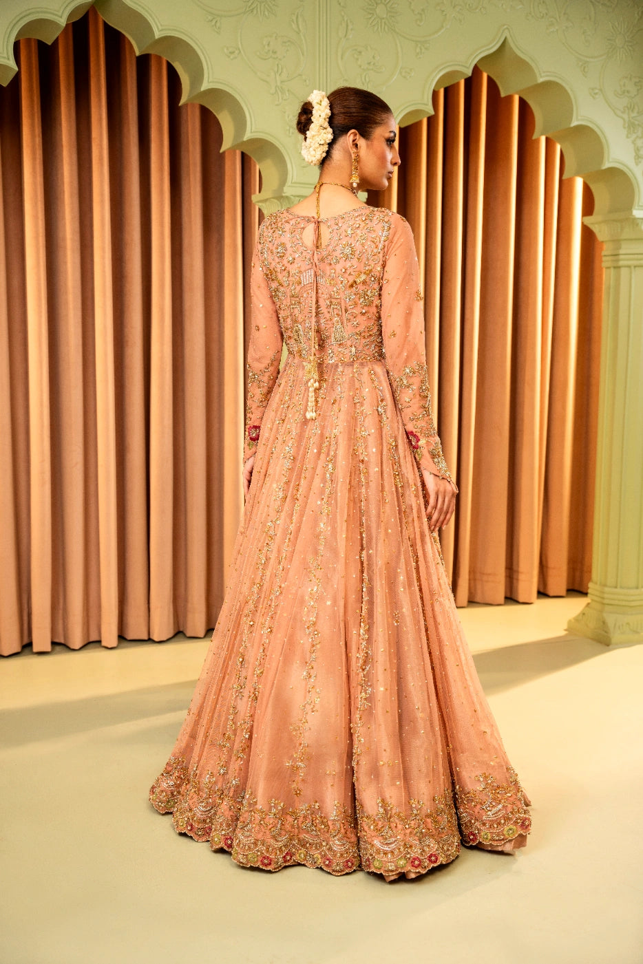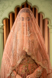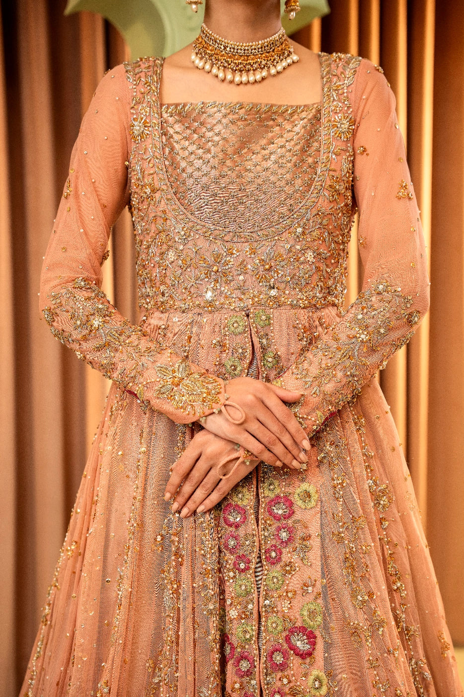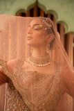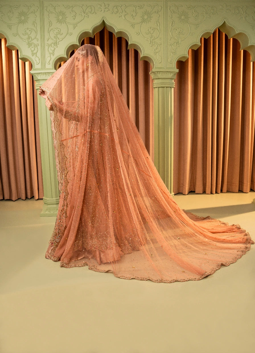 A tea pink-hued net front open peshwas is delicately adorned with gold and silver floral zardoze embroidery inspired by Mughal gardens Contrasting colour resham details on peshwas. A matching net veil embellished with scalloped border and a heavy chaan of crystal, pearl and sequins. Paired with tea pink lama tissue lengha.