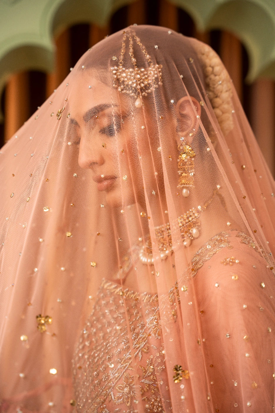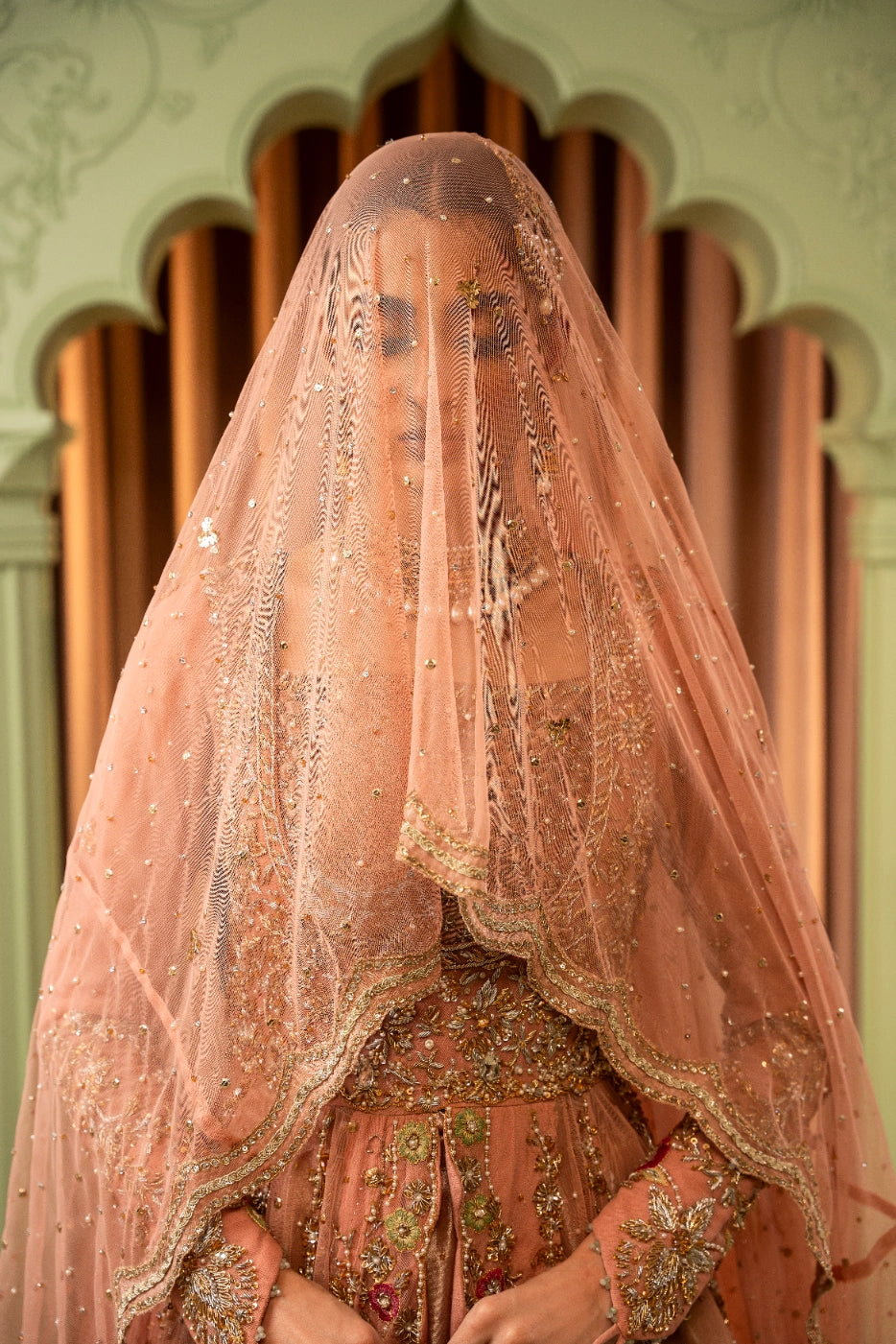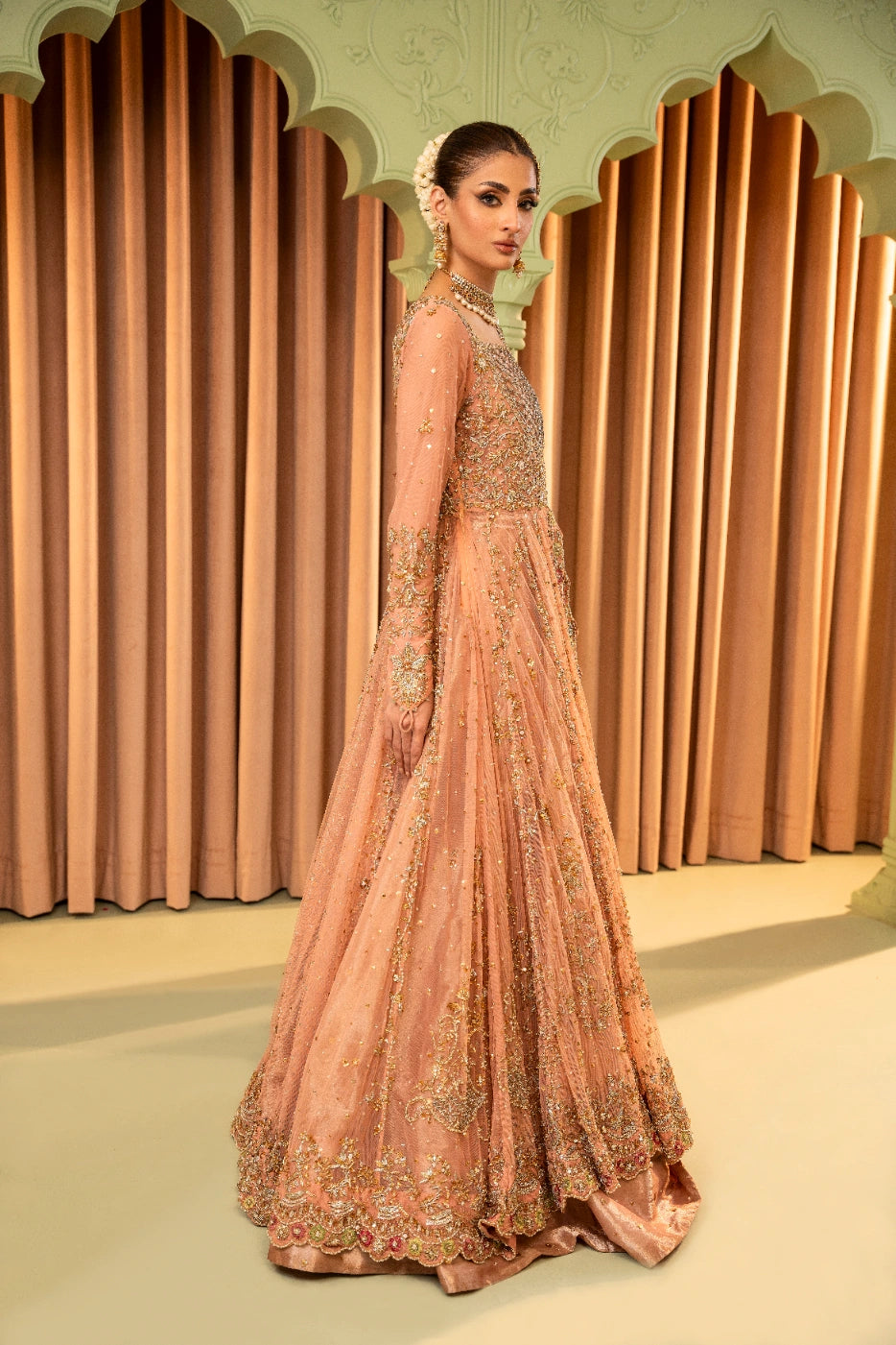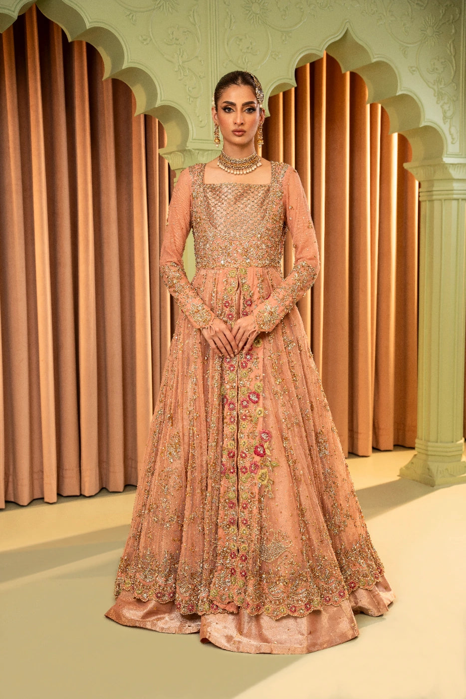 A tea pink-hued net front open peshwas is delicately adorned with gold and silver floral zardoze embroidery inspired by Mughal gardens Contrasting colour resham details on peshwas. A matching net veil embellished with scalloped border and a heavy chaan of crystal, pearl and sequins. Paired with tea pink lama tissue lengha.