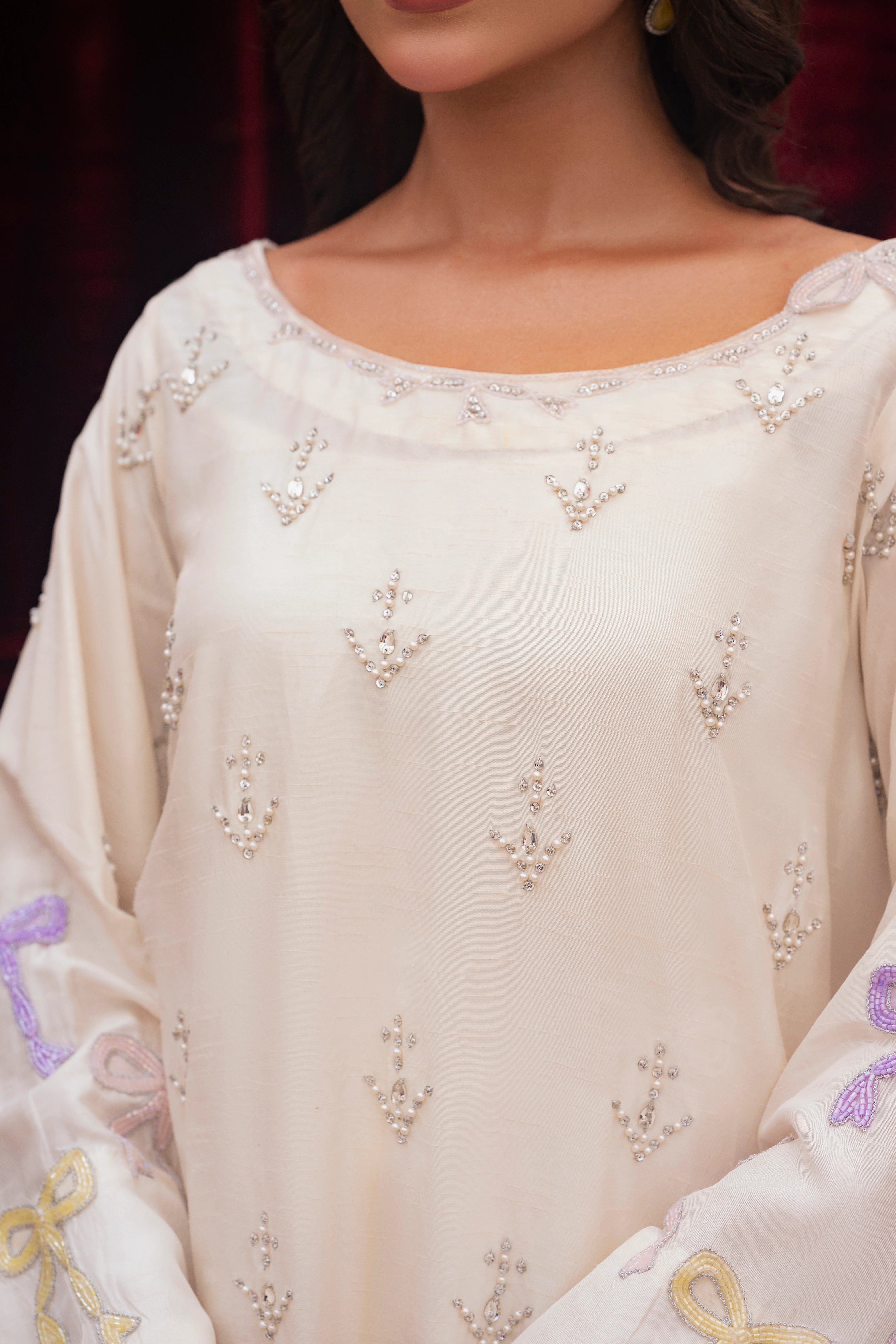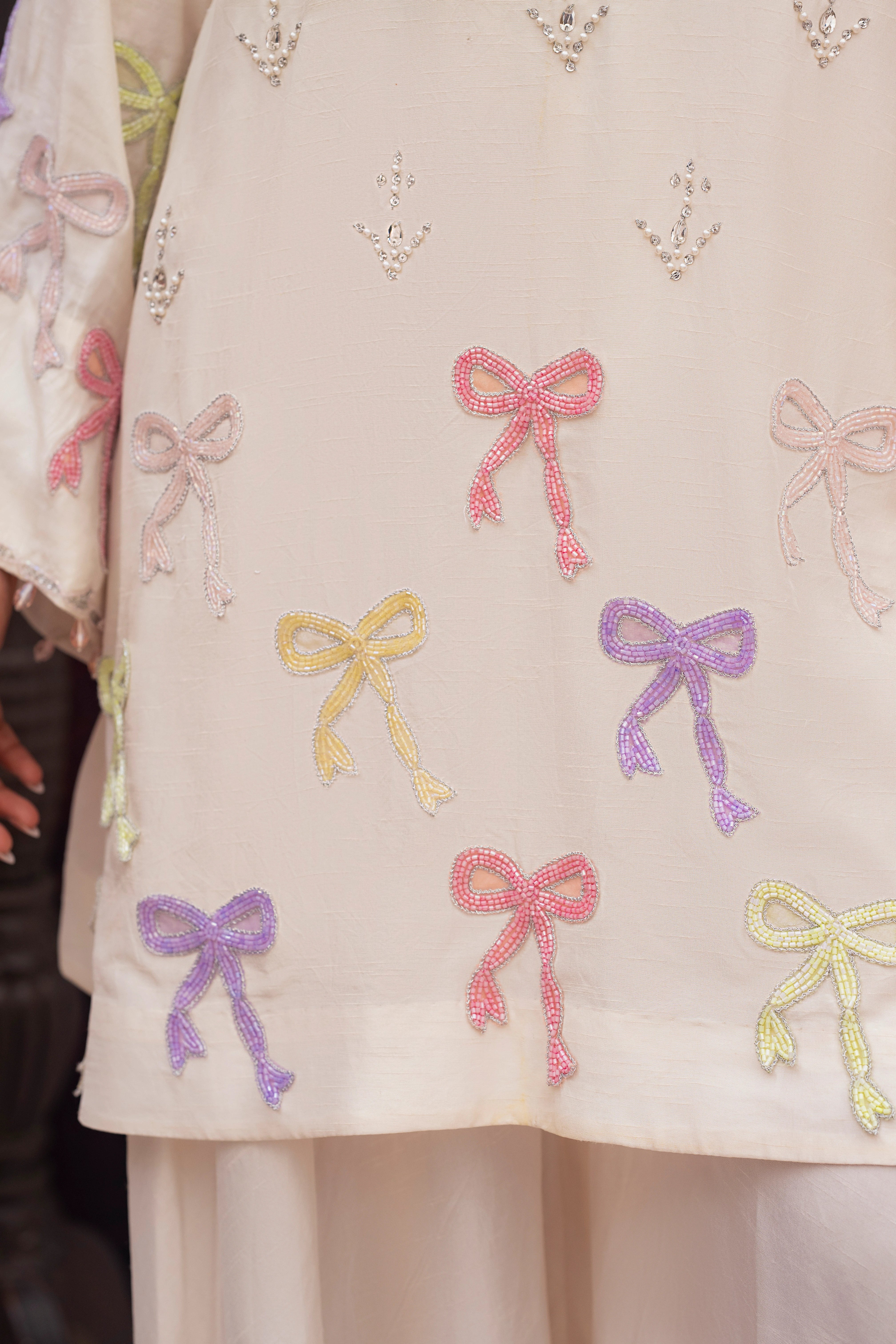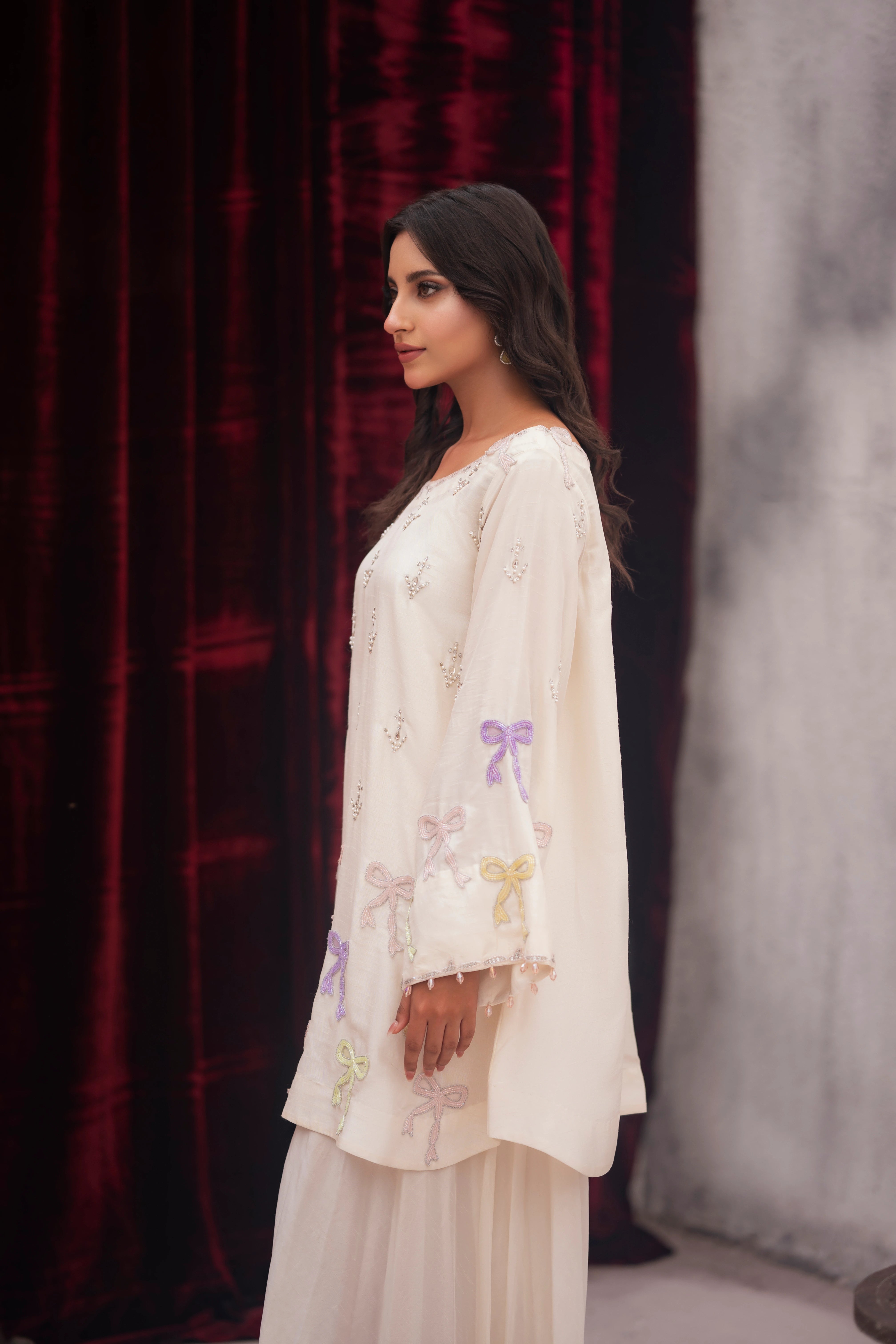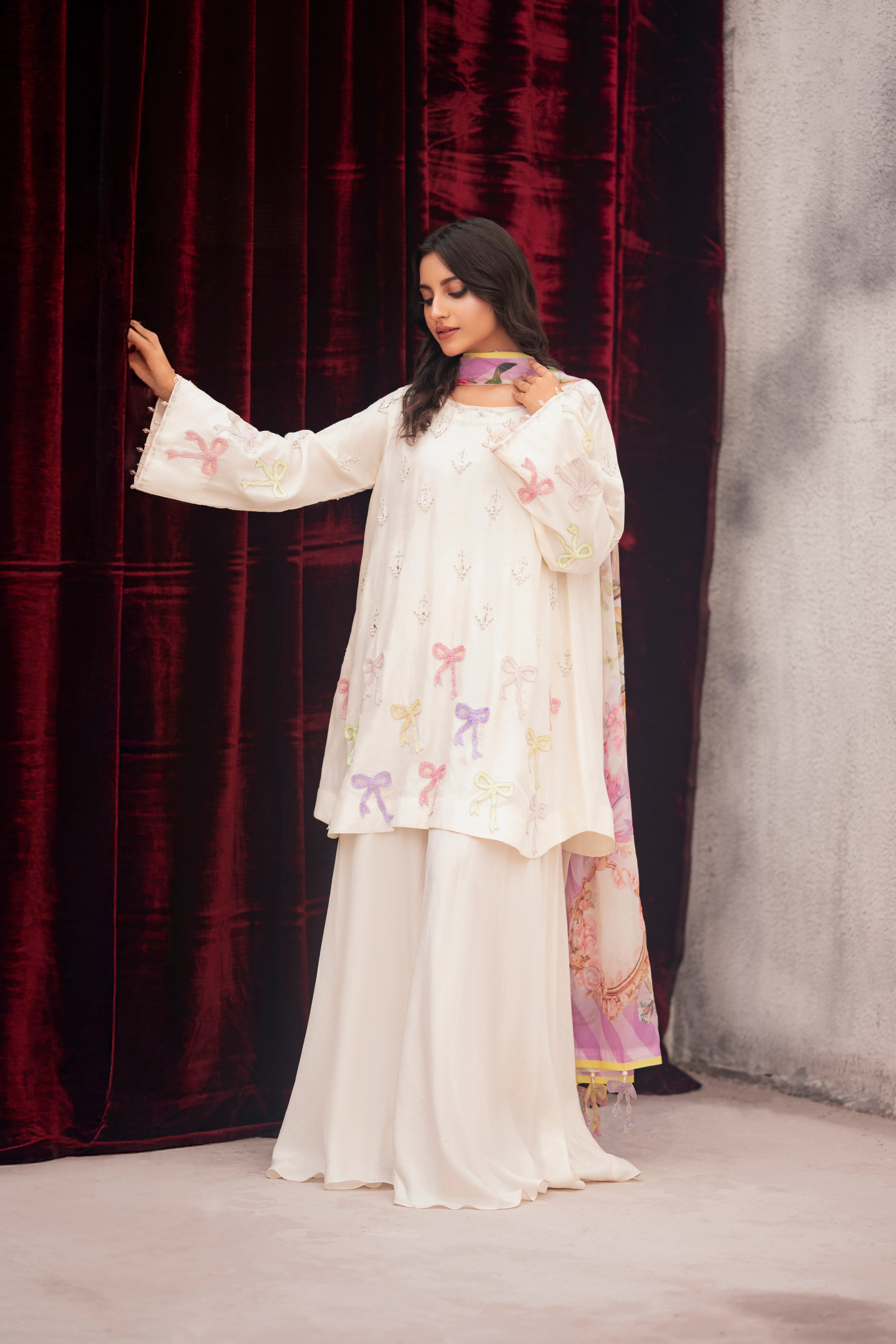 LIA - Festive Formal - VOL 2: An ivory ensemble shimmering with artisanal finesse. A Korean rawsilk short, cut in a timeless straight A-line silhouette, is lavishly embroidered with silver zardoze, pearl, resham, sequins and appliqué multi coloured bows in cutdana work. Sleeve hem finished with hanging beads. Paired with tailored Korean rawsilk flaired dhaka pajama. The contrasting digitally printed silk dupatta, adorned with hand embroidered bow tassels on edges, drapes like a whisper of regality.