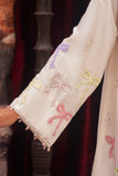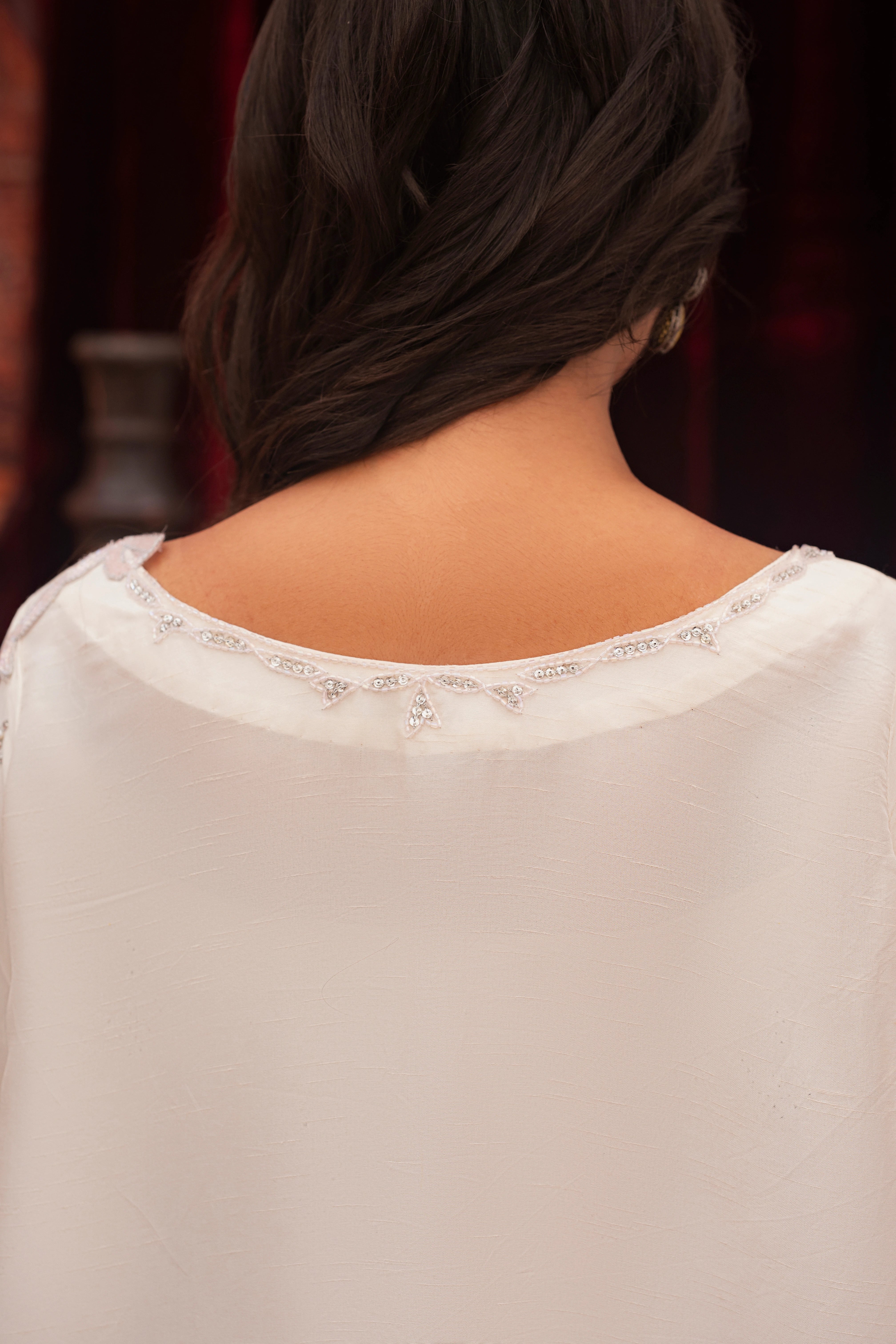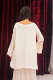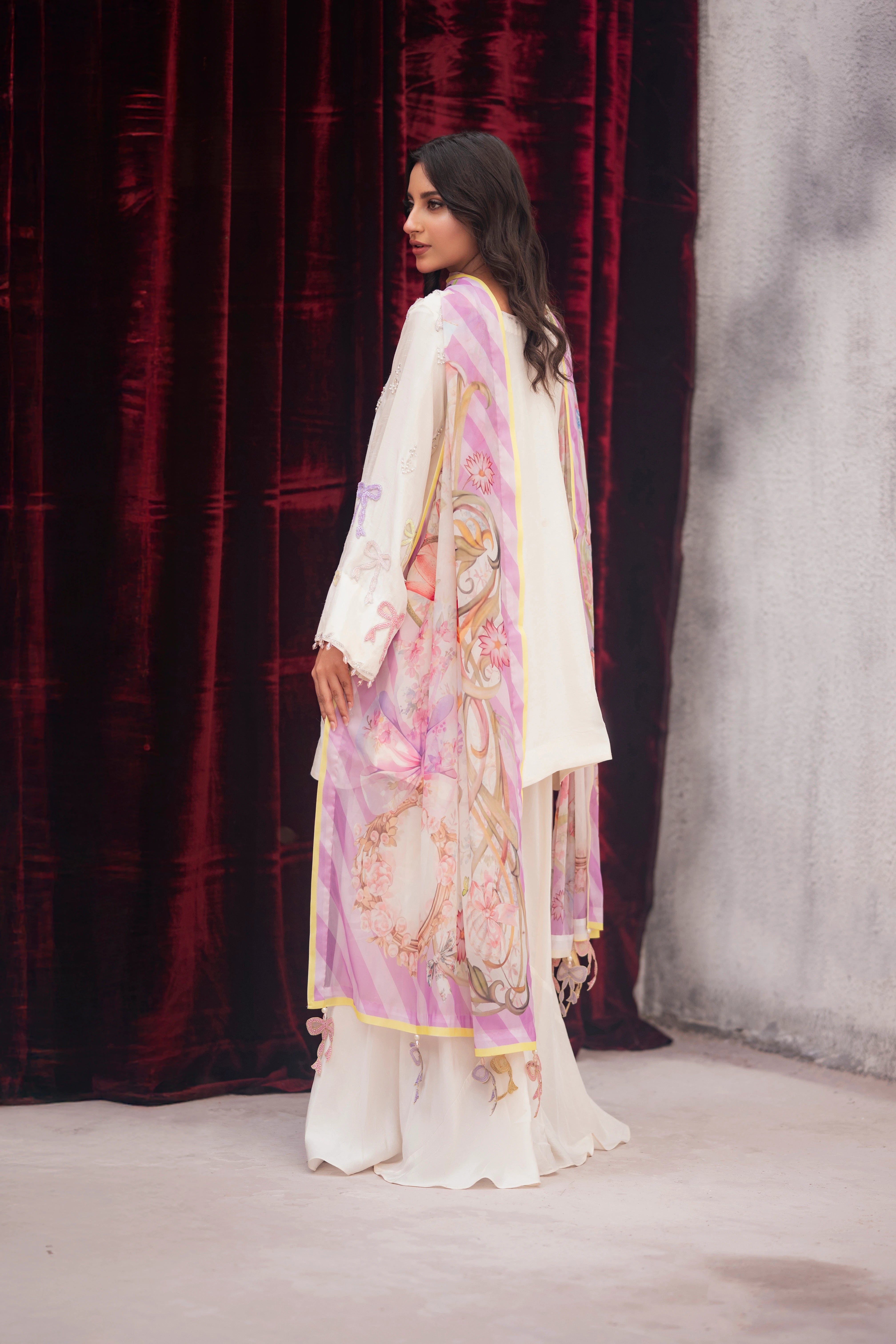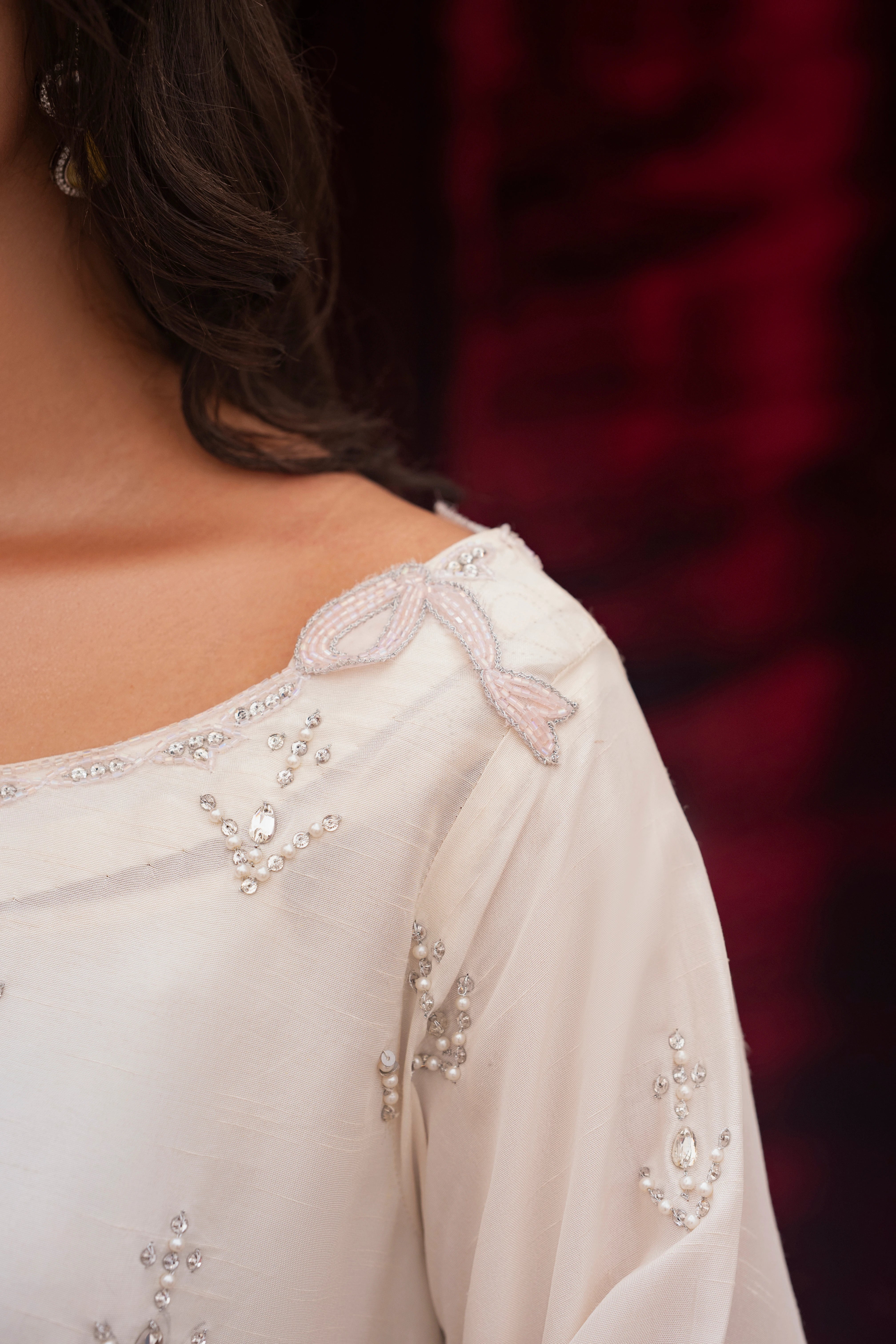 LIA - Festive Formal - VOL 2: An ivory ensemble shimmering with artisanal finesse. A Korean rawsilk short, cut in a timeless straight A-line silhouette, is lavishly embroidered with silver zardoze, pearl, resham, sequins and appliqué multi coloured bows in cutdana work. Sleeve hem finished with hanging beads. Paired with tailored Korean rawsilk flaired dhaka pajama. The contrasting digitally printed silk dupatta, adorned with hand embroidered bow tassels on edges, drapes like a whisper of regality.