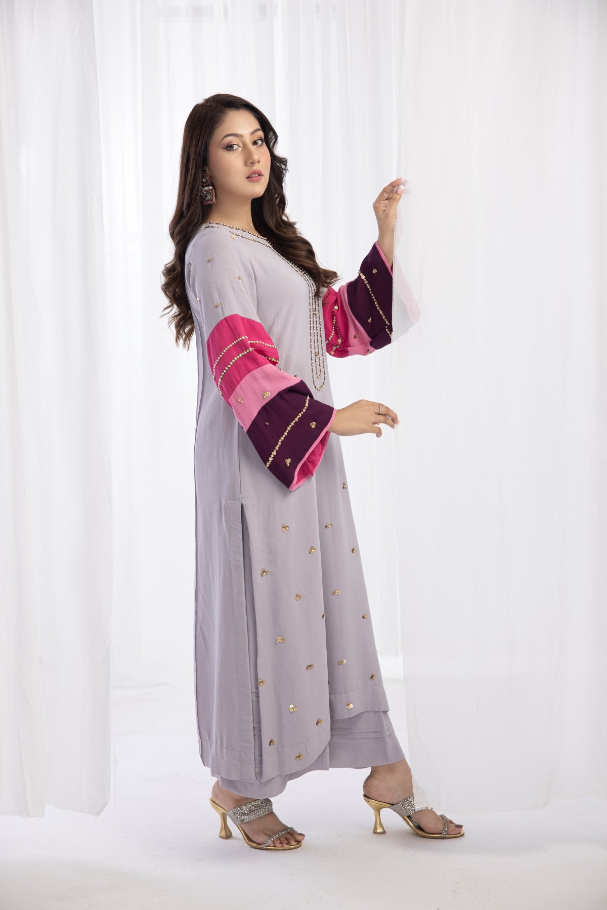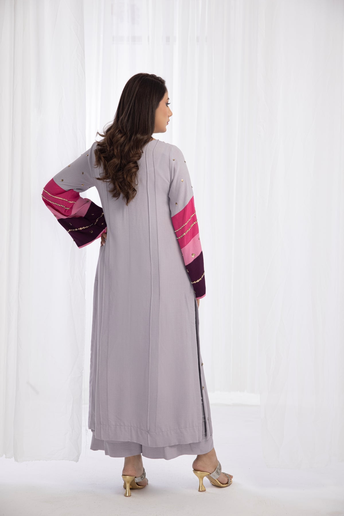 Jahaan'23: Color-blocked pure crepe icy grey shirt with shades of pink. A line long shirt adorned with pearls & sequins hand embroidery all over. Paired up with the same color fabric manipulated culottes. A perfect chic look for this festive season.
