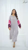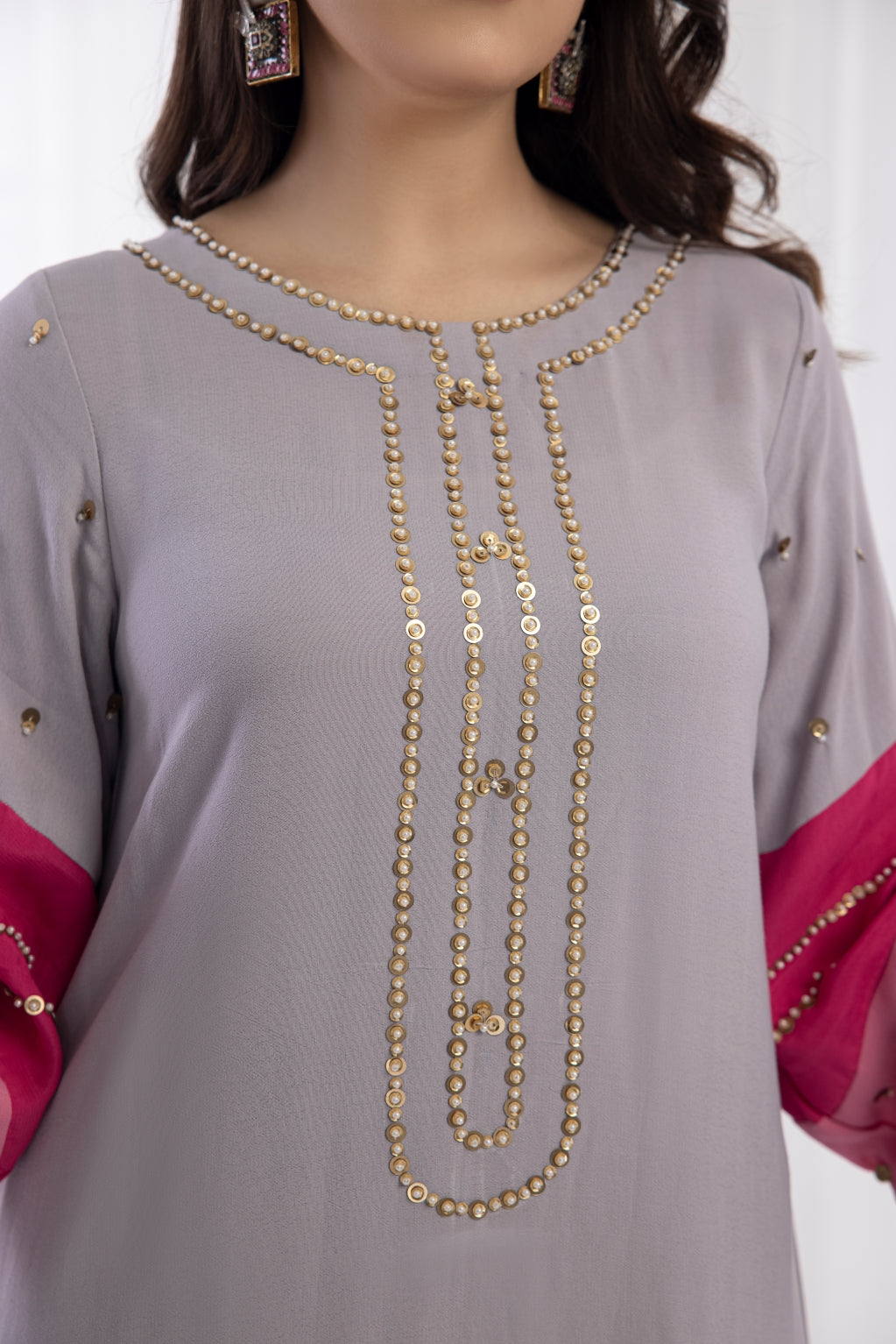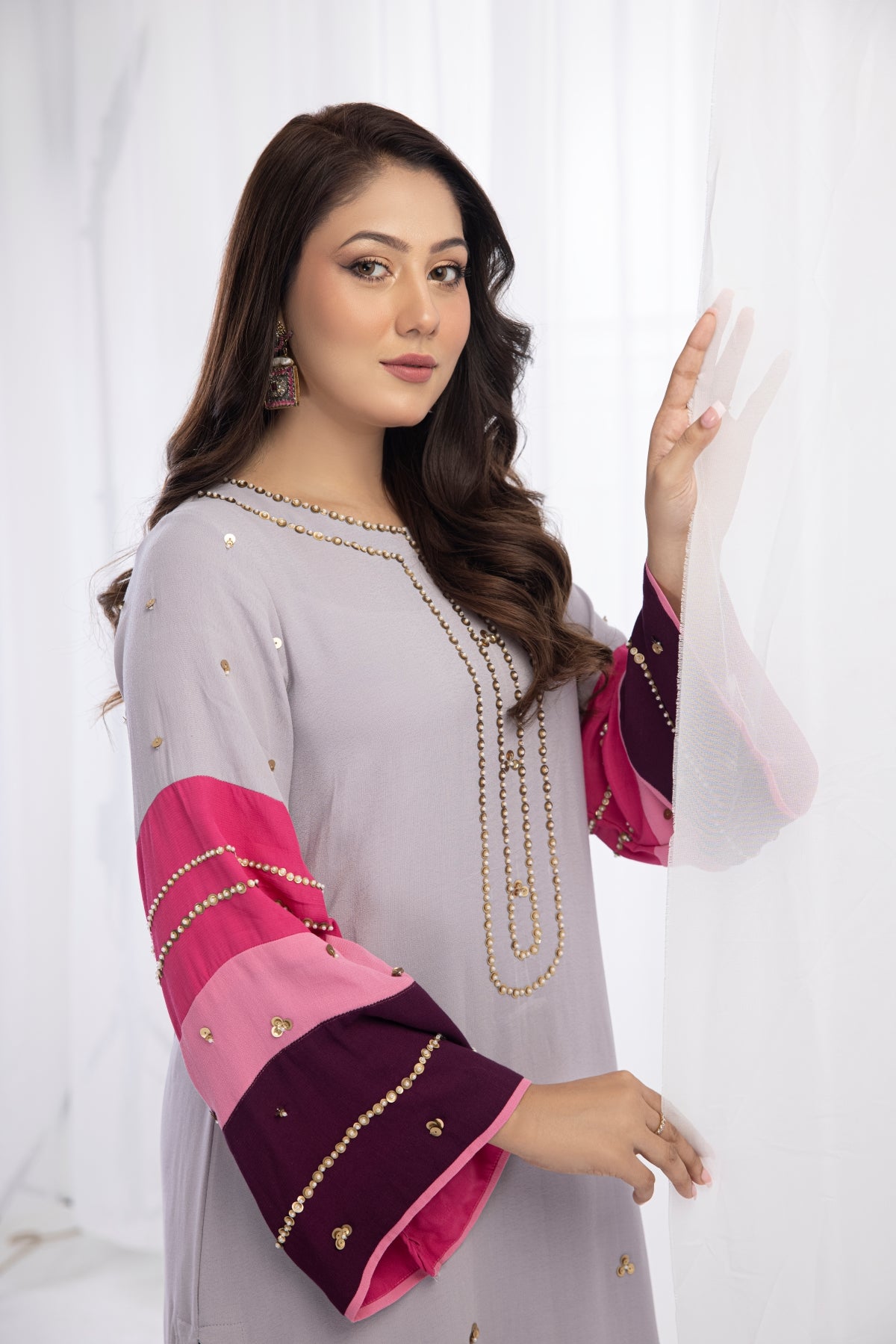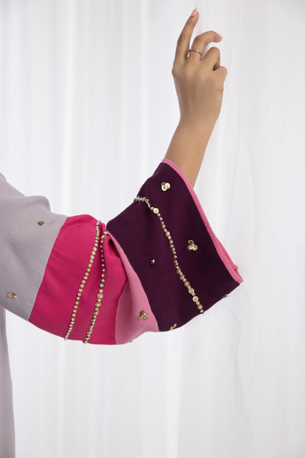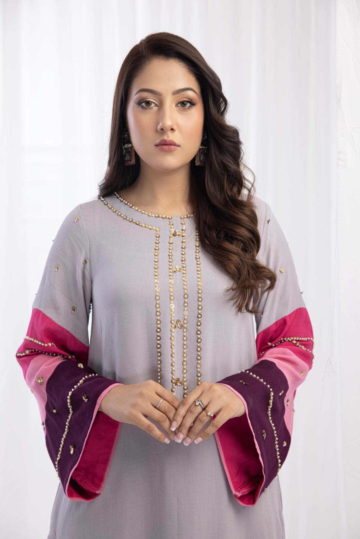 Jahaan'23: Color-blocked pure crepe icy grey shirt with shades of pink. A line long shirt adorned with pearls...
